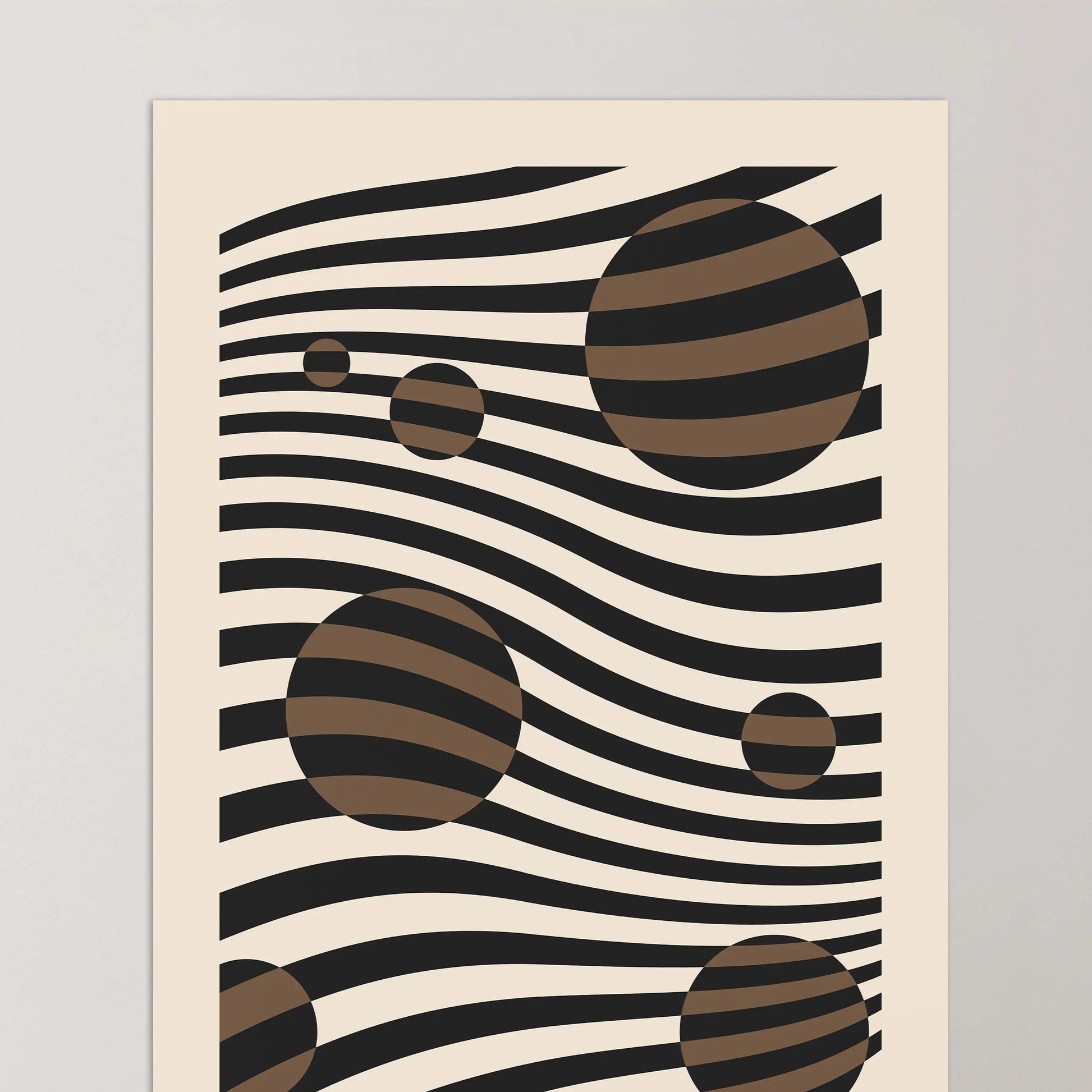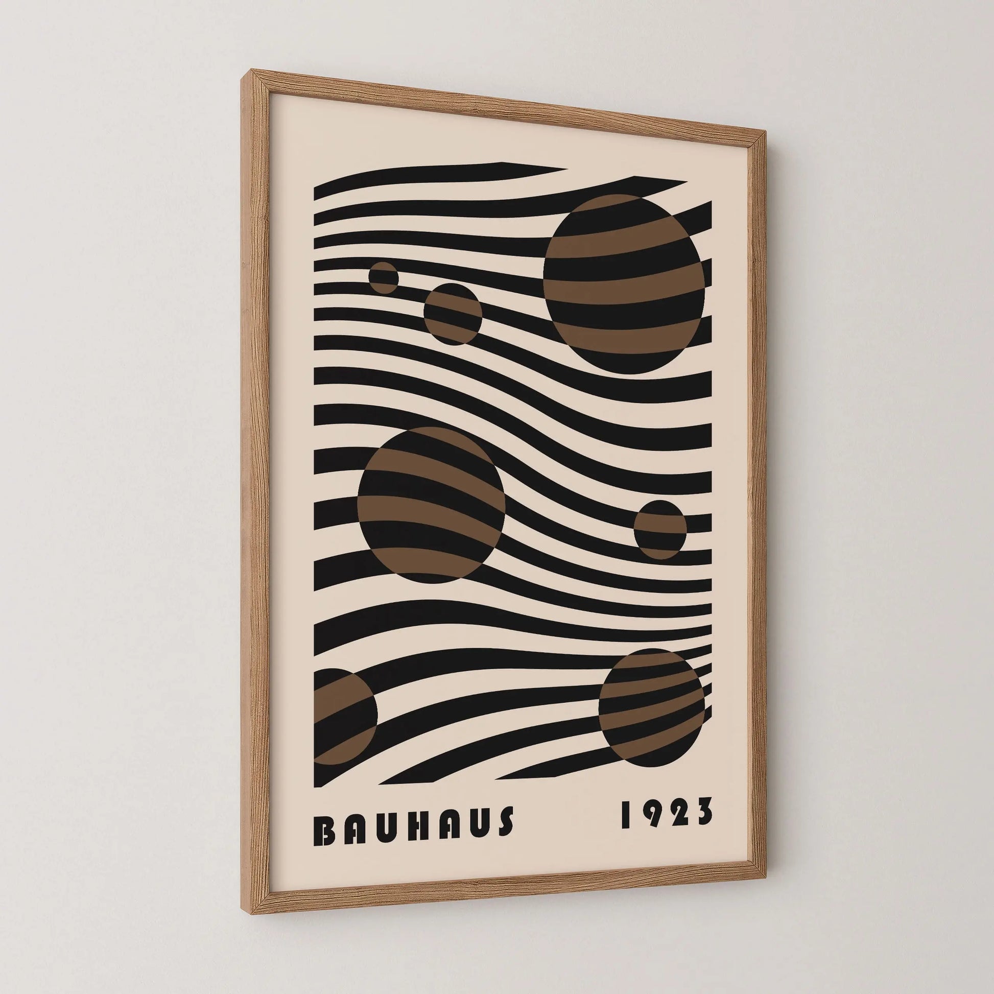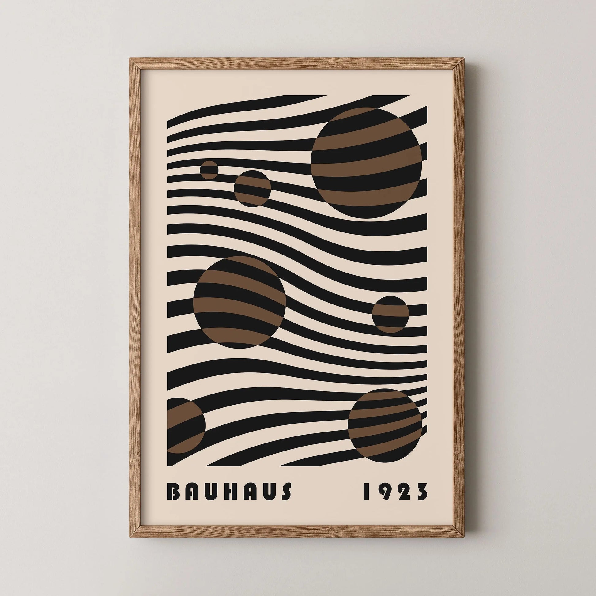 Dieses Vintage-Bauhaus-Poster besteht aus parallelen, wellenförmigen Linien, die sich über die gesamte Fläche erstrecken und von Kreisen unterschiedlicher Größe durchsetzt sind, wodurch ein Spiel von Positiv- und Negativformen entsteht. Das Gesamtbild erzeugt eine fließende, rhythmische Komposition, die an eine kosmische Drift erinnert und eine anspruchsvolle visuelle Tiefe vermittelt.