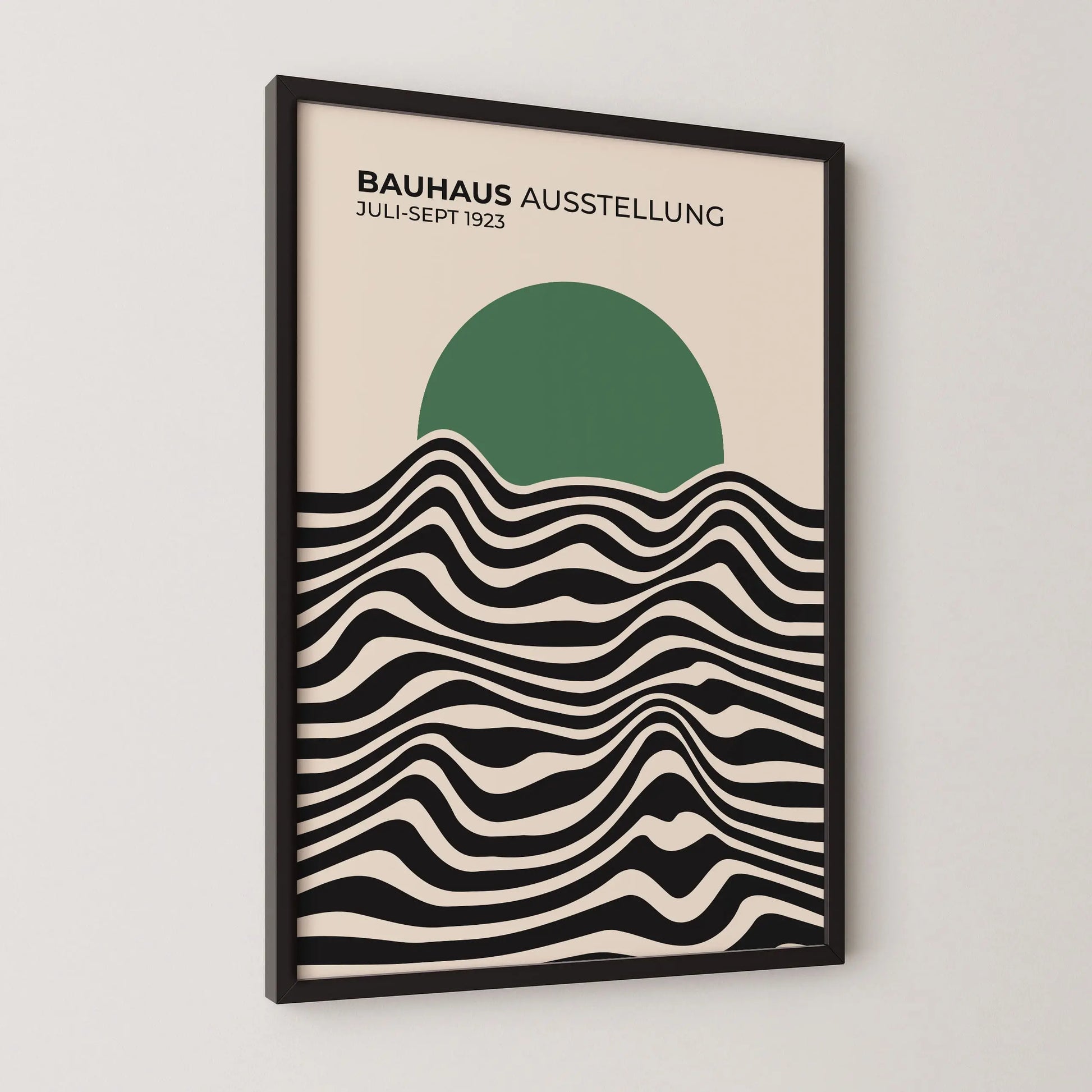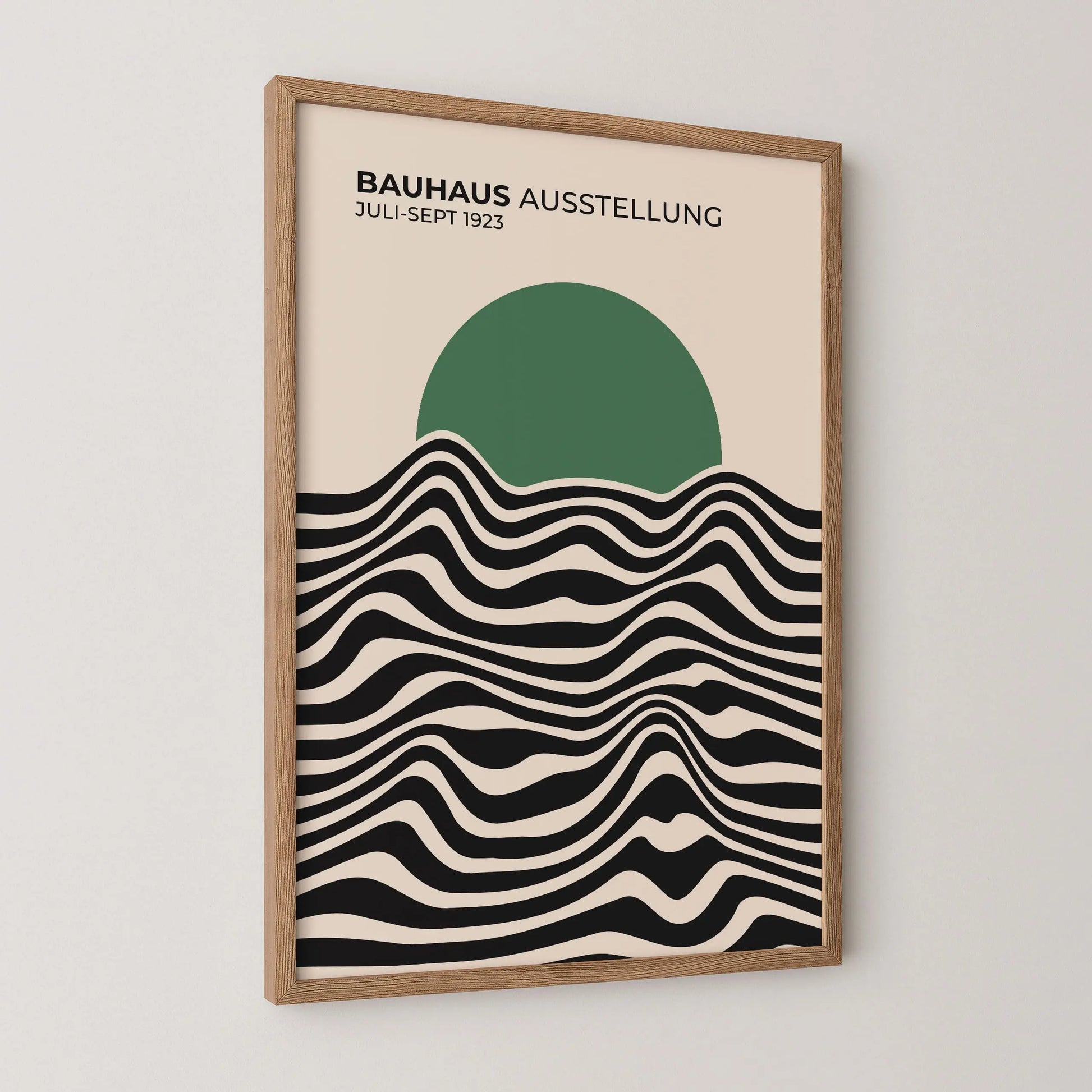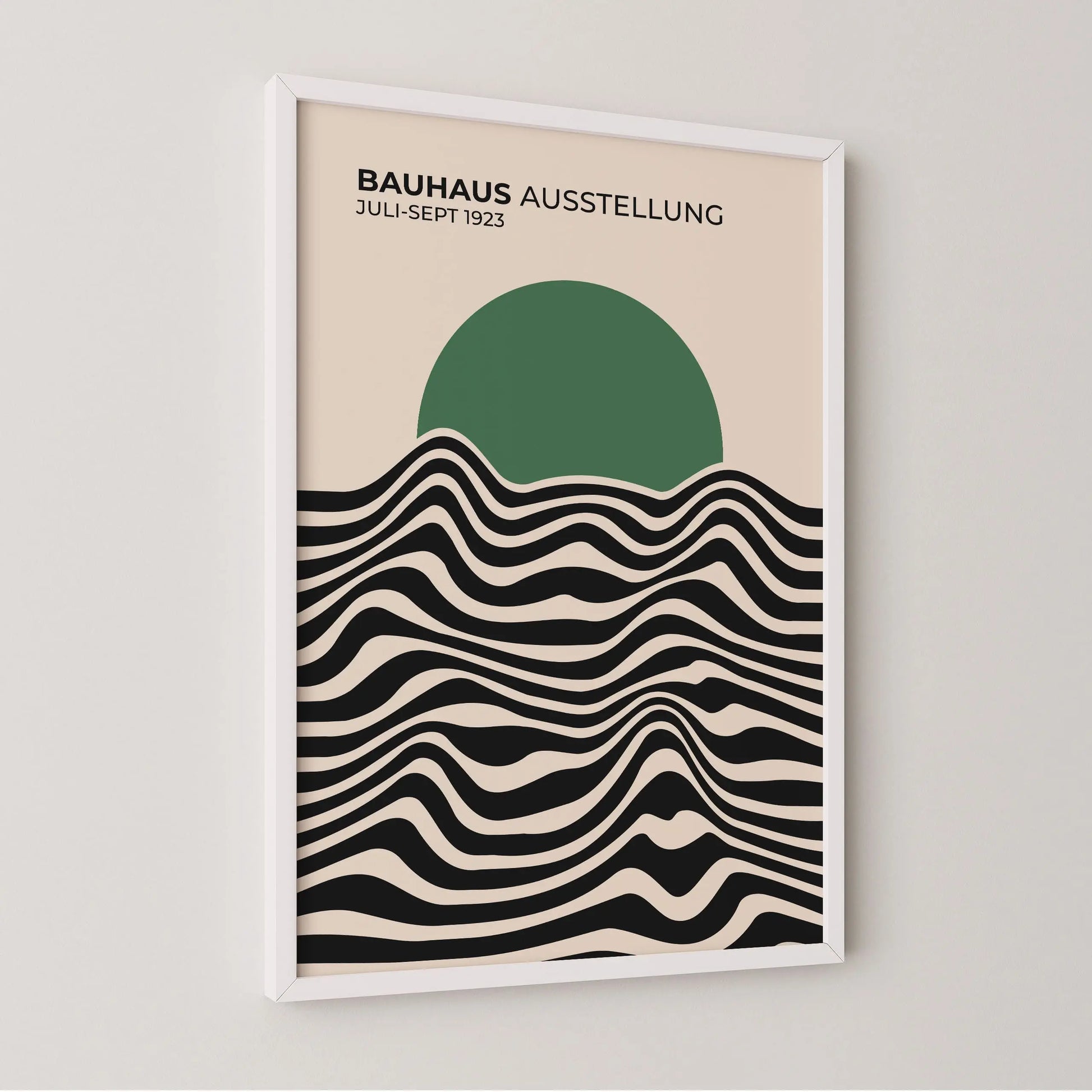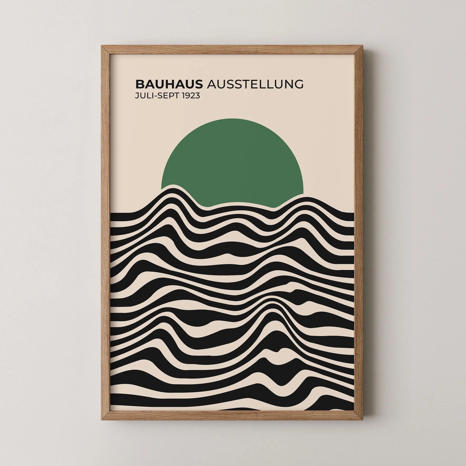 Dieses Bauhaus-Vintageplakat besteht aus parallelen, gewellten Linien, die abwechselnd in hellen und dunklen Flächen ausgeführt sind und horizontal im unteren Bereich angeordnet sind. Diese Linien bilden fließende, kontinuierliche Kurven und erzeugen einen gleichmäßigen visuellen Rhythmus. Der obere Bereich wird von einer vollflächigen Scheibe eingenommen, die die Linien teilweise überlagert und einen klaren Kontrast zwischen organischen Formen und einfacher Geometrie schafft.