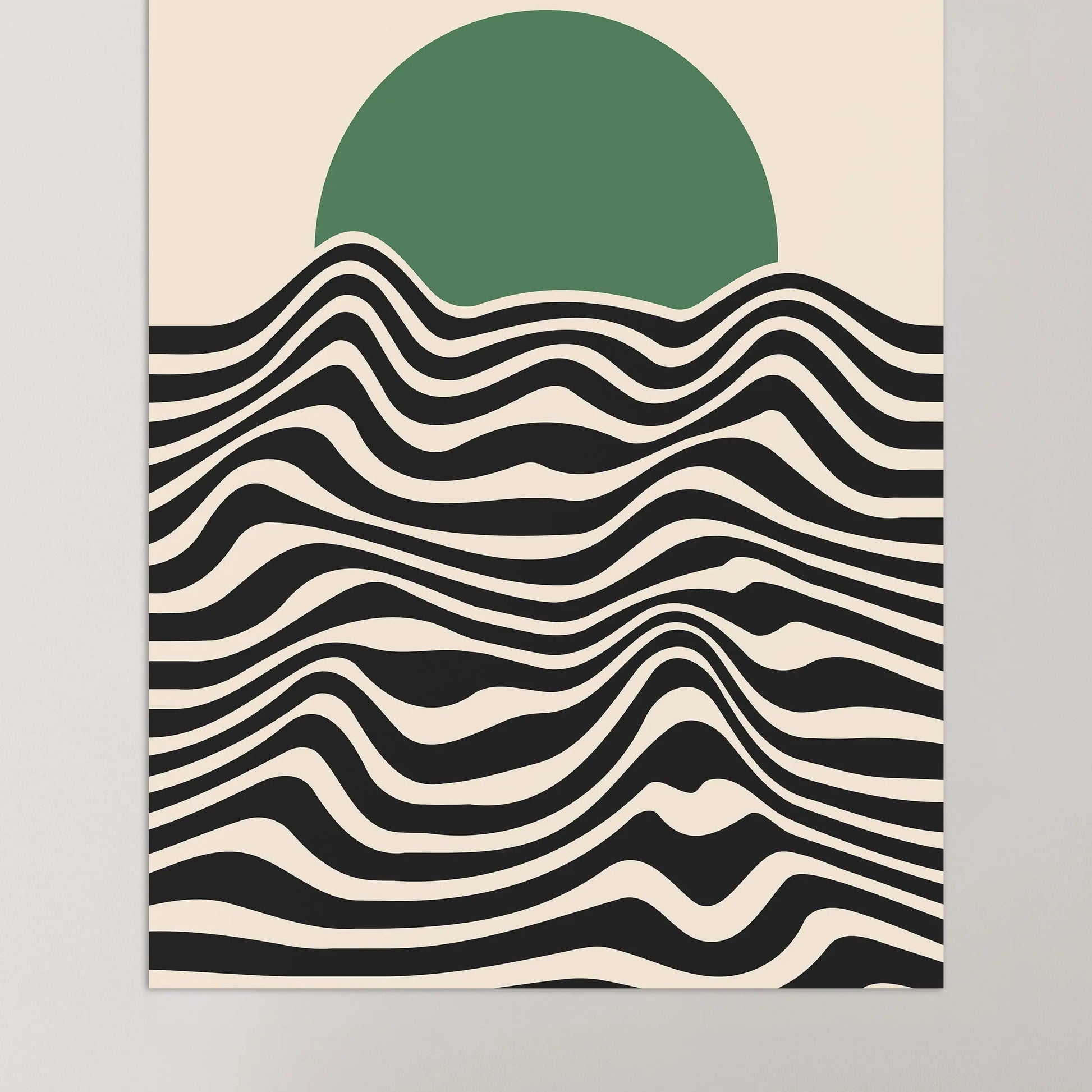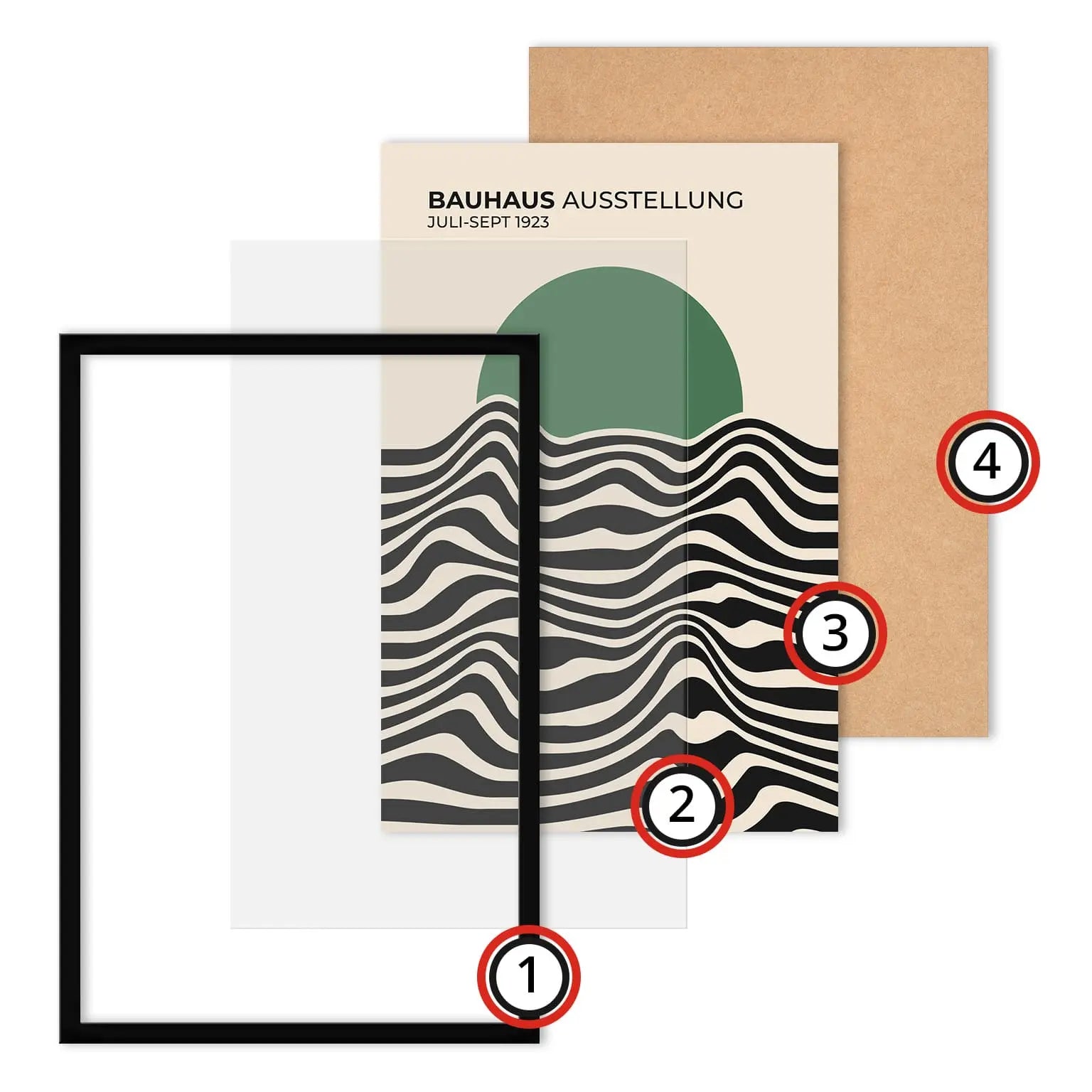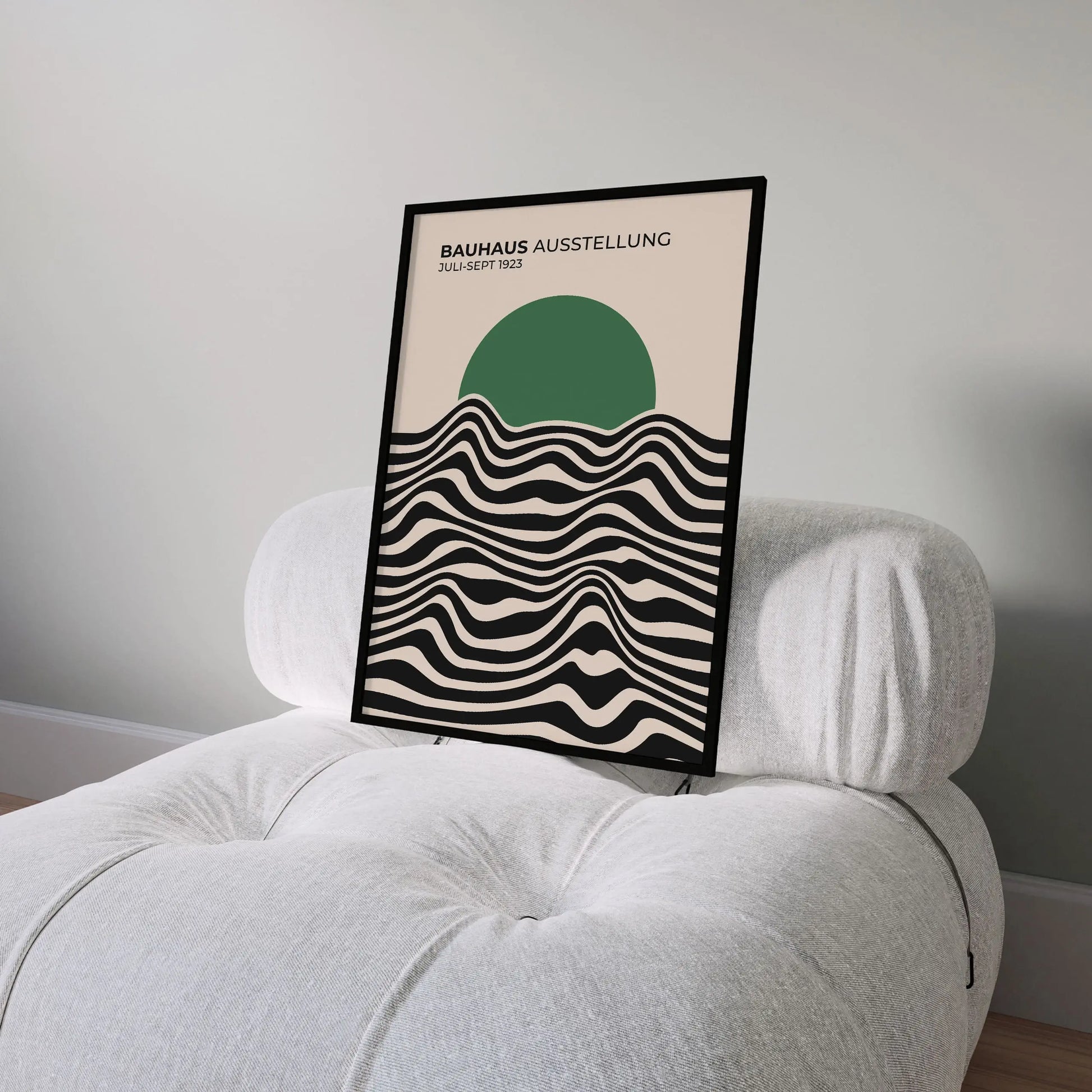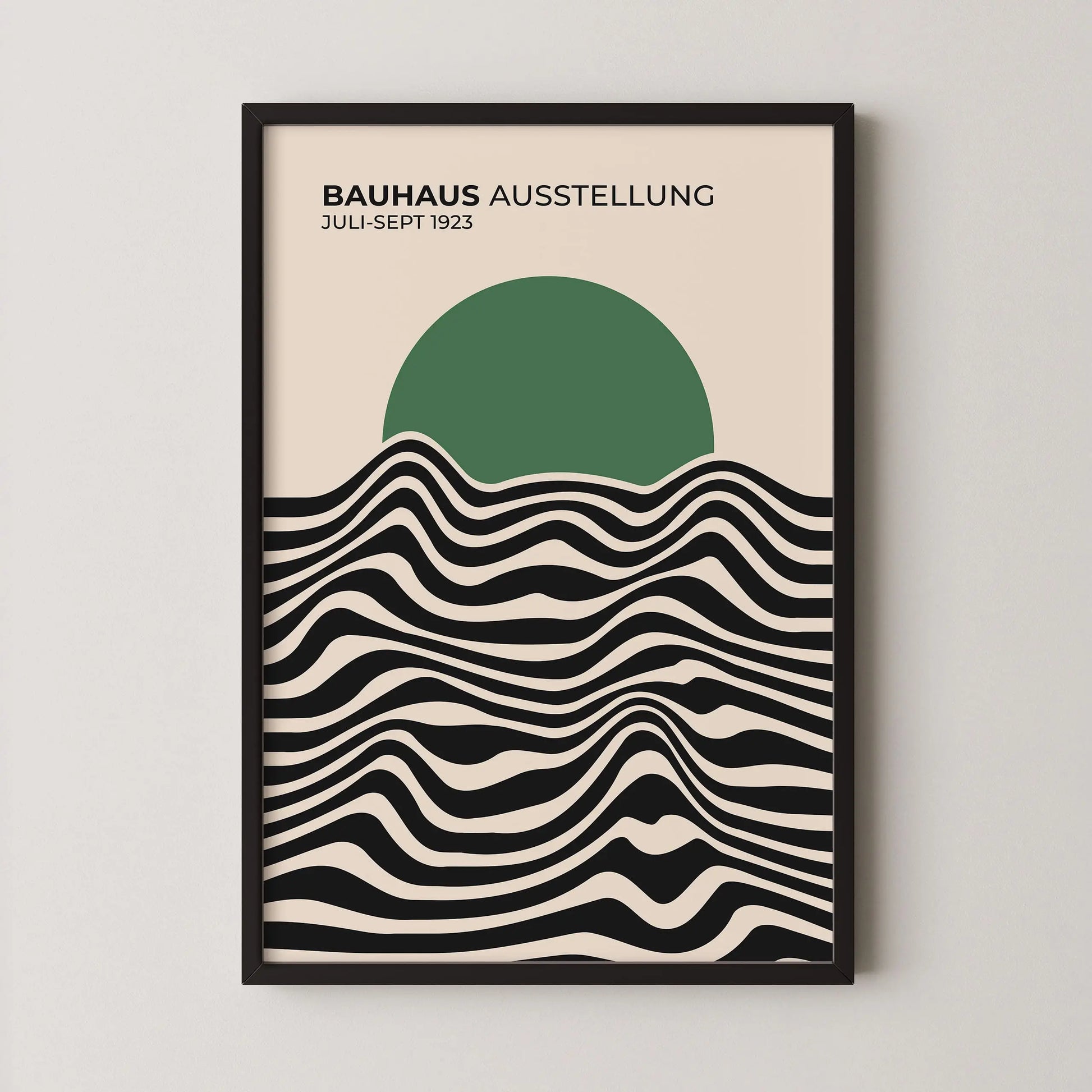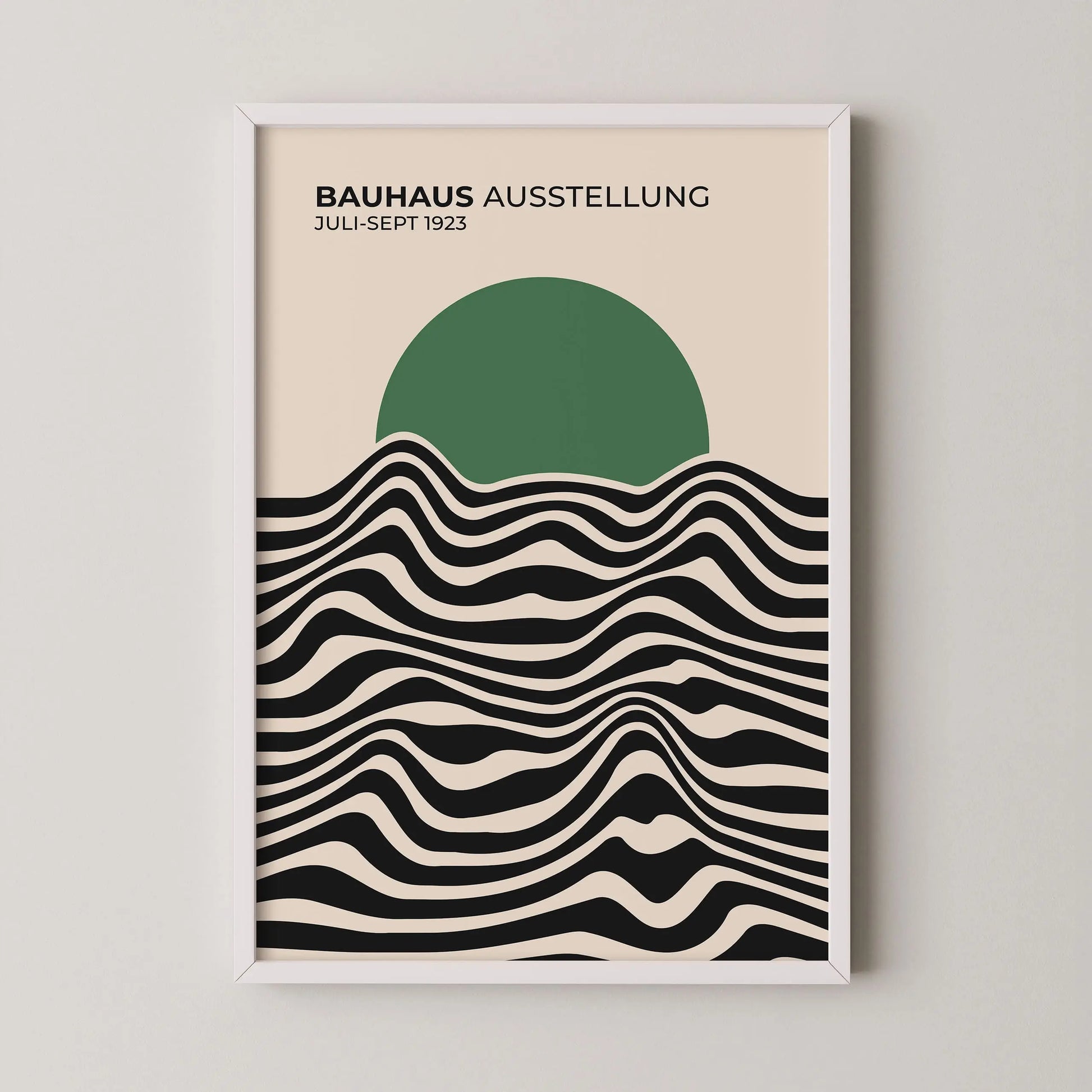 Dieses Bauhaus-Vintageplakat besteht aus parallelen, gewellten Linien, die abwechselnd in hellen und dunklen Flächen ausgeführt sind und horizontal im unteren Bereich angeordnet sind. Diese Linien bilden fließende, kontinuierliche Kurven und erzeugen einen gleichmäßigen visuellen Rhythmus. Der obere Bereich wird von einer vollflächigen Scheibe eingenommen, die die Linien teilweise überlagert und einen klaren Kontrast zwischen organischen Formen und einfacher Geometrie schafft.