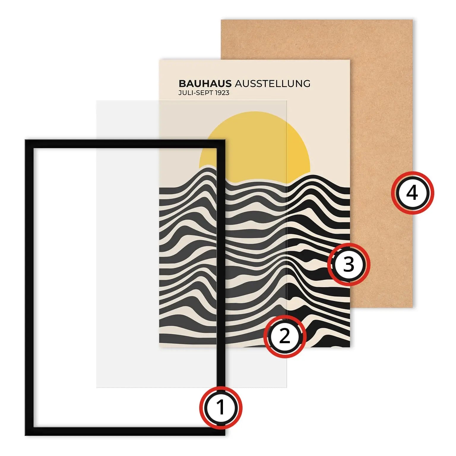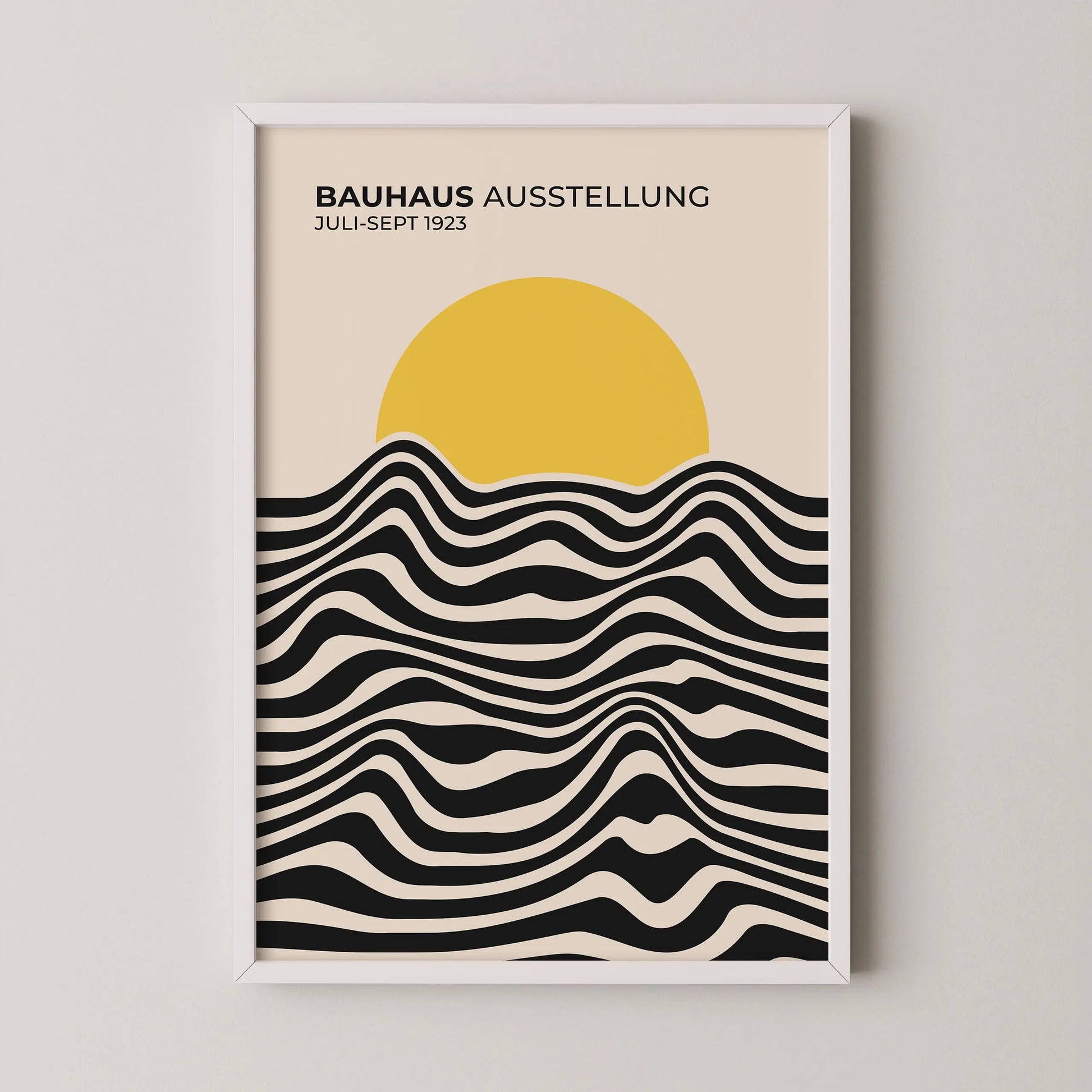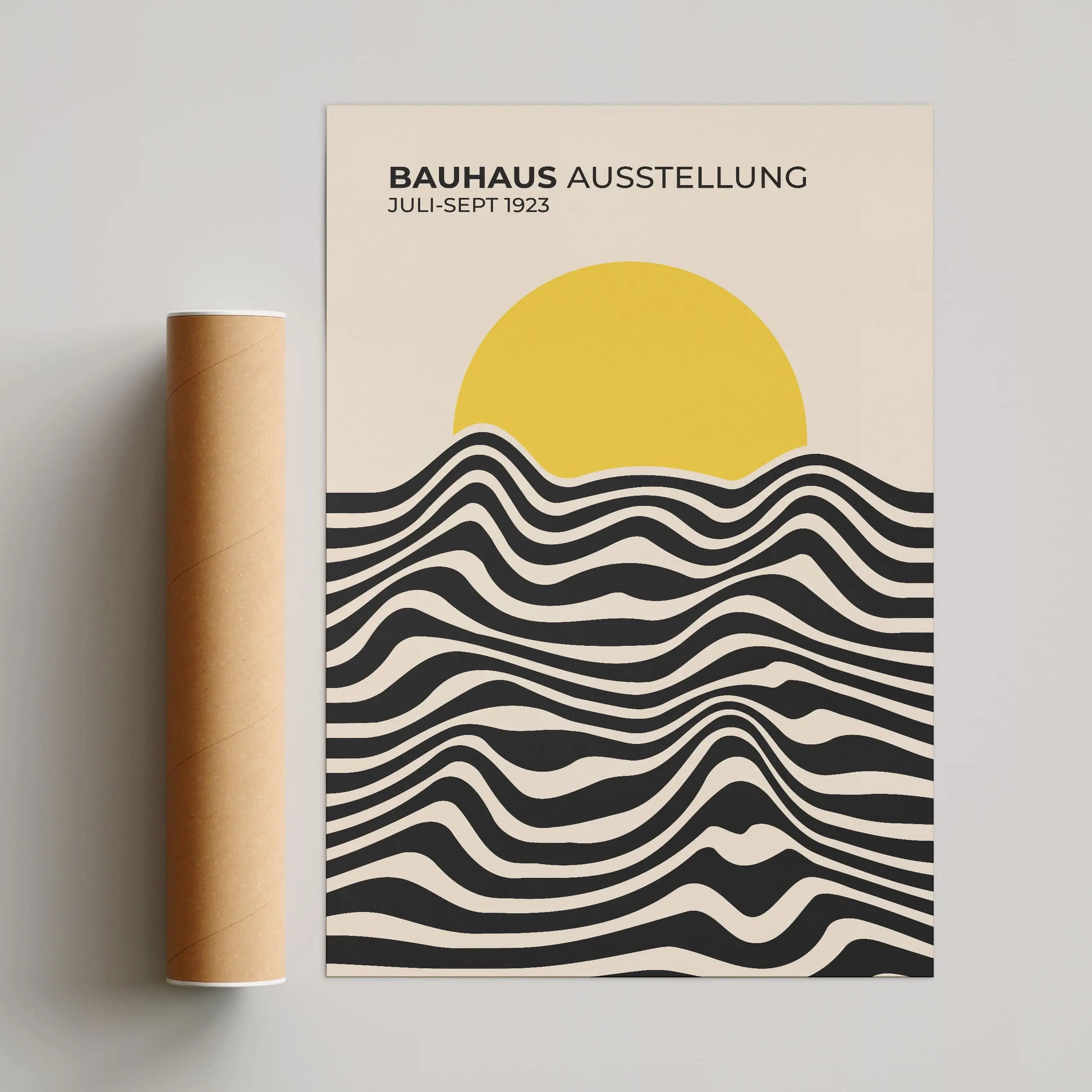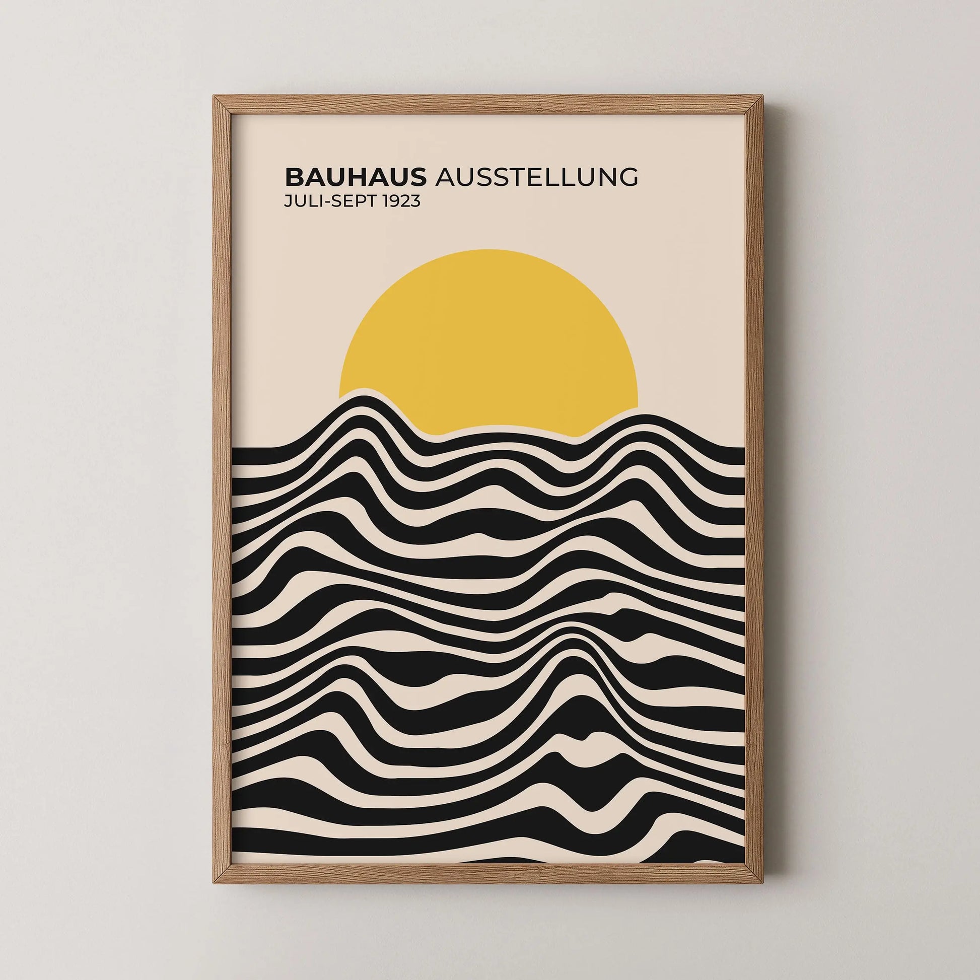 Dieses Bauhaus-Vintageplakat besteht aus parallelen, gewellten Linien, die abwechselnd in hellen und dunklen Flächen ausgeführt sind und horizontal im unteren Bereich angeordnet sind. Diese Linien bilden fließende, kontinuierliche Kurven und erzeugen einen gleichmäßigen visuellen Rhythmus. Der obere Bereich wird von einer vollflächigen Scheibe eingenommen, die die Linien teilweise überlagert und einen klaren Kontrast zwischen organischen Formen und einfacher Geometrie schafft.
