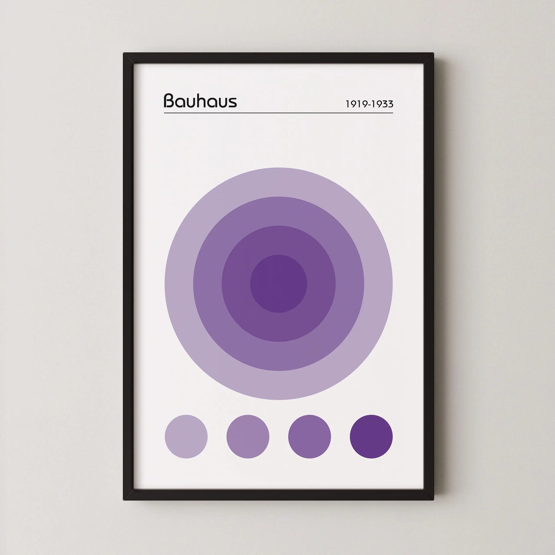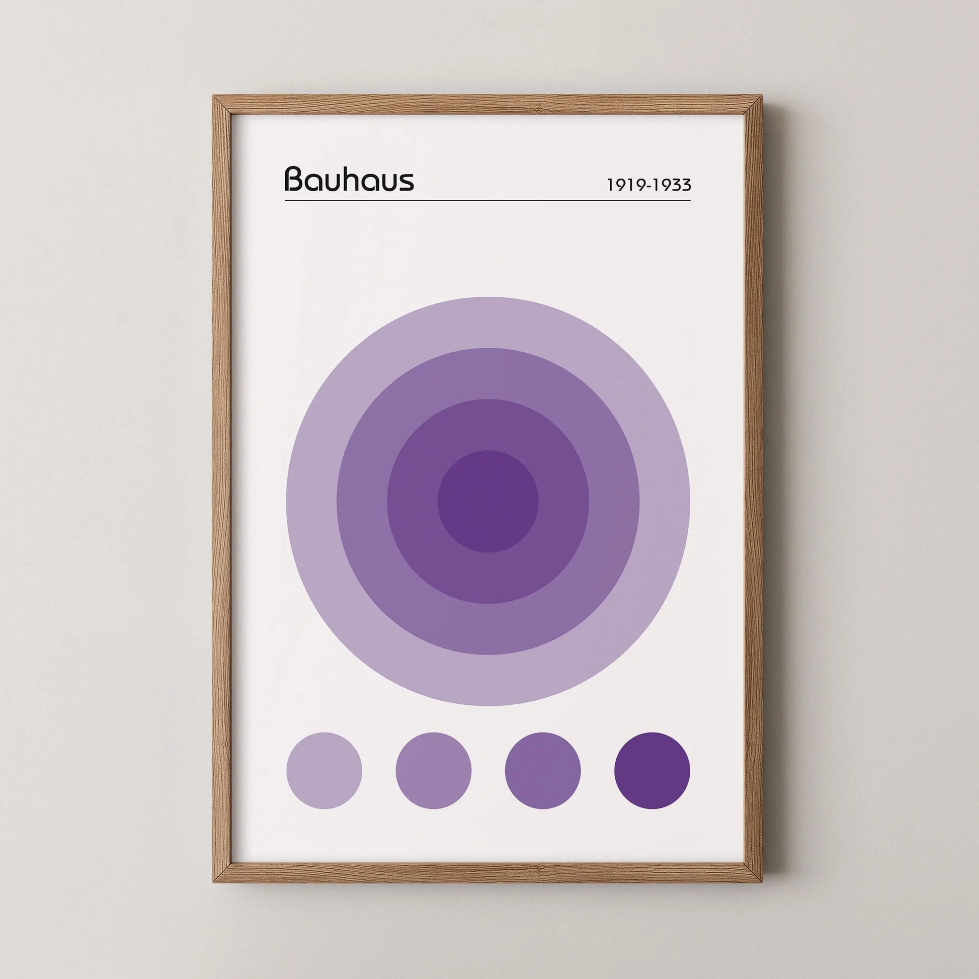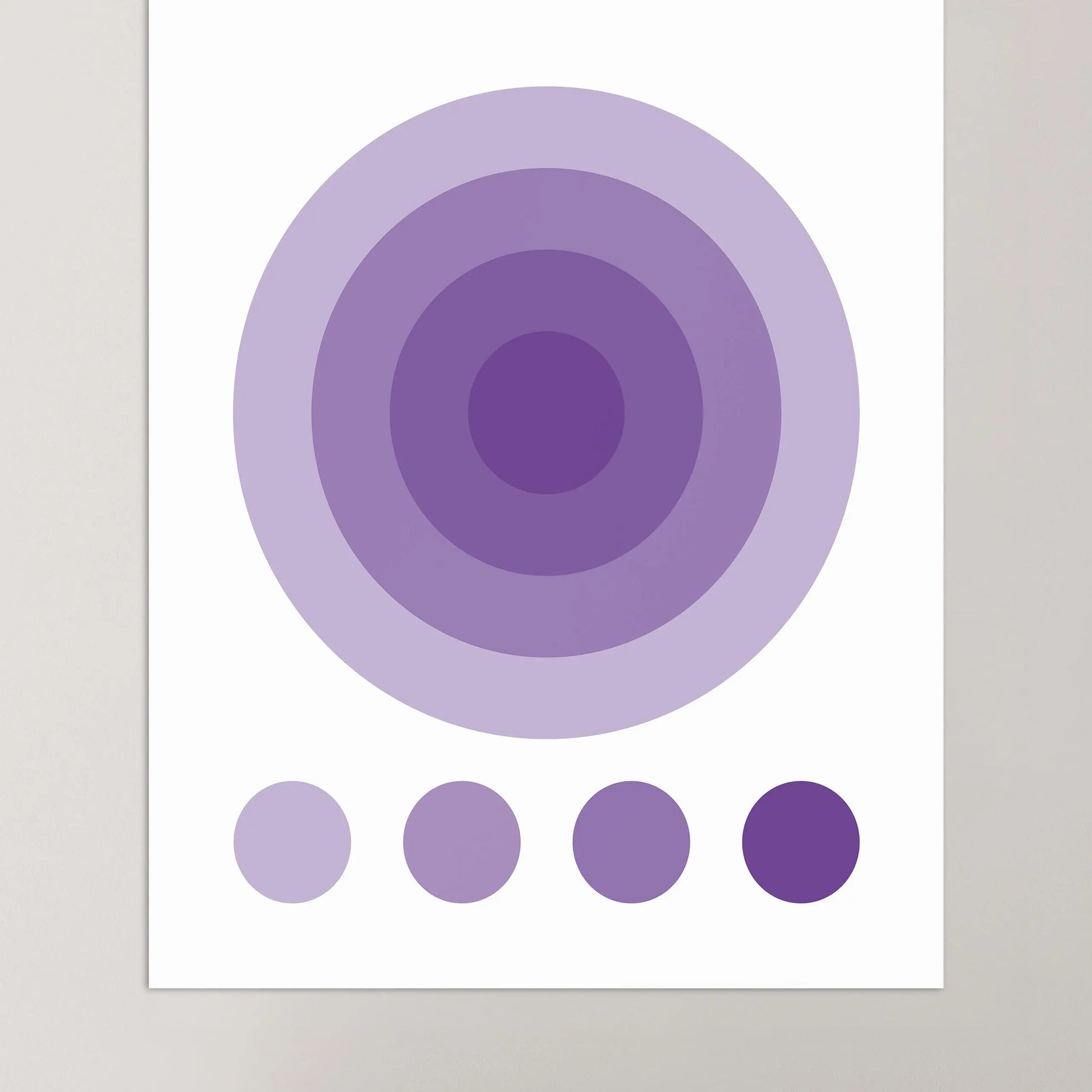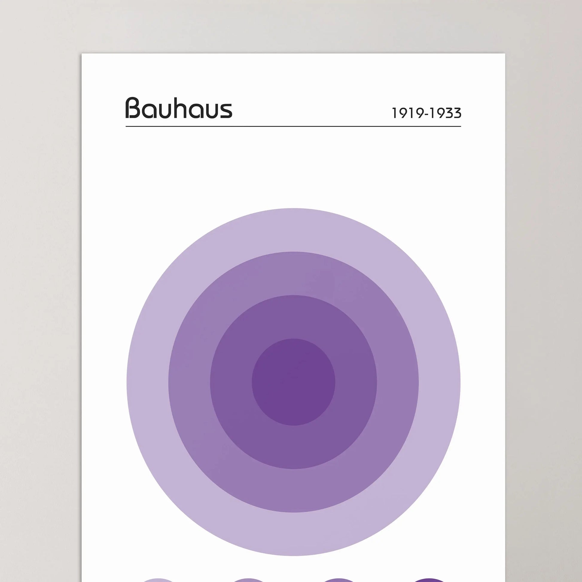 Dieses geometrische Bauhaus-Poster in der Farbe Violett zeigt eine nuancierte, geometrische Komposition, die aus einer Anordnung konzentrischer Kreise im Zentrum besteht. Unter diesem Hauptmotiv befinden sich vier kleine, ausgerichtete Kreise, die dieselben Farbtöne aufgreifen.