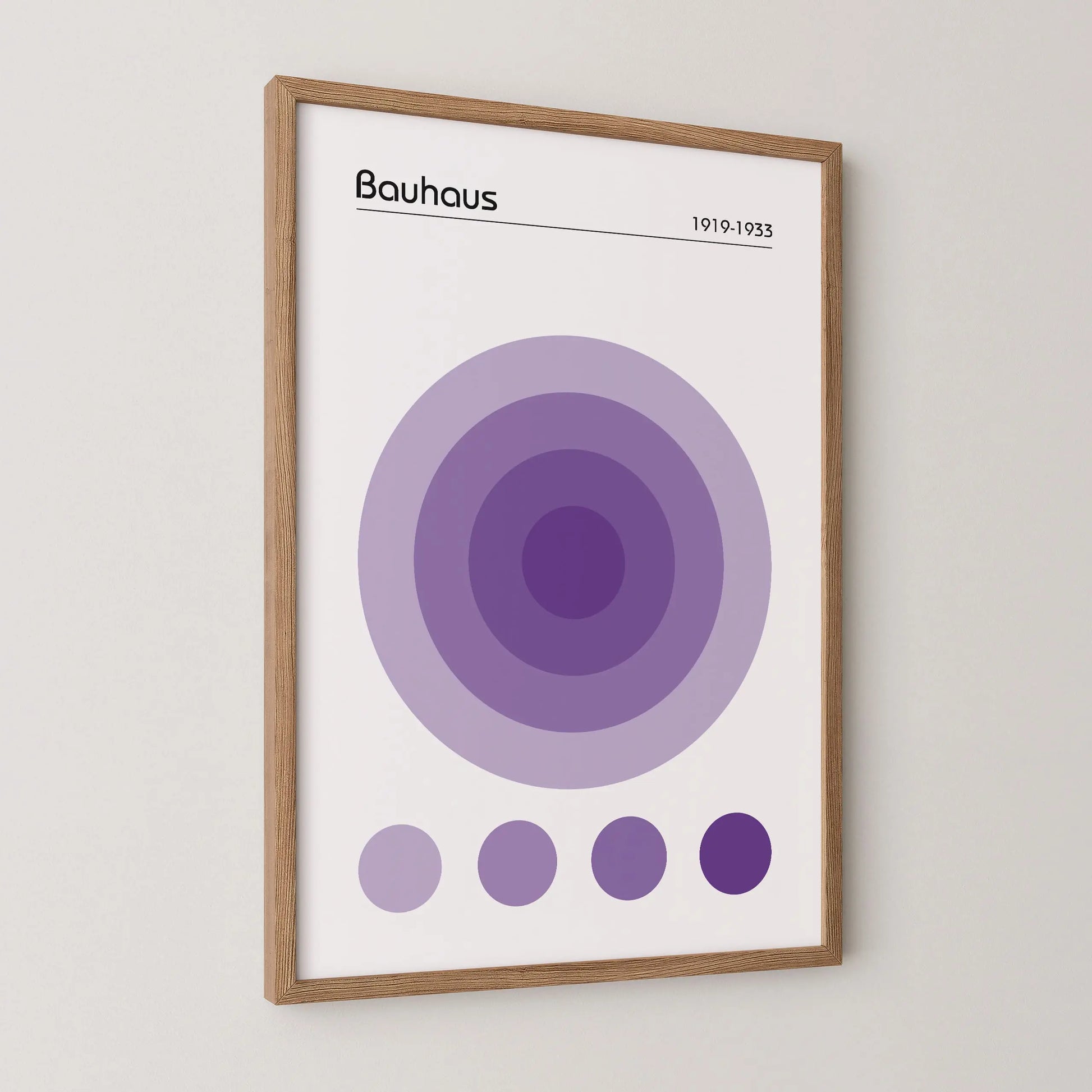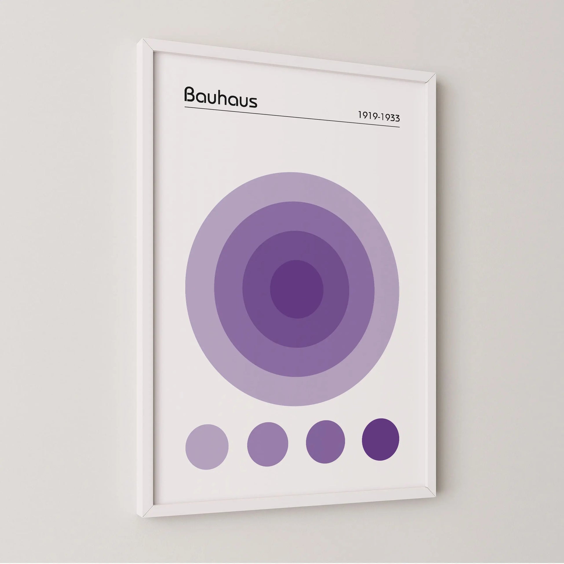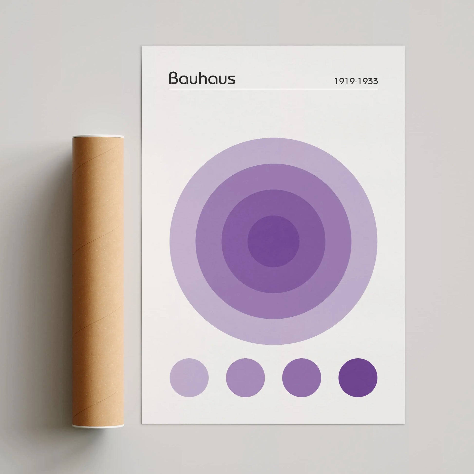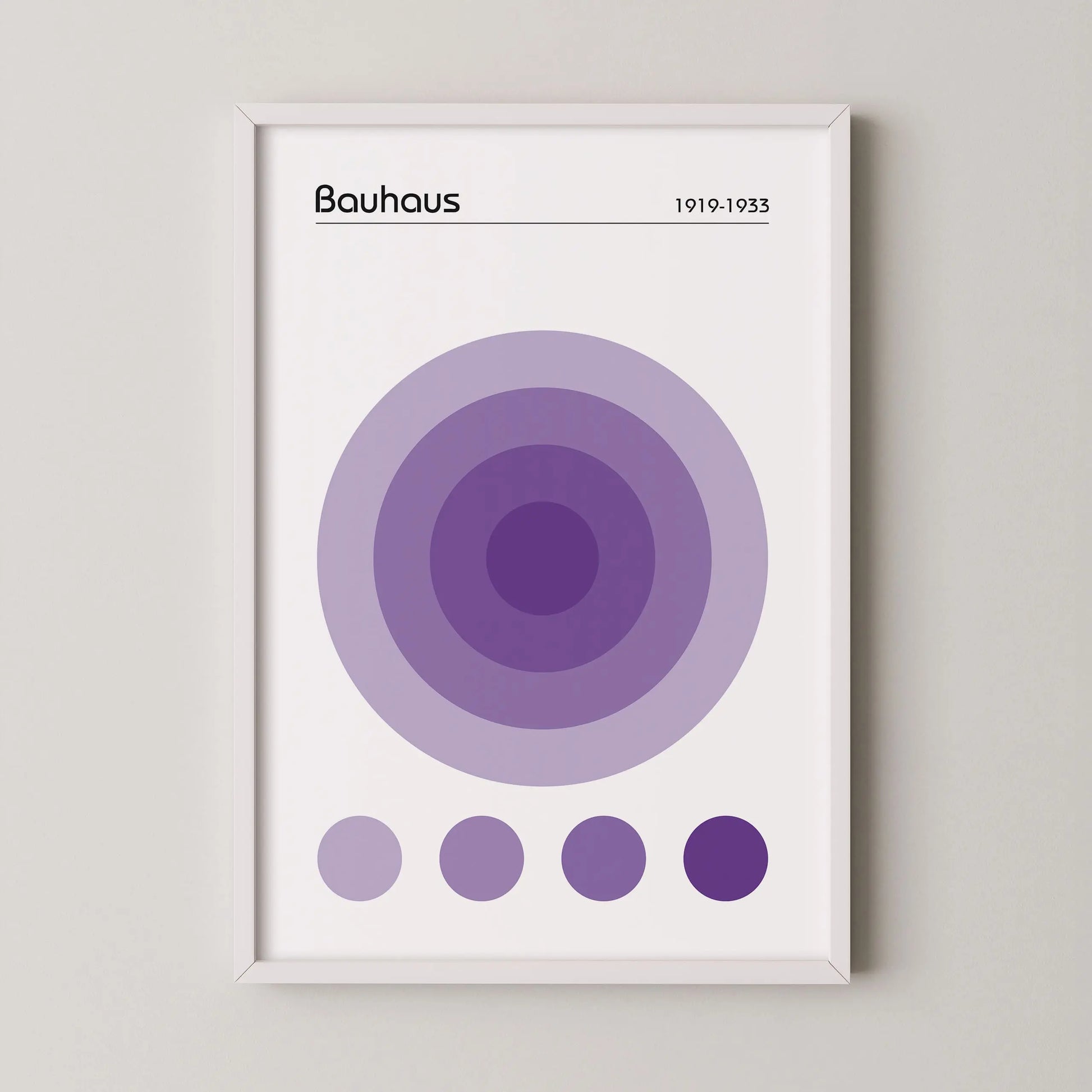 Dieses geometrische Bauhaus-Poster in der Farbe Violett zeigt eine nuancierte, geometrische Komposition, die aus einer Anordnung konzentrischer Kreise im Zentrum besteht. Unter diesem Hauptmotiv befinden sich vier kleine, ausgerichtete Kreise, die dieselben Farbtöne aufgreifen.