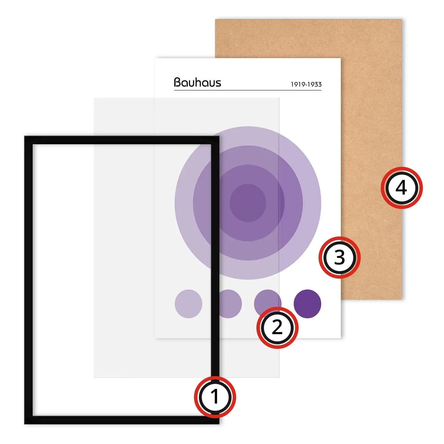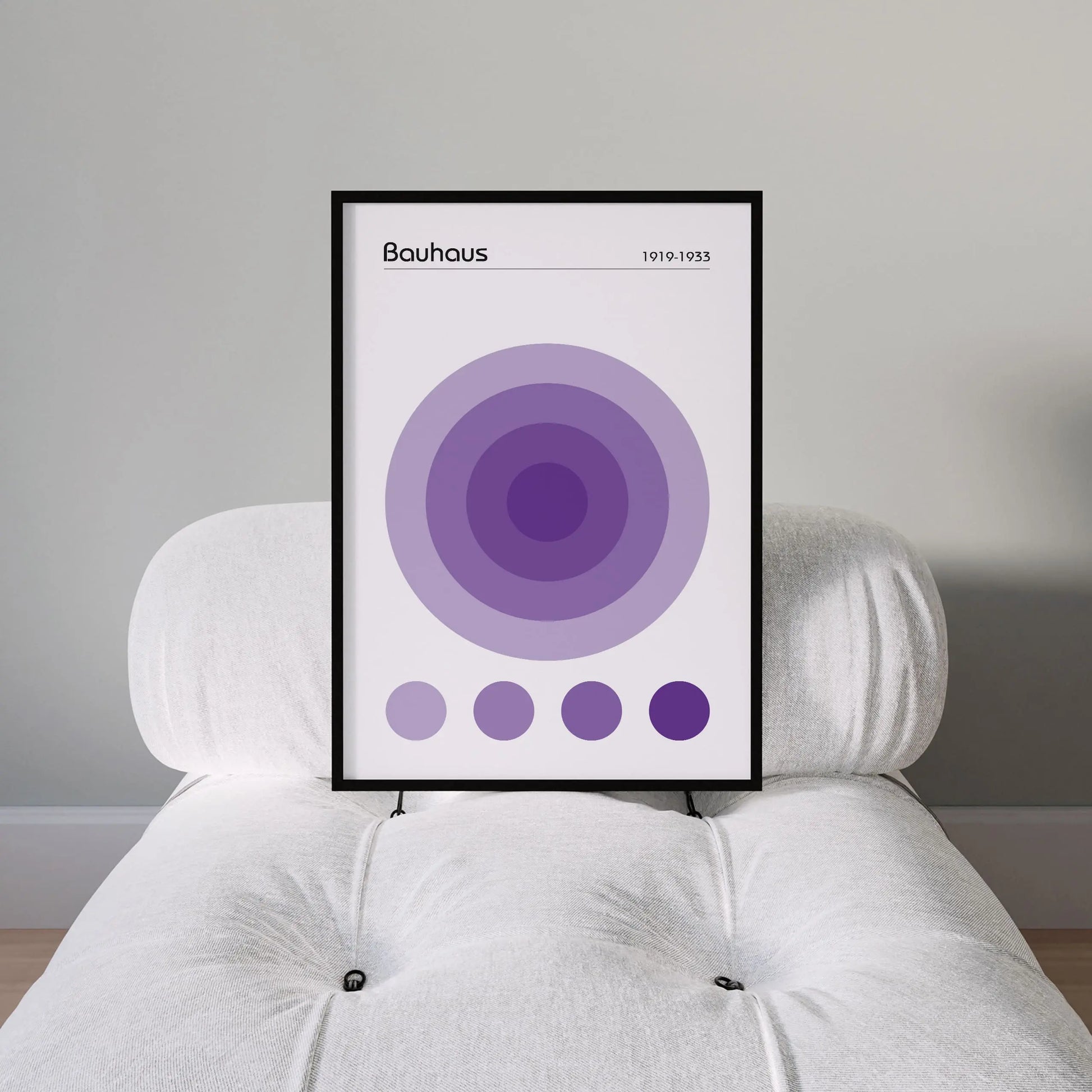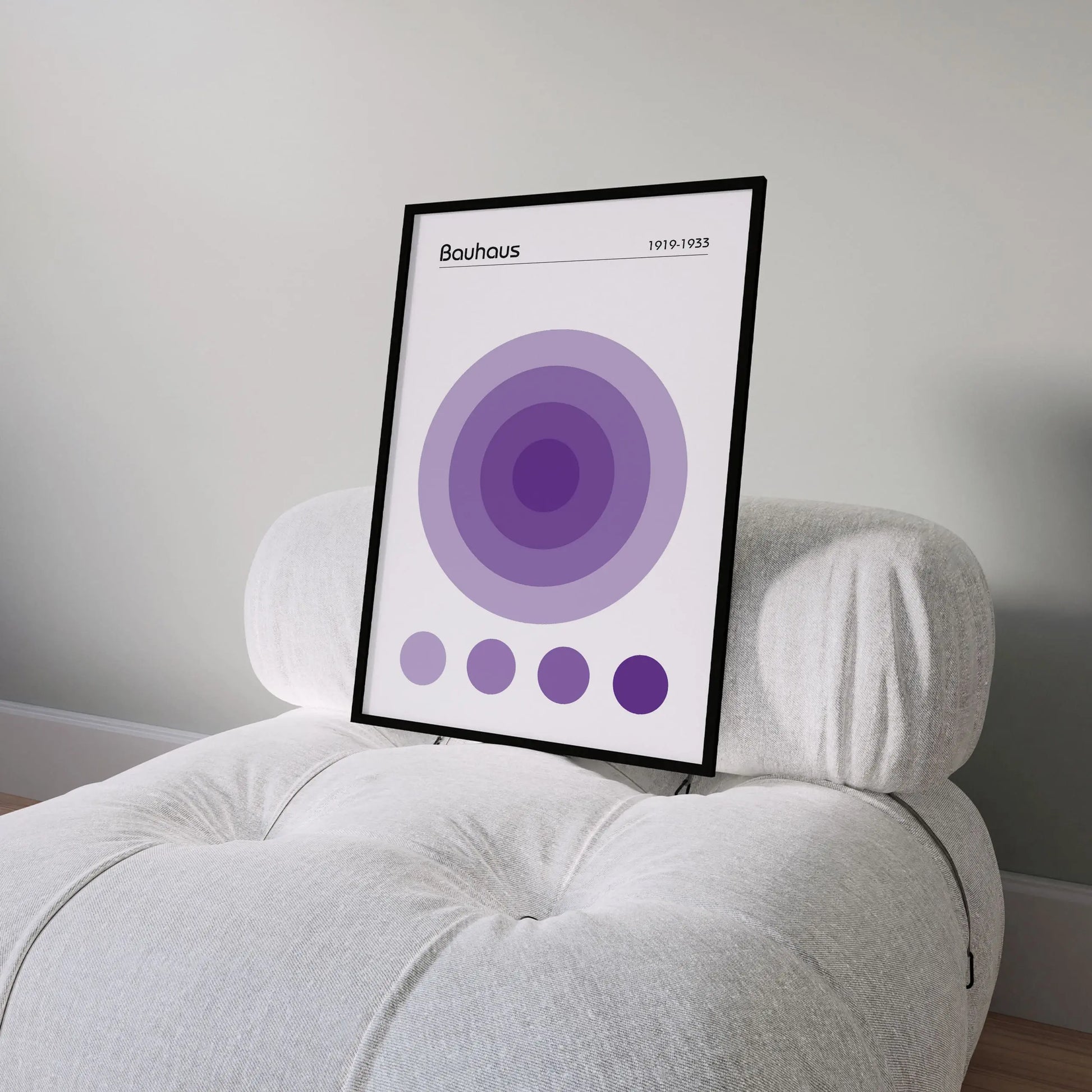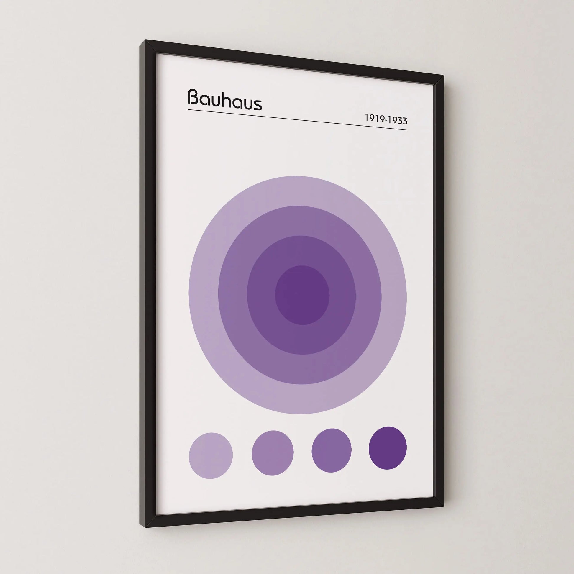 Dieses geometrische Bauhaus-Poster in der Farbe Violett zeigt eine nuancierte, geometrische Komposition, die aus einer Anordnung konzentrischer Kreise im Zentrum besteht. Unter diesem Hauptmotiv befinden sich vier kleine, ausgerichtete Kreise, die dieselben Farbtöne aufgreifen.