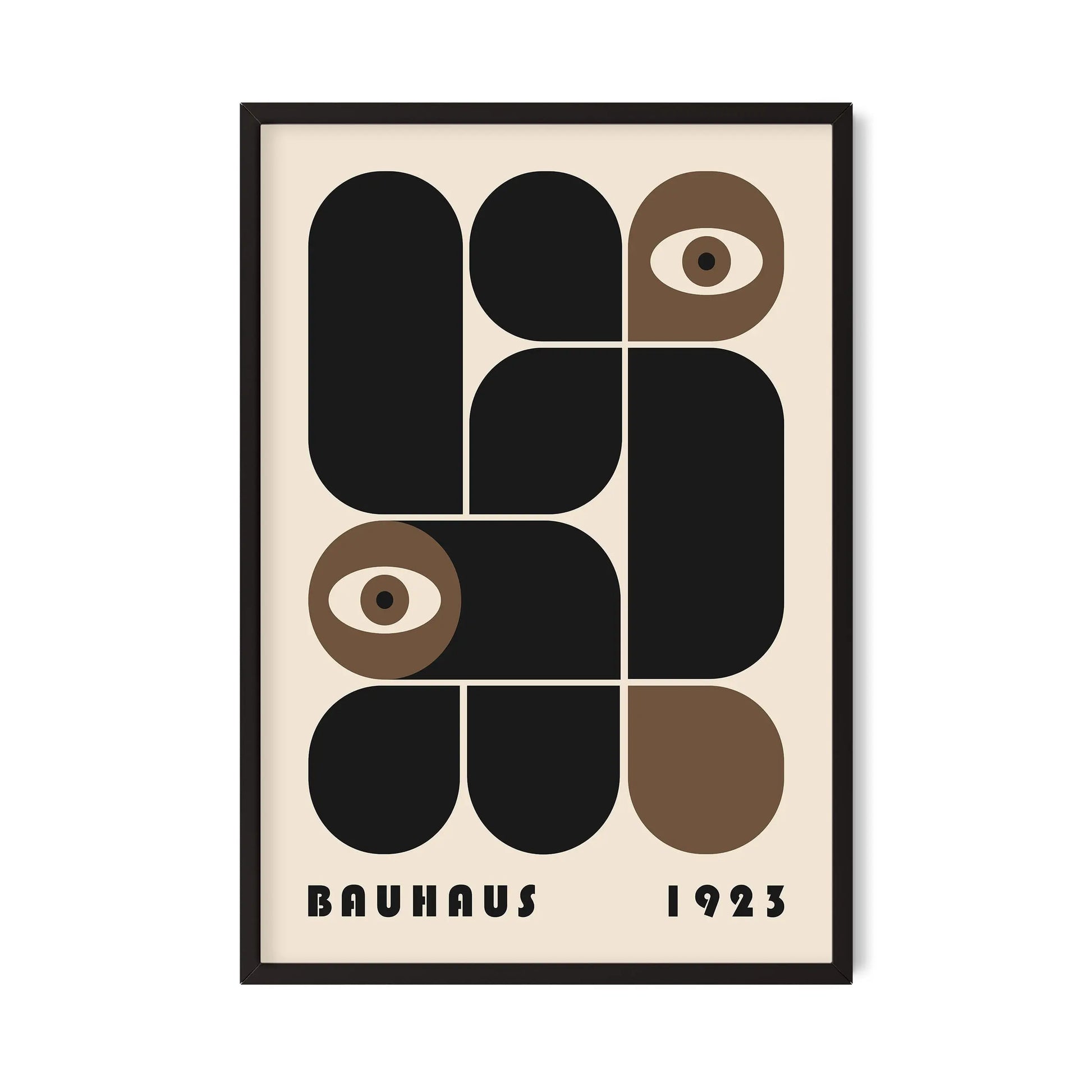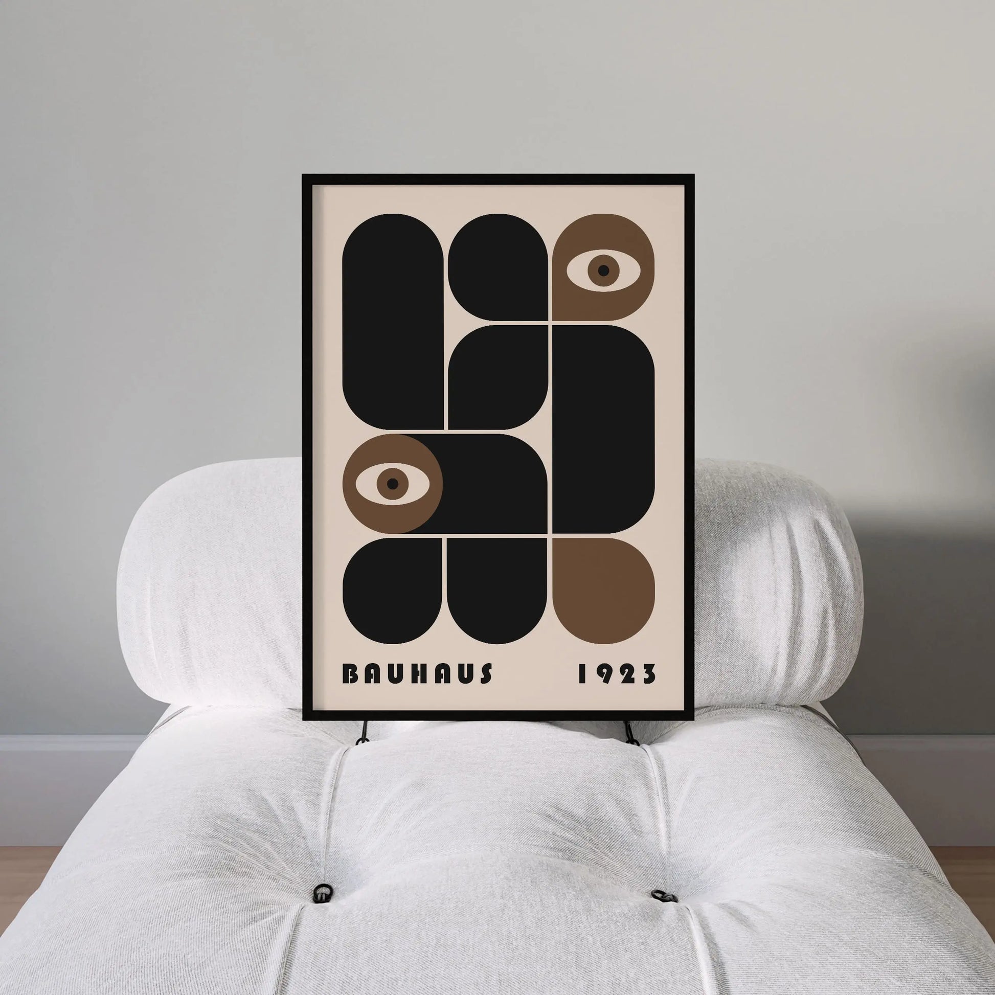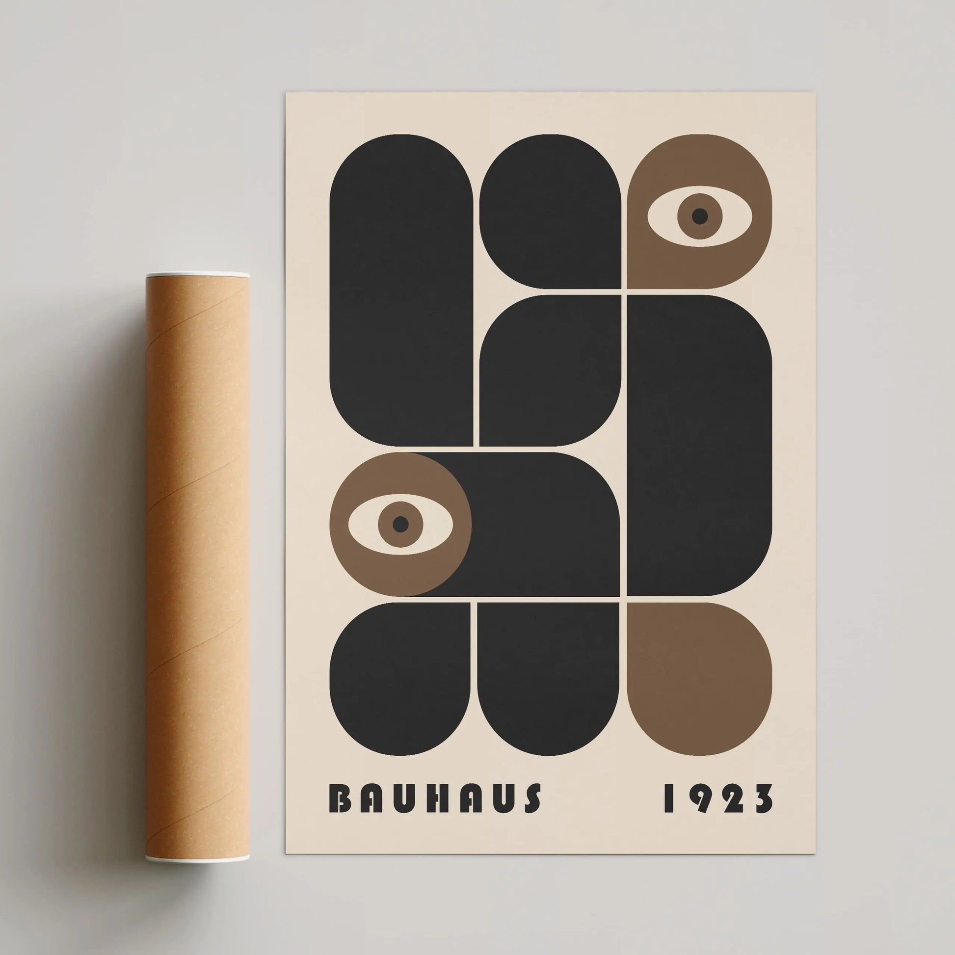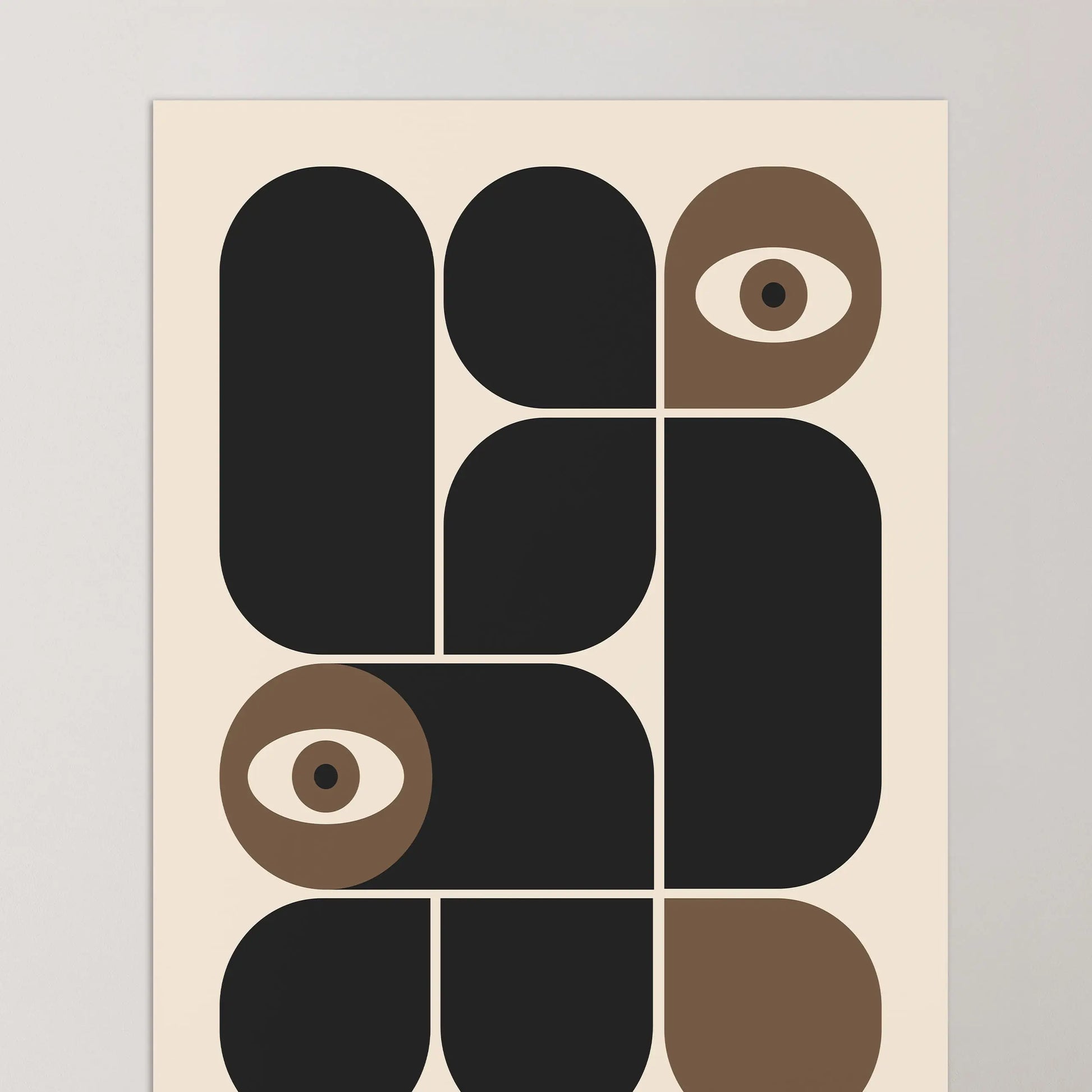 Dieses grafische Bauhaus-Vintage-Plakat besteht aus modularen Formen mit abgerundeten oder strengen Winkeln, die nach einem definierten Raster nebeneinander angeordnet sind, teils in komplementärer Beziehung, teils in Opposition. Das Auftreten stilisierter Augen führt eine menschliche und konzeptuelle Dimension ein und deutet auf einen kritischen Blick hin, der in das rationale System der Moderne integriert ist.
