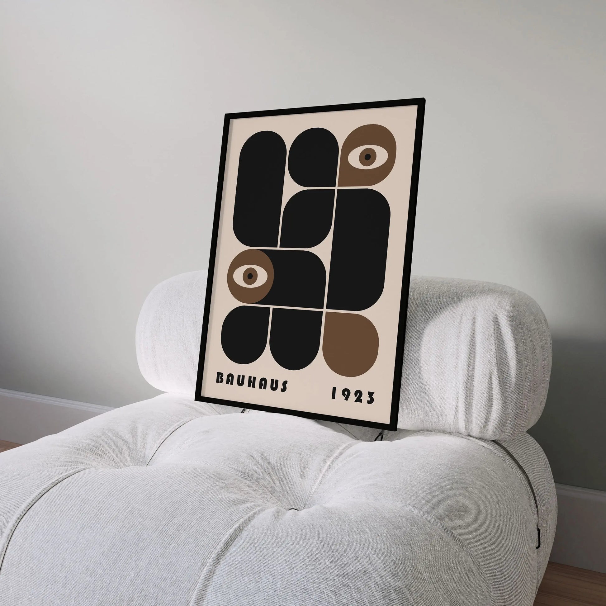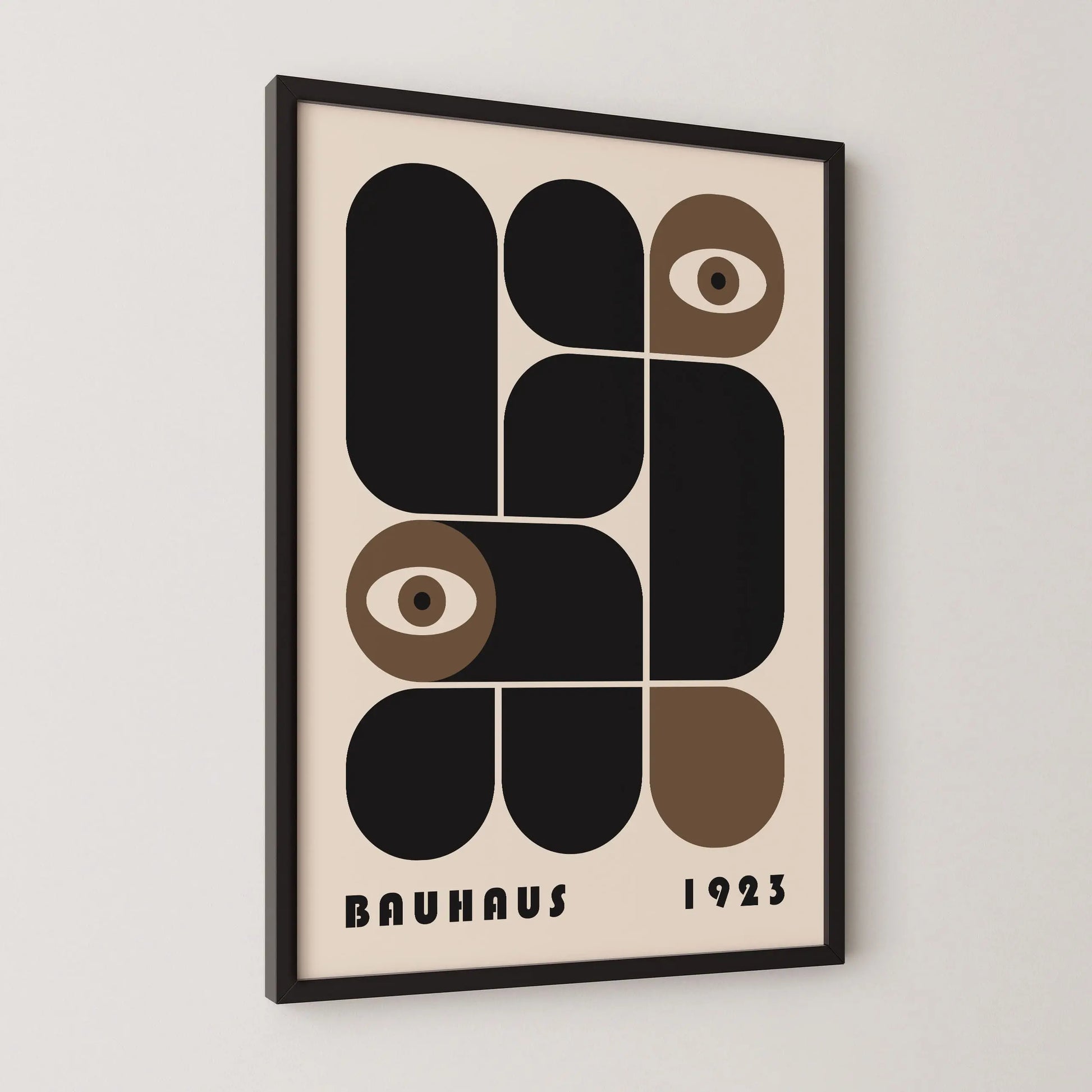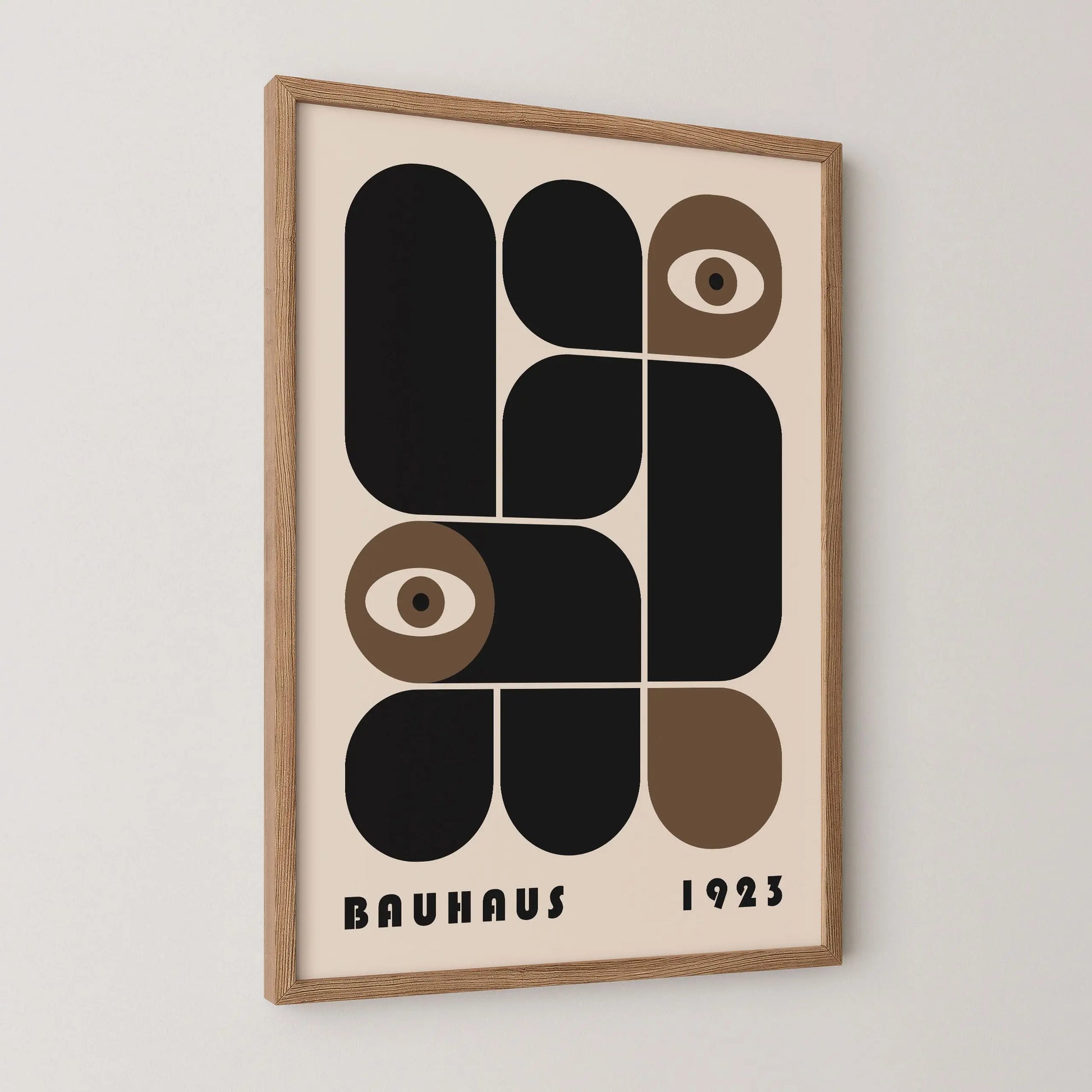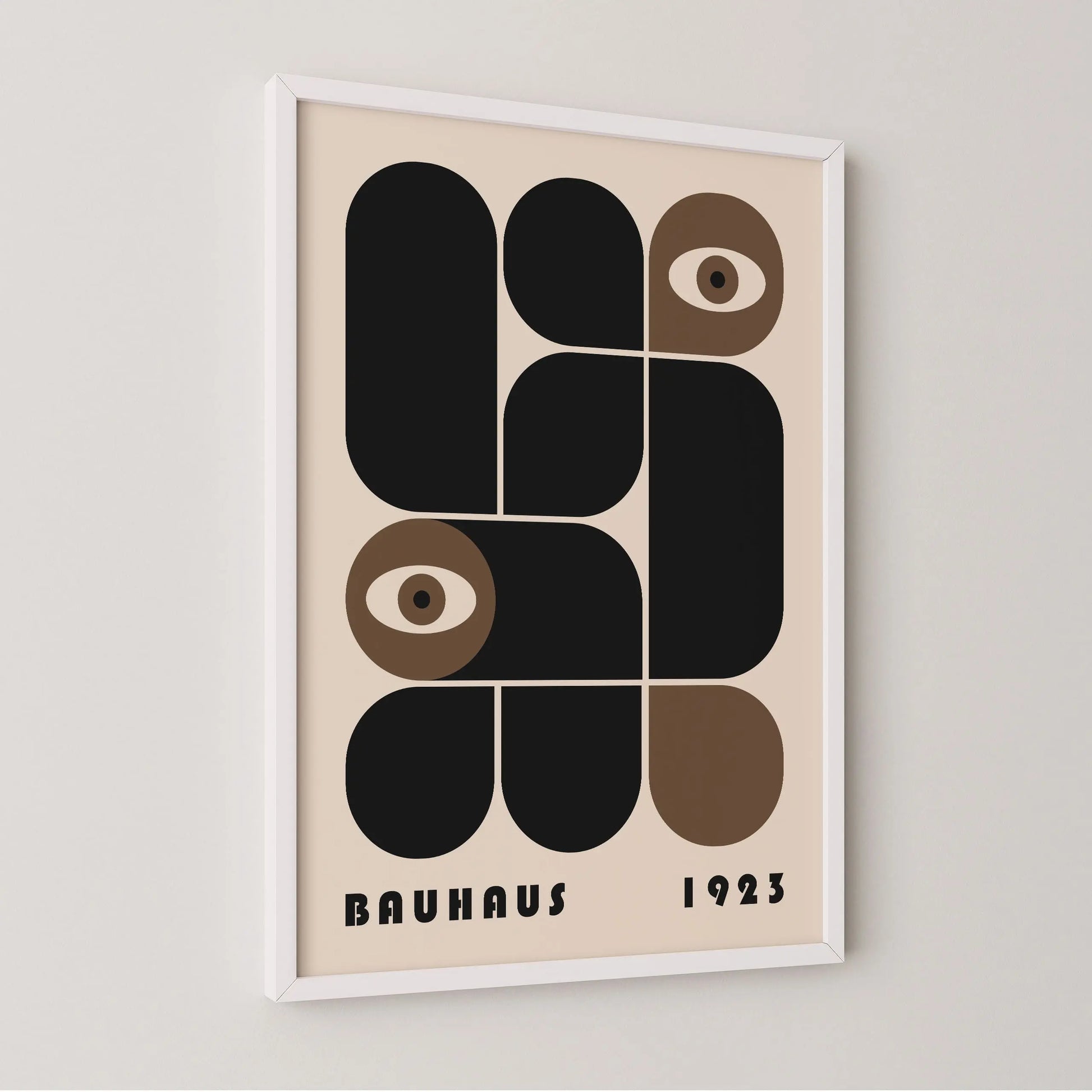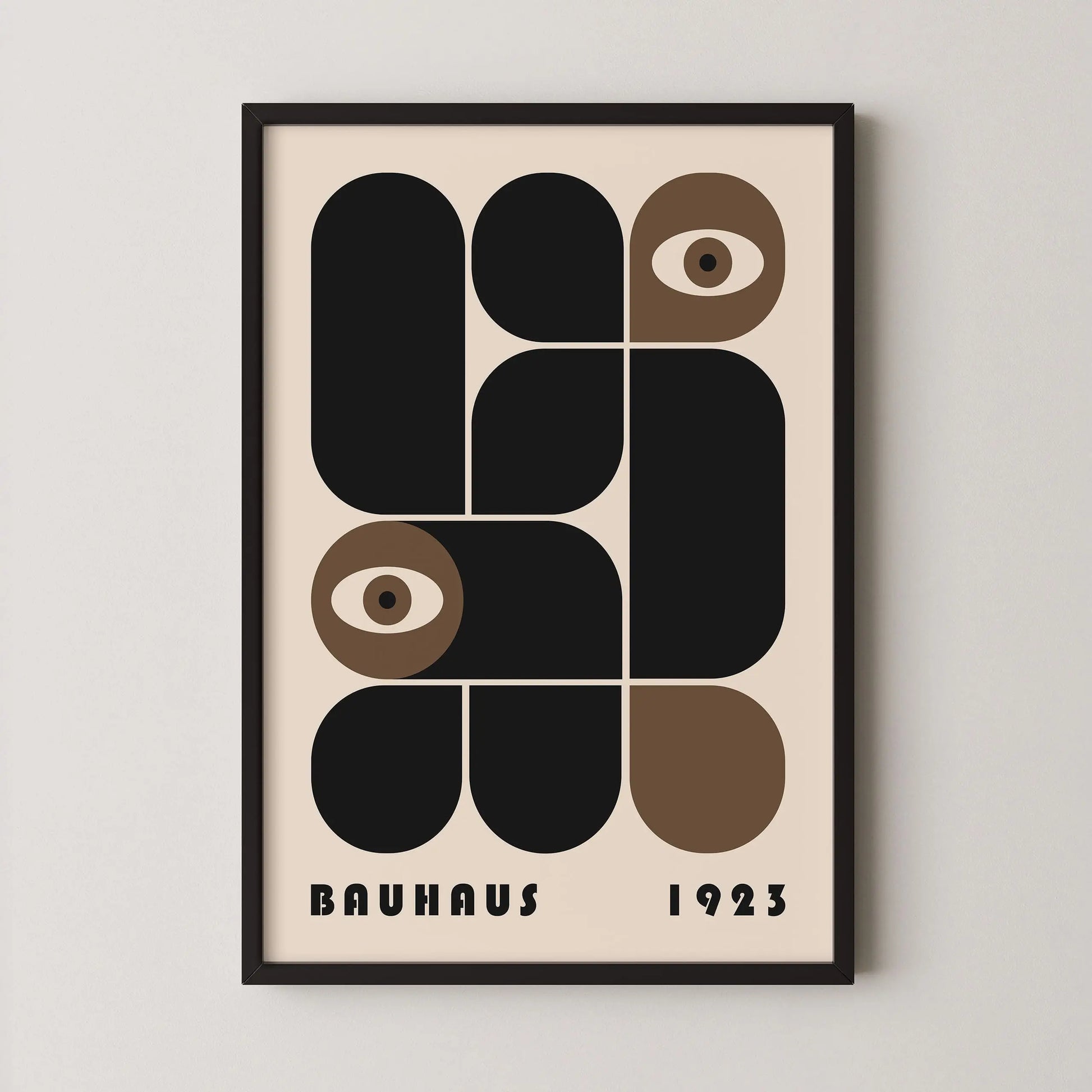 Dieses grafische Bauhaus-Vintage-Plakat besteht aus modularen Formen mit abgerundeten oder strengen Winkeln, die nach einem definierten Raster nebeneinander angeordnet sind, teils in komplementärer Beziehung, teils in Opposition. Das Auftreten stilisierter Augen führt eine menschliche und konzeptuelle Dimension ein und deutet auf einen kritischen Blick hin, der in das rationale System der Moderne integriert ist.