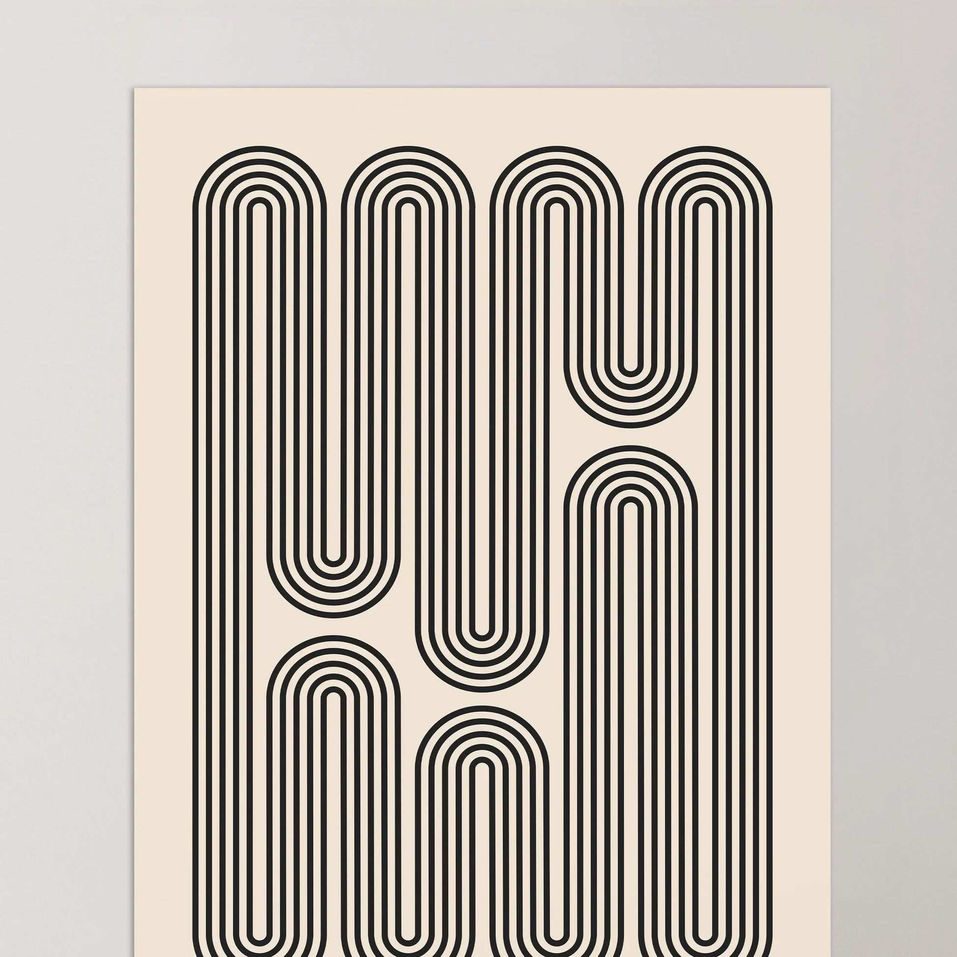 Dieses minimalistische Bauhaus-Vintageplakat besteht aus durchgehenden, parallelen Linien, die sich vertikal entfalten und den Raum durch abgerundete Rückführungen in langgestreckten Schleifen strukturieren. Jede Linie folgt einem fließenden, ununterbrochenen Verlauf und wechselt zwischen geraden Segmenten und regelmäßigen Kurven. Ihre leicht versetzte Wiederholung bildet eine präzise und rhythmische grafische Architektur, die auf dem Gleichgewicht zwischen geometrischer Strenge und kontinuierlicher Bewegung beruht.