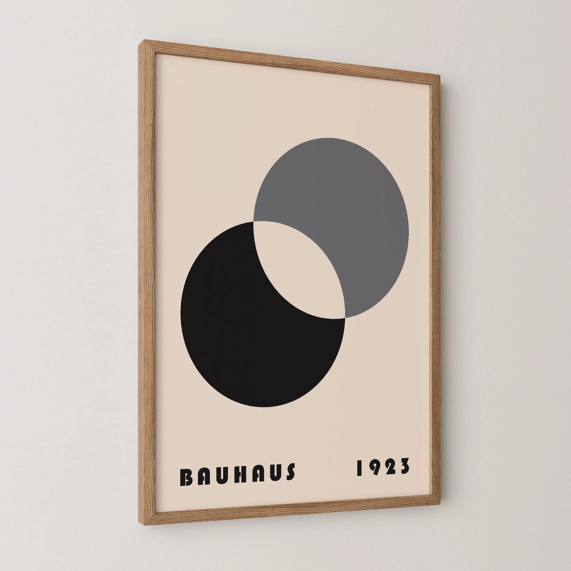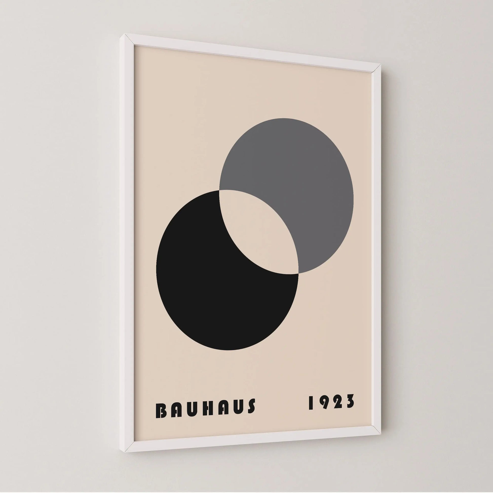 This gray Bauhaus poster depicts two intersecting circles with a positive negative effect on a beige background.