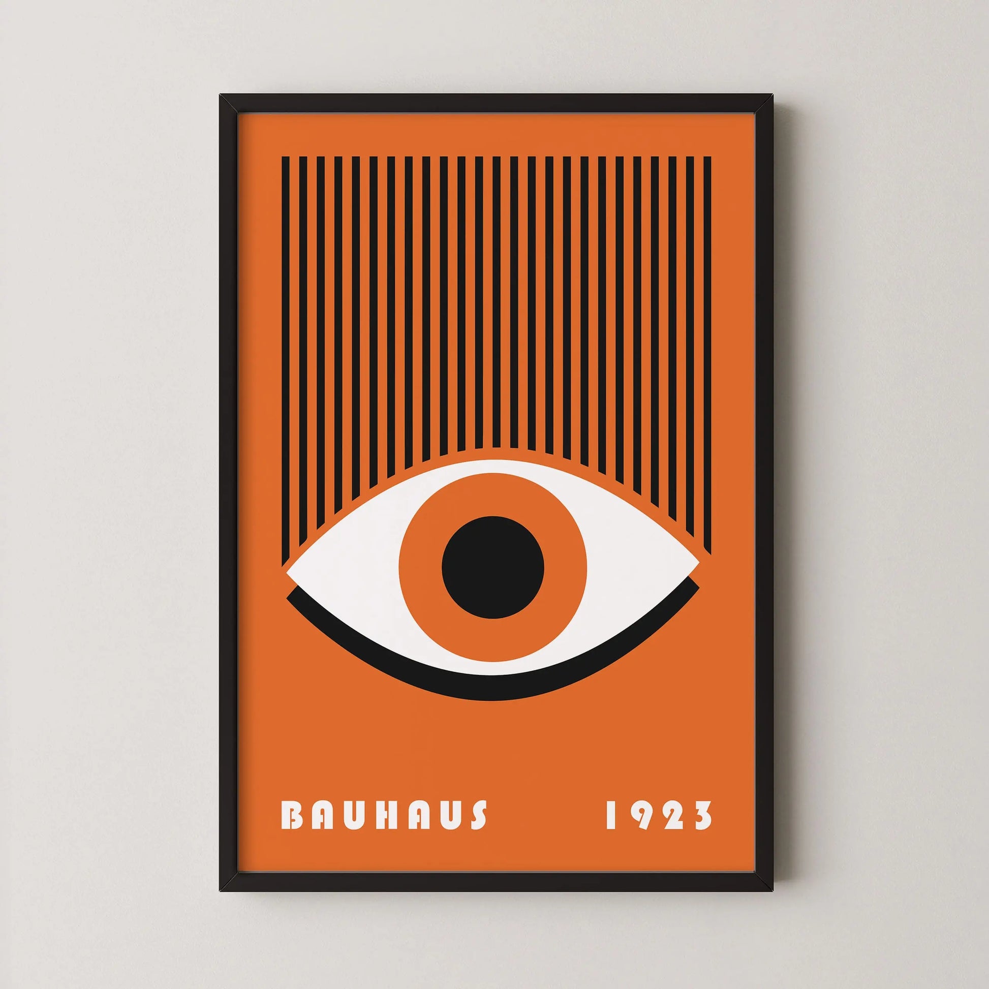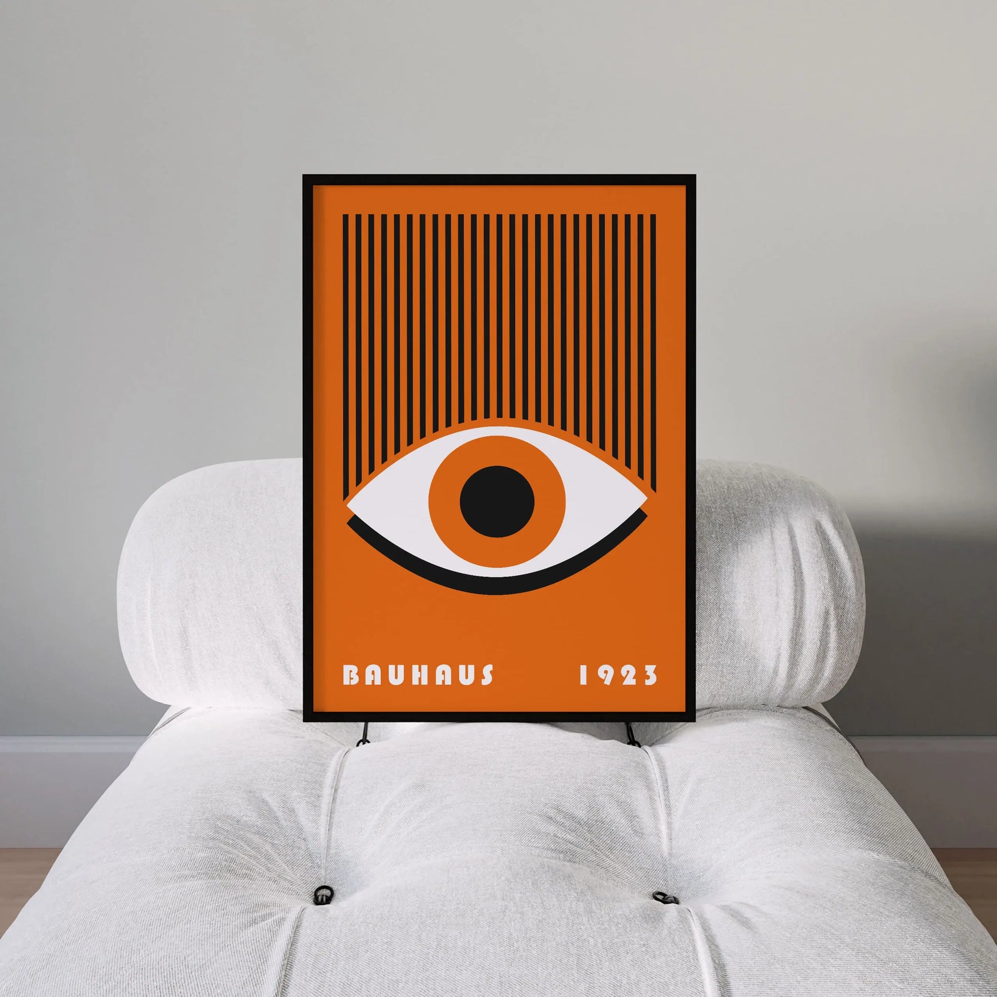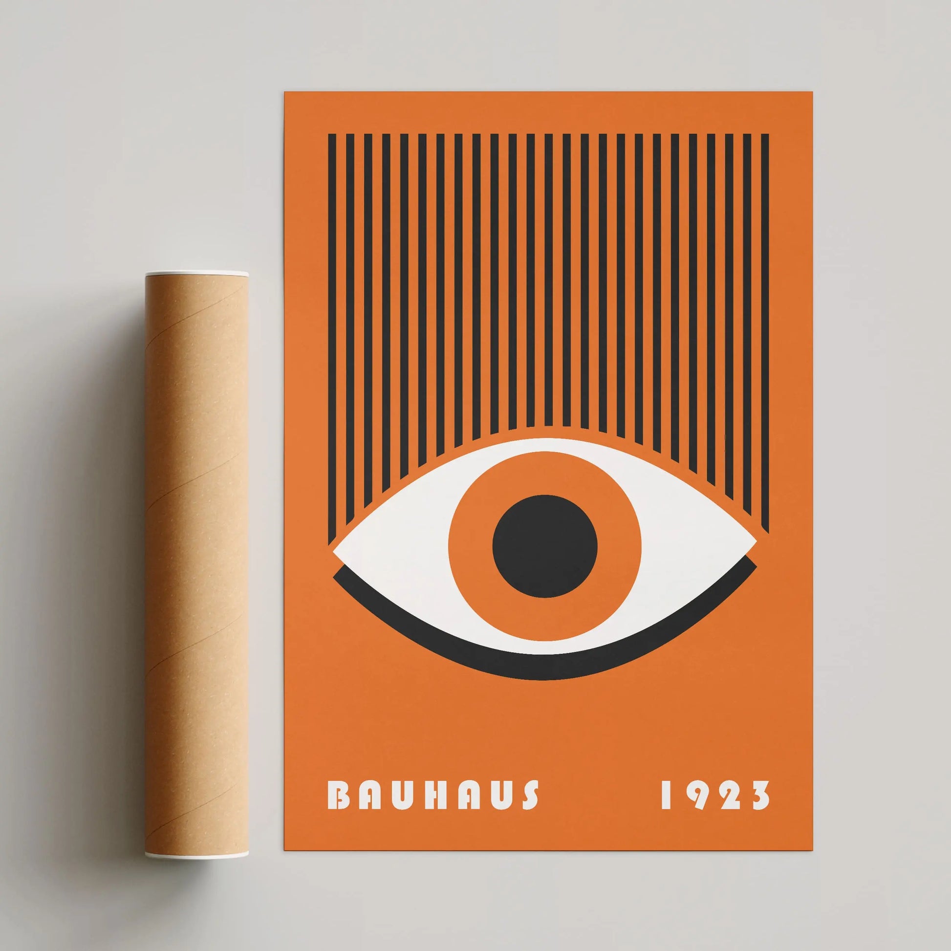 This vintage geometric Bauhaus poster is composed of parallel vertical straight lines on the upper part and the Bauhaus eye in the center on an orange colored background.