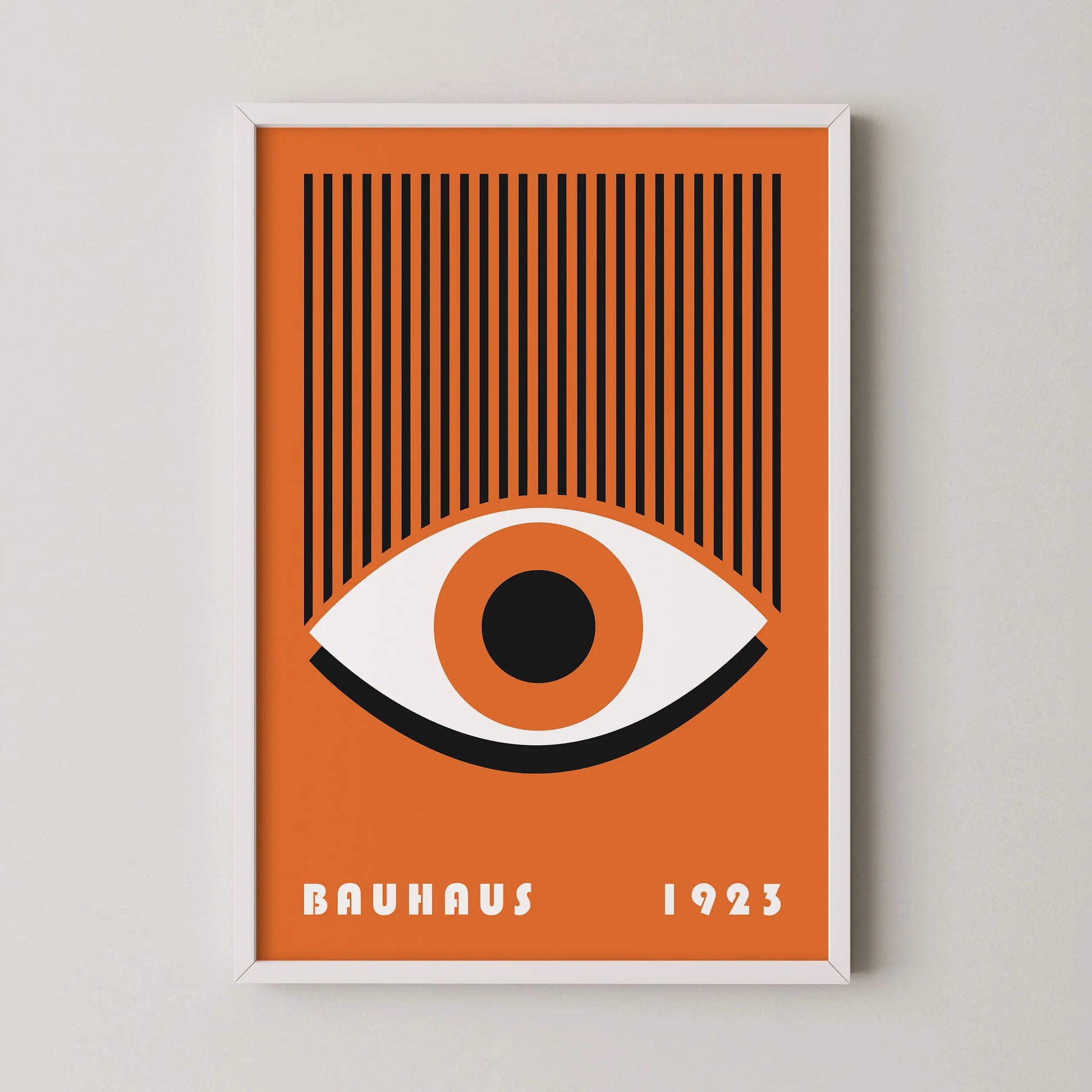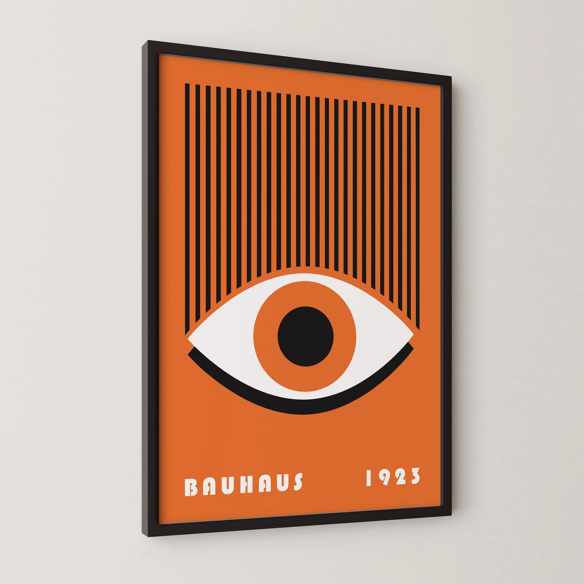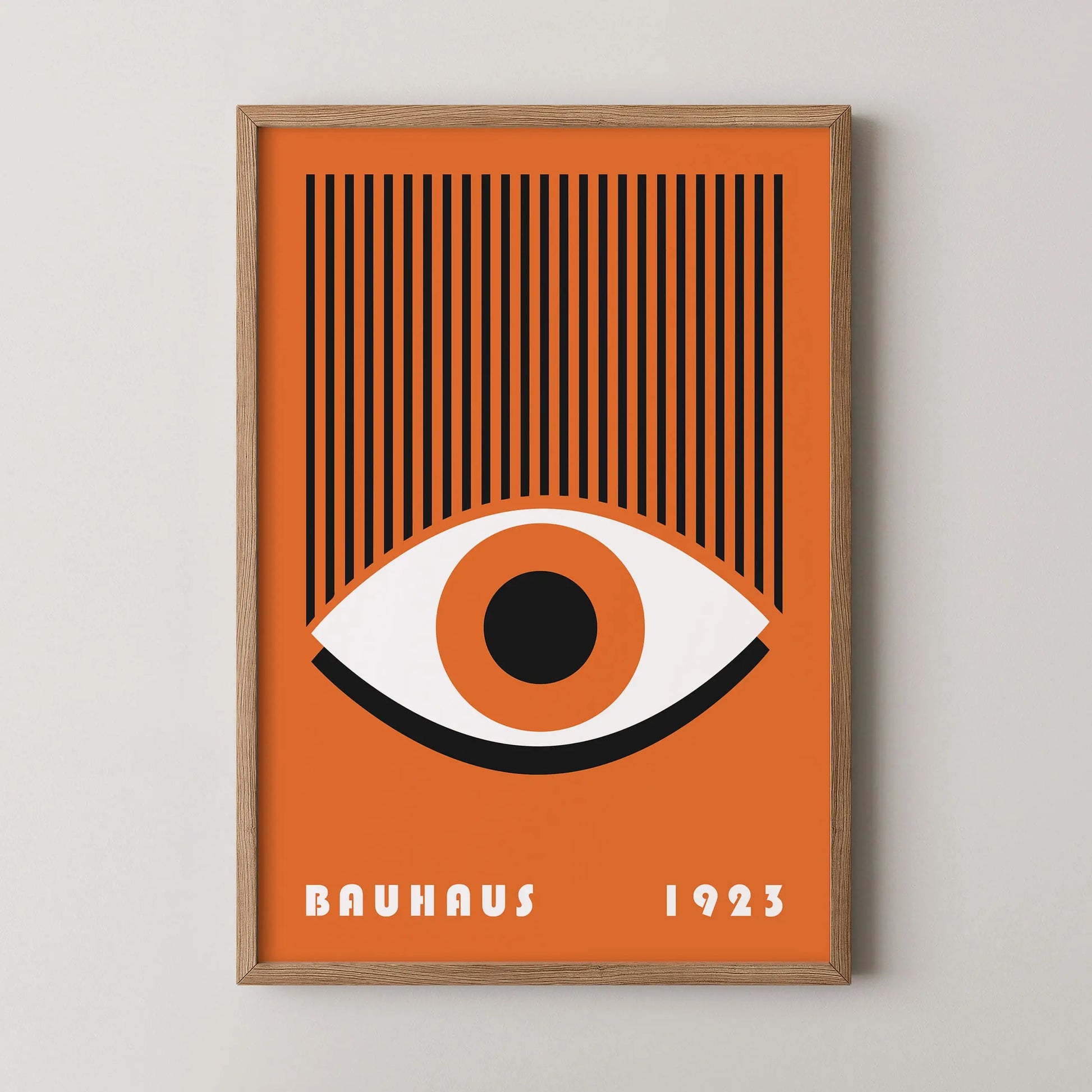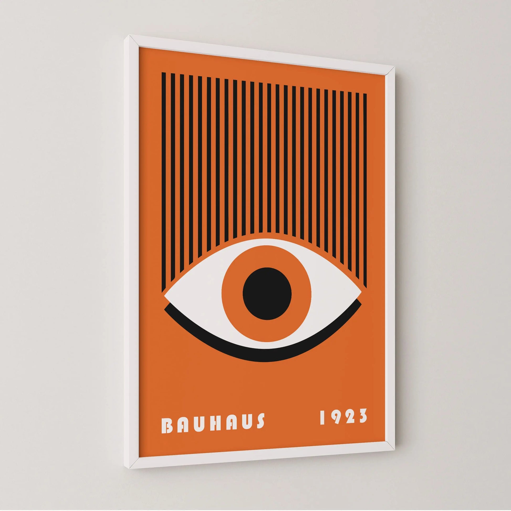 This vintage geometric Bauhaus poster is composed of parallel vertical straight lines on the upper part and the Bauhaus eye in the center on an orange colored background.