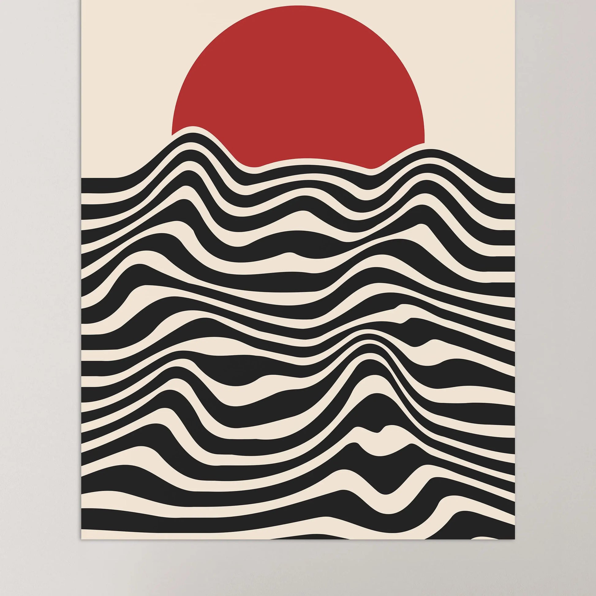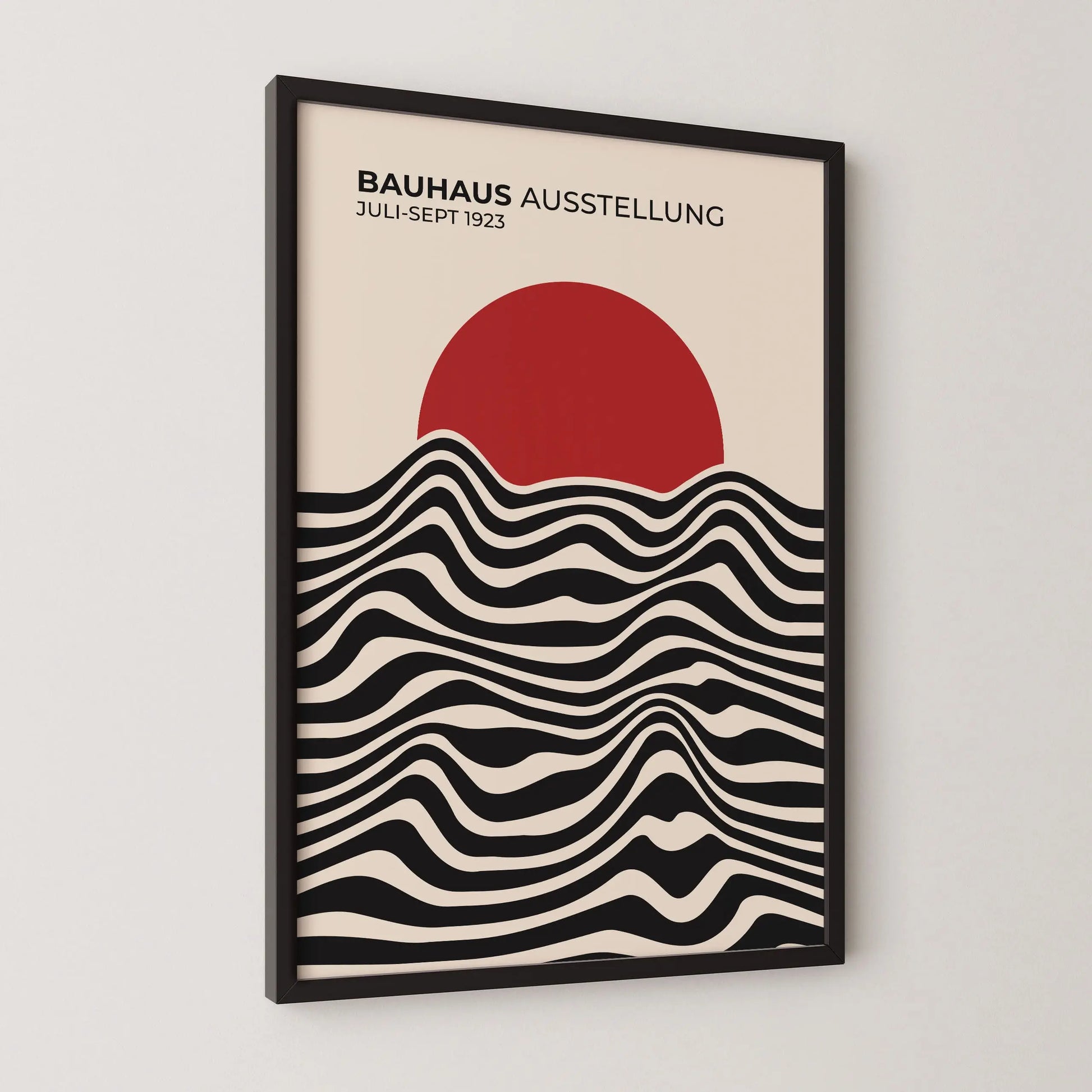 This vintage Bauhaus poster is composed of parallel wavy lines, alternating between dark and light solid areas, arranged horizontally across the lower portion. These lines form fluid, continuous curves, creating a steady visual rhythm. The upper section is occupied by a solid disk, partially overlapping the lines and establishing a clear contrast between organic forms and simple geometry.