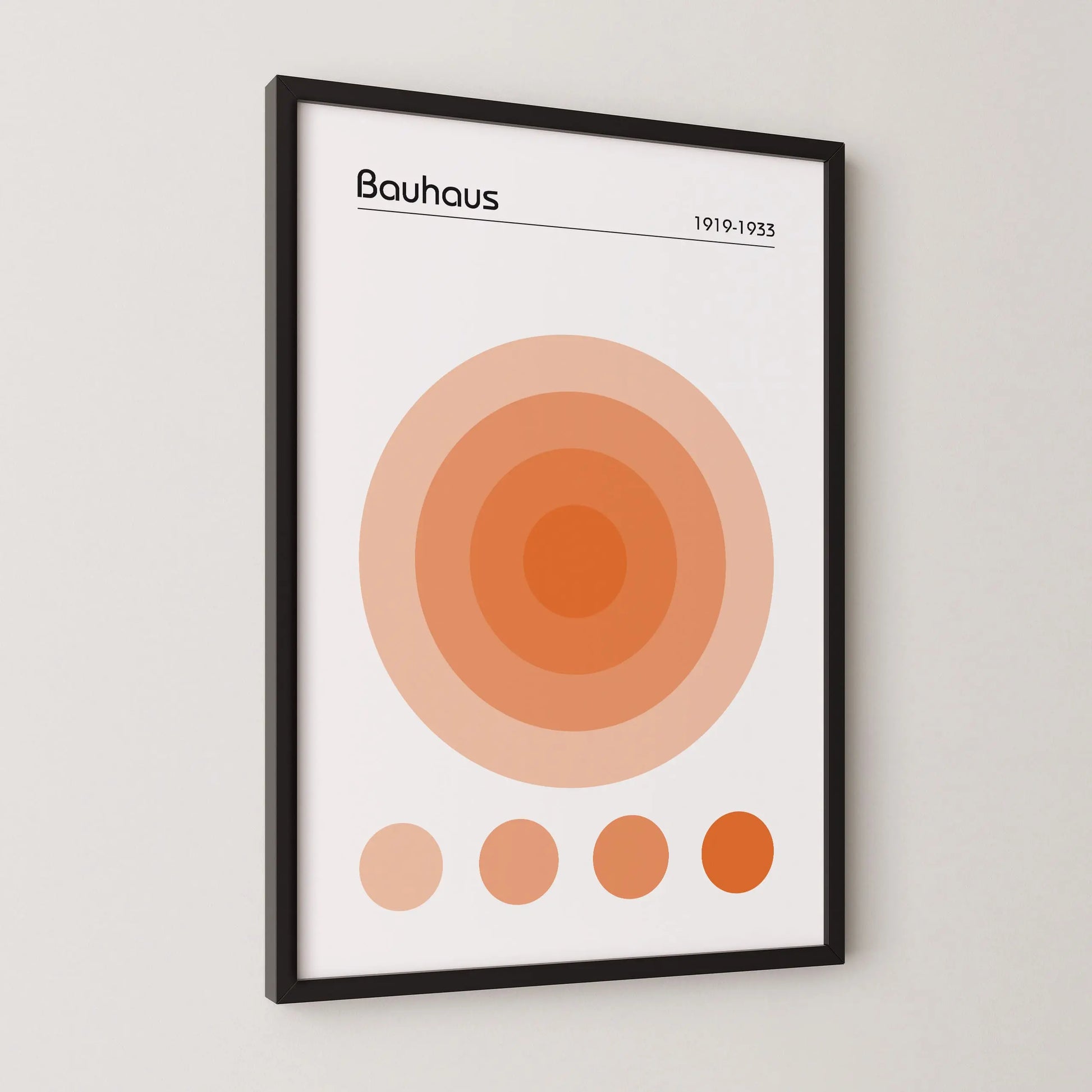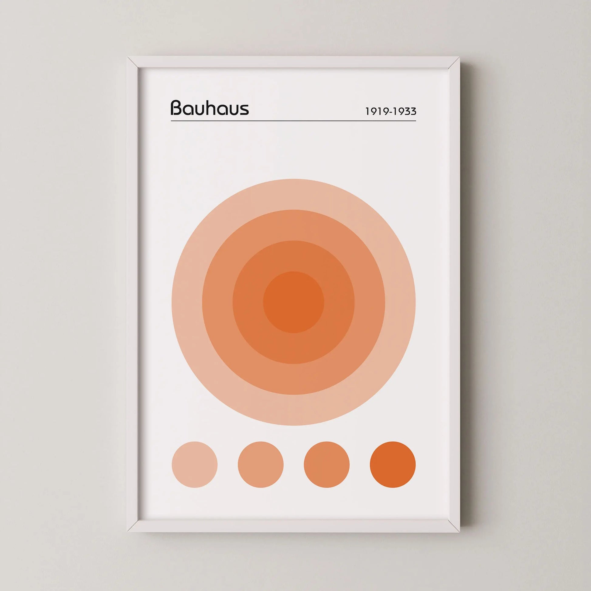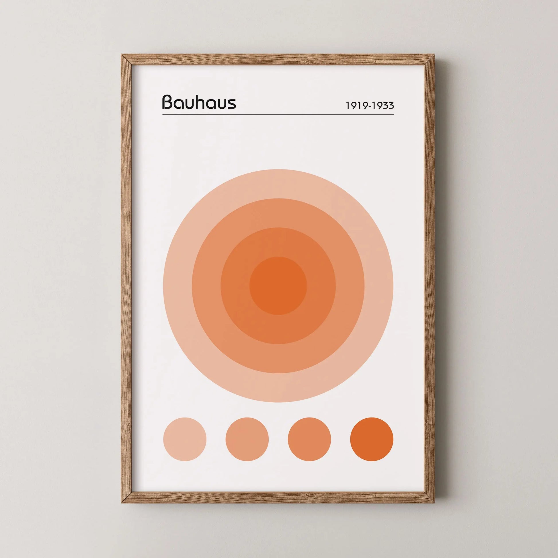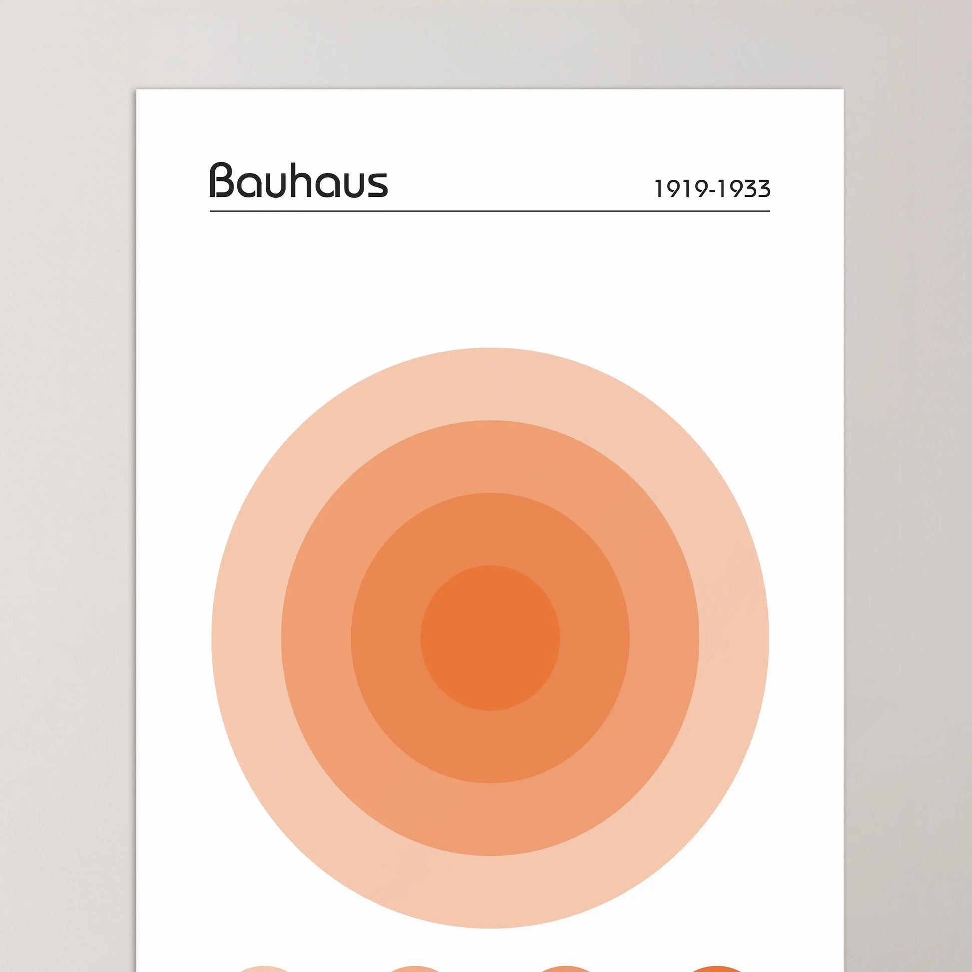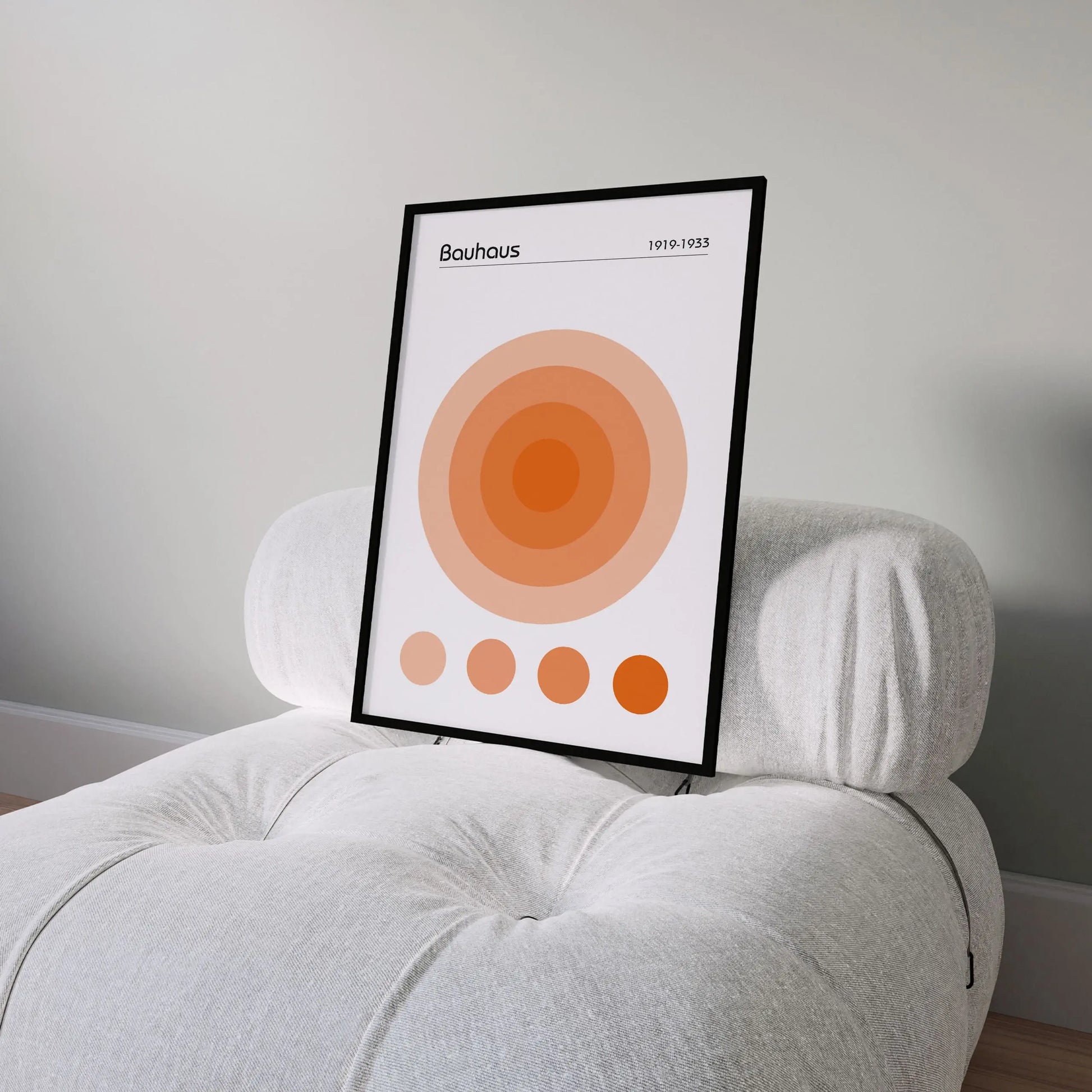 This geometric Bauhaus poster in orange features a nuanced geometric composition made up of a set of concentric circles at the center. Below the main motif are four small aligned circles that repeat the same shades.