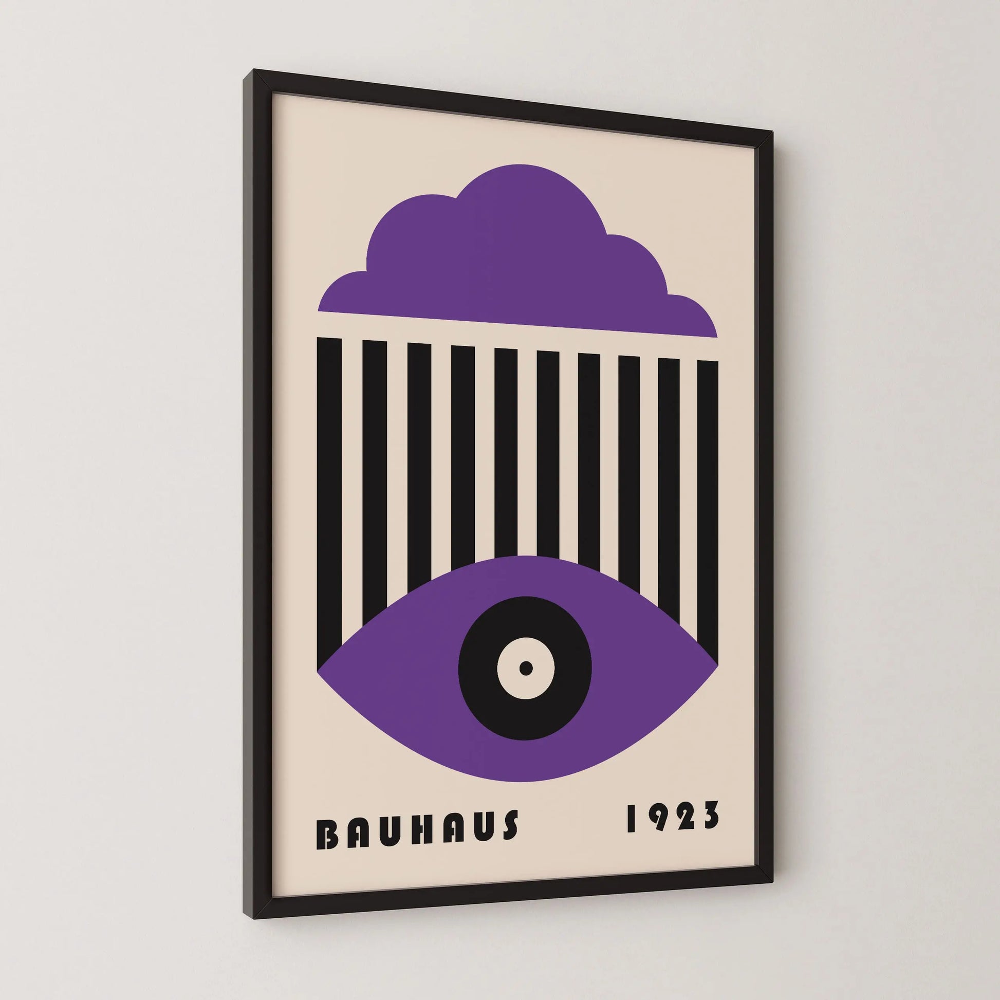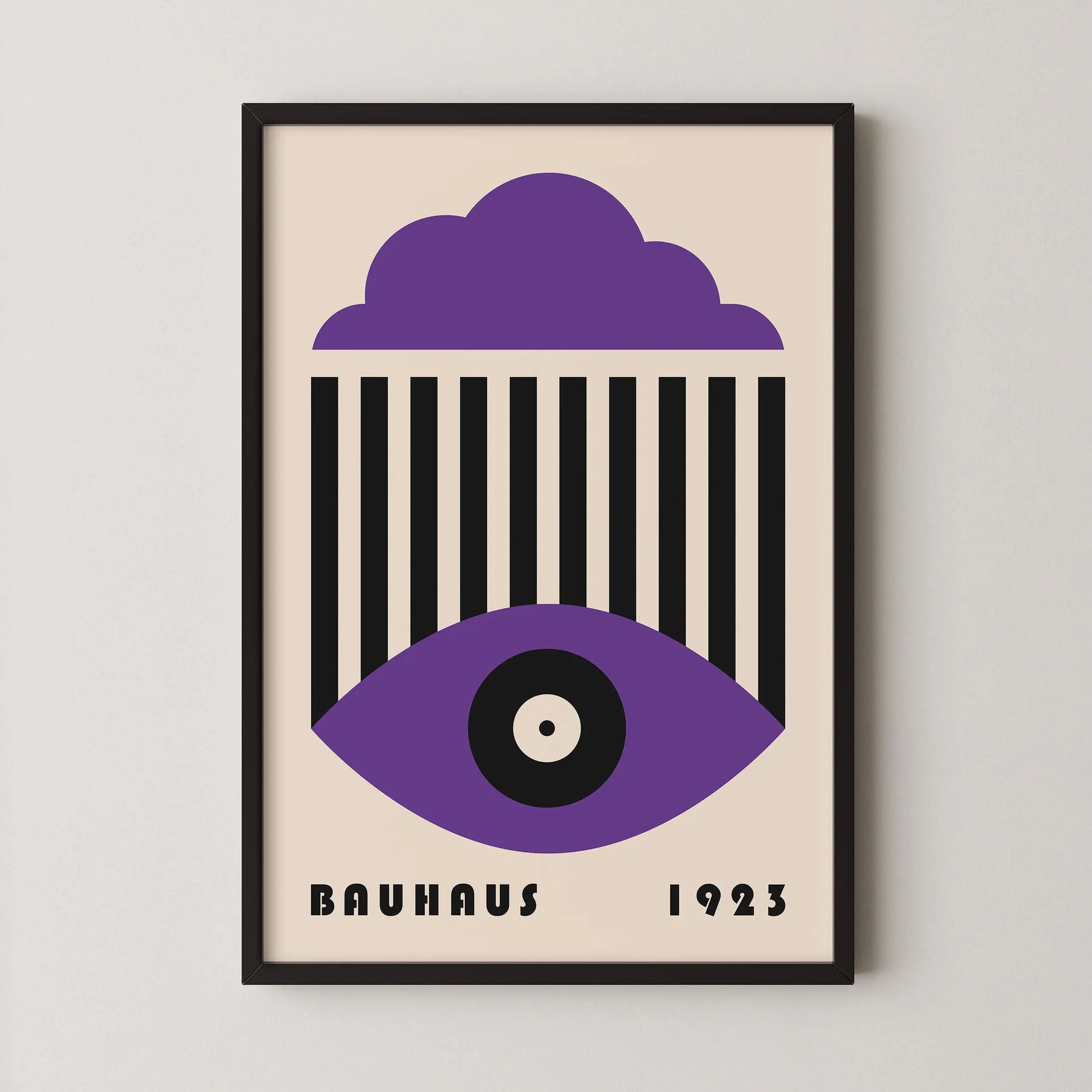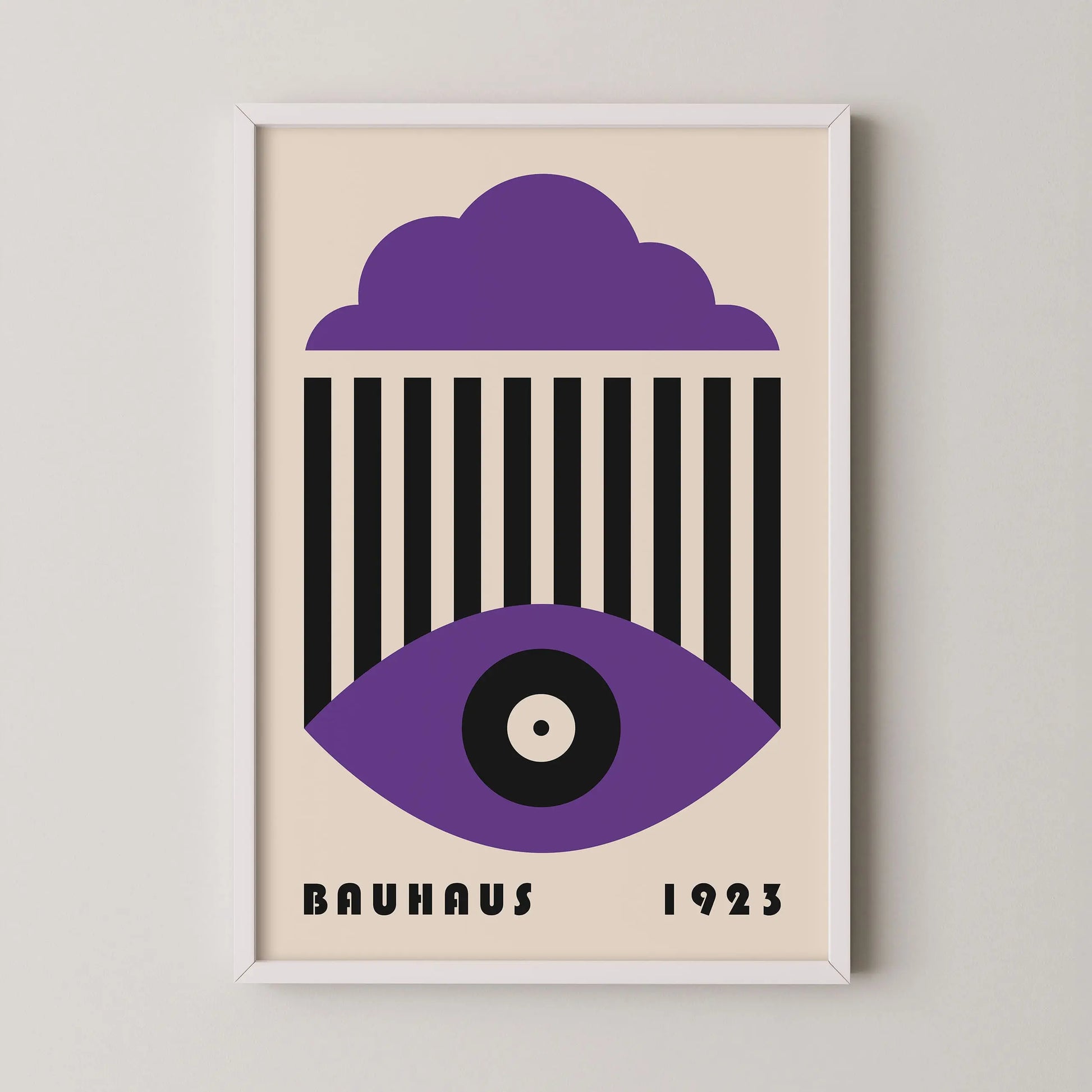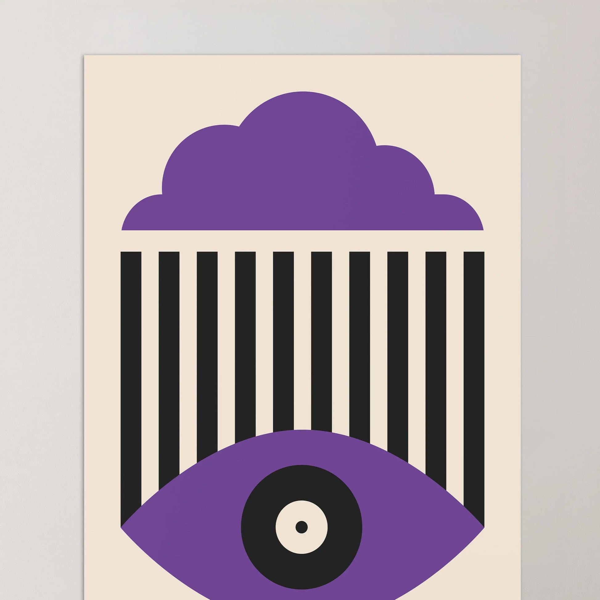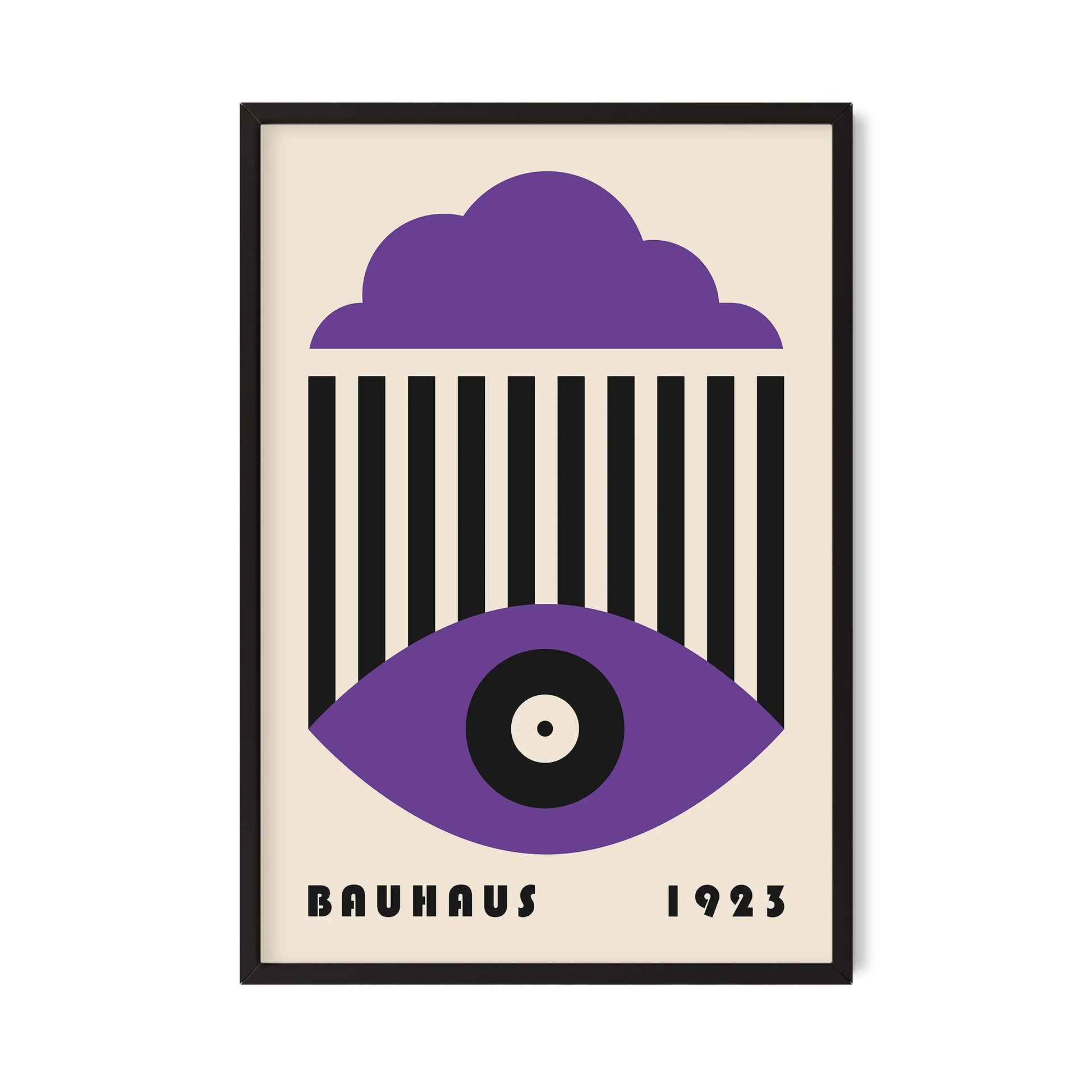 This vintage Bauhaus graphic poster is composed of a stylized cloud in the upper section, a set of parallel vertical lines at the center, and a geometric eye shape in the lower part, centered around a circle. The composition unfolds a refined formal language, where the repetition of lines interacts with the softness of curves to create a visual tension that is both graphic and contemplative.