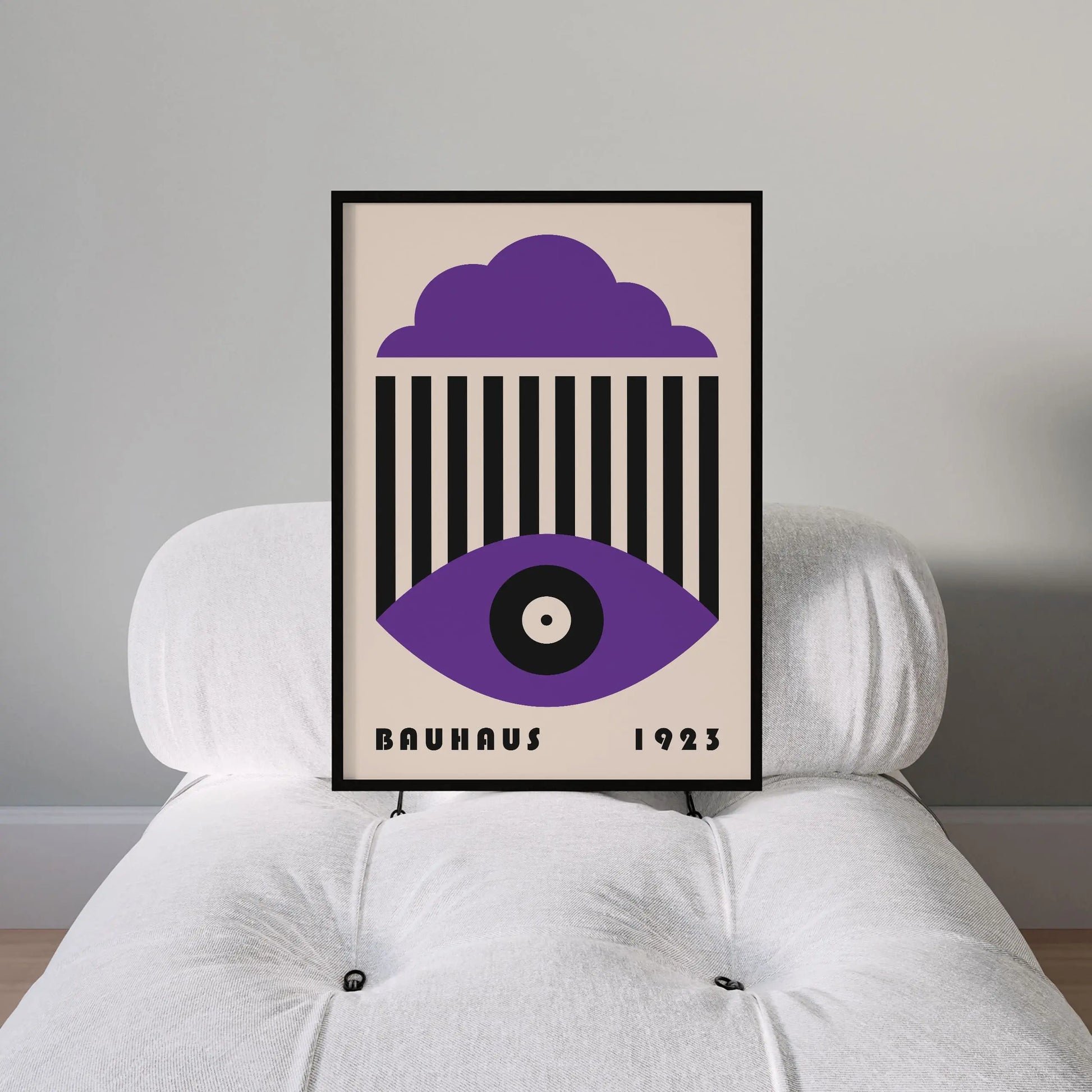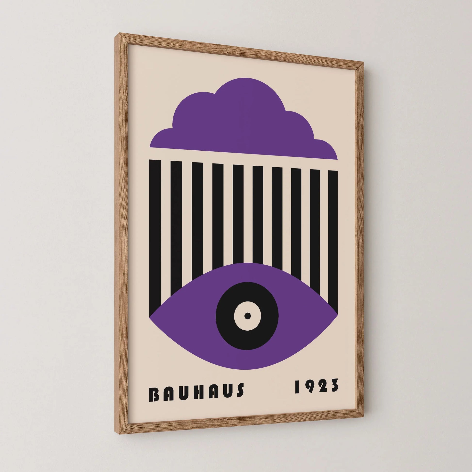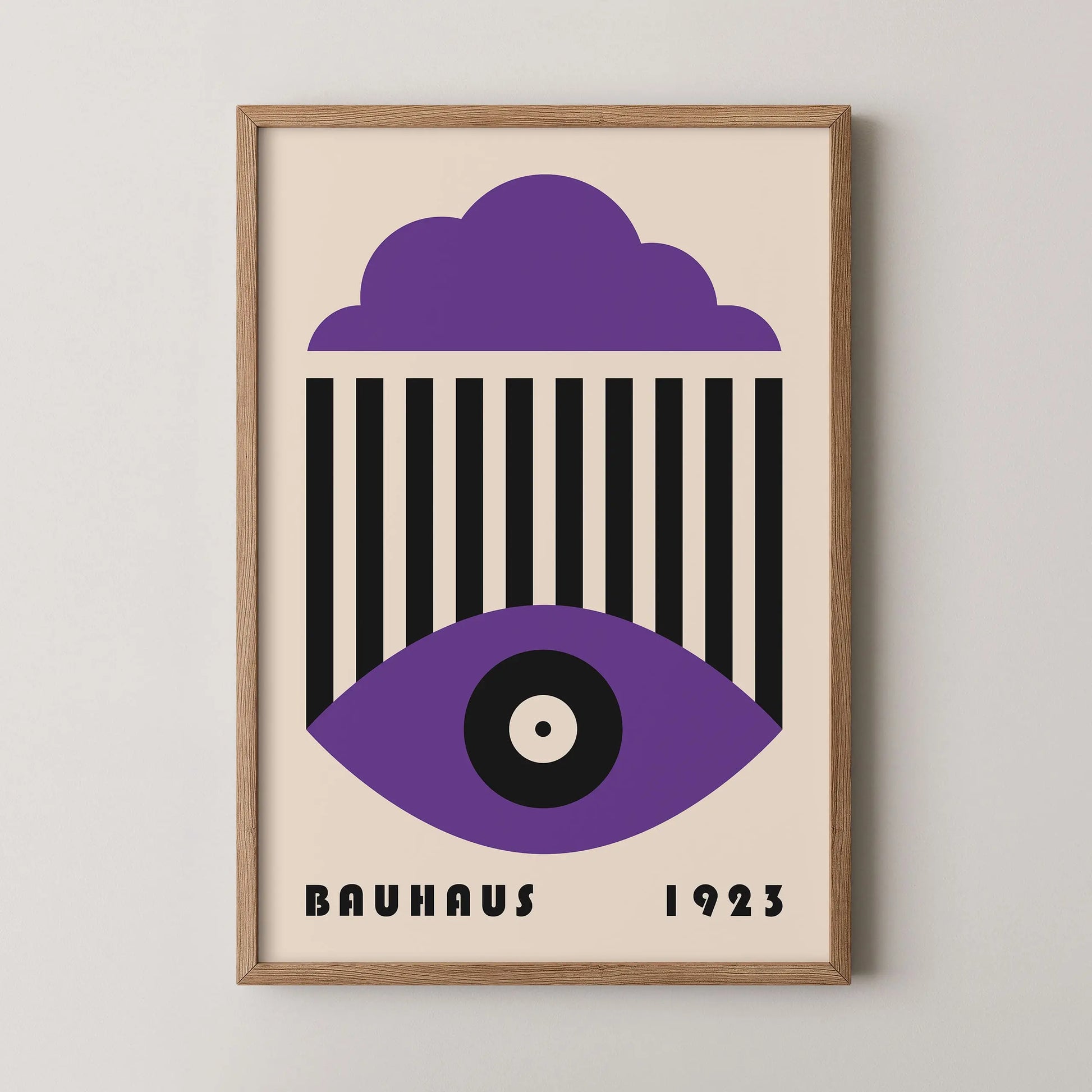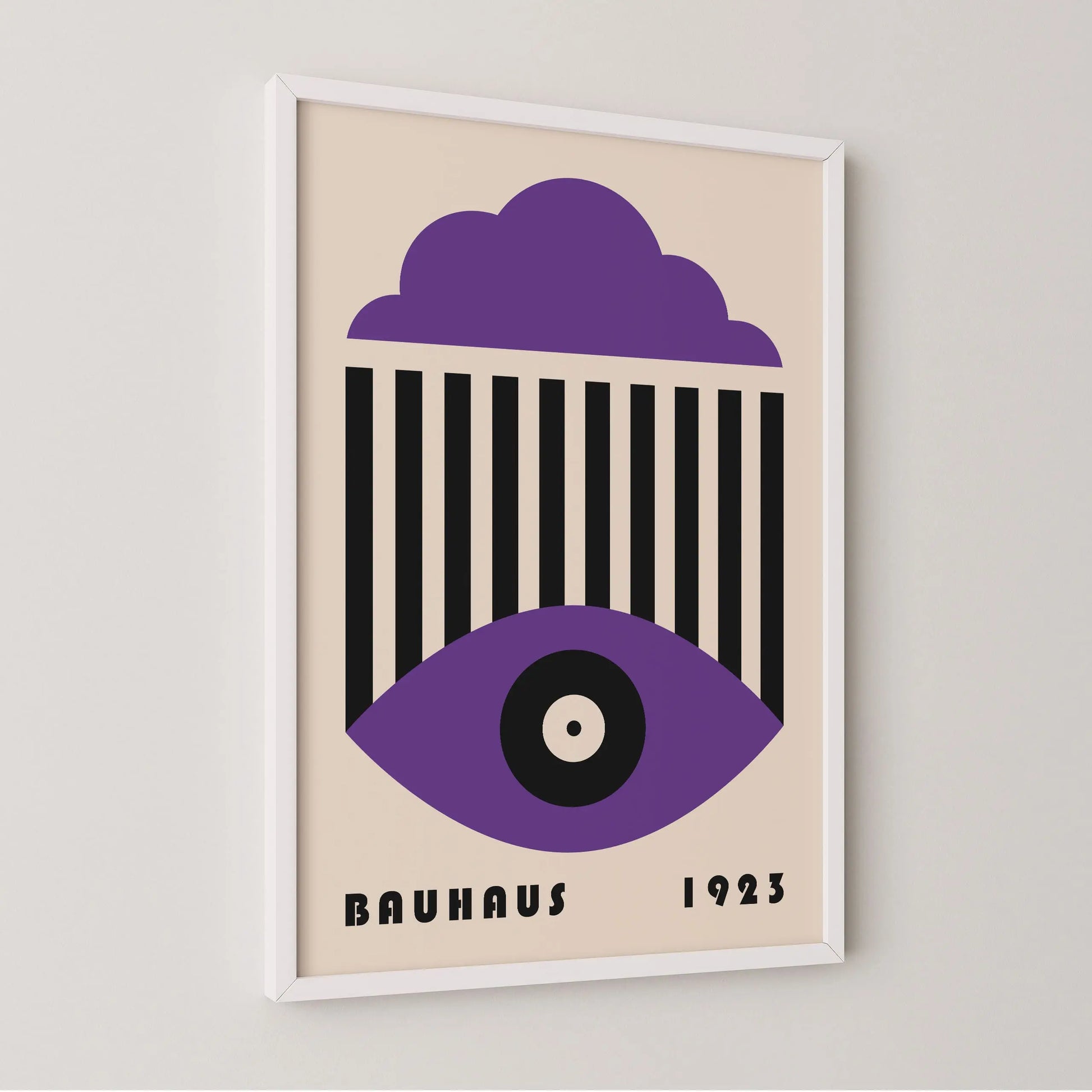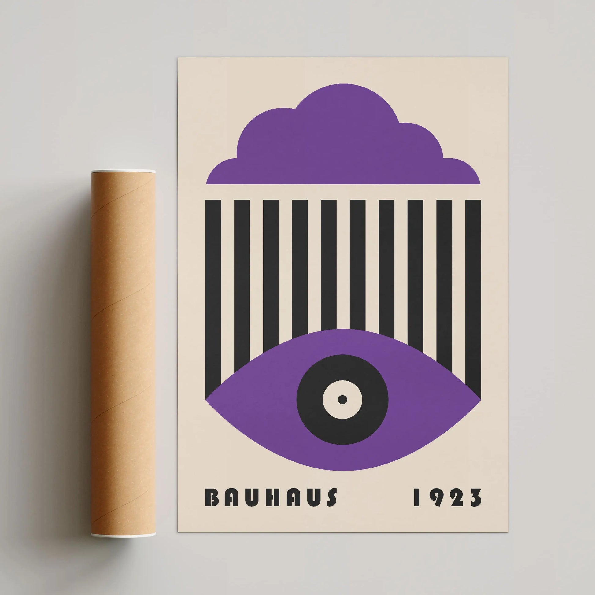 This vintage Bauhaus graphic poster is composed of a stylized cloud in the upper section, a set of parallel vertical lines at the center, and a geometric eye shape in the lower part, centered around a circle. The composition unfolds a refined formal language, where the repetition of lines interacts with the softness of curves to create a visual tension that is both graphic and contemplative.