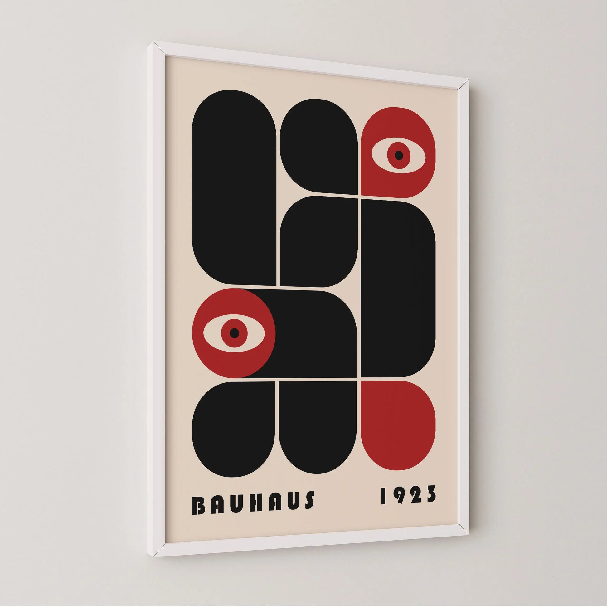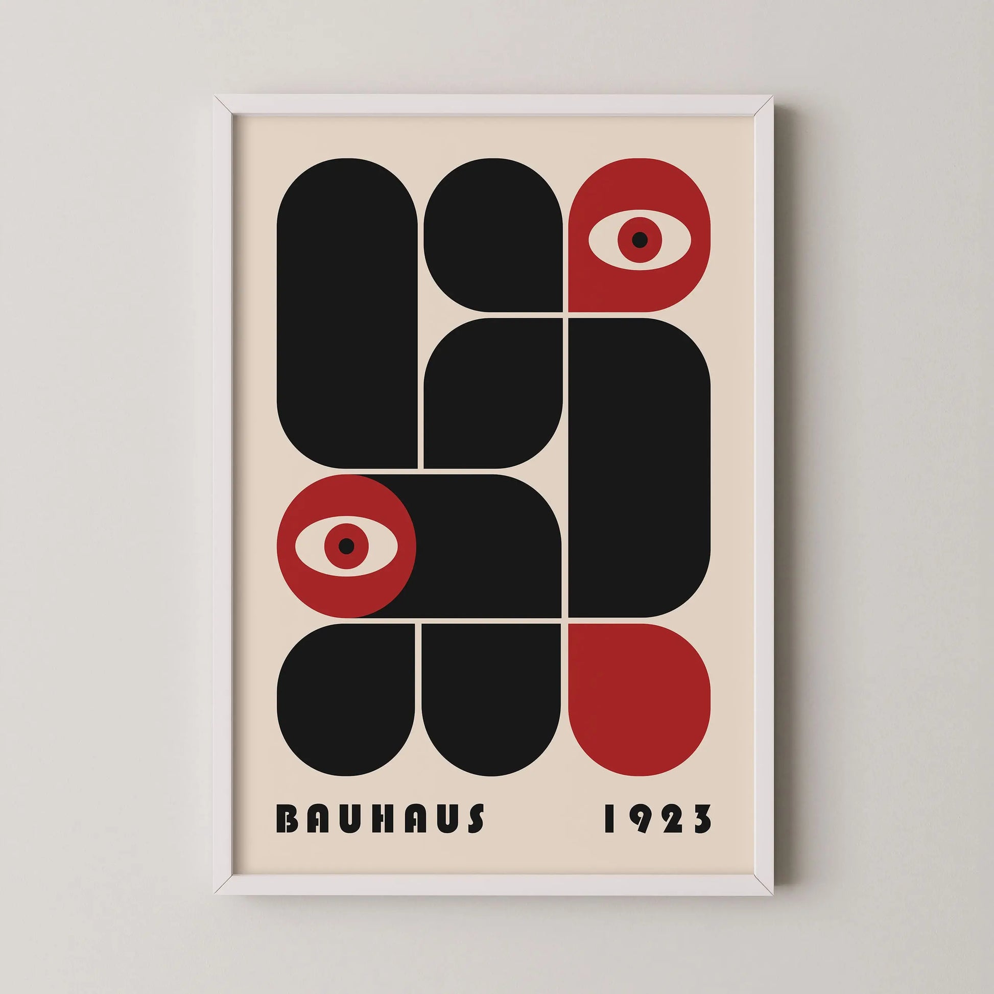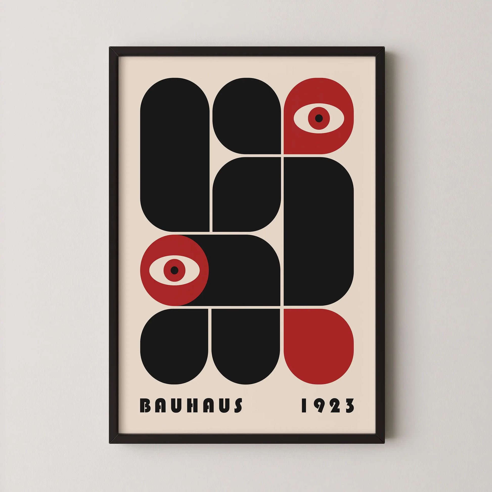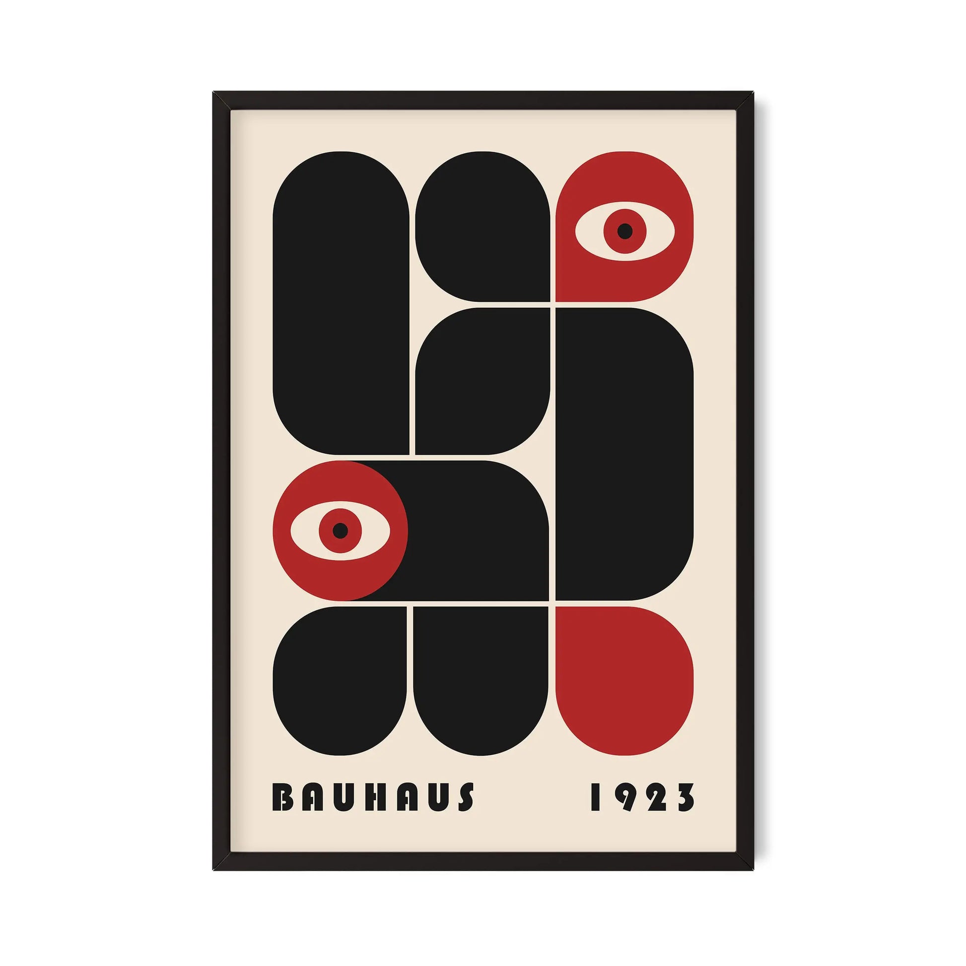This vintage Bauhaus graphic poster is composed of modular forms with either rounded or strict angles, juxtaposed according to a defined grid, sometimes in complementarity and sometimes in opposition. The appearance of stylized eyes introduces a human and conceptual dimension, suggesting a critical gaze integrated into the rational system of modernity.