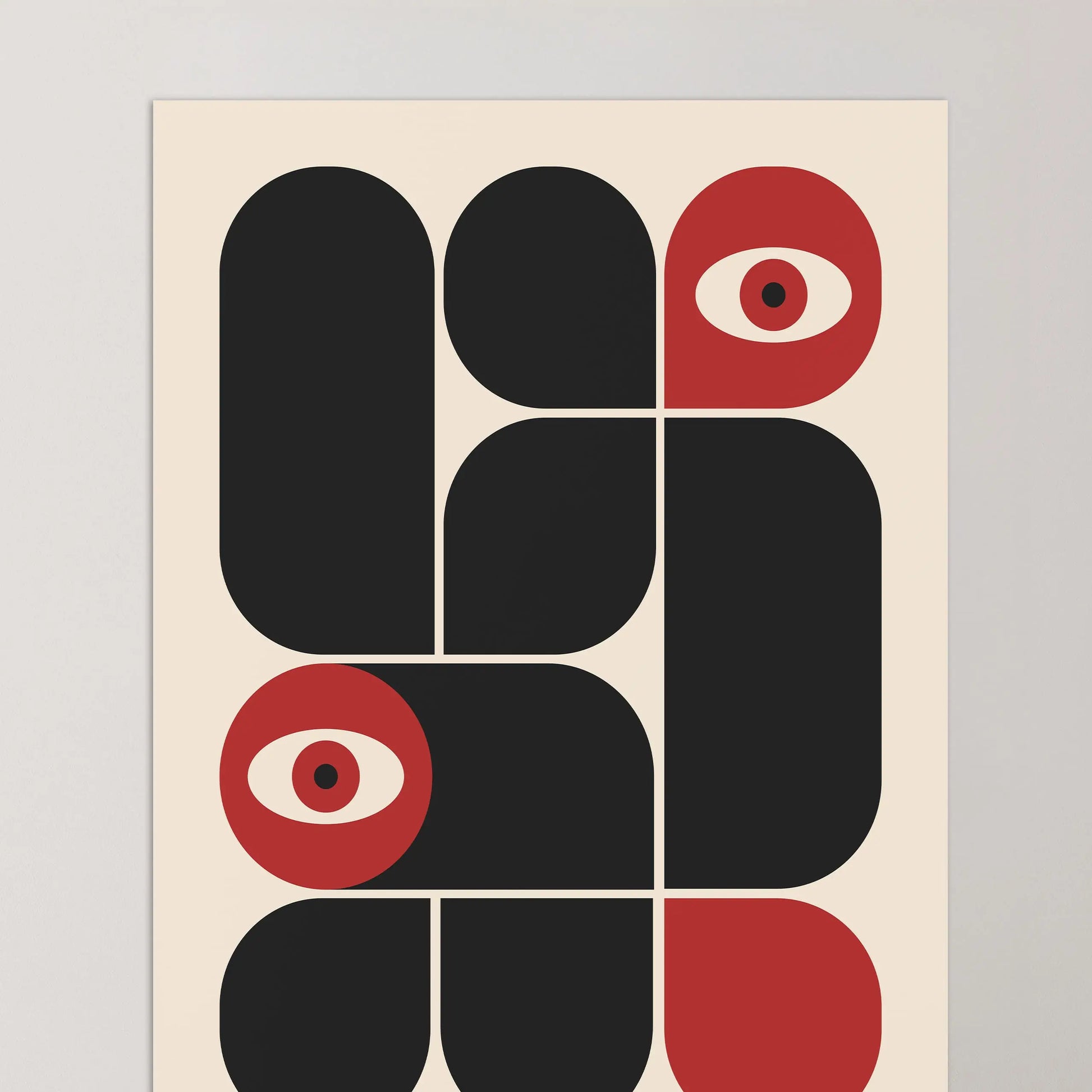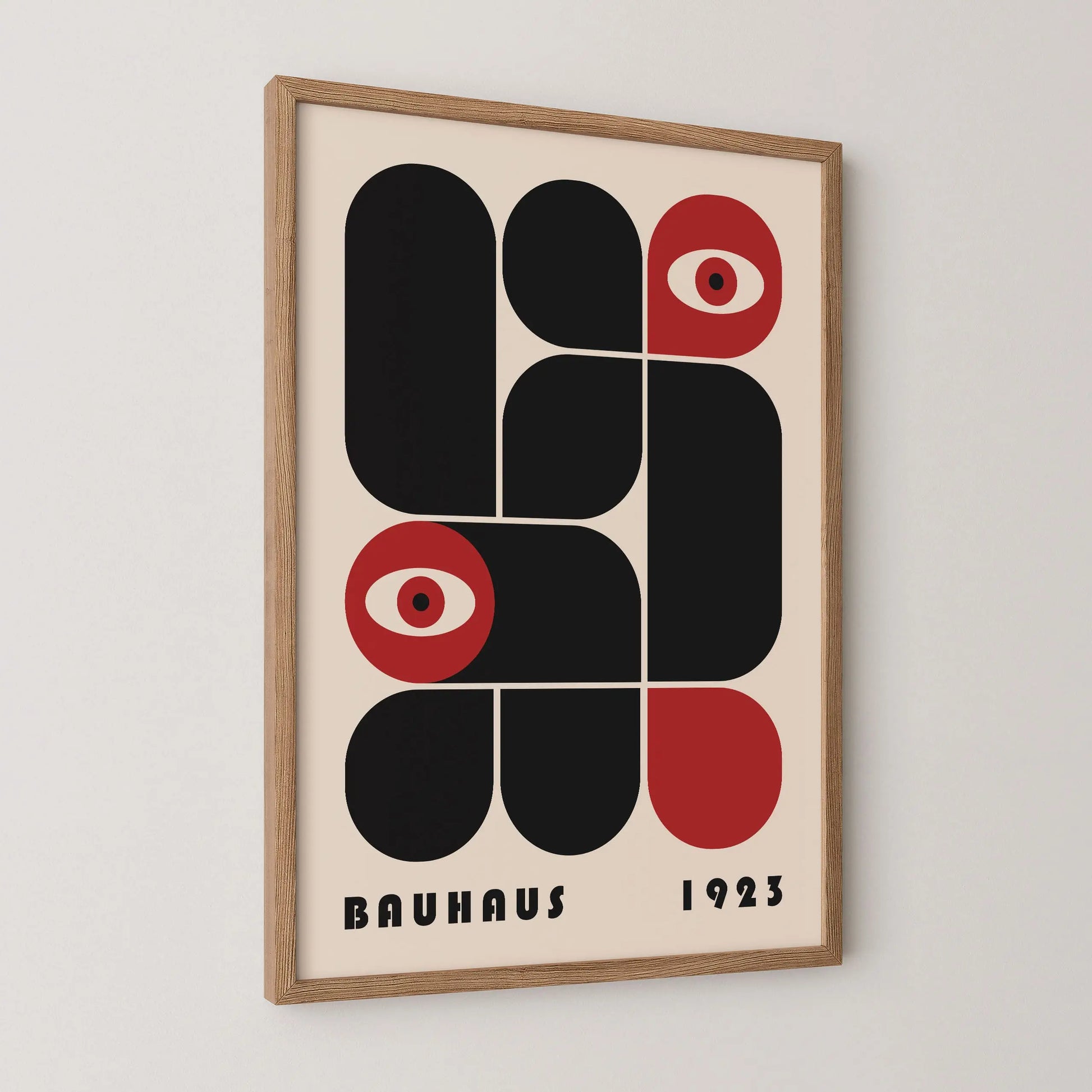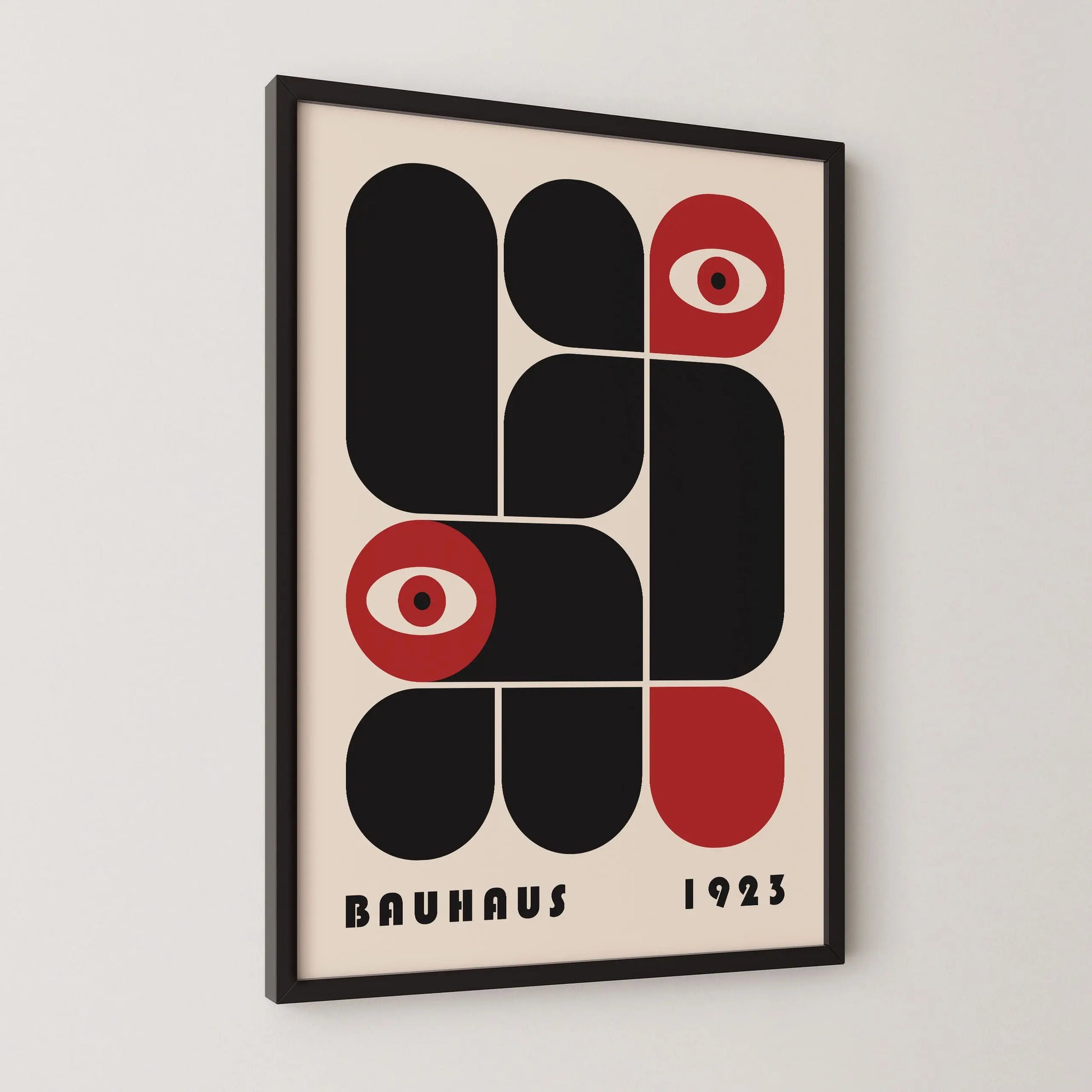 This vintage Bauhaus graphic poster is composed of modular forms with either rounded or strict angles, juxtaposed according to a defined grid, sometimes in complementarity and sometimes in opposition. The appearance of stylized eyes introduces a human and conceptual dimension, suggesting a critical gaze integrated into the rational system of modernity.