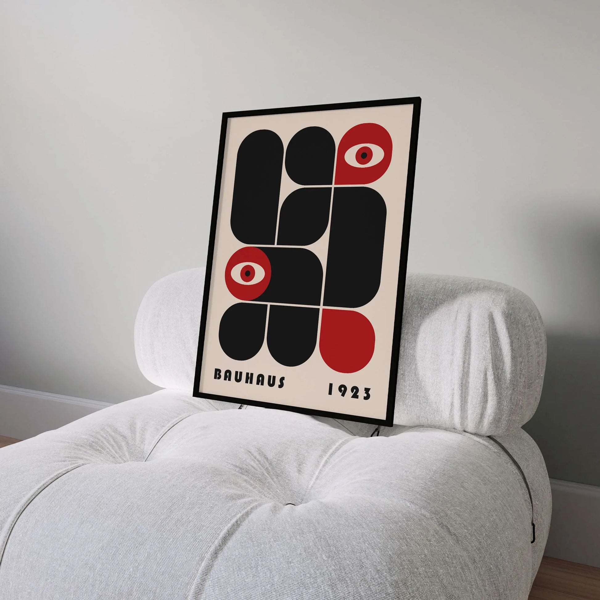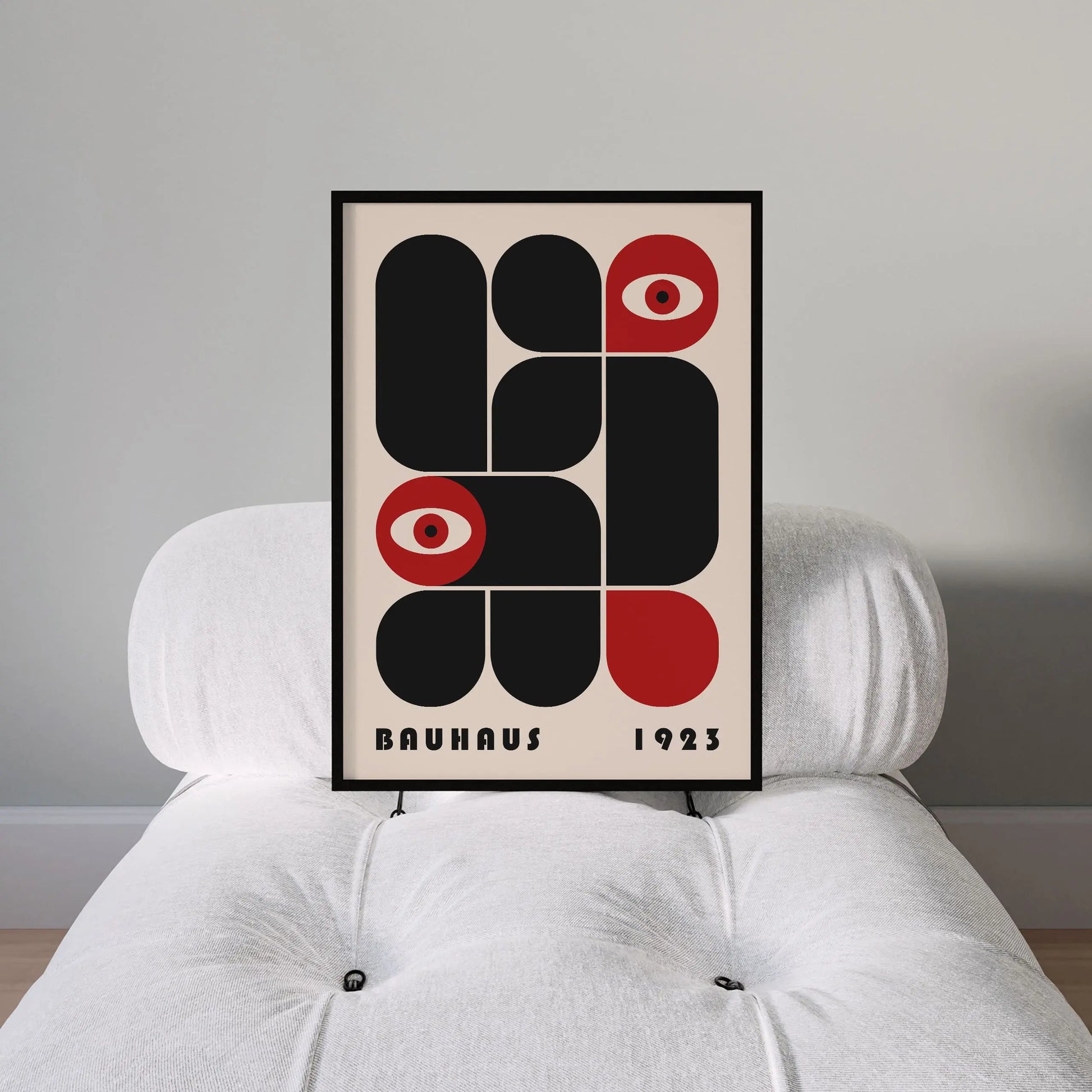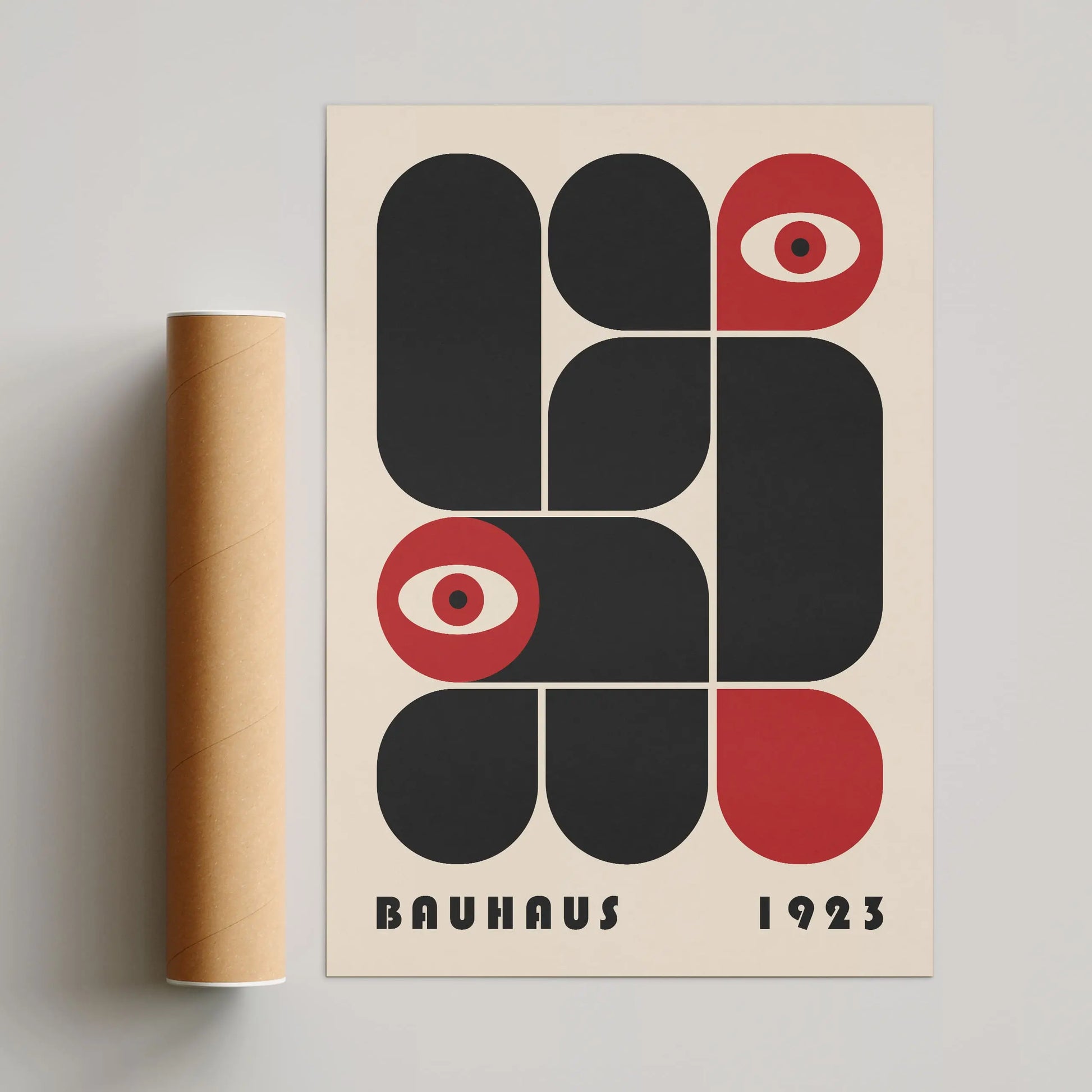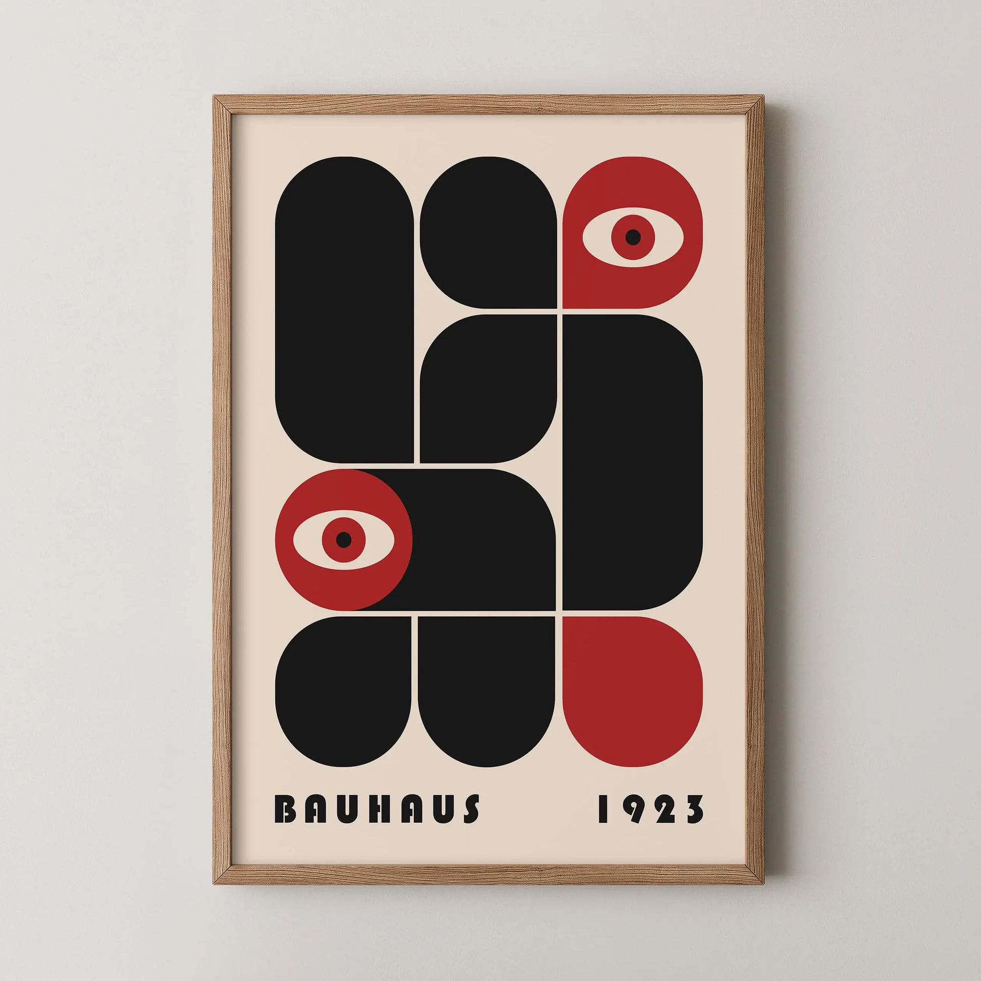 This vintage Bauhaus graphic poster is composed of modular forms with either rounded or strict angles, juxtaposed according to a defined grid, sometimes in complementarity and sometimes in opposition. The appearance of stylized eyes introduces a human and conceptual dimension, suggesting a critical gaze integrated into the rational system of modernity.