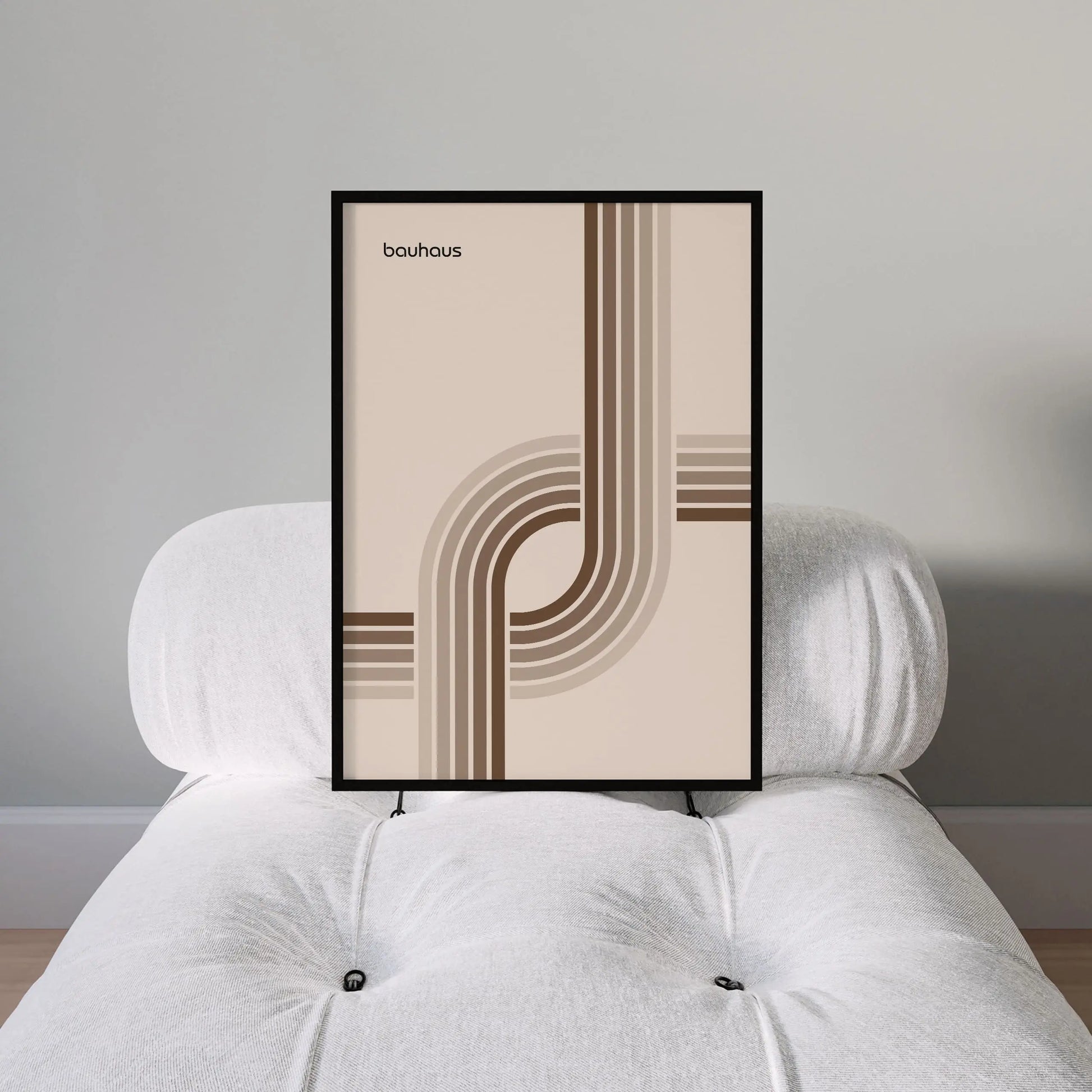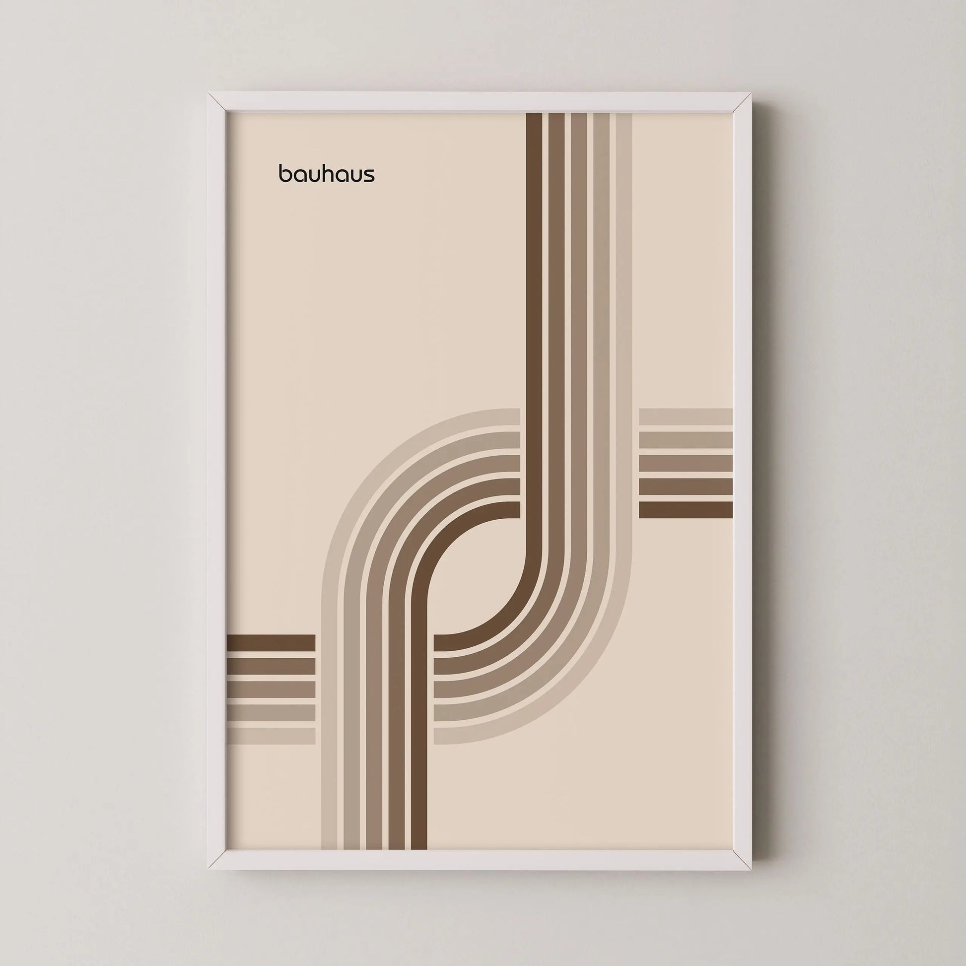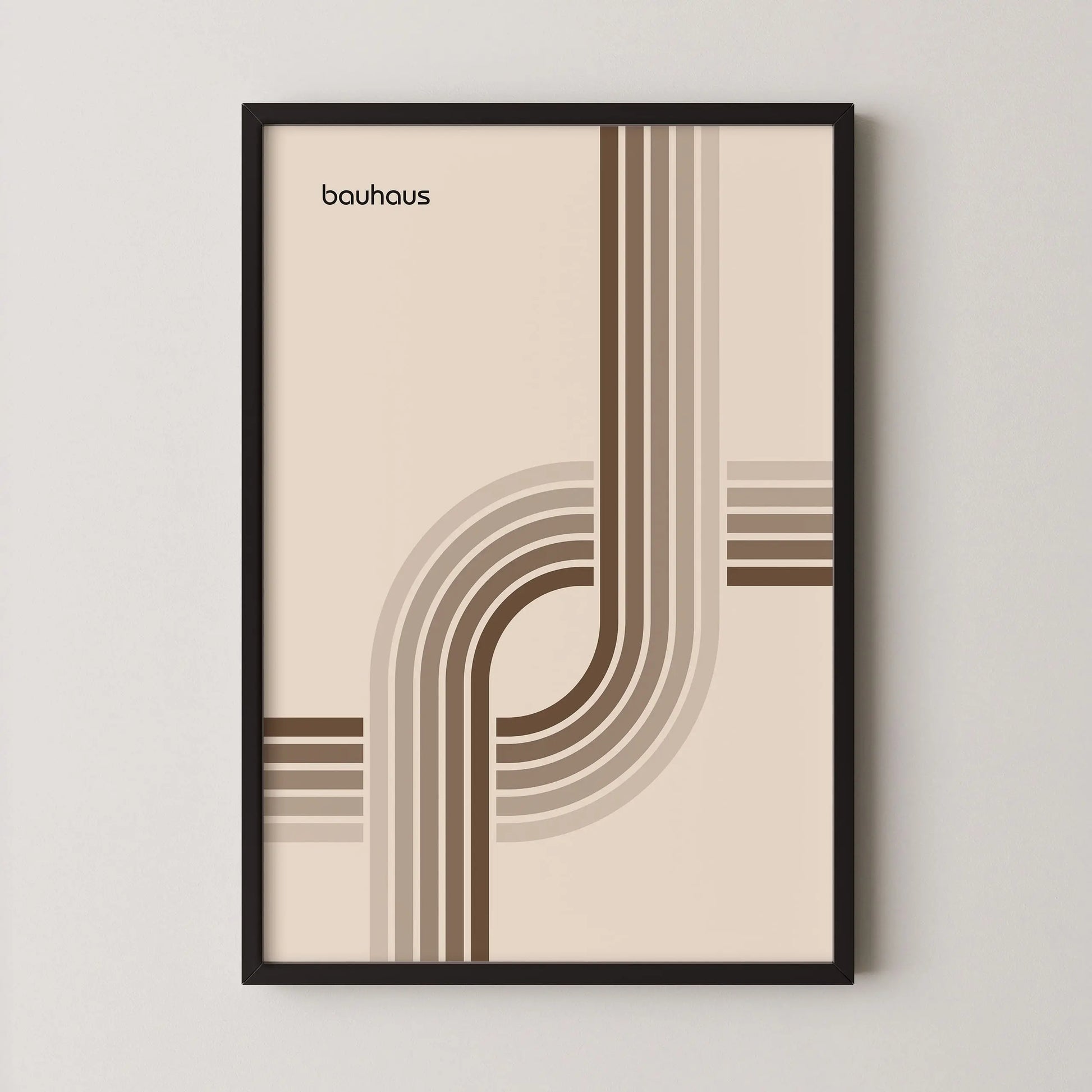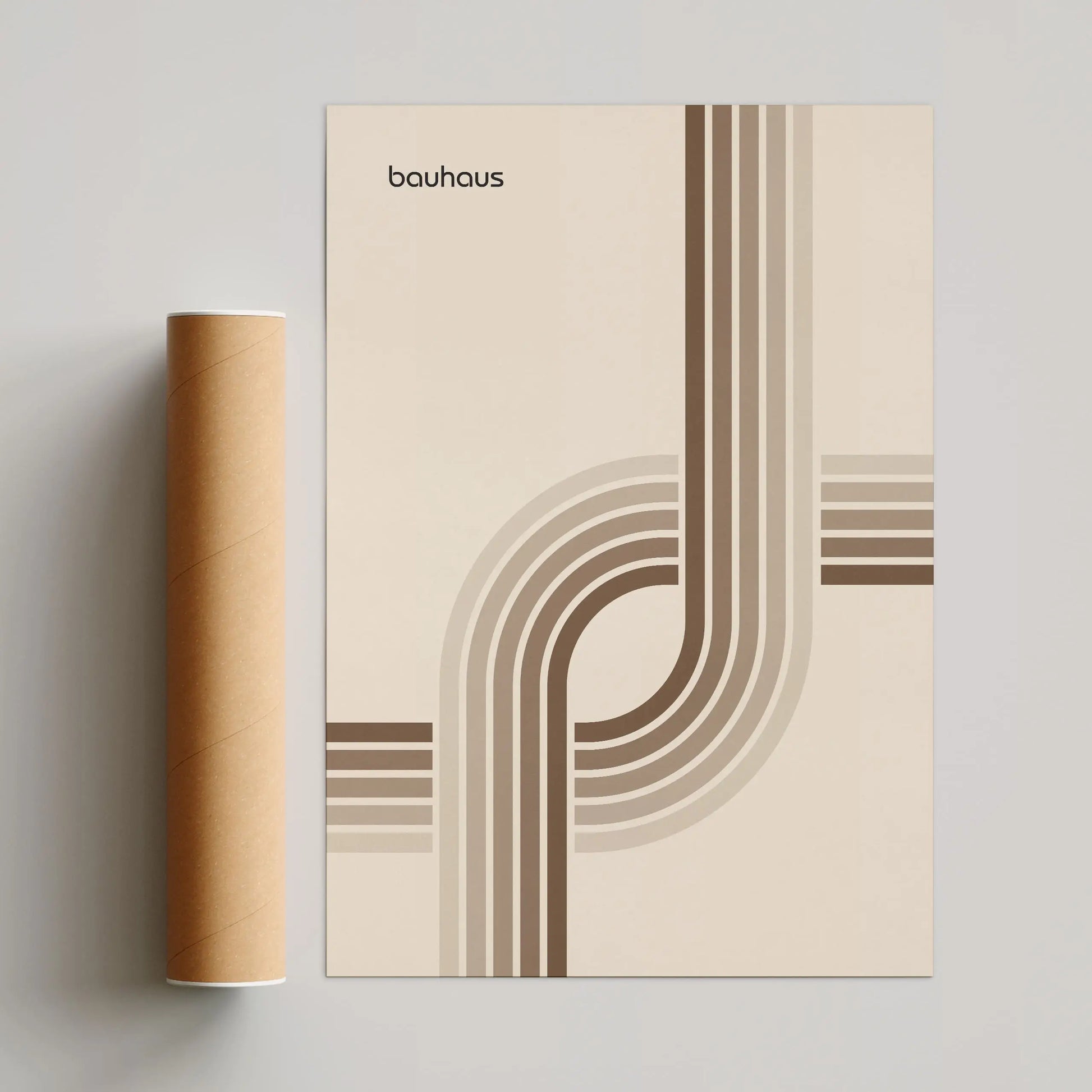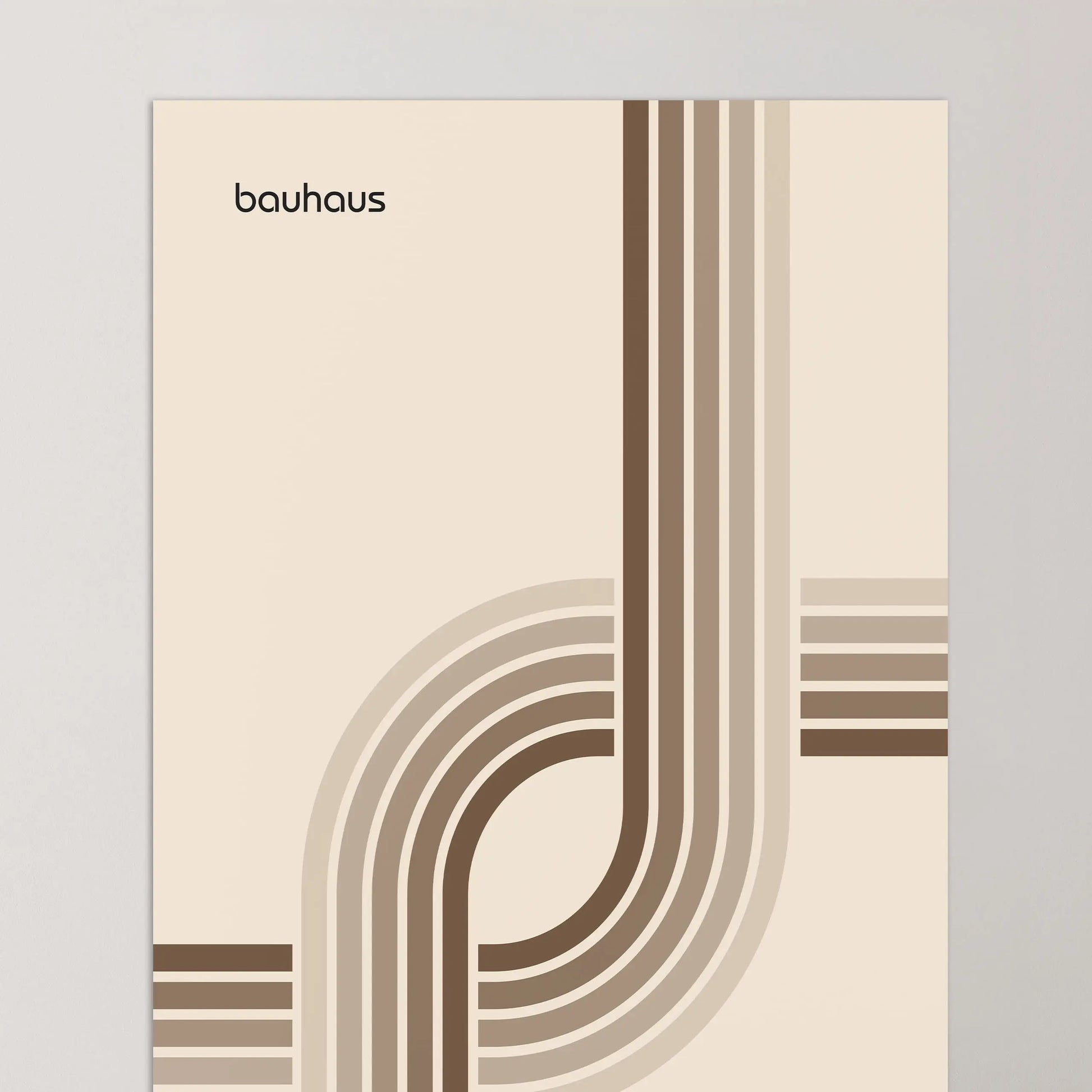 This vintage graphic Bauhaus poster is composed of regular, evenly spaced vertical parallel lines of consistent width, which extend and curve to form a partial arch. Horizontal segments punctuate the composition, creating crisp intersections between vertical and horizontal axes.