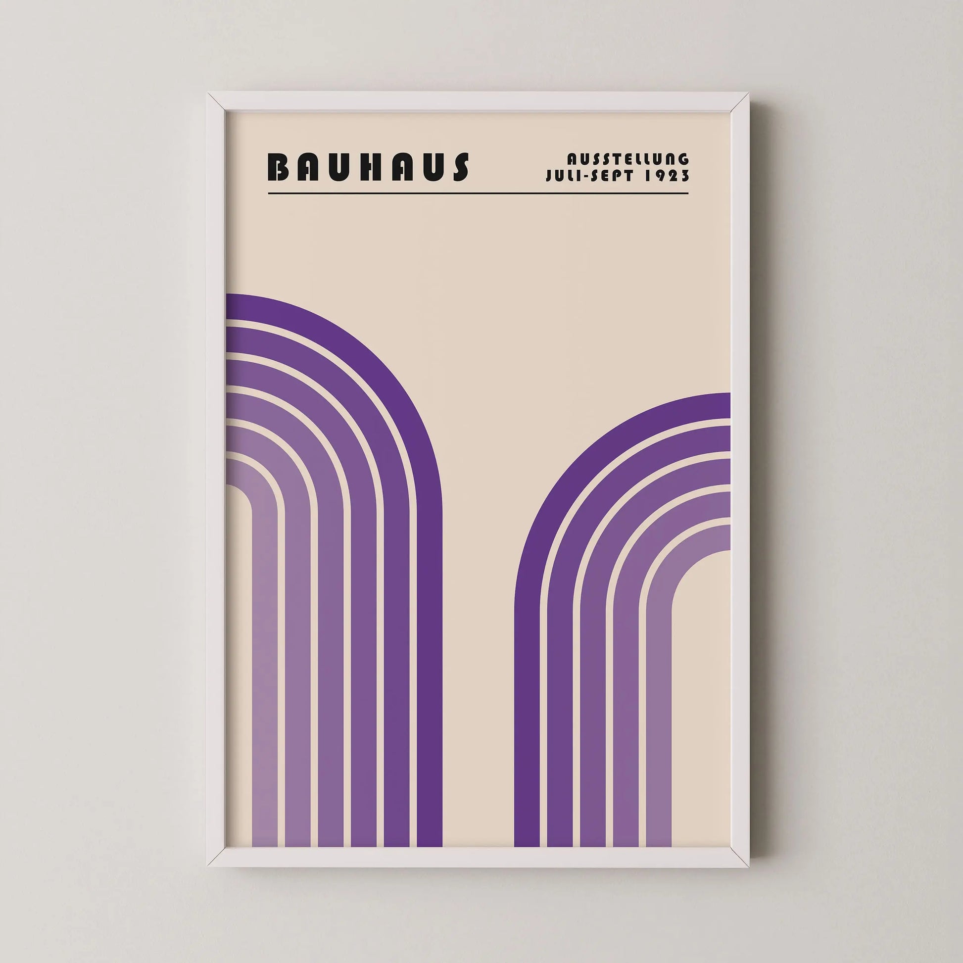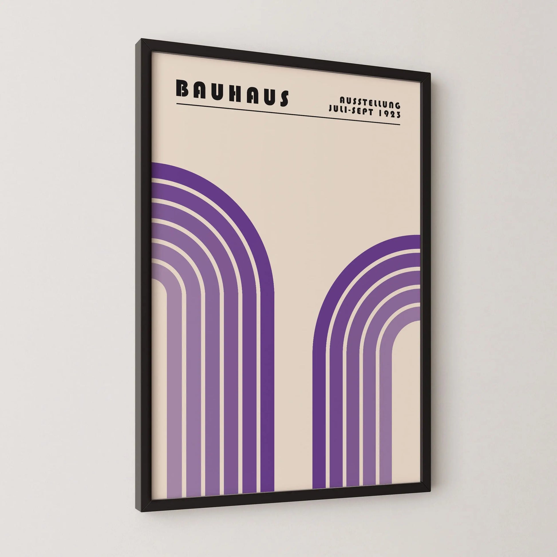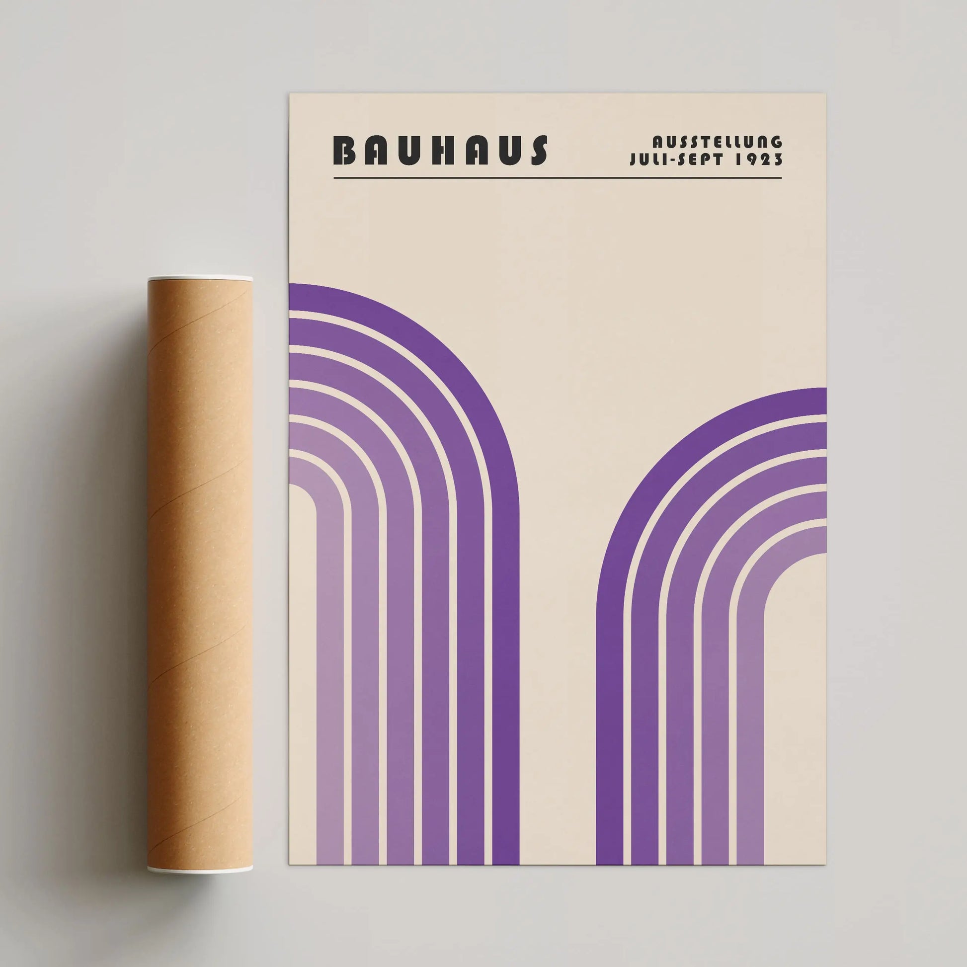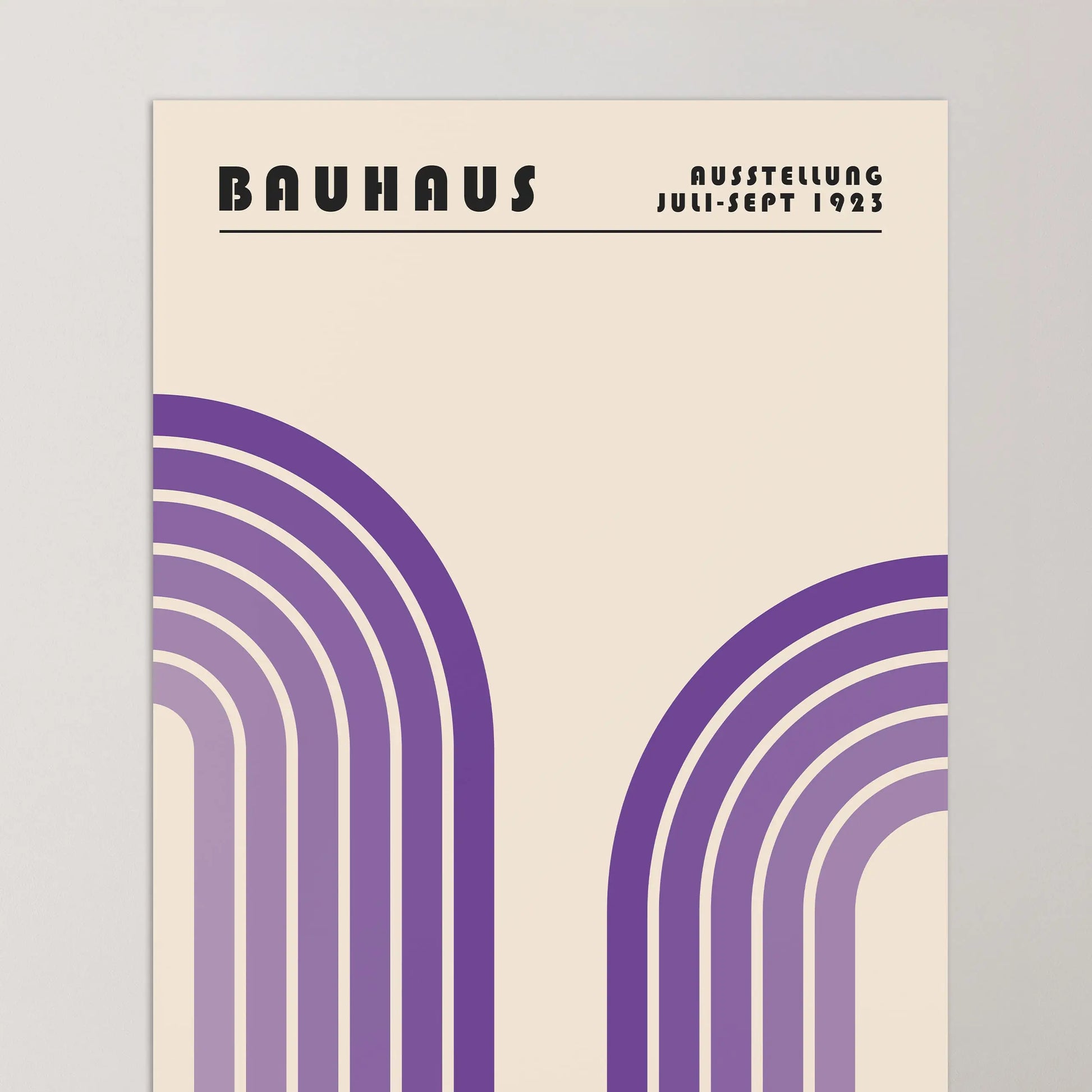 This vintage Bauhaus graphic poster depicts two monumental arched forms, arranged symmetrically on the left and right, evoking stylized arches. Each form consists of concentric bands with gradually graded tones, from darkest to lightest, creating a pronounced visual rhythm and a sense of depth.