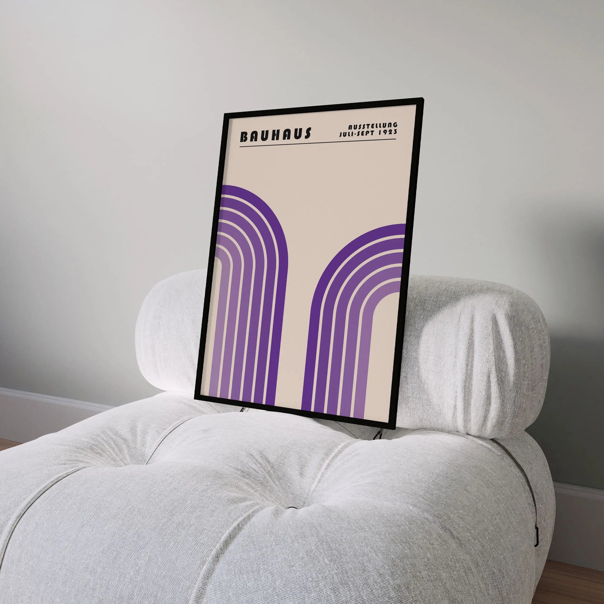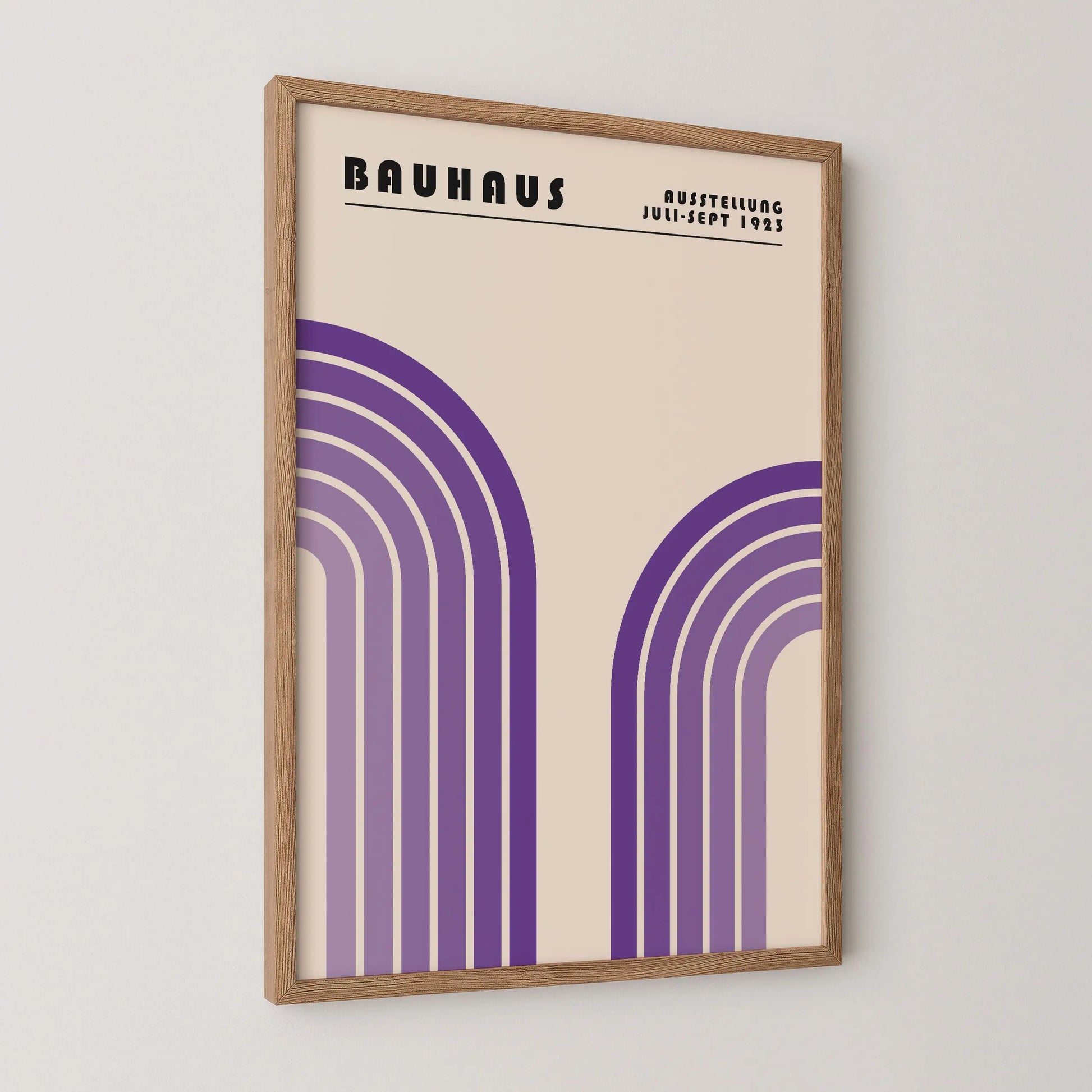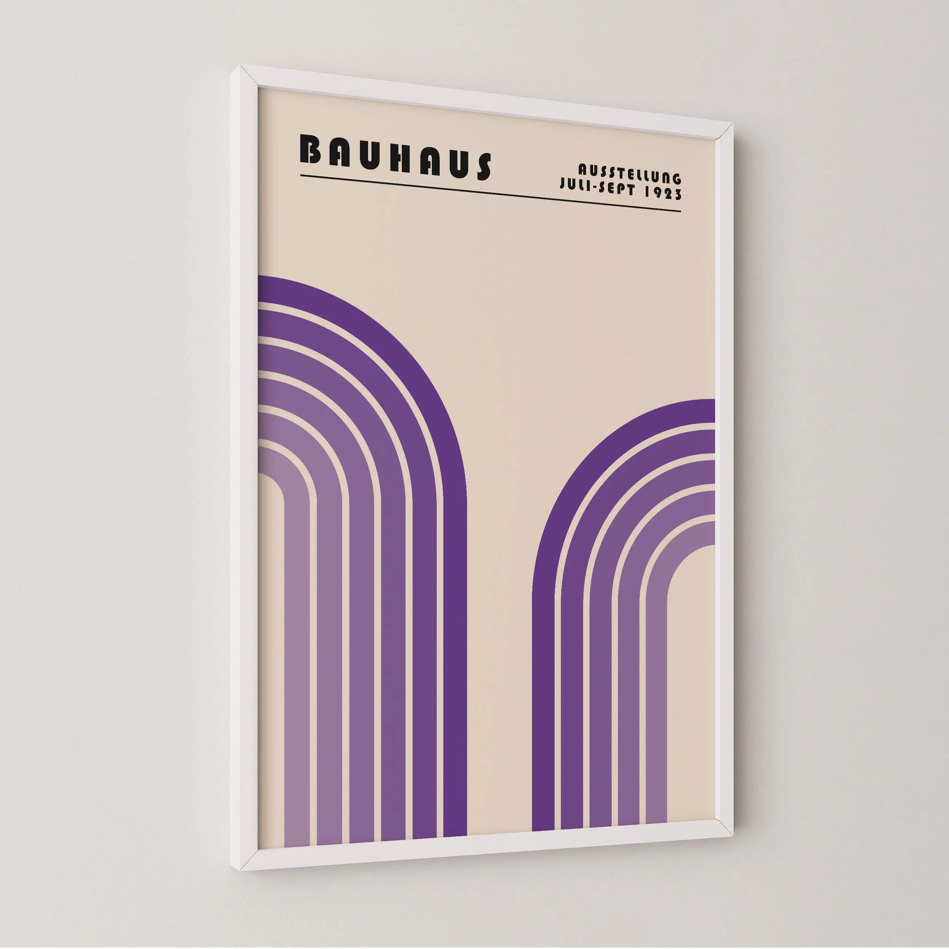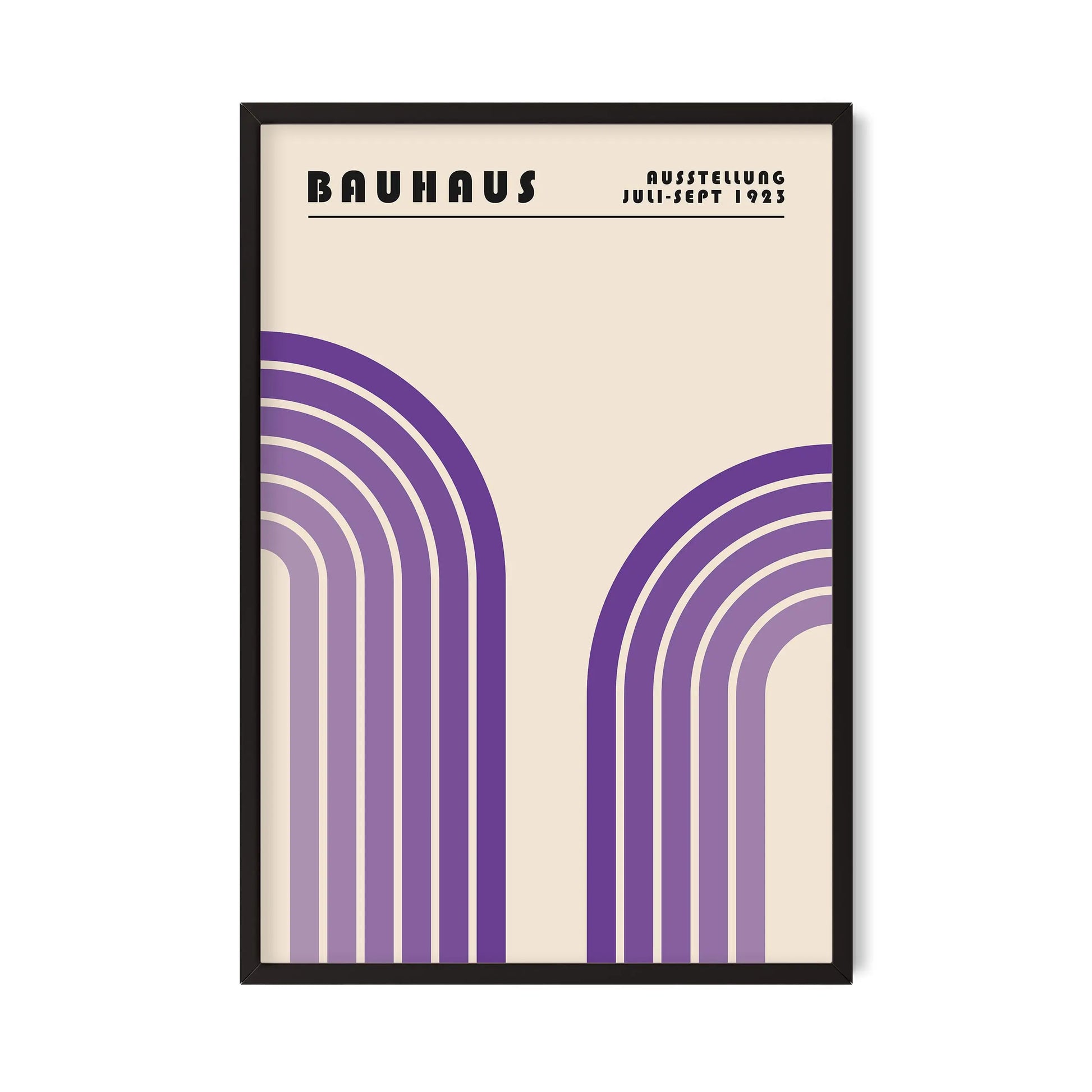 This vintage Bauhaus graphic poster depicts two monumental arched forms, arranged symmetrically on the left and right, evoking stylized arches. Each form consists of concentric bands with gradually graded tones, from darkest to lightest, creating a pronounced visual rhythm and a sense of depth.