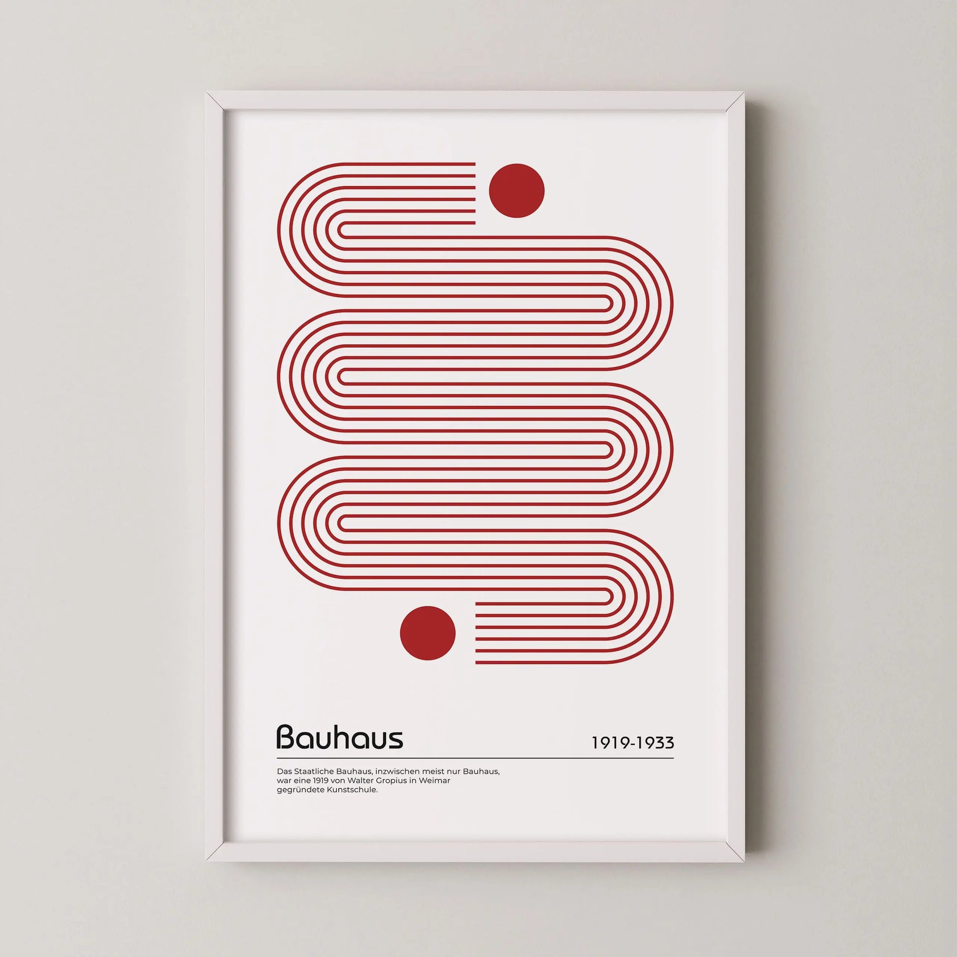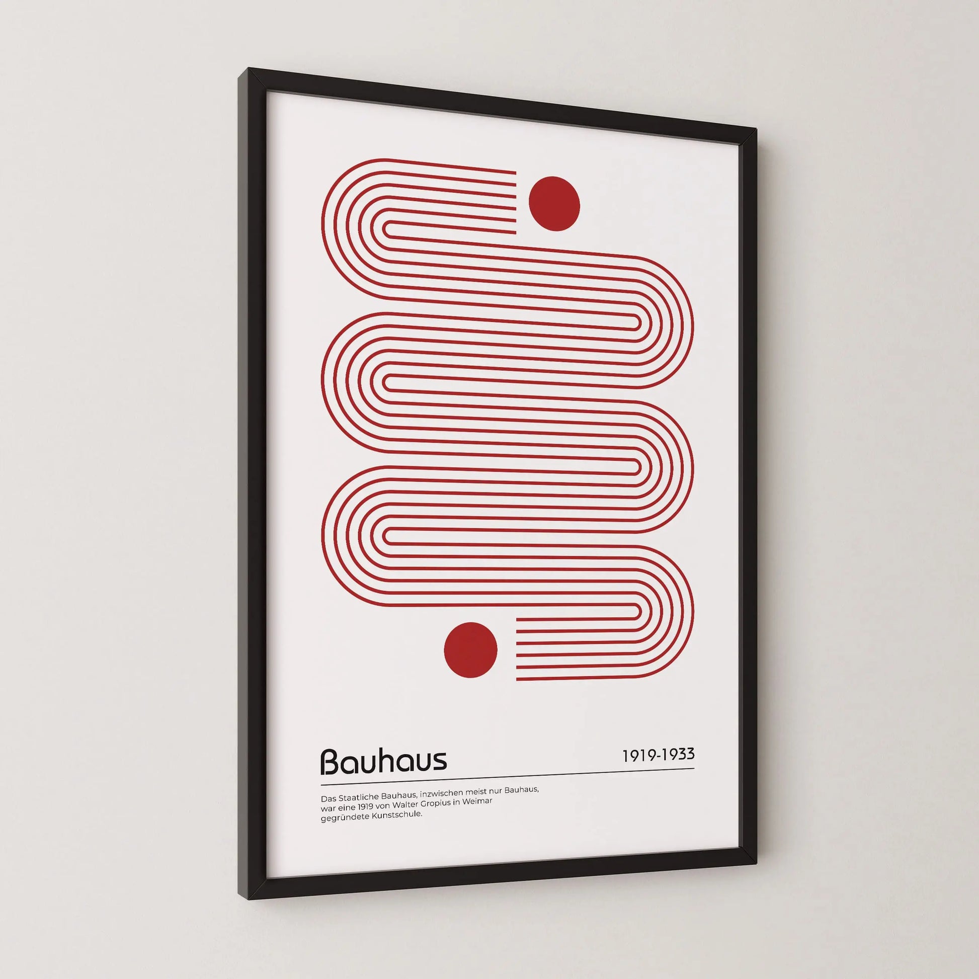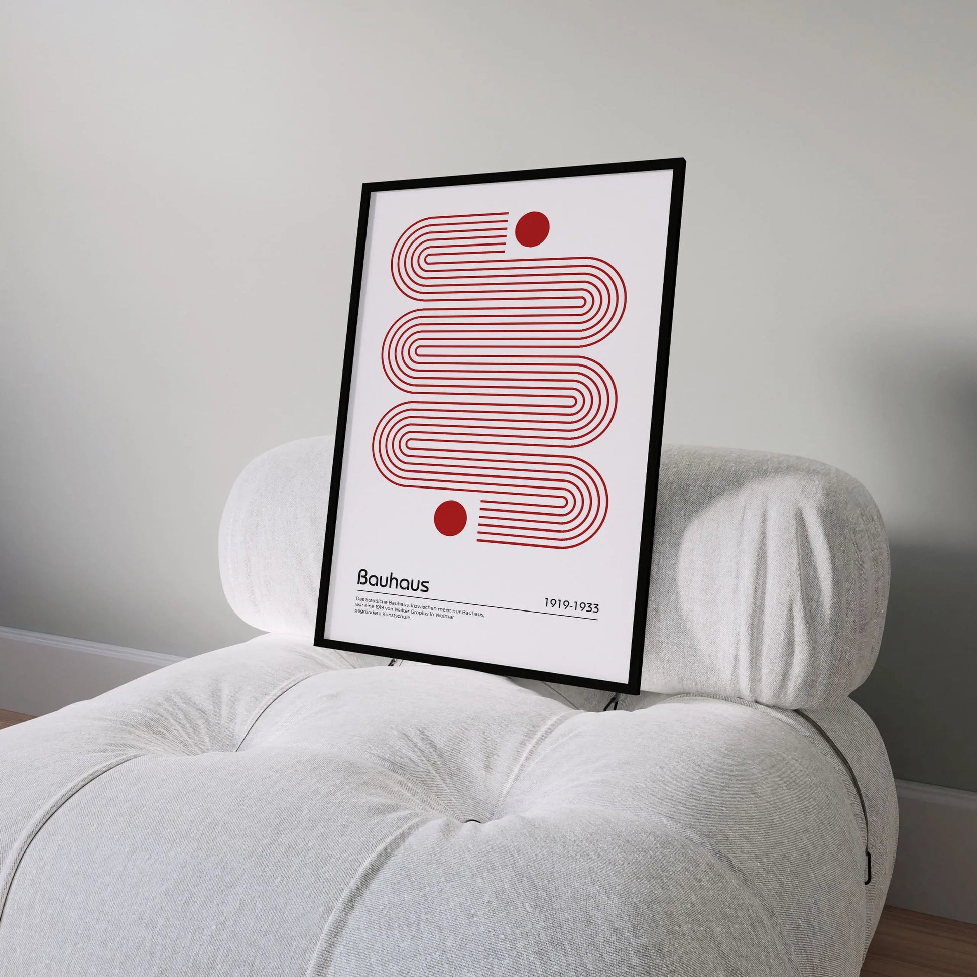 This geometric and minimalist red Bauhaus poster is composed of two solid circles connected by sinuous parallel curves.
