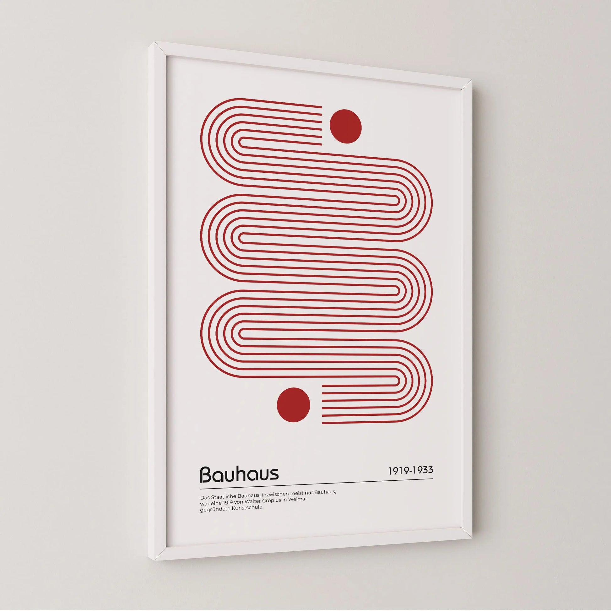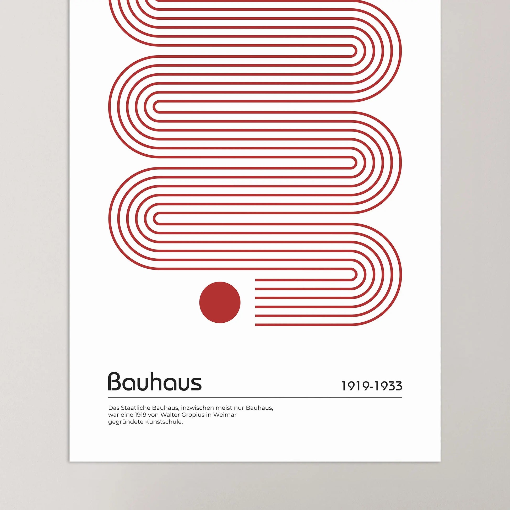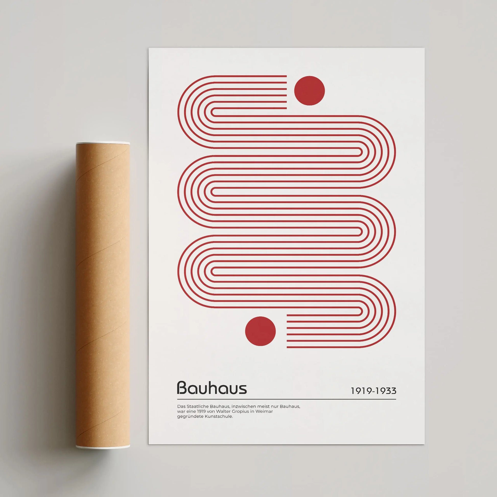 This geometric and minimalist red Bauhaus poster is composed of two solid circles connected by sinuous parallel curves.