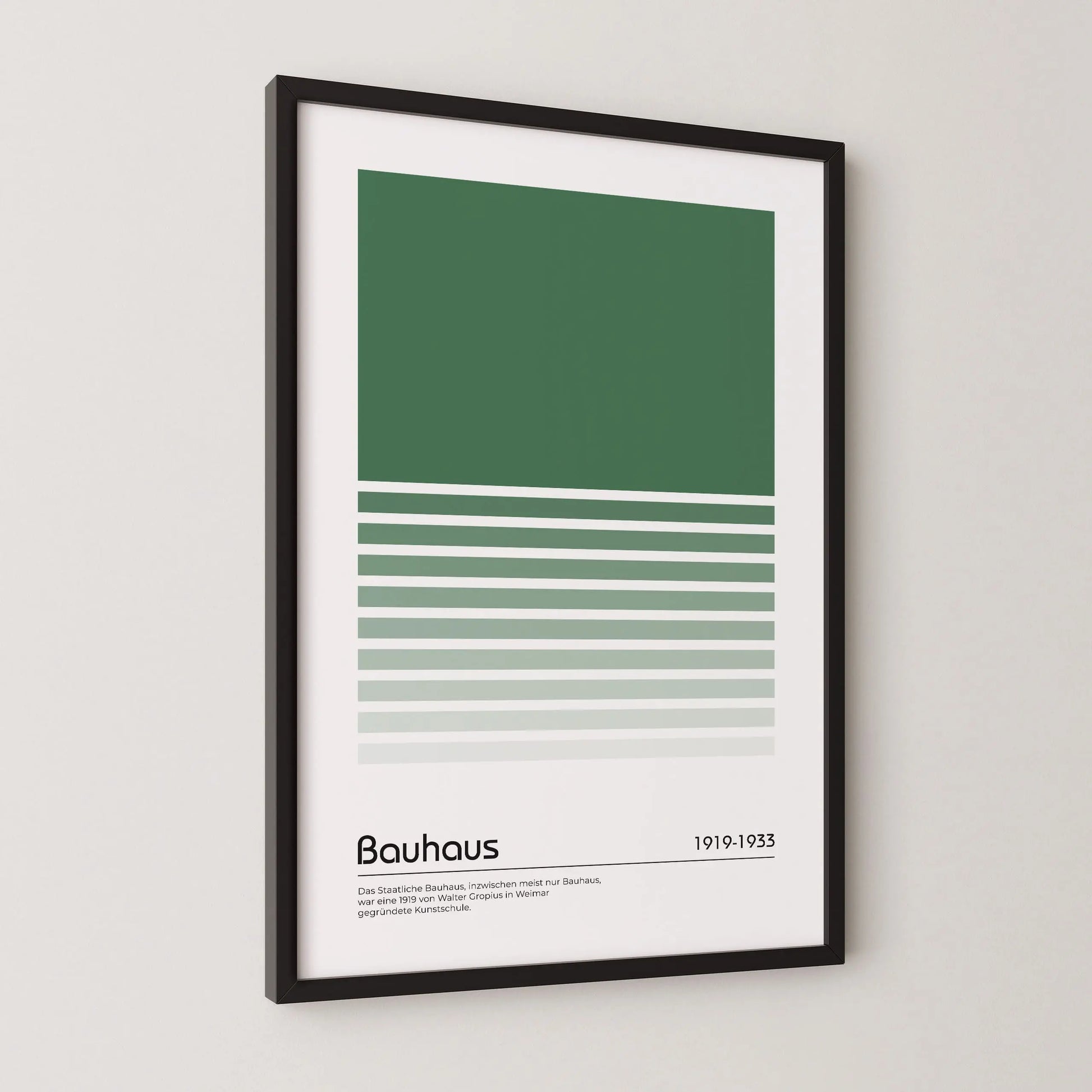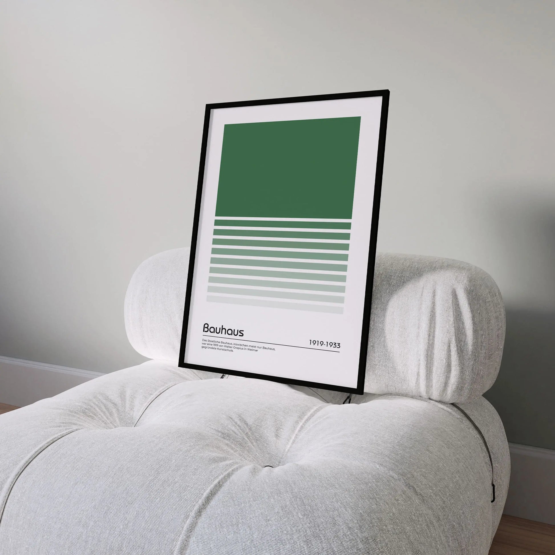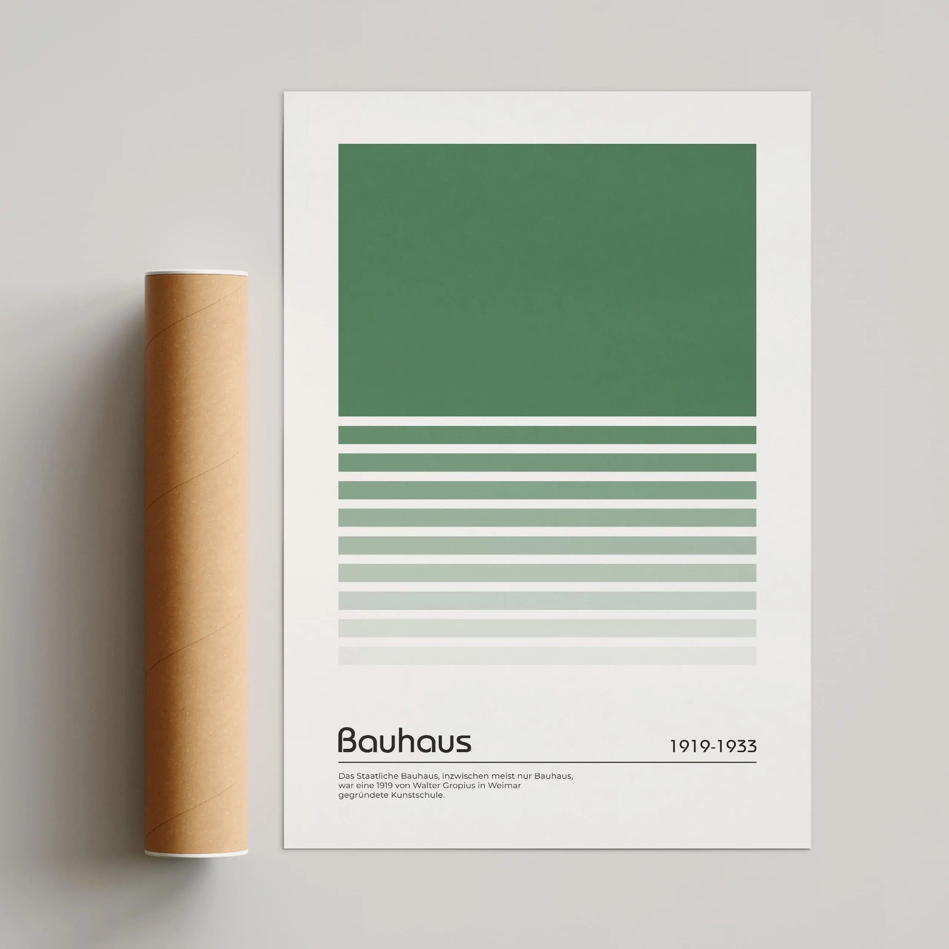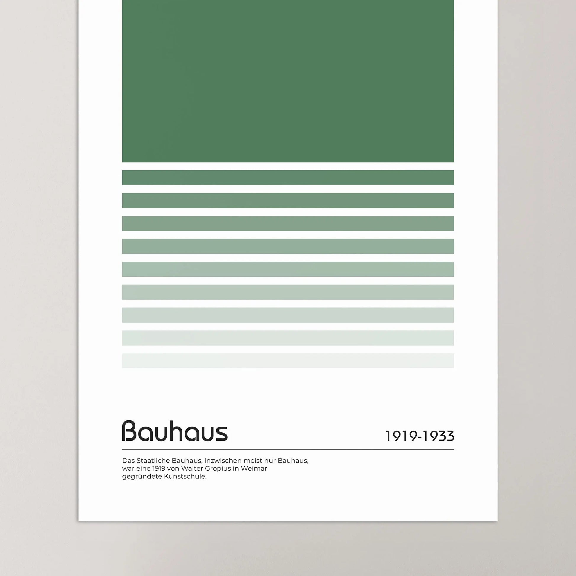 This geometric Bauhaus poster in green features a large solid rectangle that breaks down vertically into a gradient of bands that gradually become lighter.