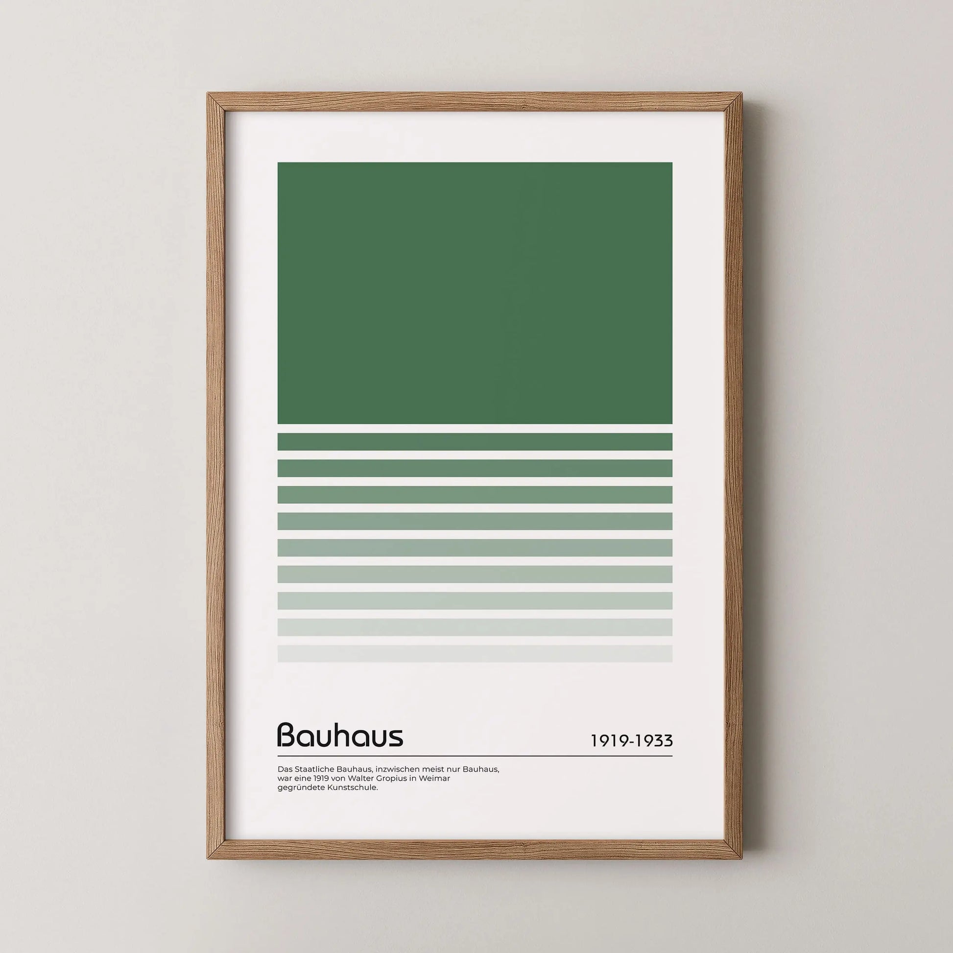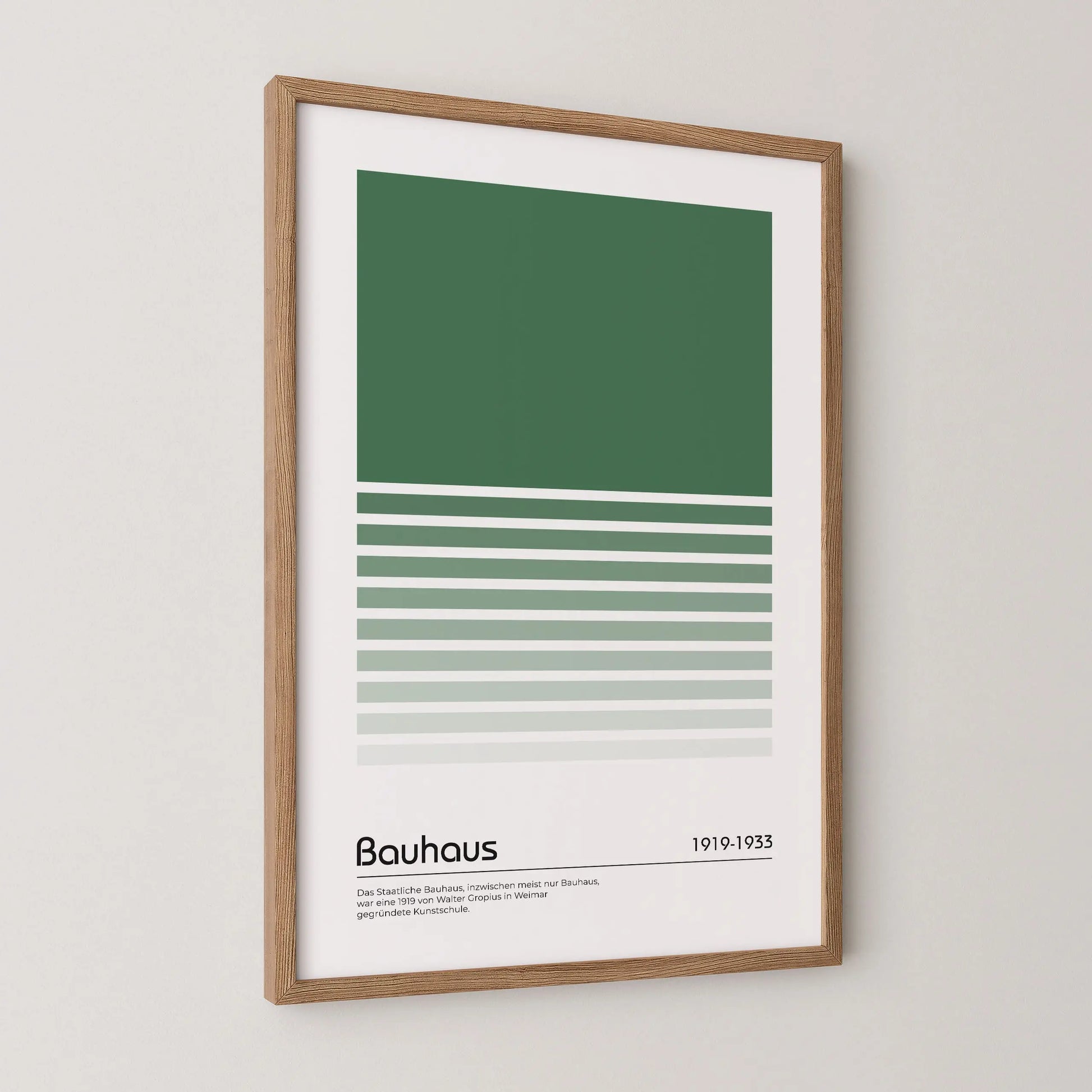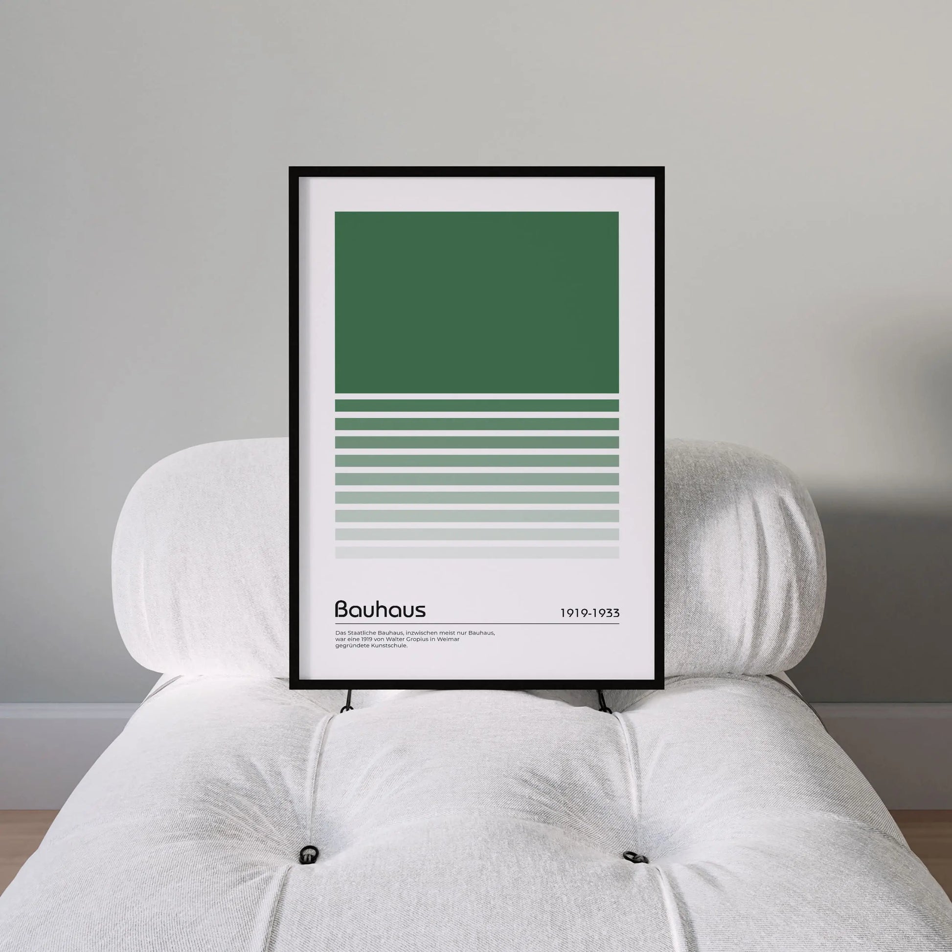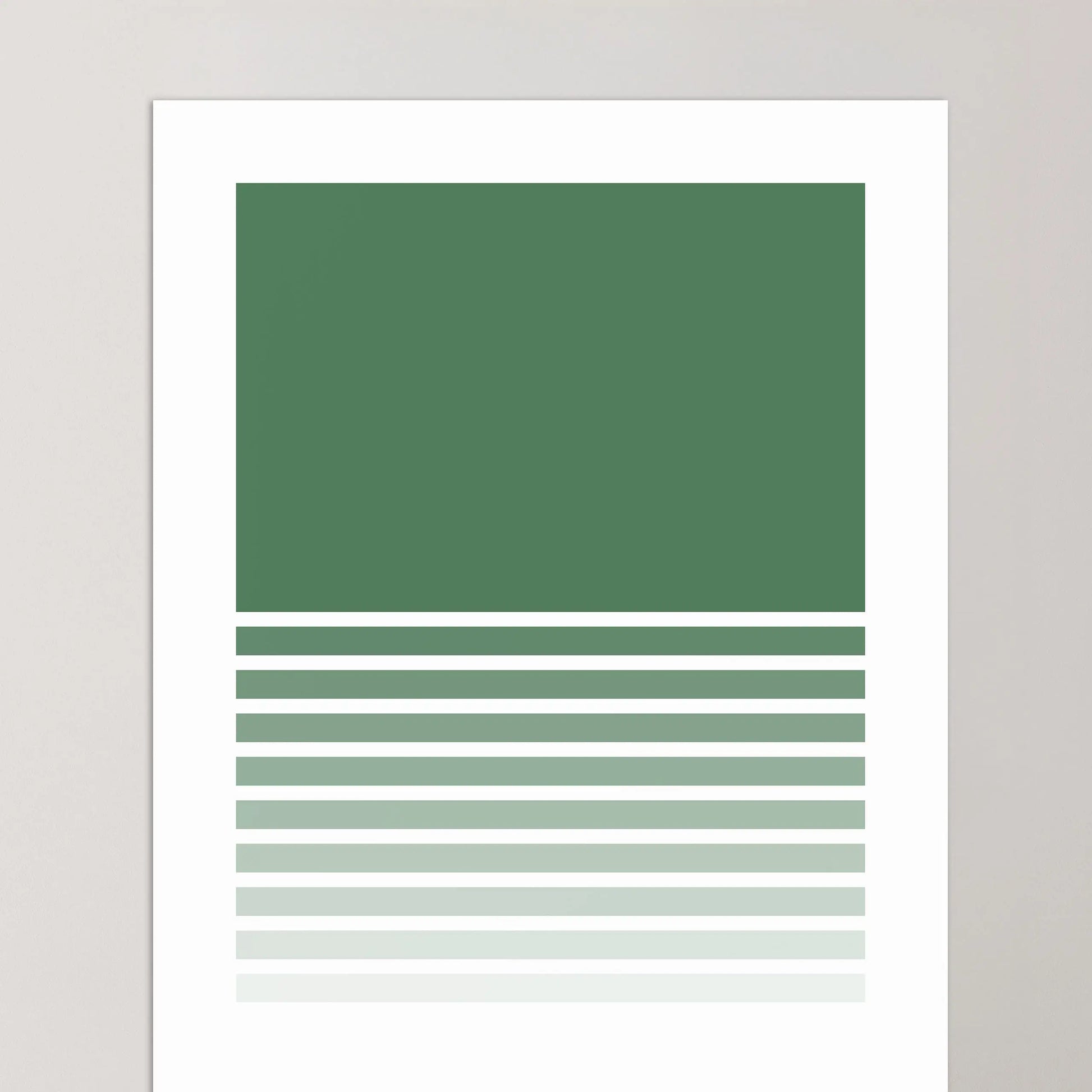 This geometric Bauhaus poster in green features a large solid rectangle that breaks down vertically into a gradient of bands that gradually become lighter.