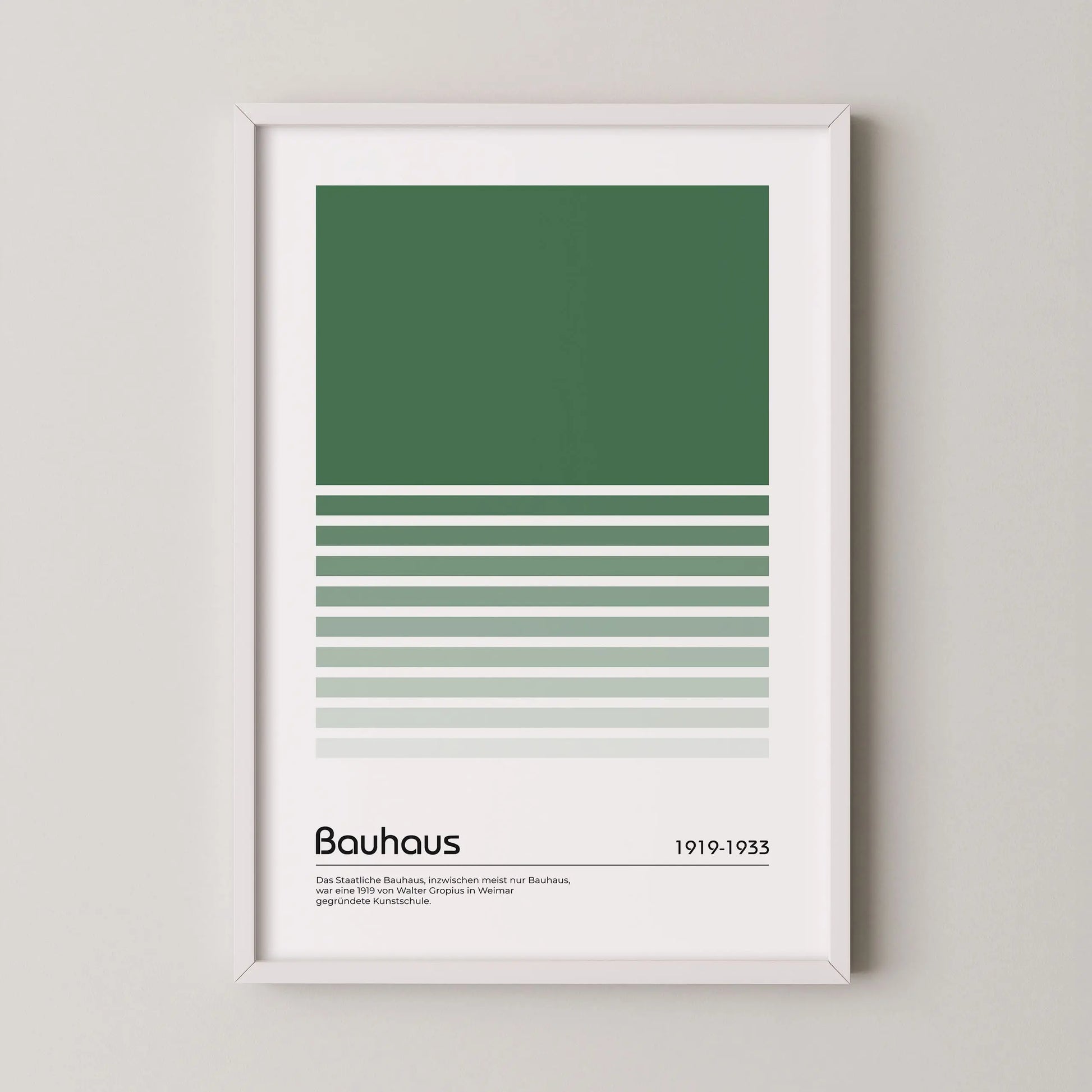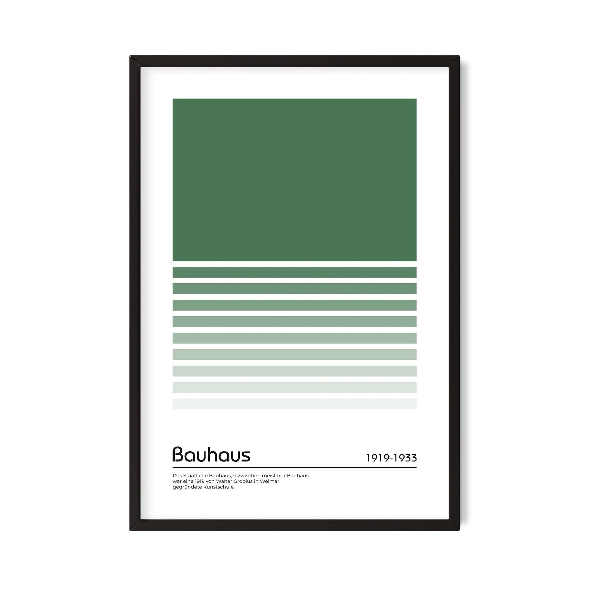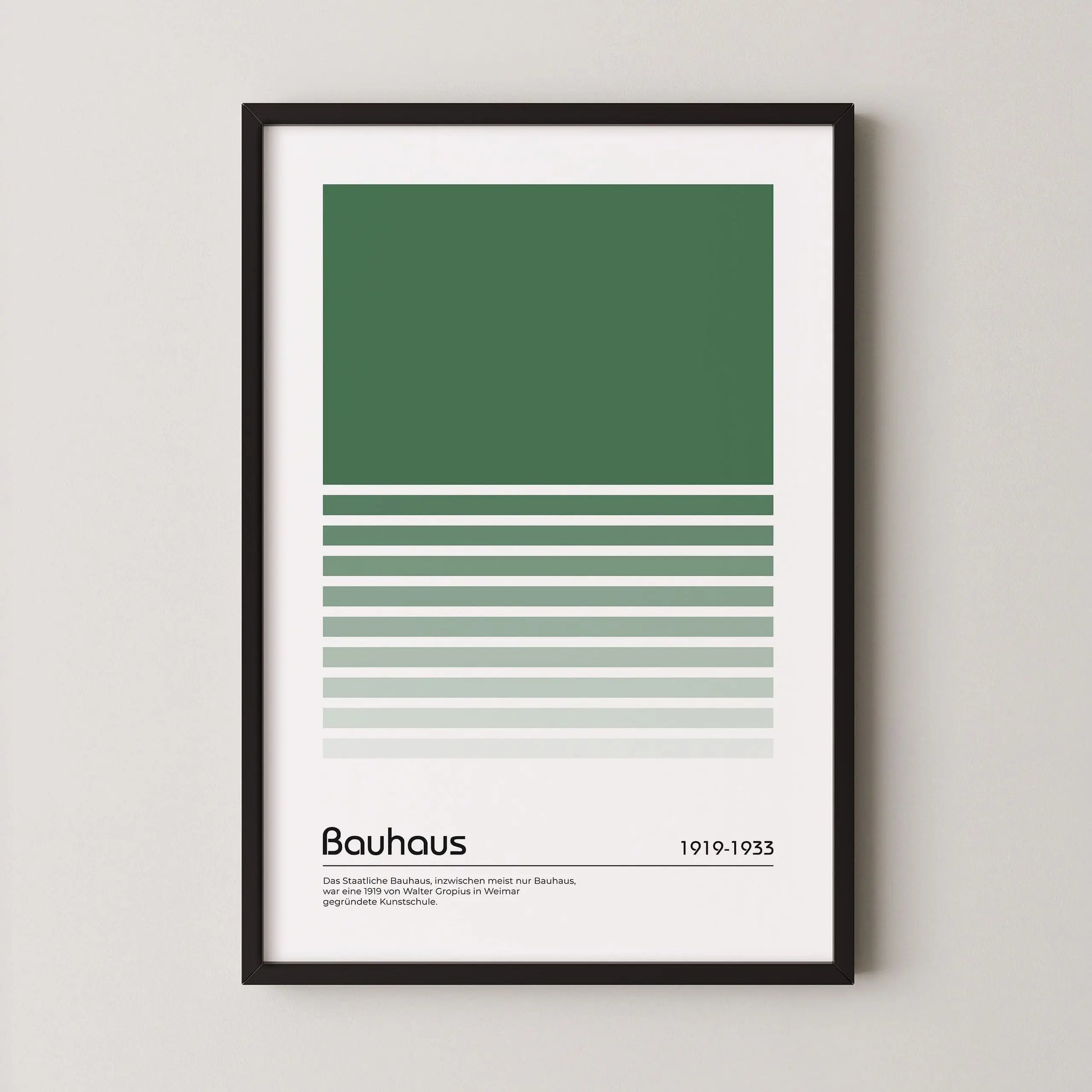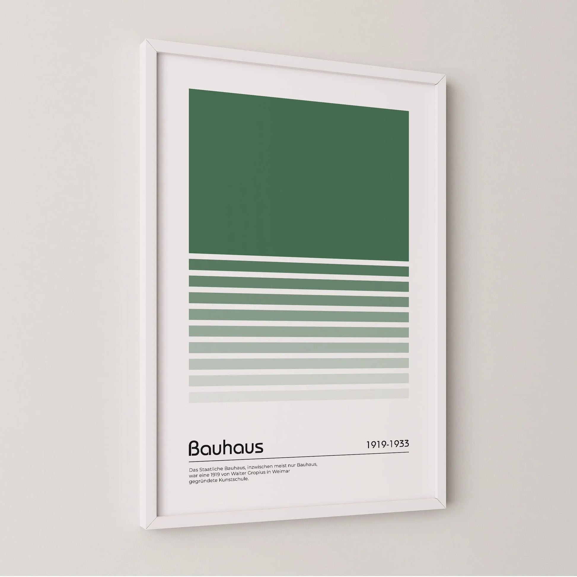 This geometric Bauhaus poster in green features a large solid rectangle that breaks down vertically into a gradient of bands that gradually become lighter.