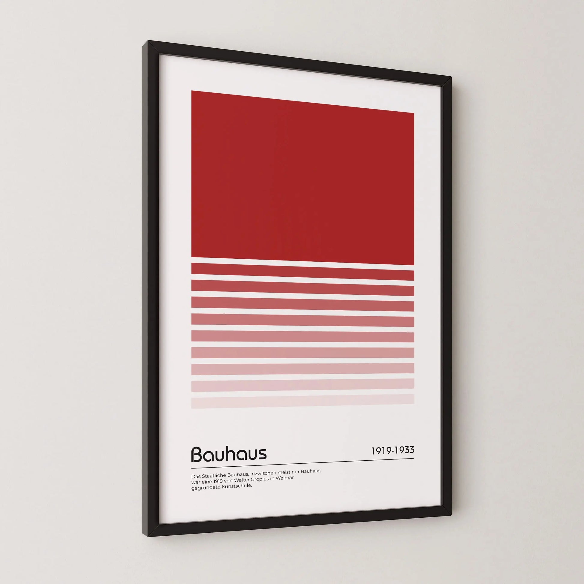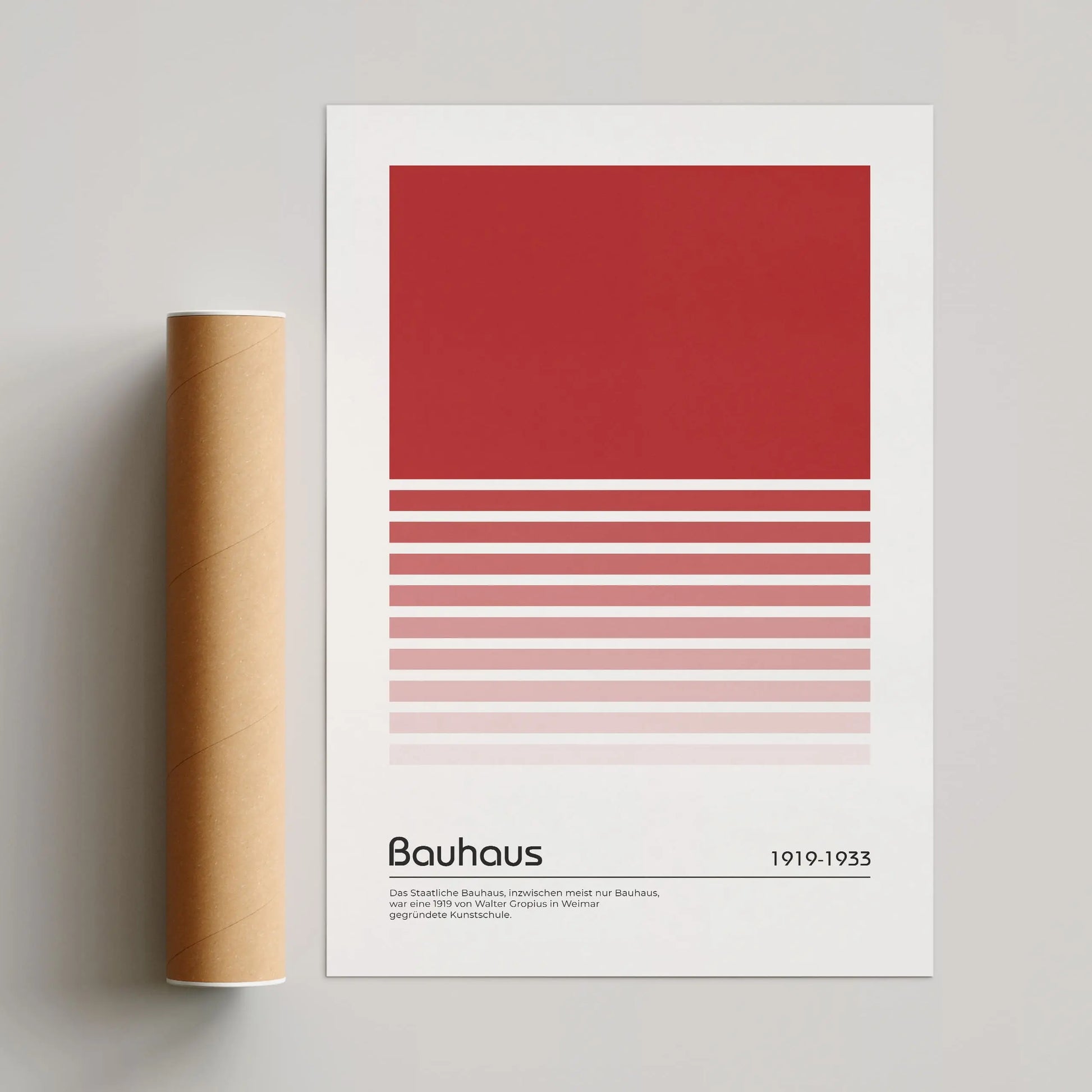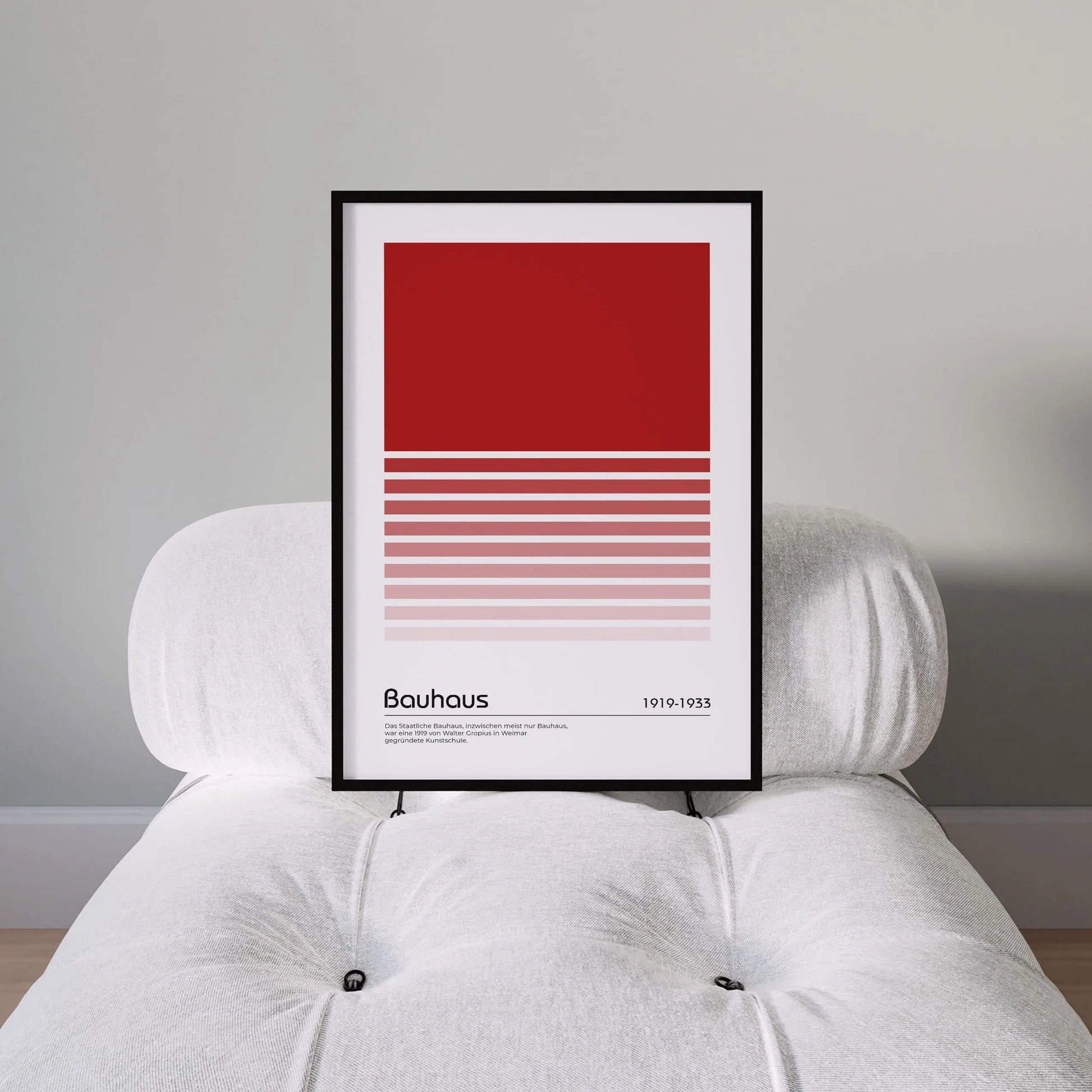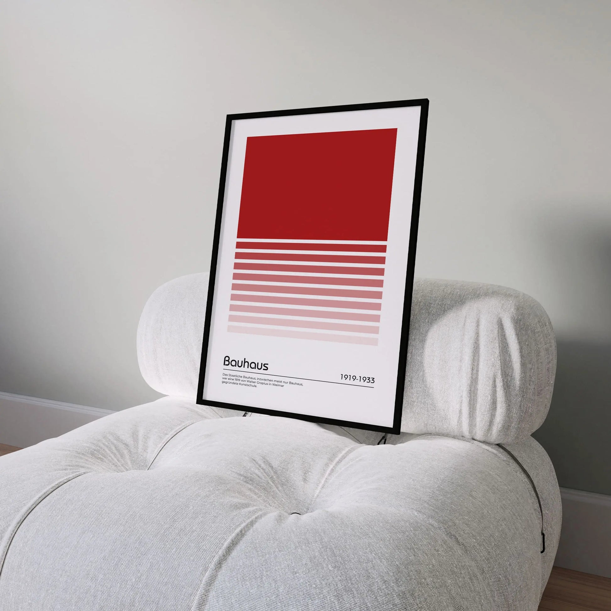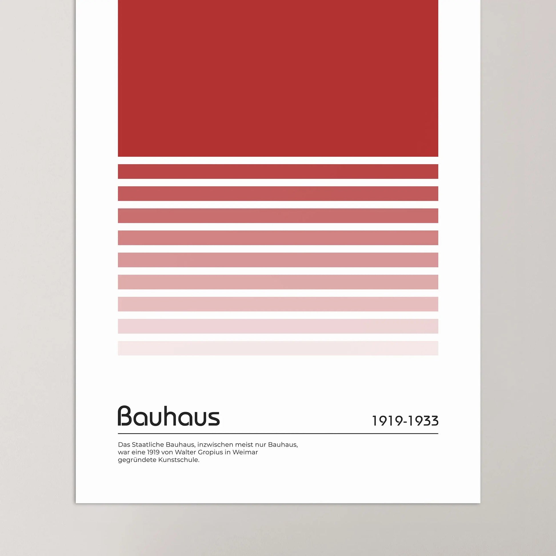 This geometric Bauhaus poster in red features a large solid rectangle that breaks down vertically into a gradient of bands that gradually become lighter.