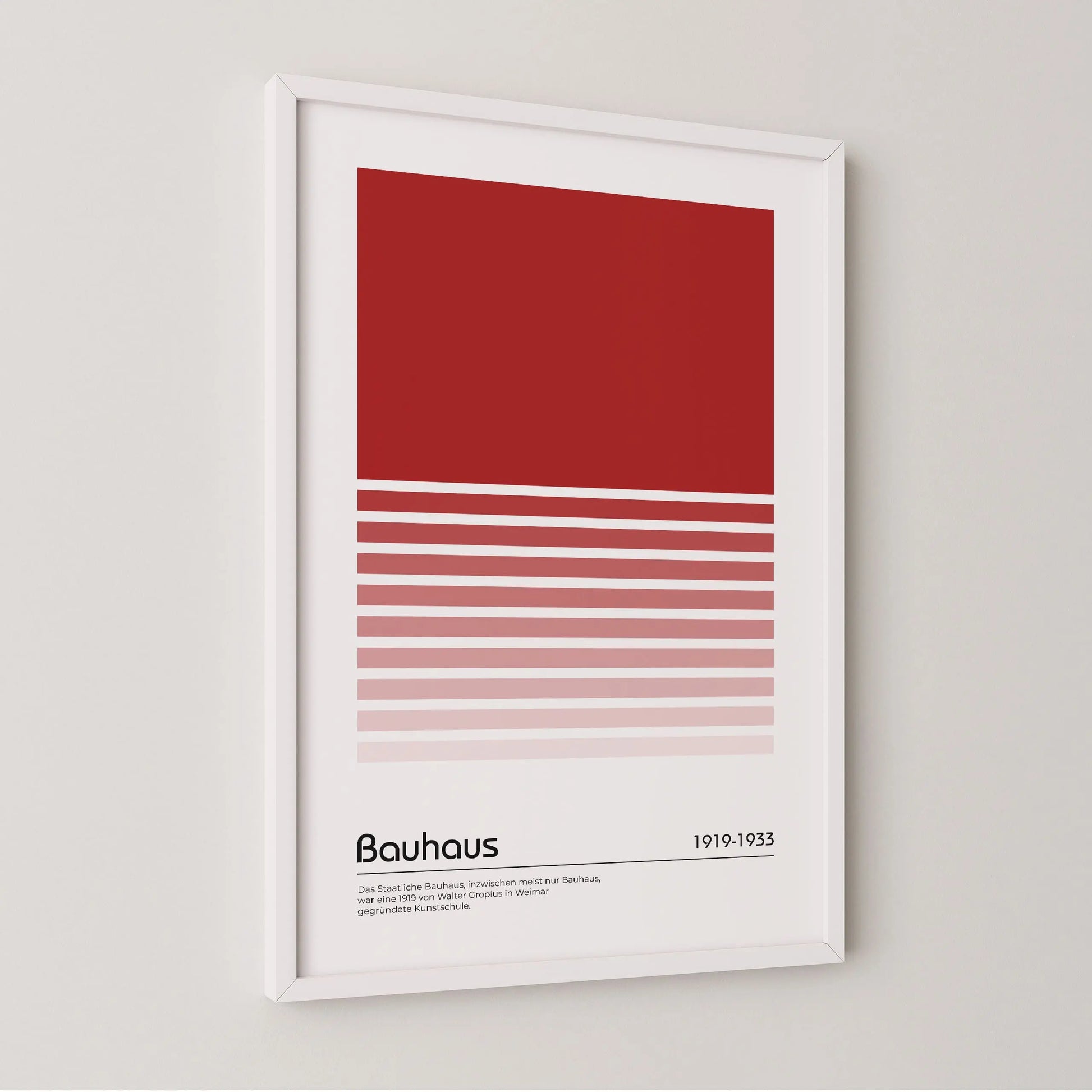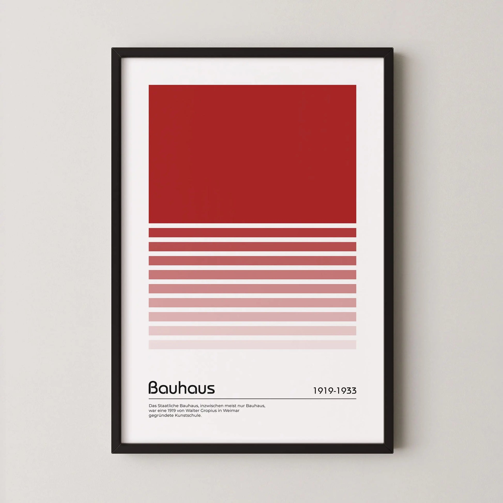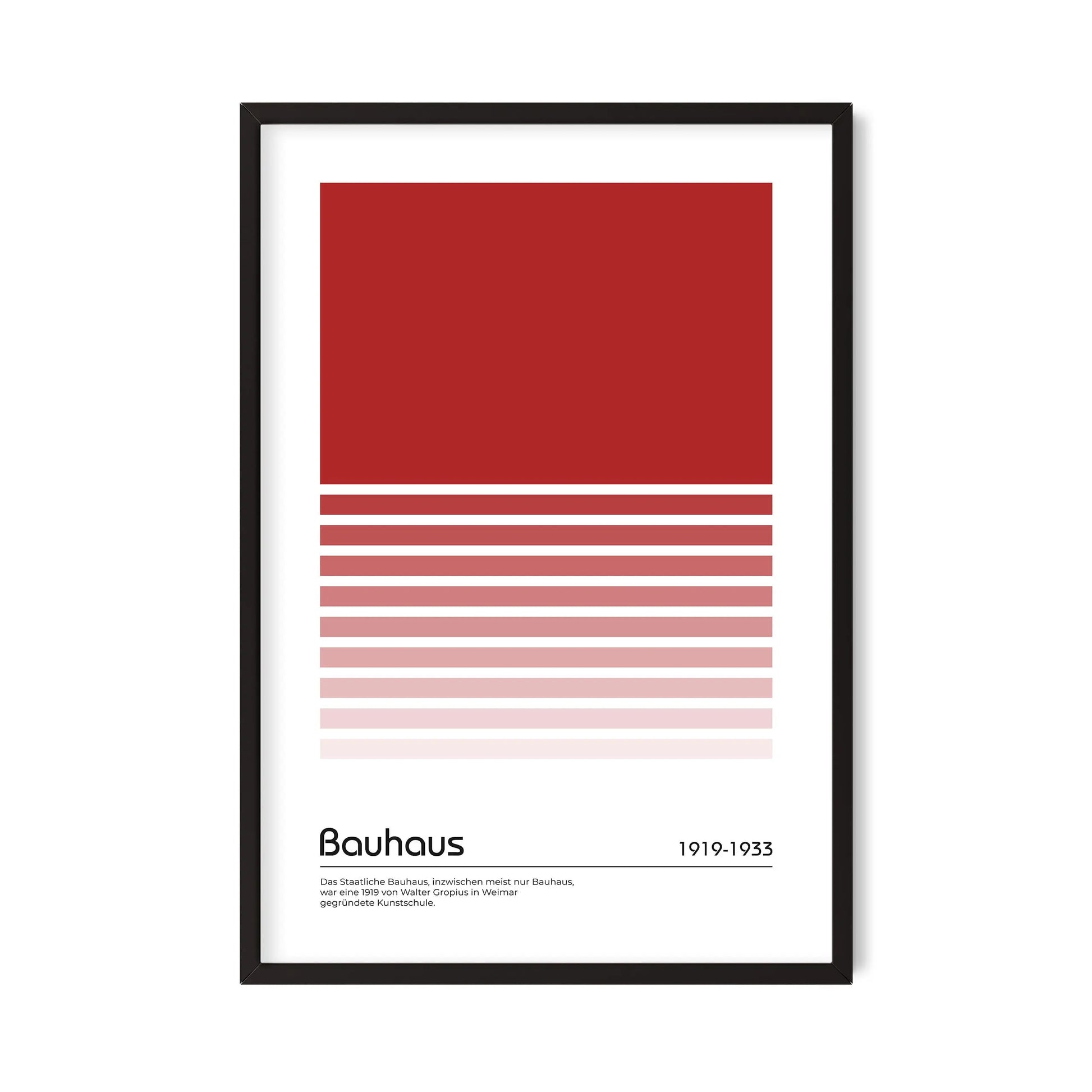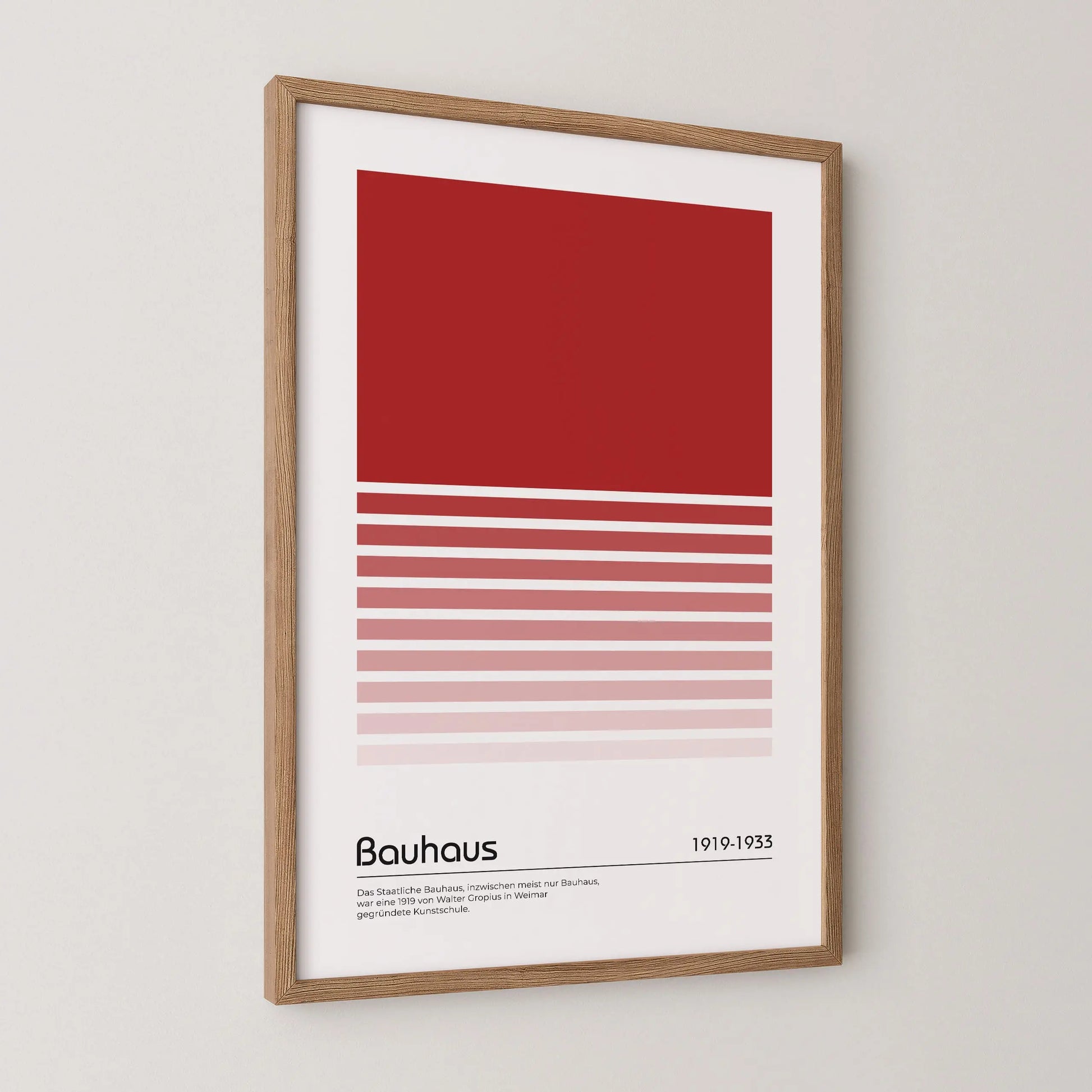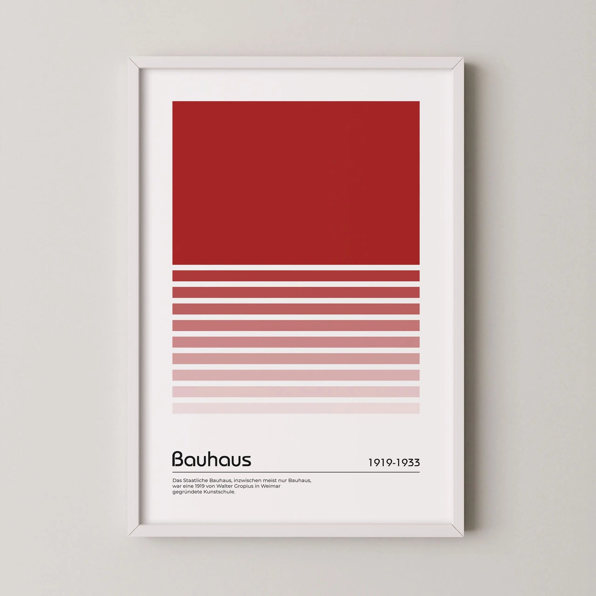 This geometric Bauhaus poster in red features a large solid rectangle that breaks down vertically into a gradient of bands that gradually become lighter.