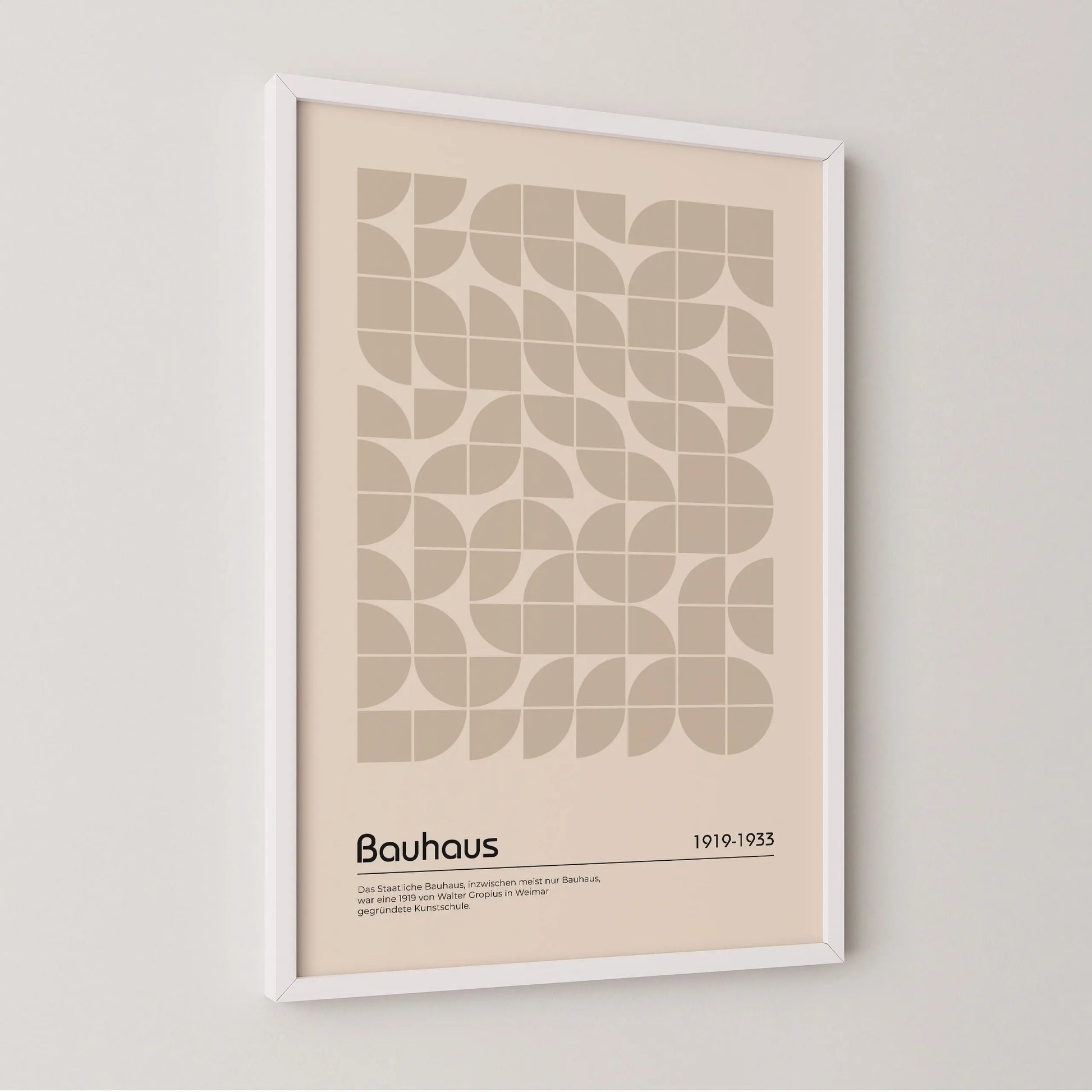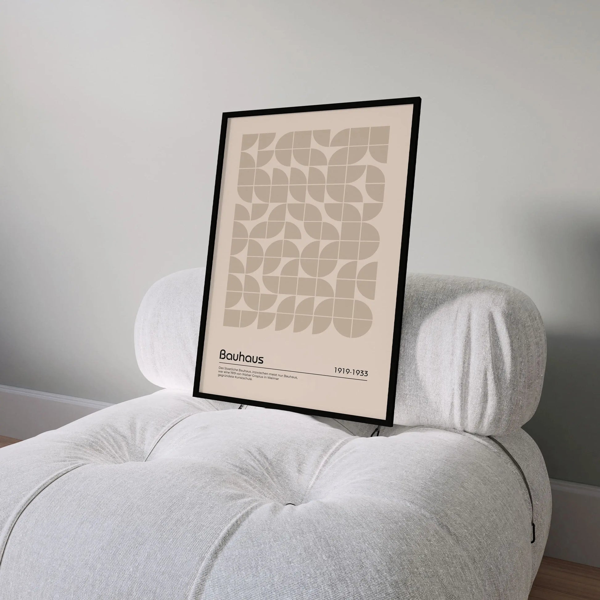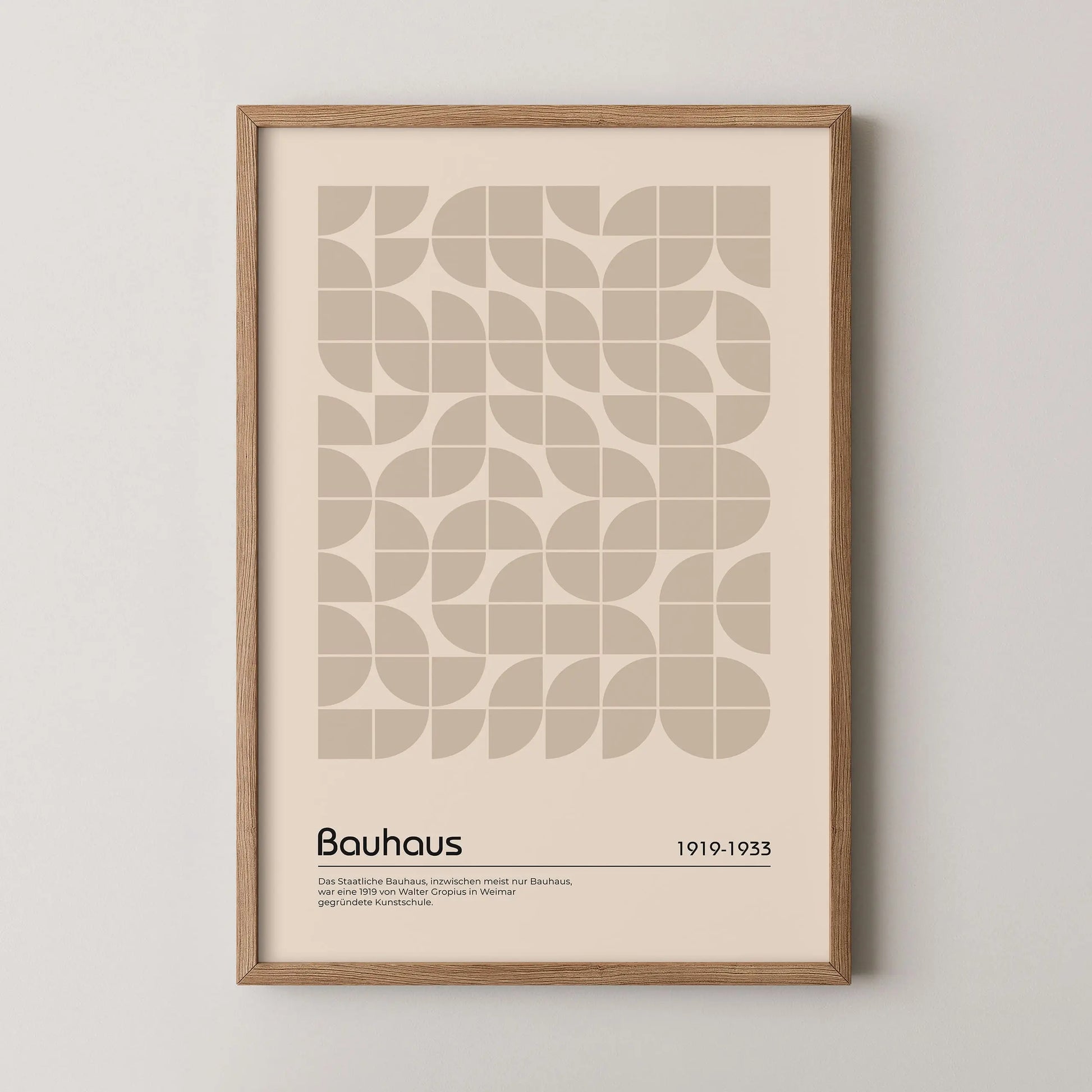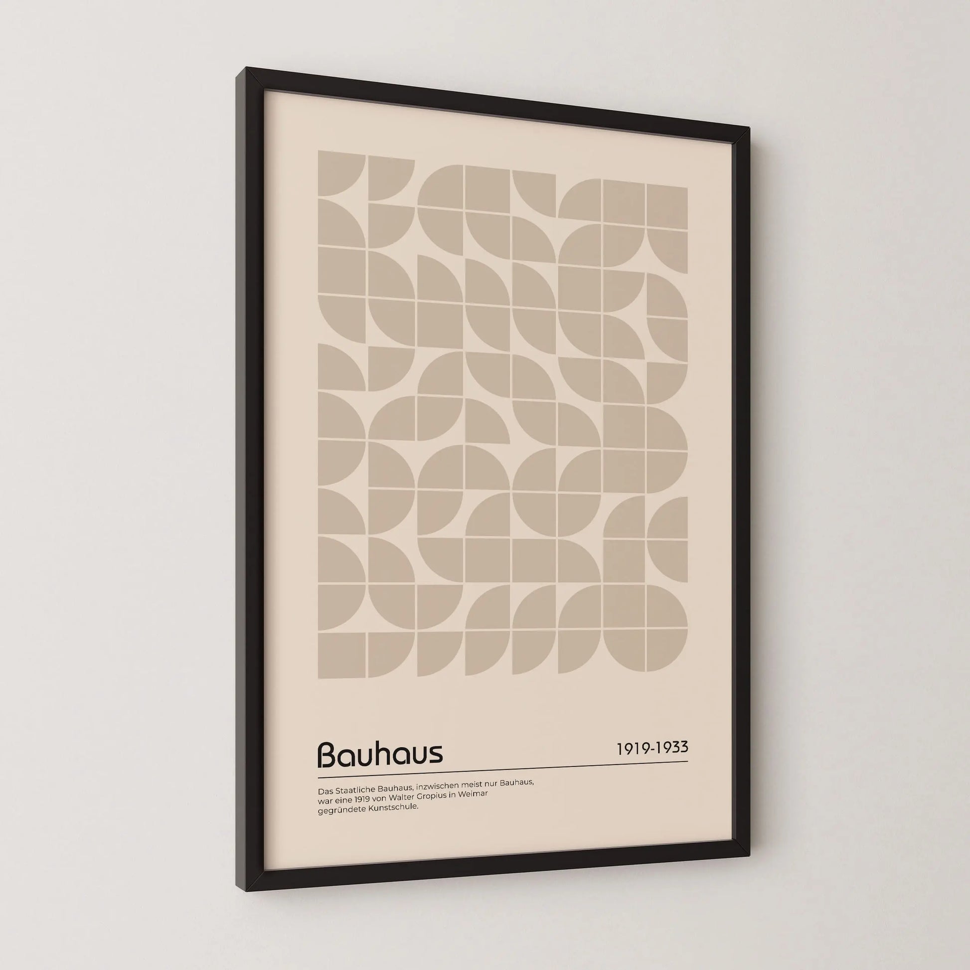 Este cartel geométrico de estilo Bauhaus se compone de una trama modular formada por formas derivadas del círculo y combinadas con el cuadrado dentro de una estructura estricta. Sugiere orden, racionalidad y repetición industrial, en referencia a los ejercicios de composición típicos de la enseñanza Bauhaus.