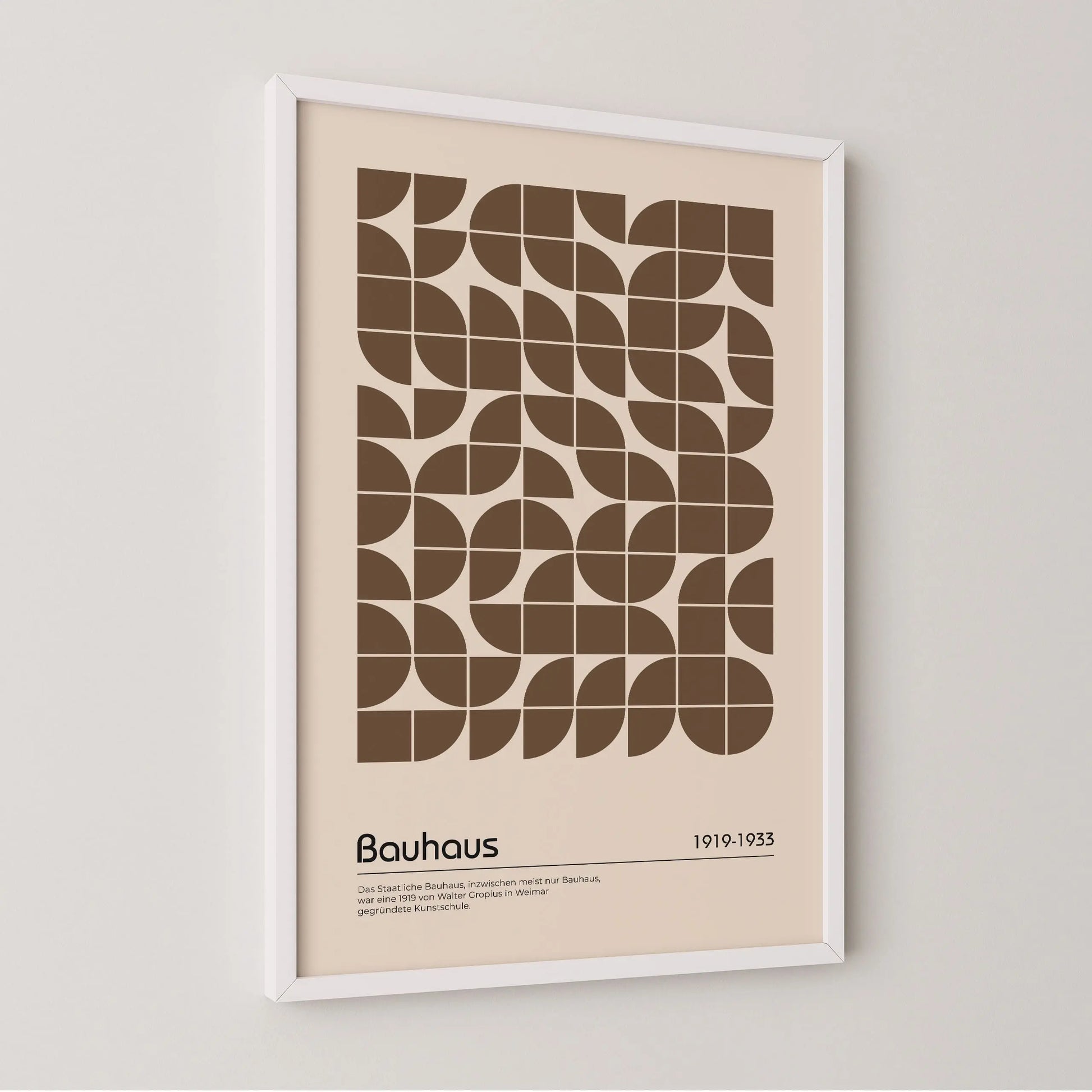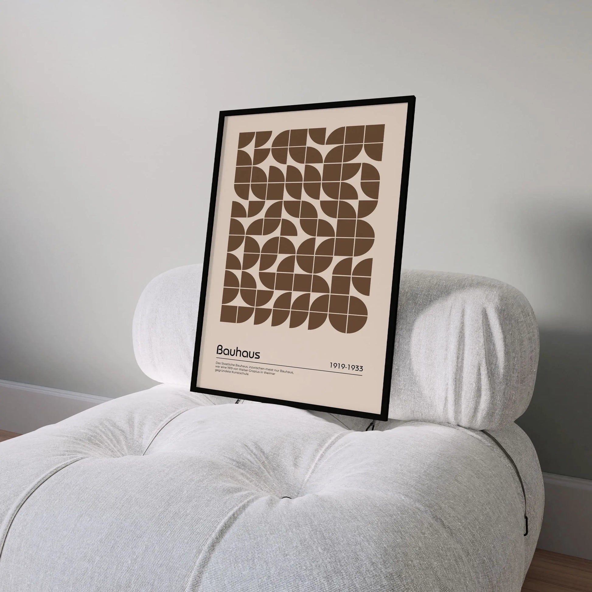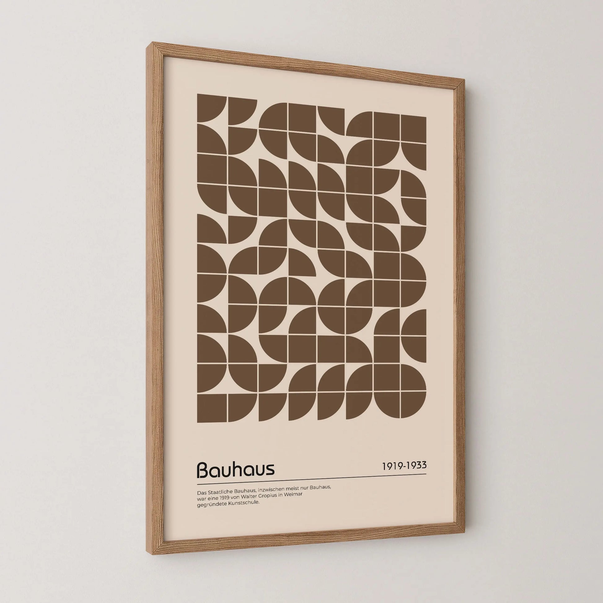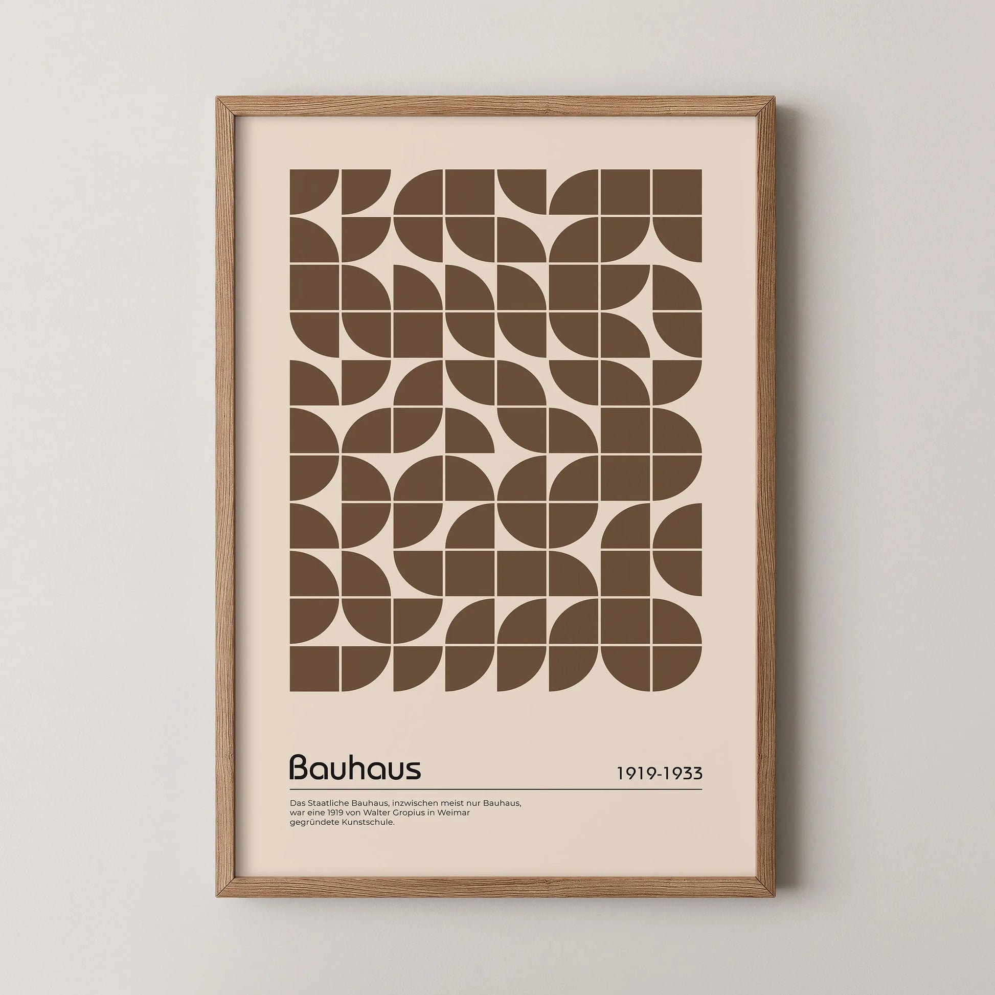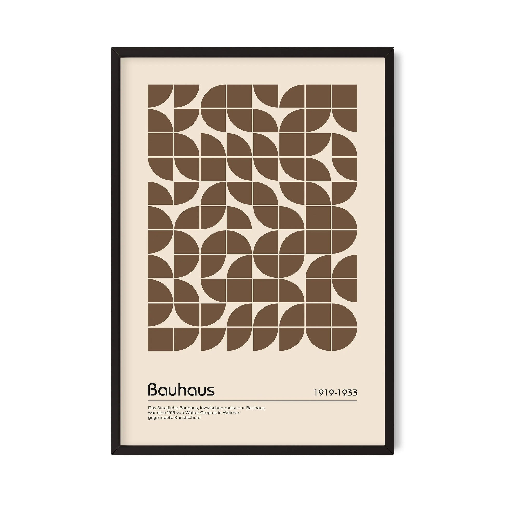 Este cartel geométrico de estilo Bauhaus se compone de una trama modular formada por formas derivadas del círculo y combinadas con el cuadrado dentro de una estructura estricta. Sugiere orden, racionalidad y repetición industrial, en referencia a los ejercicios de composición típicos de la enseñanza Bauhaus.