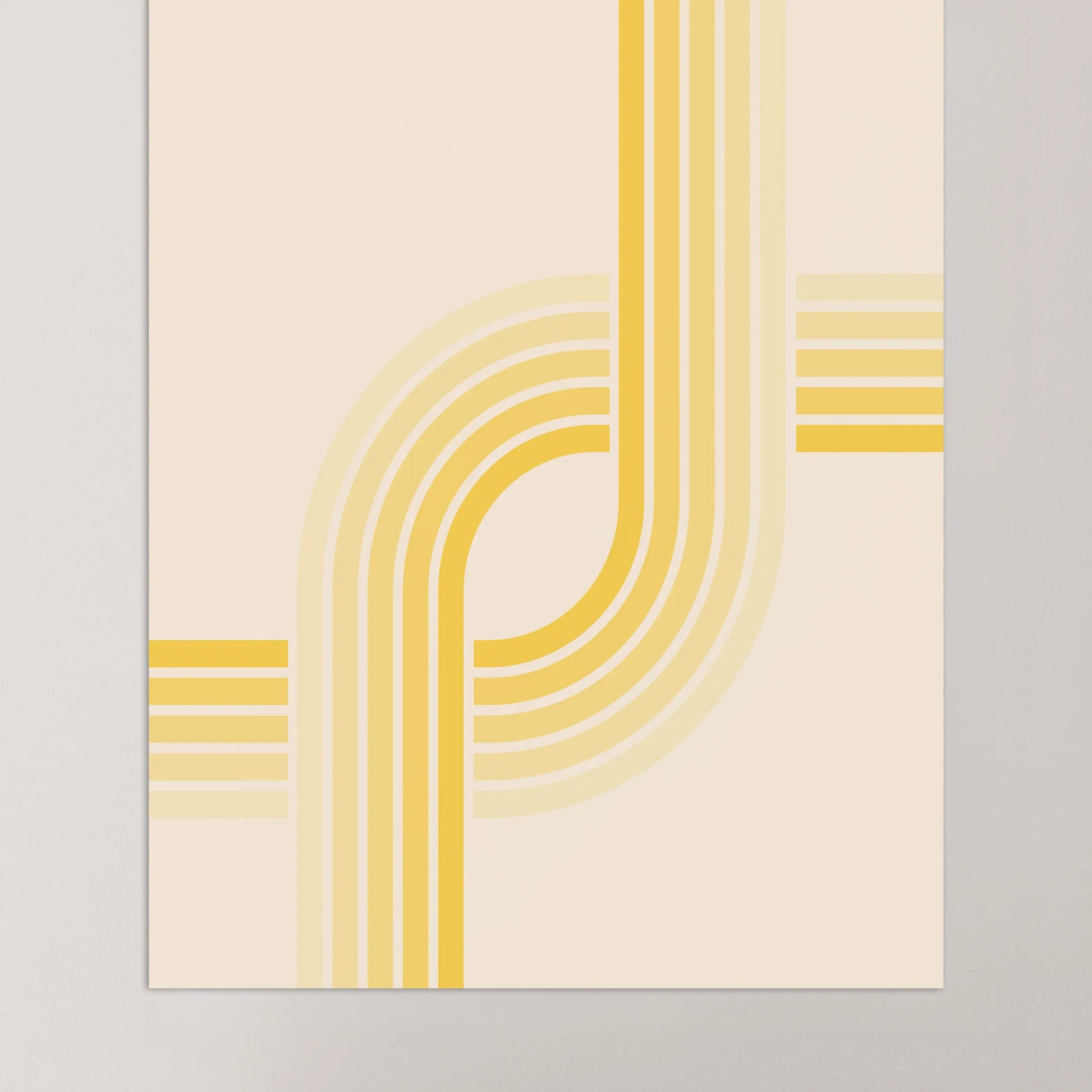 Este cartel gráfico vintage de estilo Bauhaus está compuesto por líneas paralelas verticales, regulares y de anchura constante, que se prolongan y se curvan para formar un arco parcial. Segmentos horizontales puntúan la composición, creando intersecciones nítidas entre los ejes verticales y horizontales.