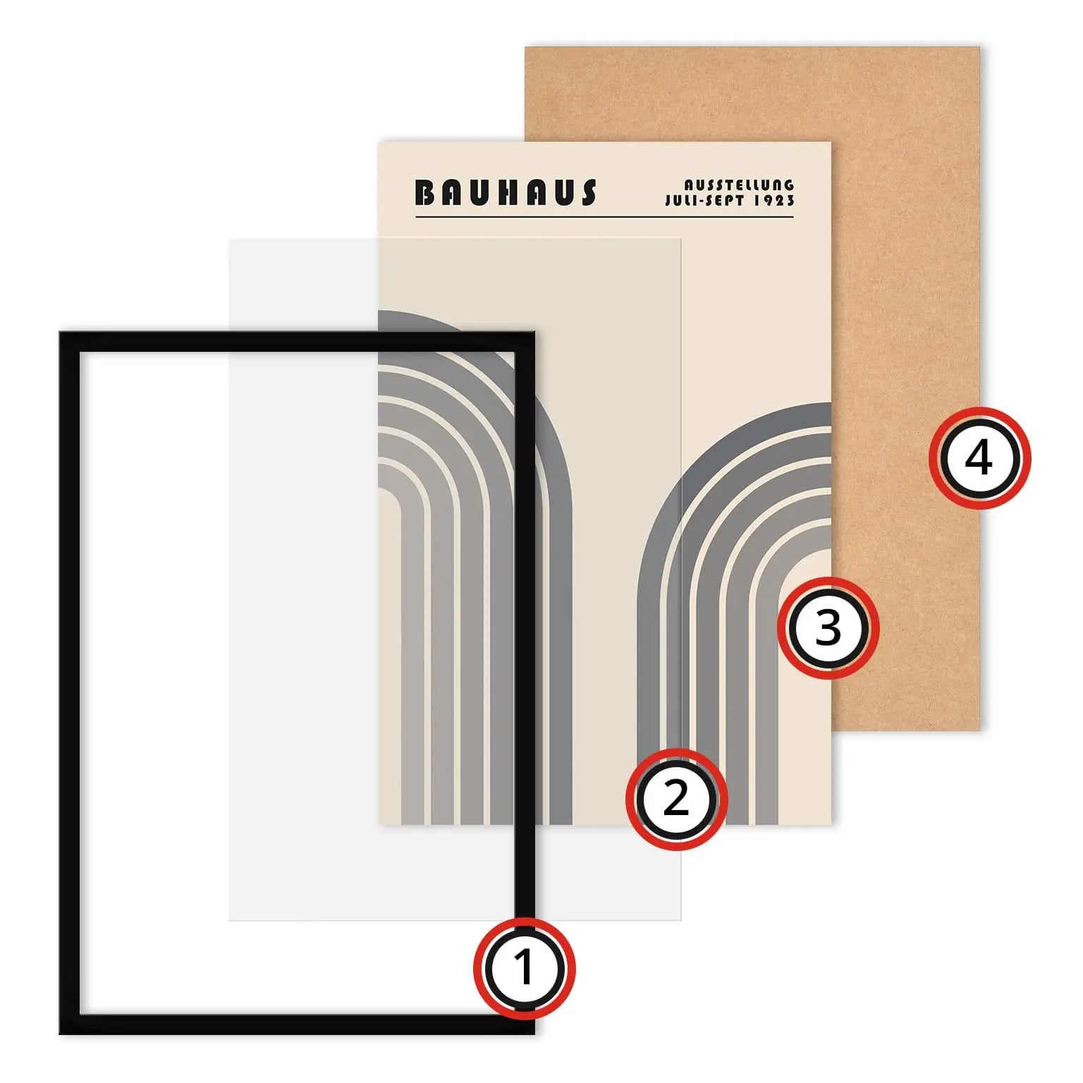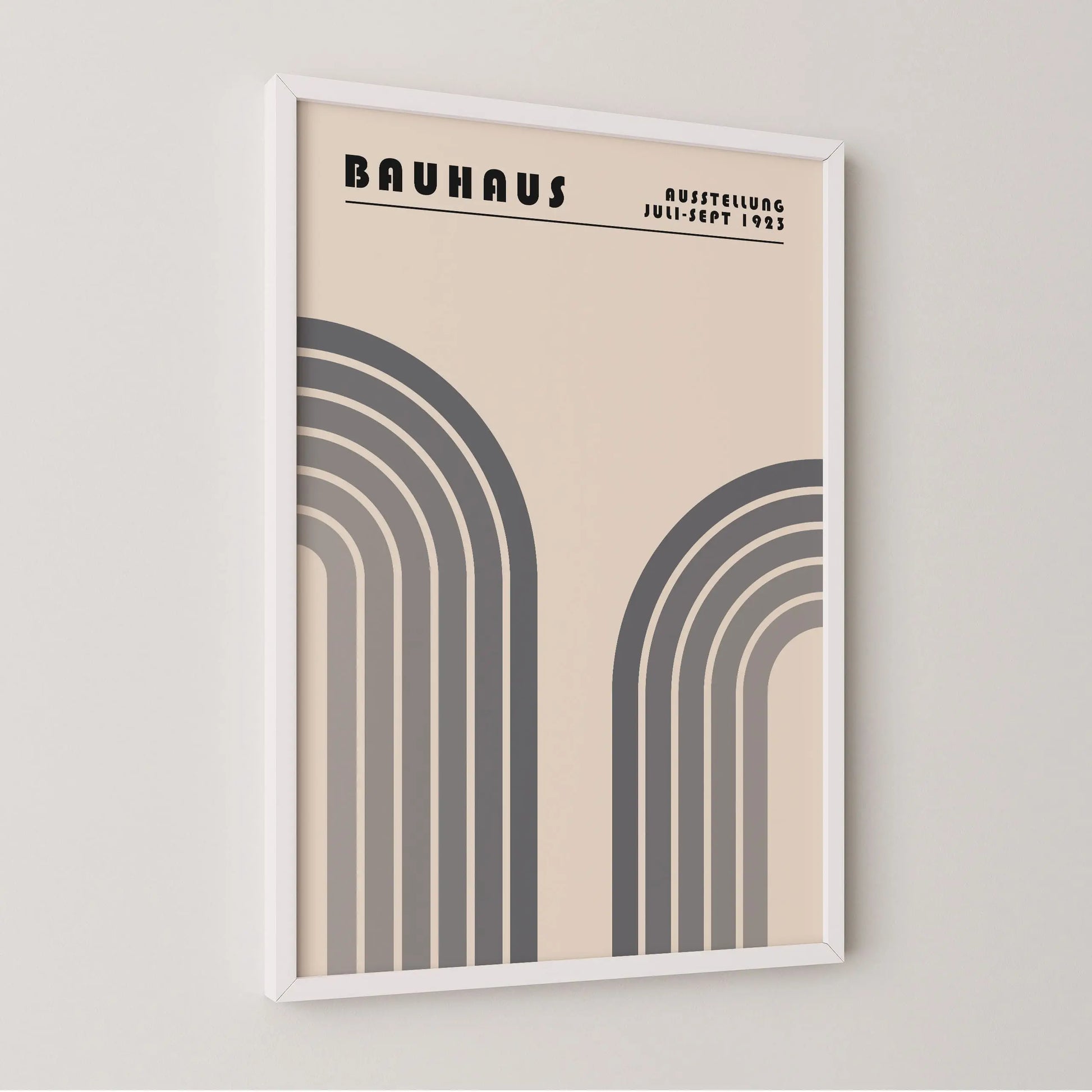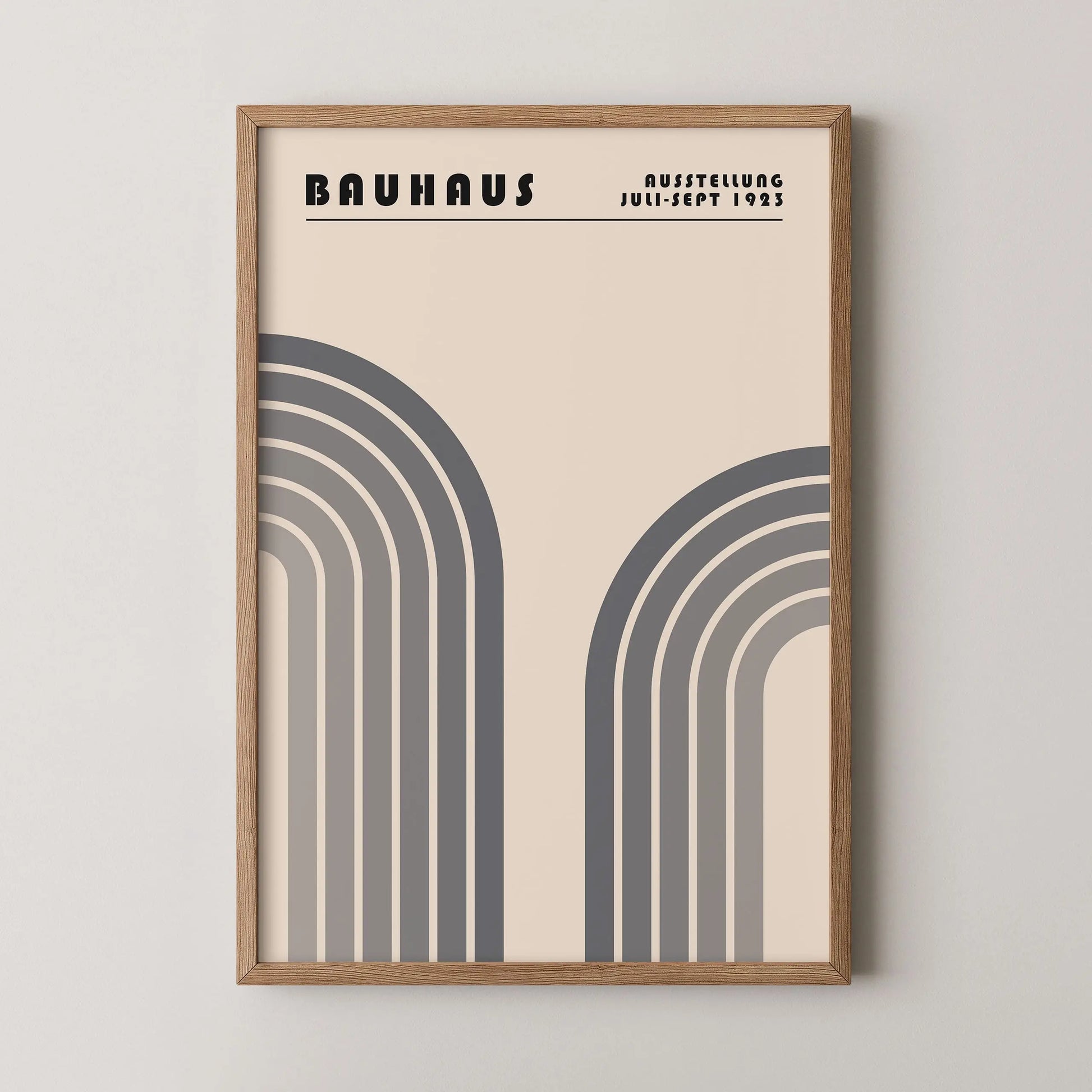 Este cartel gráfico vintage de estilo Bauhaus presenta dos formas arqueadas monumentales, dispuestas simétricamente a la izquierda y a la derecha, evocando arcos estilizados. Cada forma está compuesta por franjas concéntricas con tonos gradualmente degradados, del más oscuro al más claro, creando un marcado ritmo visual y una sensación de profundidad.