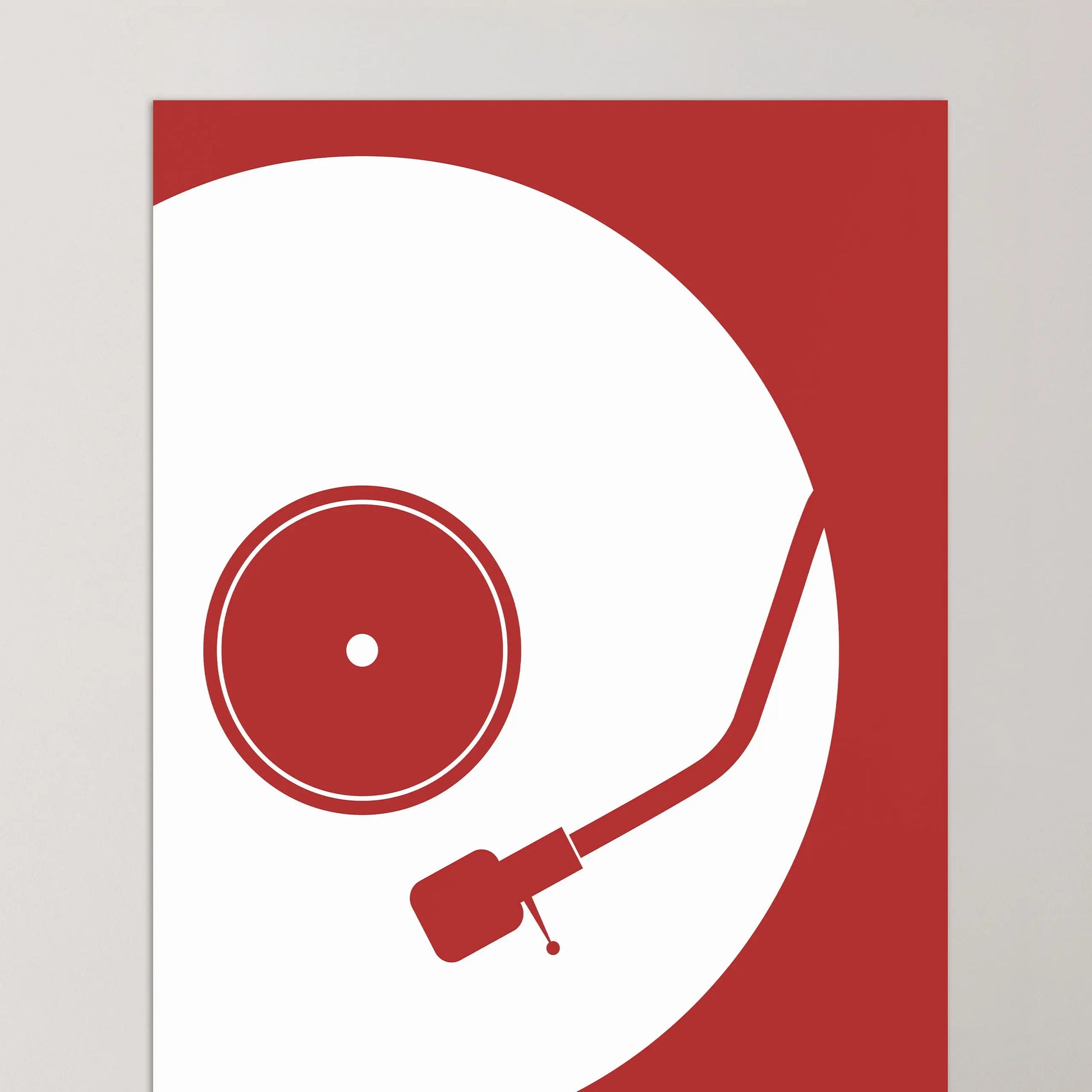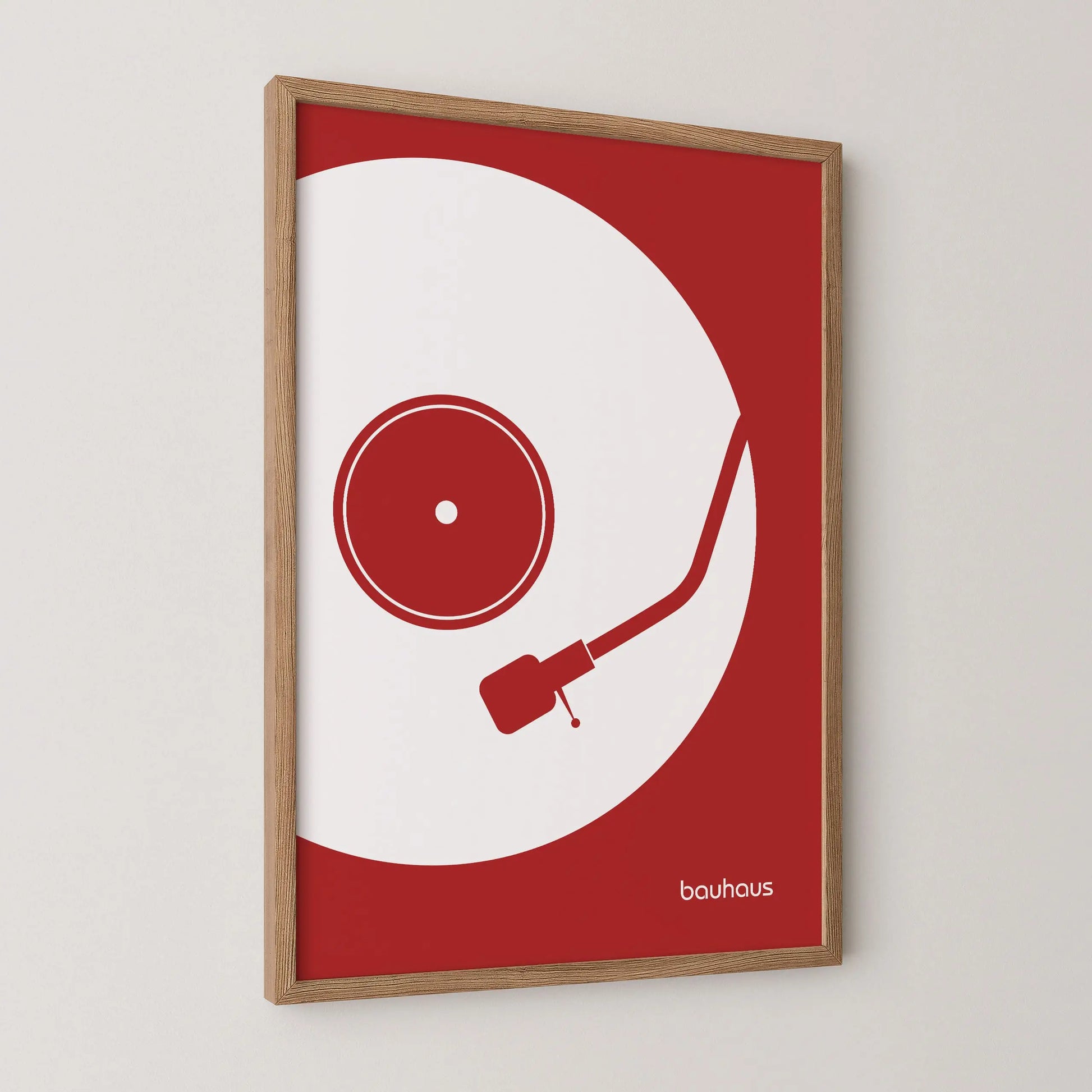 Este cartel vintage de estilo Bauhaus presenta una forma circular parcialmente desplazada hacia la izquierda, creando un desequilibrio visual controlado. Líneas angulares prolongan esta forma hacia la derecha, delineando un brazo que estructura la composición y guía la mirada. El juego de contrastes entre superficies sólidas, espacios vacíos y trazos lineales da lugar a una representación estilizada de un gramófono.