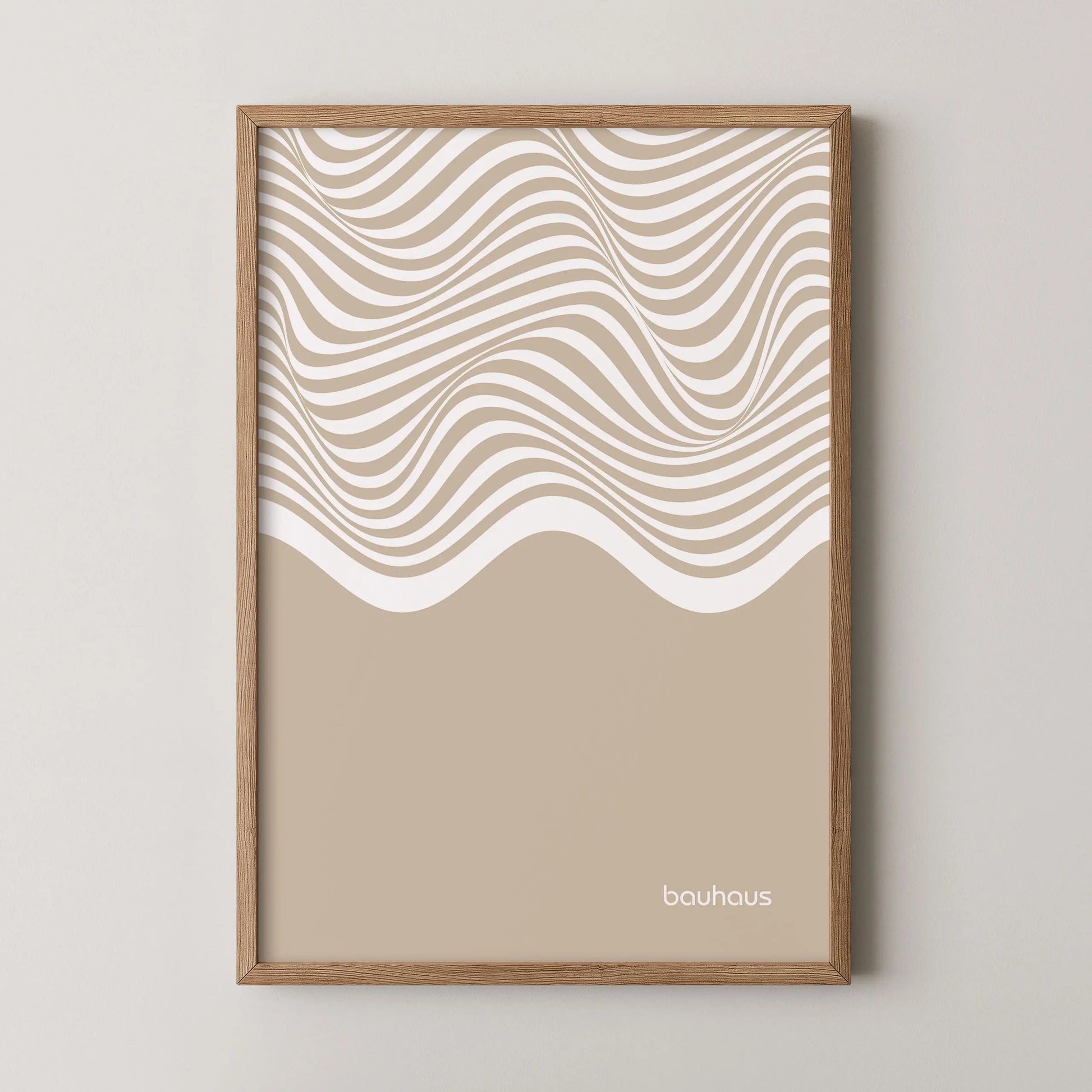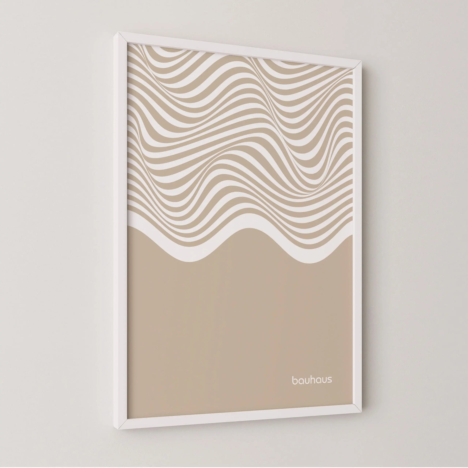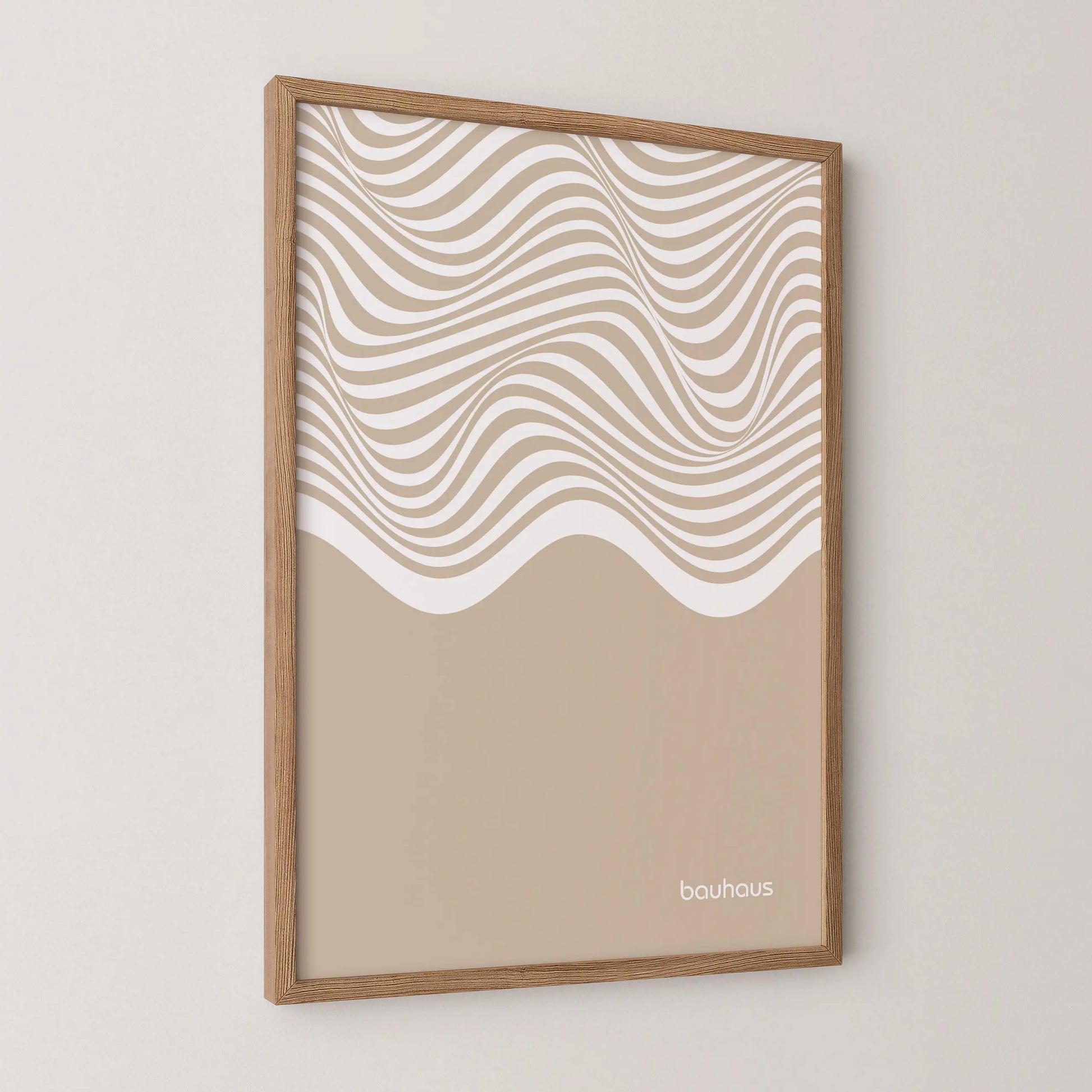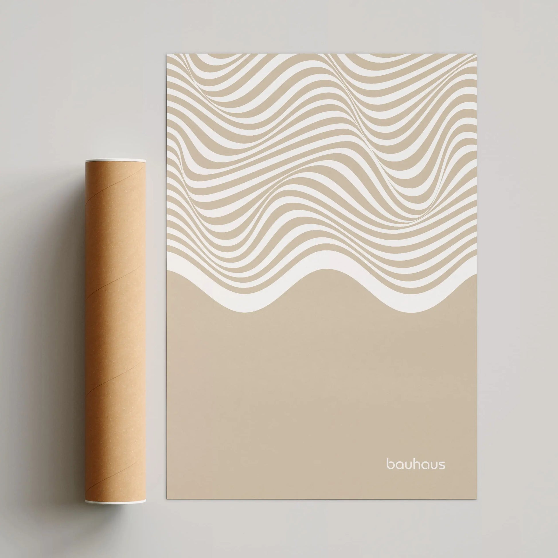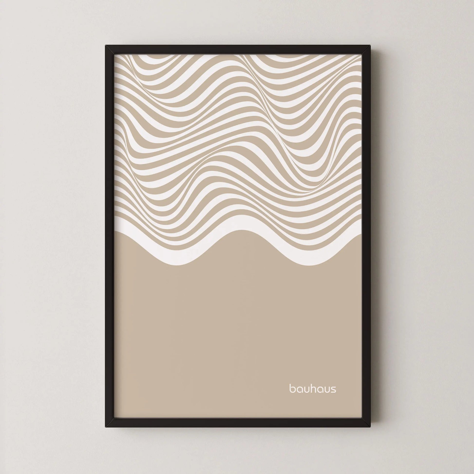 Este cartel Bauhaus está compuesto por líneas onduladas paralelas en contraste, dispuestas horizontalmente y que cubren la parte superior de la composición. Estas líneas forman curvas fluidas y continuas, generando una sensación de movimiento. La parte inferior está ocupada por un plano negro uniforme, creando un contraste marcado entre la zona gráfica dinámica y la superficie sólida.