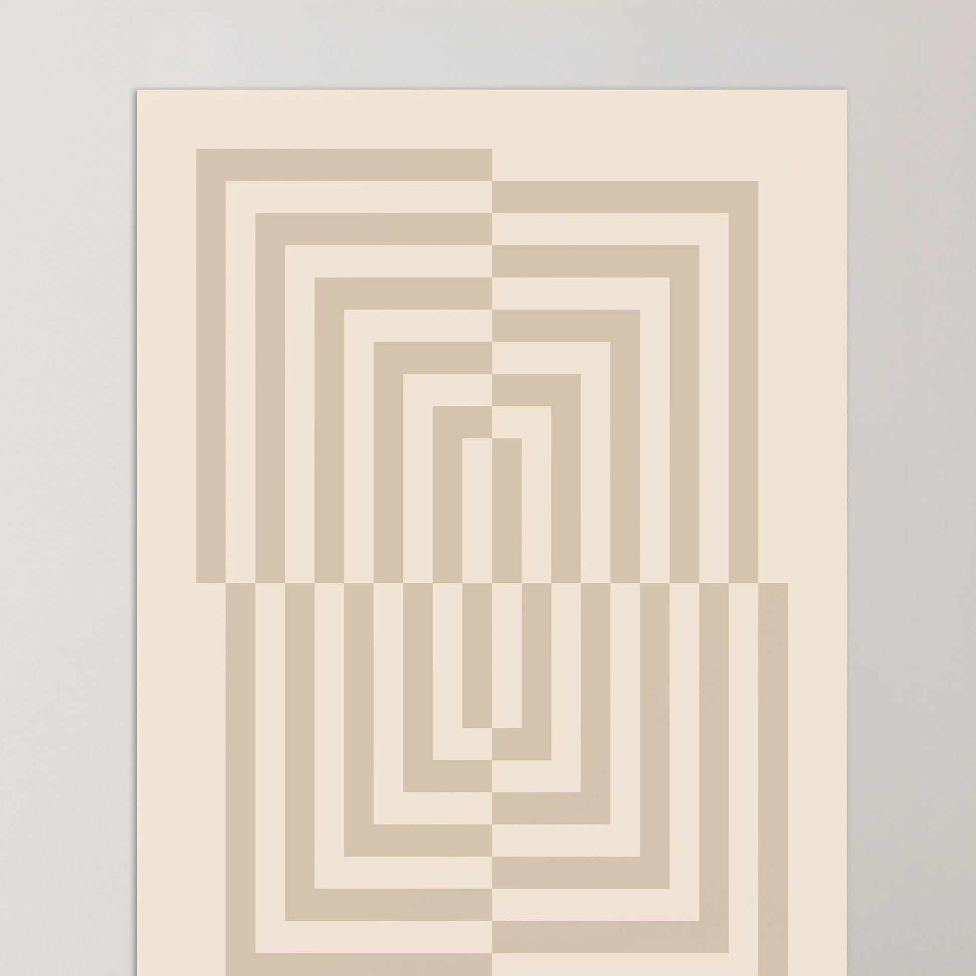 Este cartel geométrico de estilo Bauhaus presenta una repetición modular de formas rectangulares organizadas en cuatro bloques alternados. Las inversiones y los contrastes cromáticos generan una ilusión de profundidad y de movimiento axial. Aunque la composición es bidimensional, evoca un movimiento perceptivo en el que el tiempo se sugiere a través de la forma.