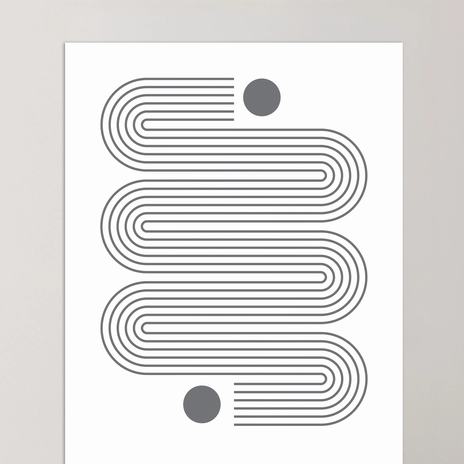 Este póster Bauhaus geométrico y minimalista en color gris está compuesto por dos círculos sólidos conectados por sinuosas curvas paralelas.