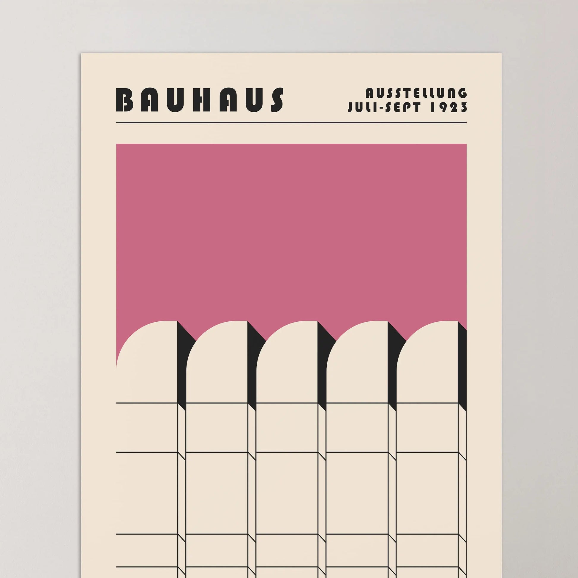 Questo poster rosa del Bauhaus raffigura l'iconico edificio del museo berlinese che ospita gli archivi della scuola Bauhaus su uno sfondo beige.