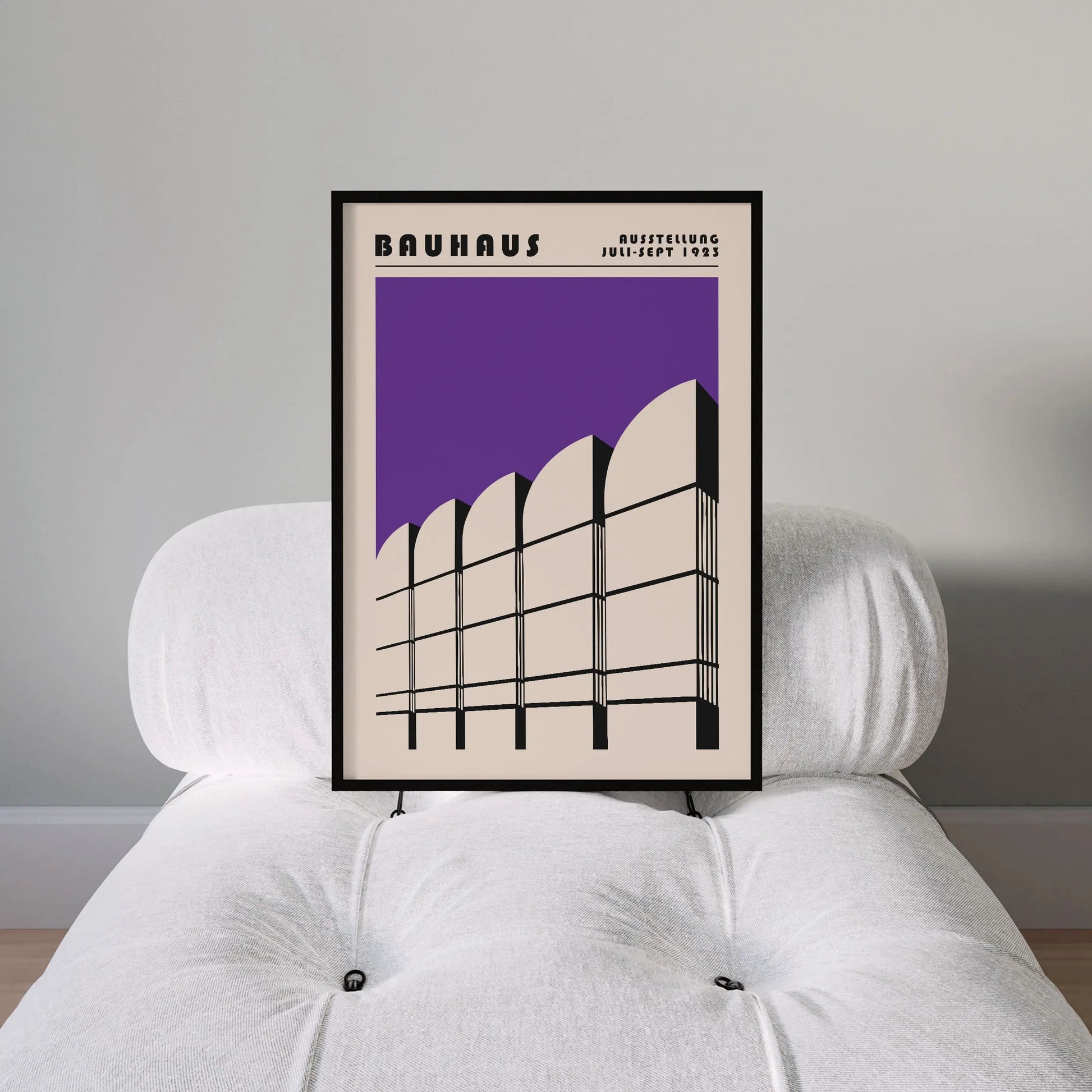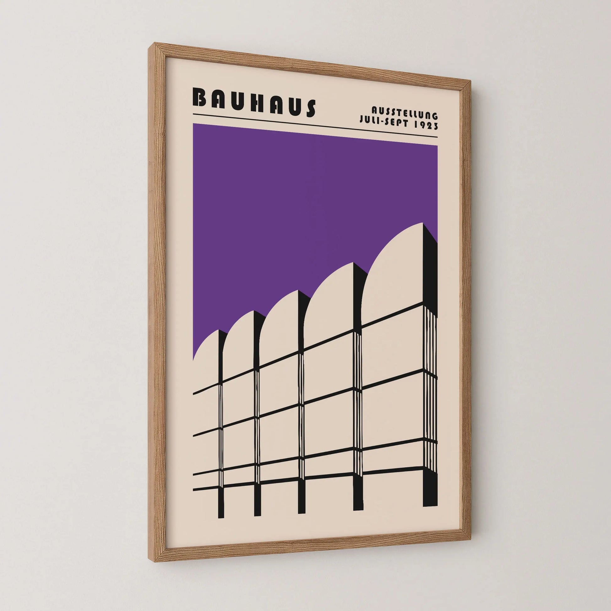 Questo poster viola del Bauhaus raffigura l'iconico edificio del museo berlinese che ospita gli archivi della scuola Bauhaus su uno sfondo beige.
