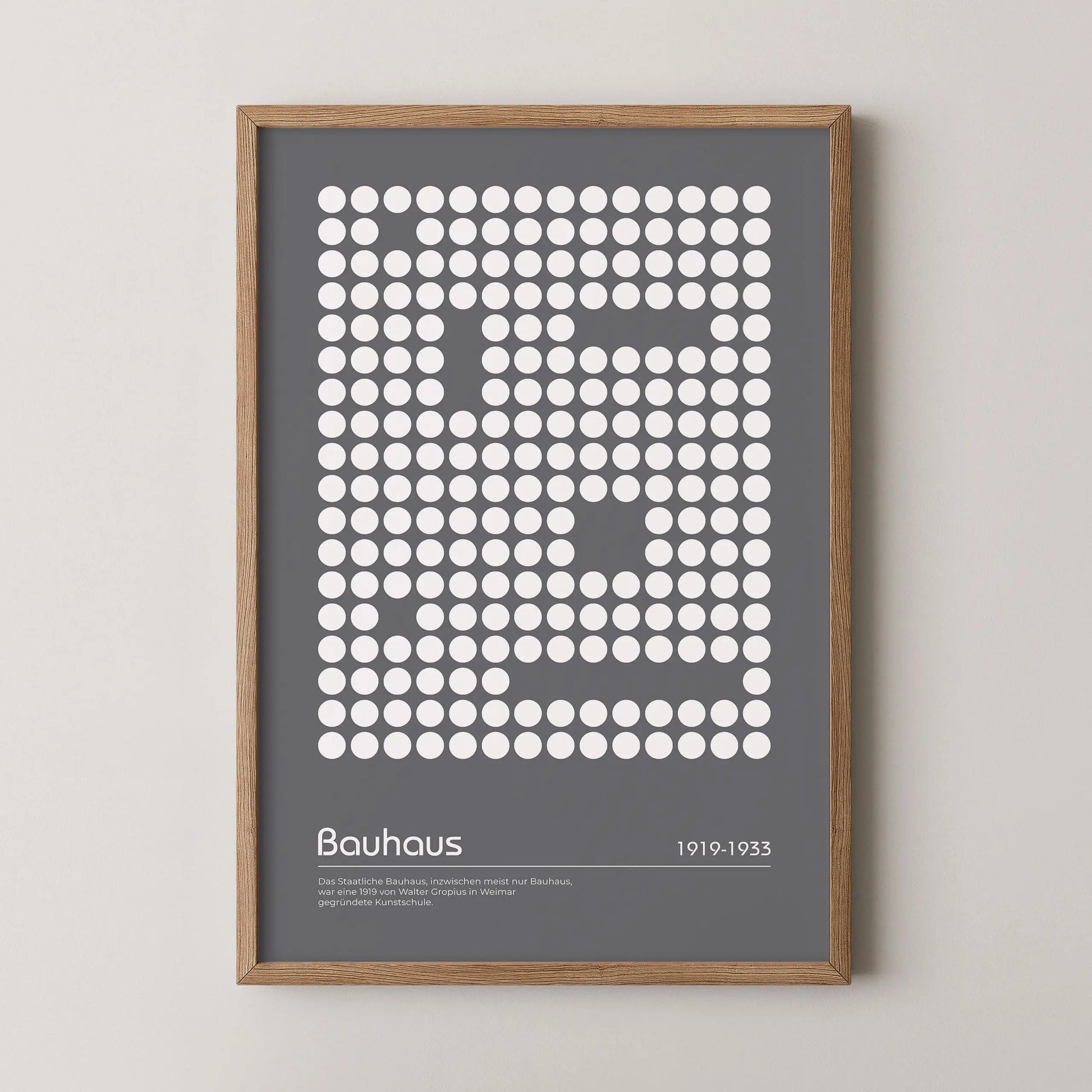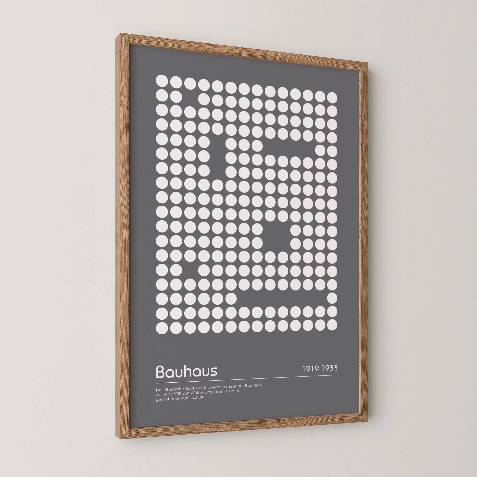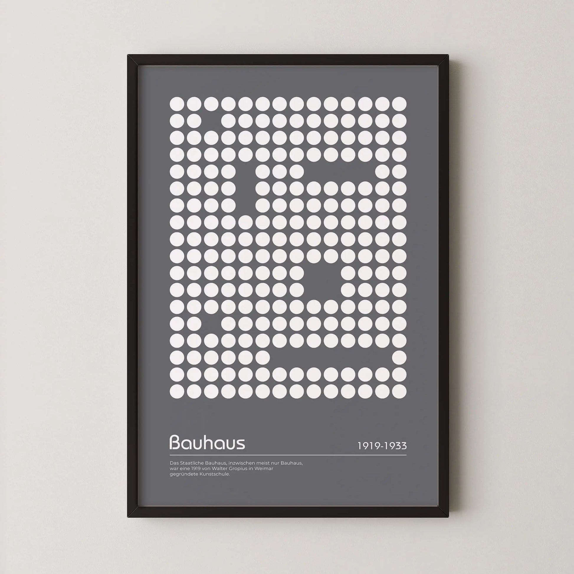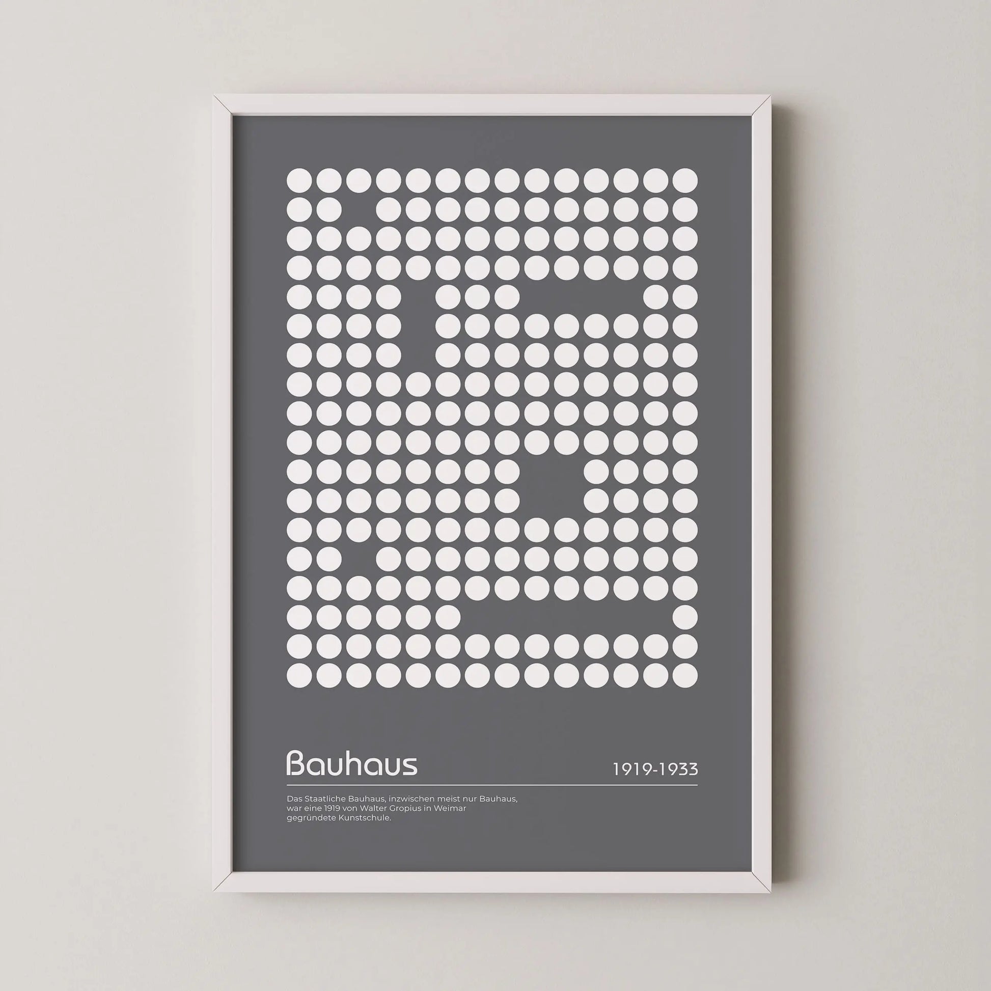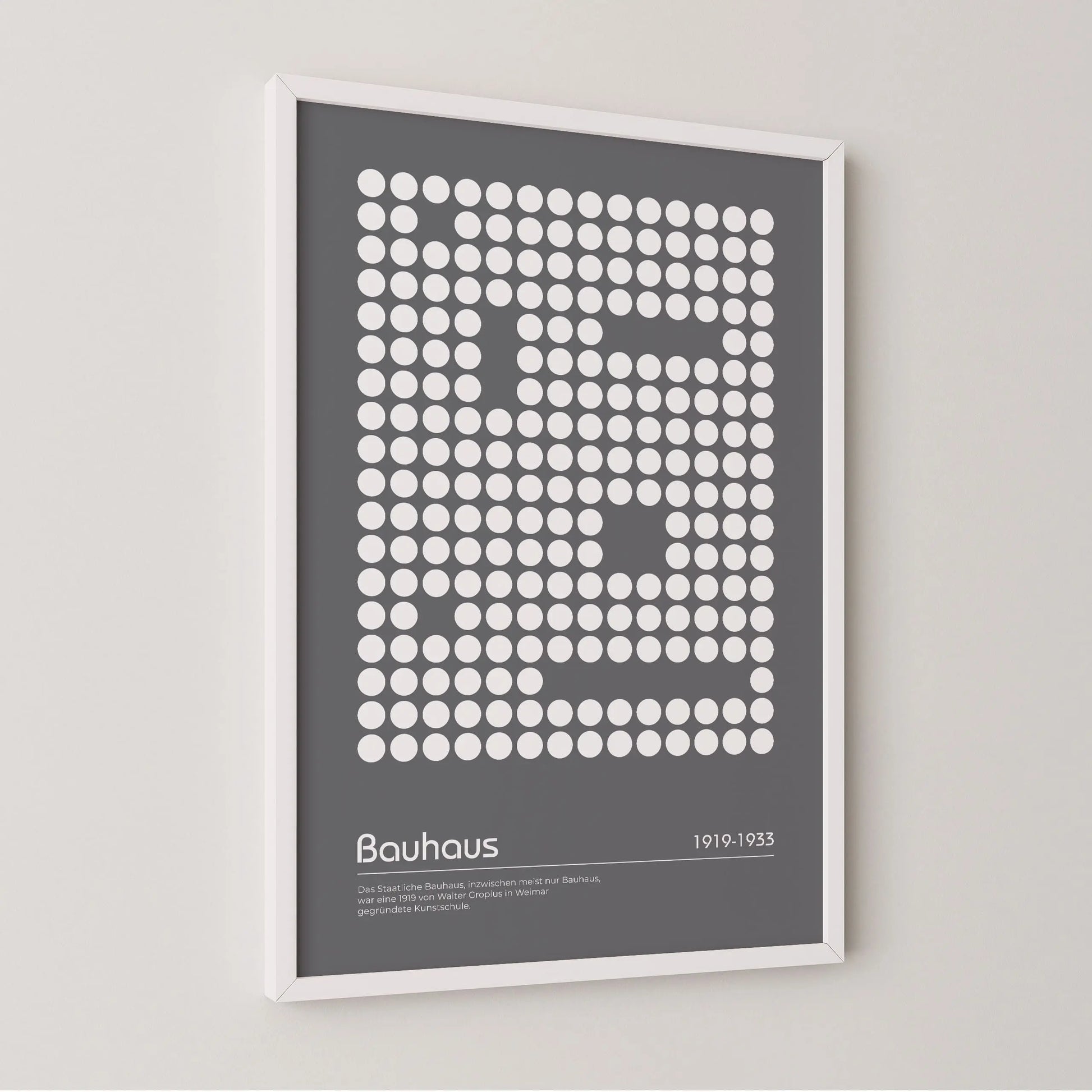 Questo manifesto La geometria Bauhaus rappresenta un motivo traforato ripetuto composto da punti bianchi su uno sfondo grigio.