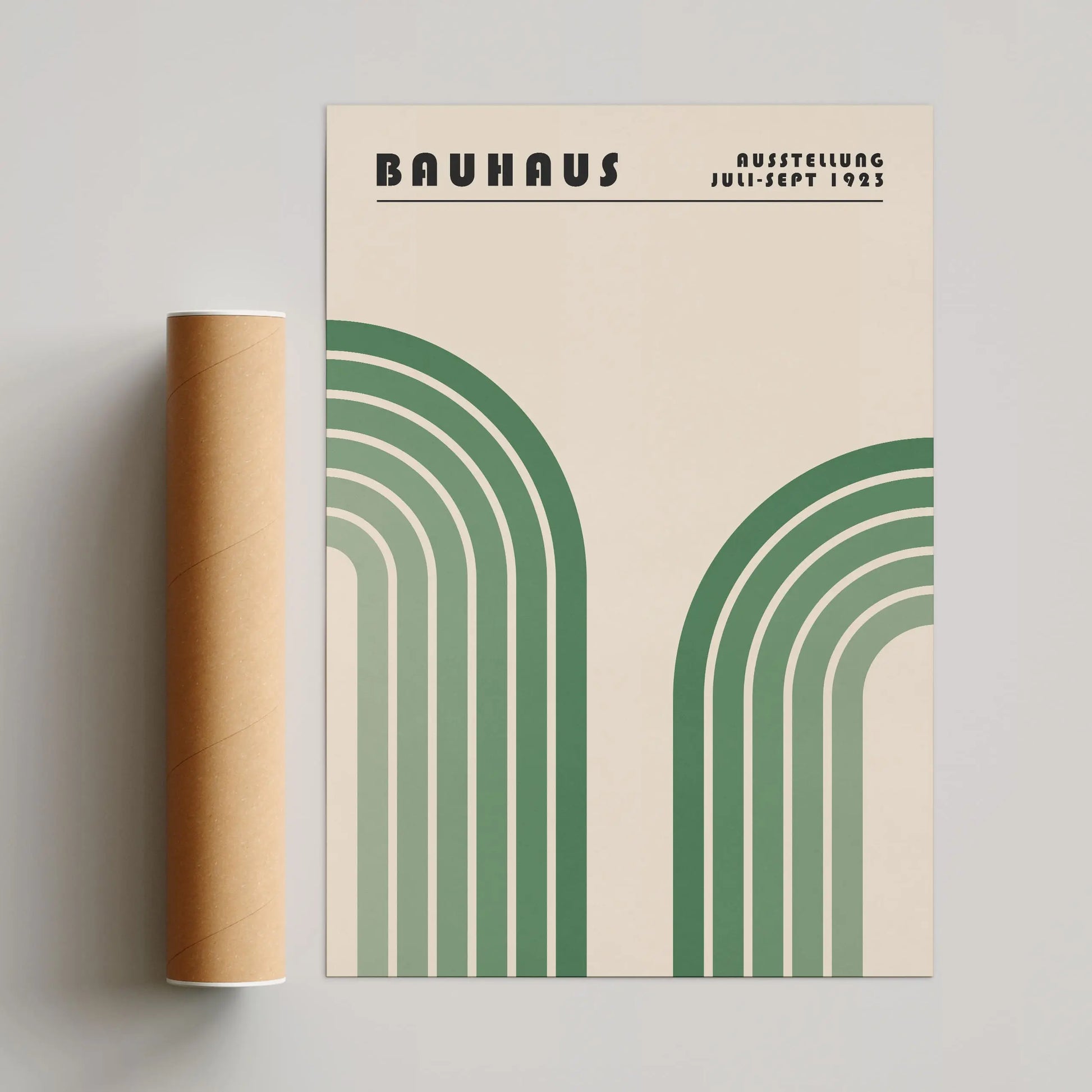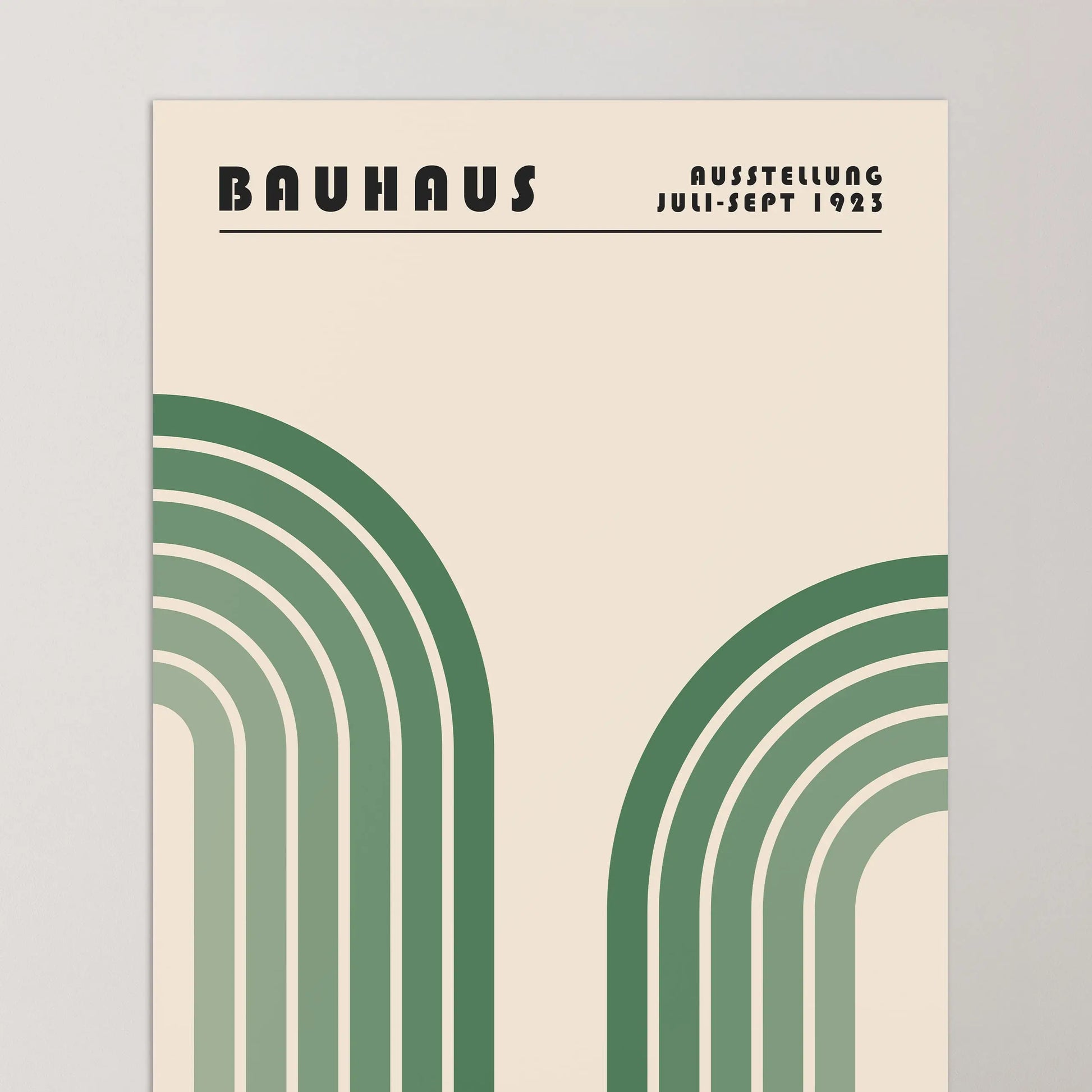 Questo poster grafico vintage in stile Bauhaus presenta due forme arcuate monumentali, disposte simmetricamente a sinistra e a destra, evocando archi stilizzati. Ciascuna forma è composta da bande concentriche con toni progressivamente sfumati, dal più scuro al più chiaro, creando un ritmo visivo marcato e una sensazione di profondità.