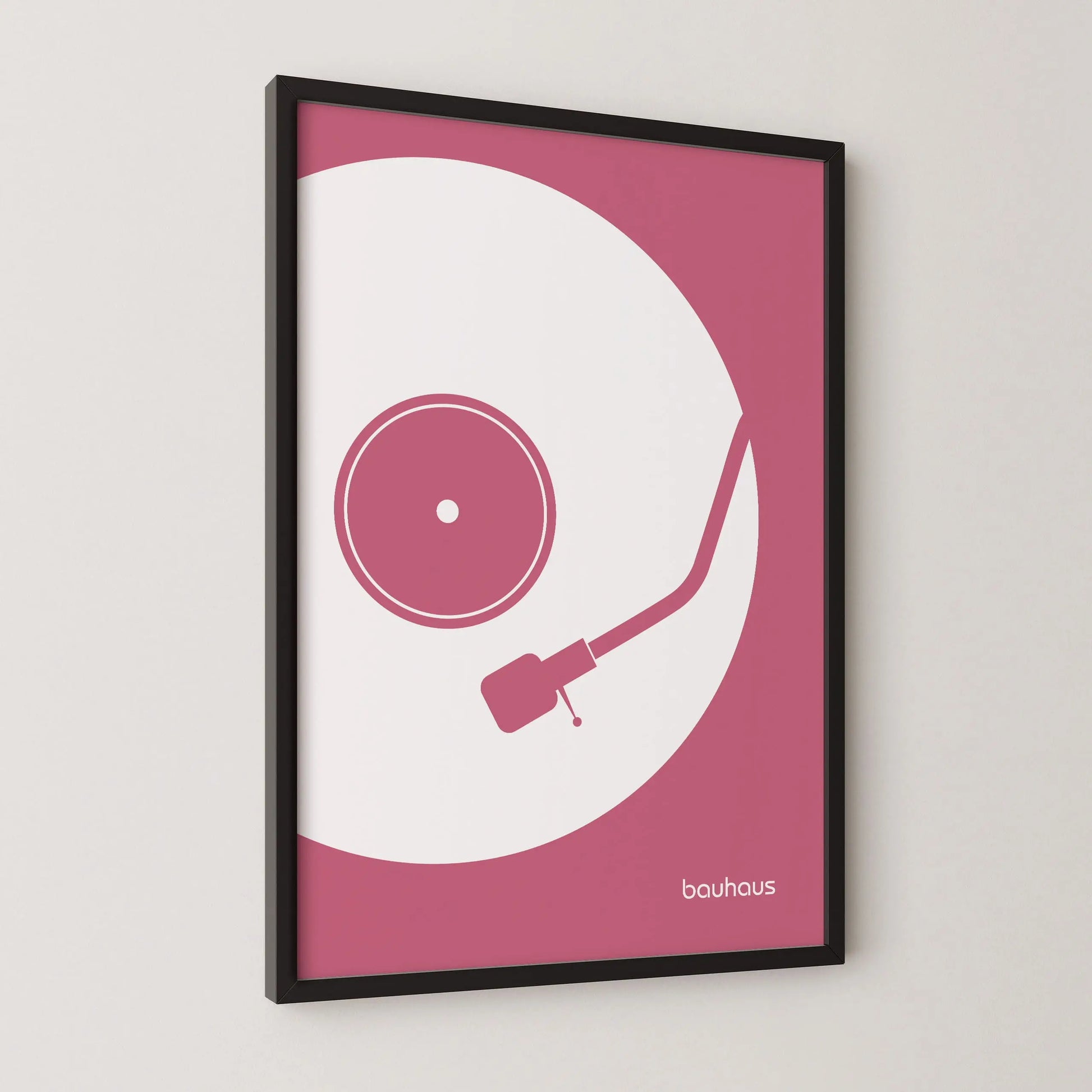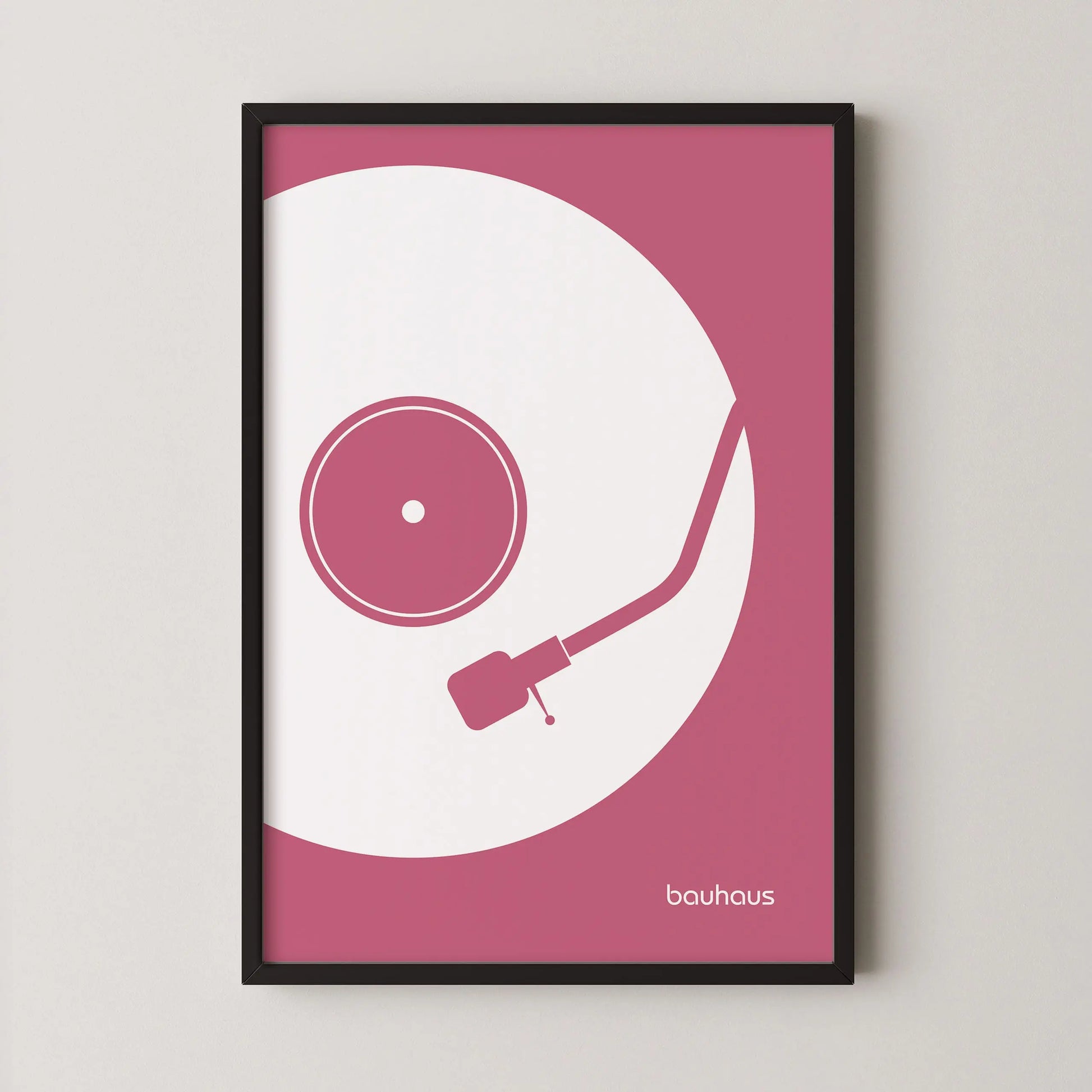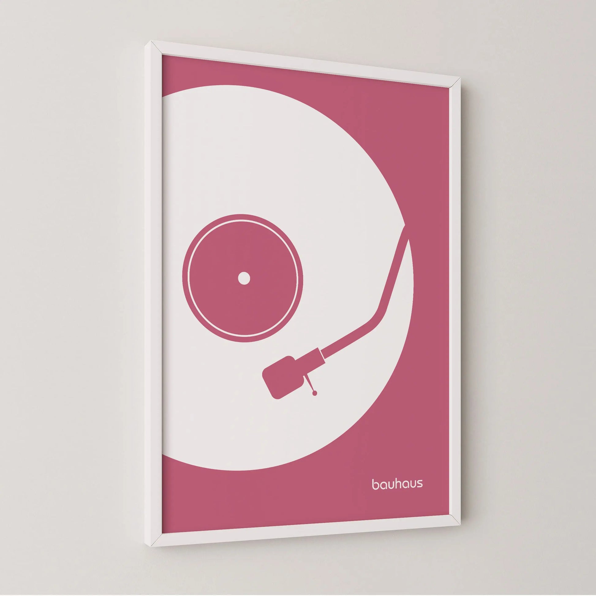 Questo manifesto vintage in stile Bauhaus presenta una forma circolare parzialmente decentrata verso sinistra, creando uno squilibrio visivo controllato. Linee angolari prolungano questa forma verso destra, delineando un braccio che struttura la composizione e guida lo sguardo. Il gioco di contrasti tra superfici piene, vuoti e tratti lineari compone una rappresentazione stilizzata di un grammofono.