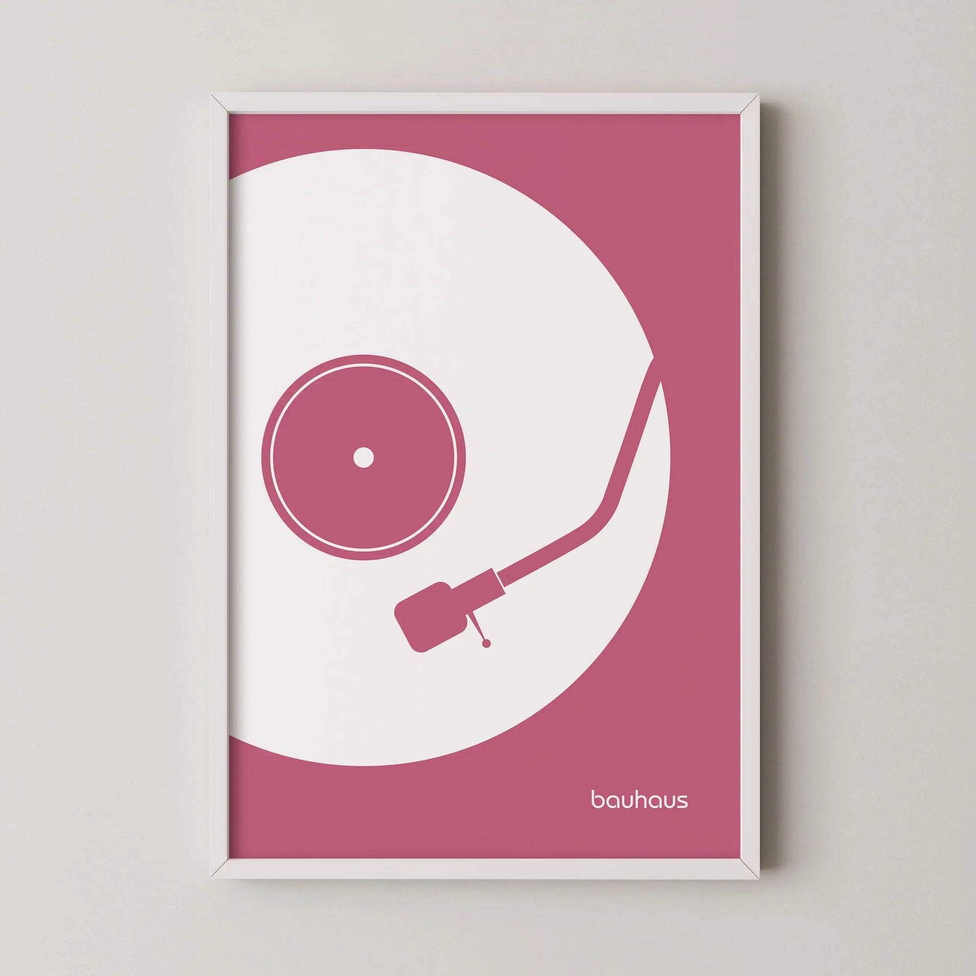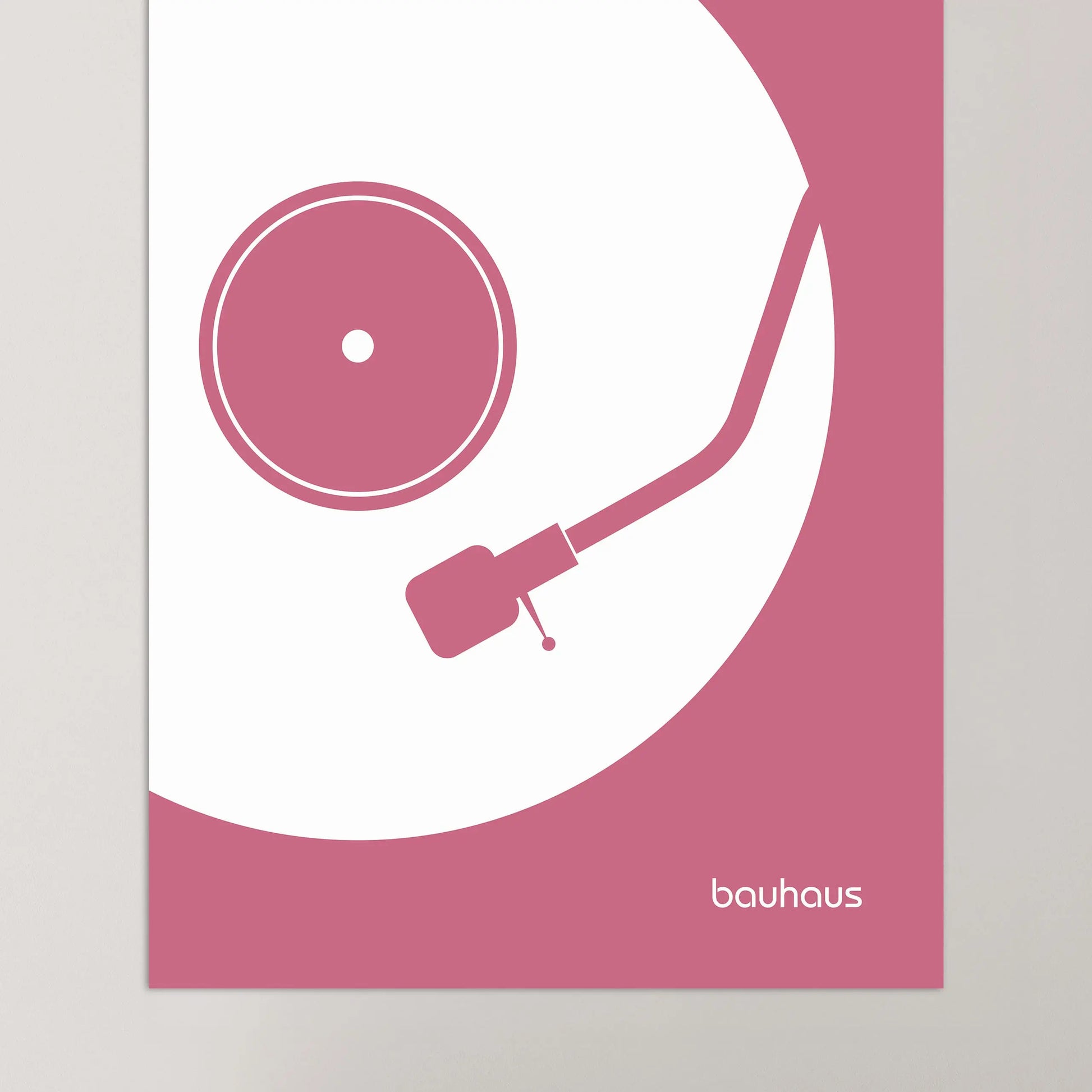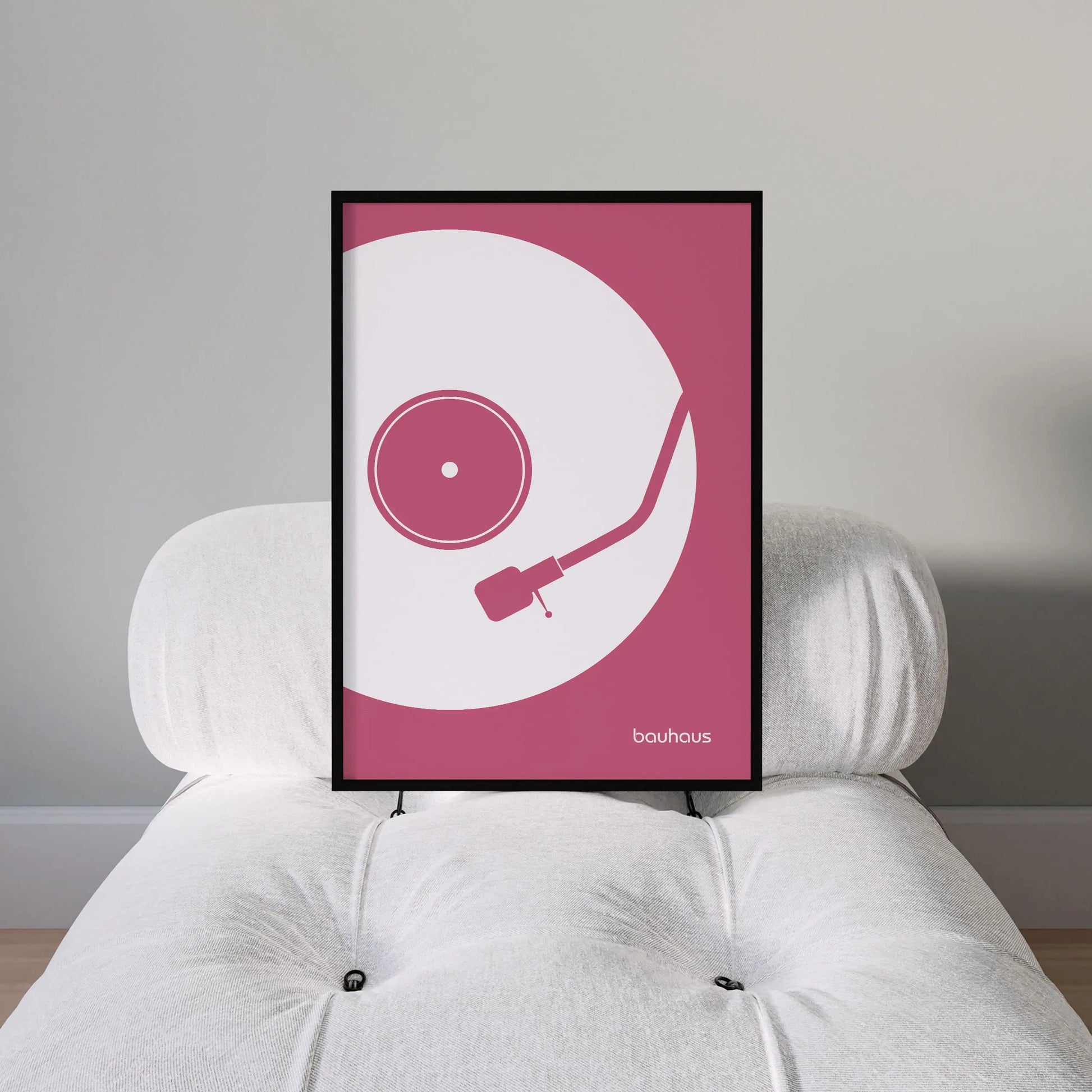 Questo manifesto vintage in stile Bauhaus presenta una forma circolare parzialmente decentrata verso sinistra, creando uno squilibrio visivo controllato. Linee angolari prolungano questa forma verso destra, delineando un braccio che struttura la composizione e guida lo sguardo. Il gioco di contrasti tra superfici piene, vuoti e tratti lineari compone una rappresentazione stilizzata di un grammofono.