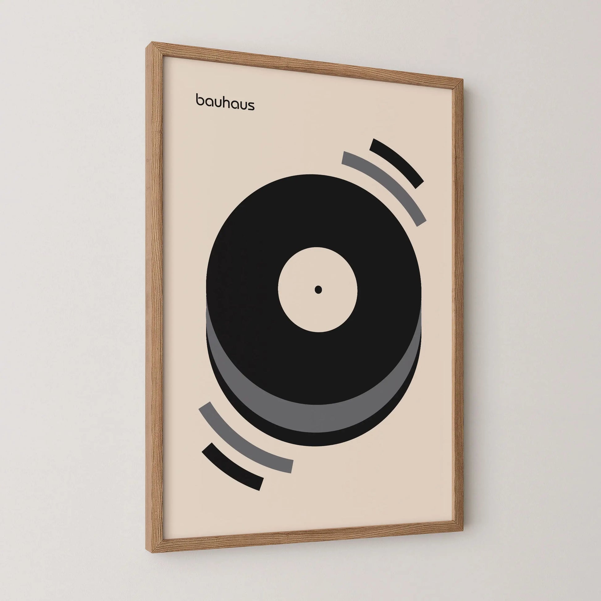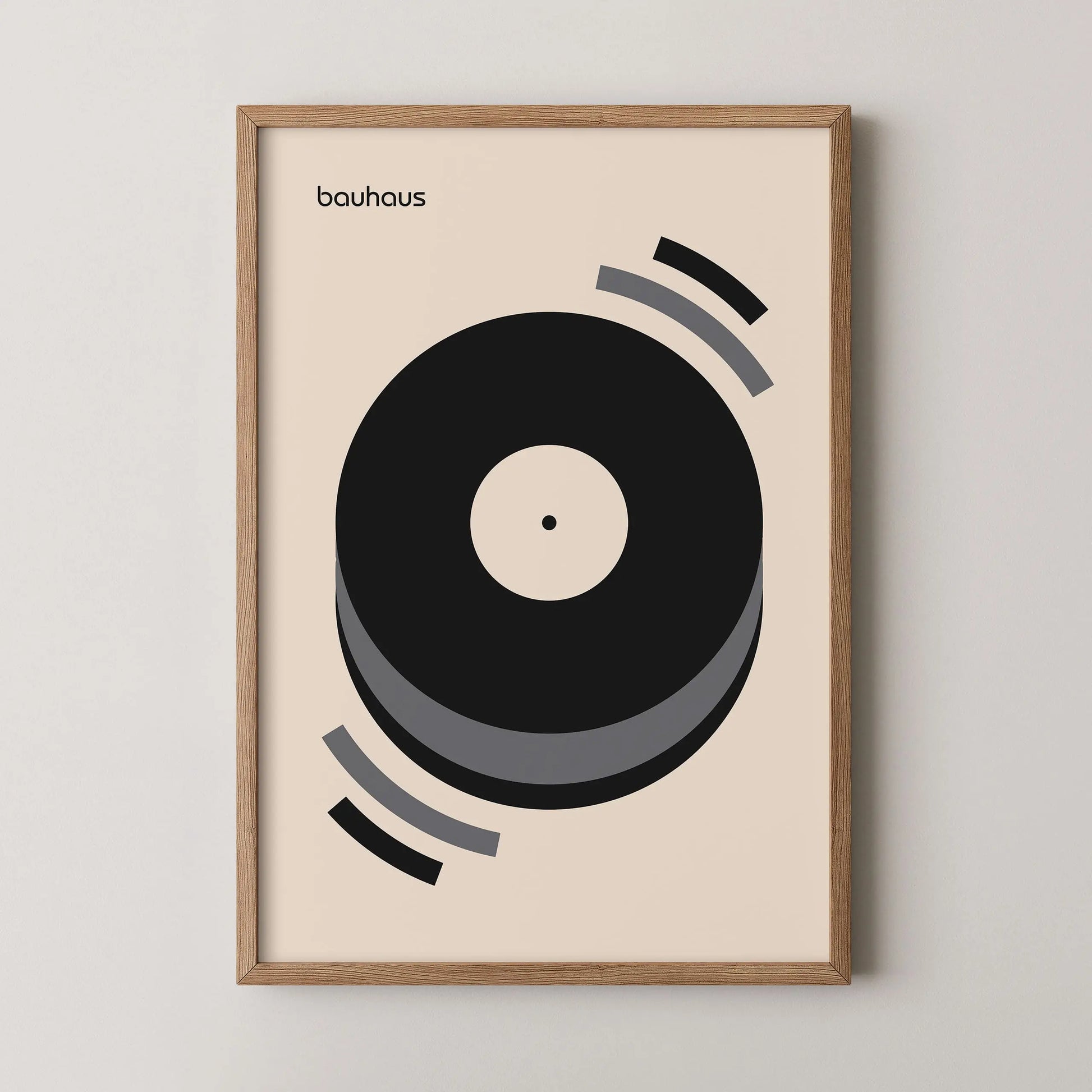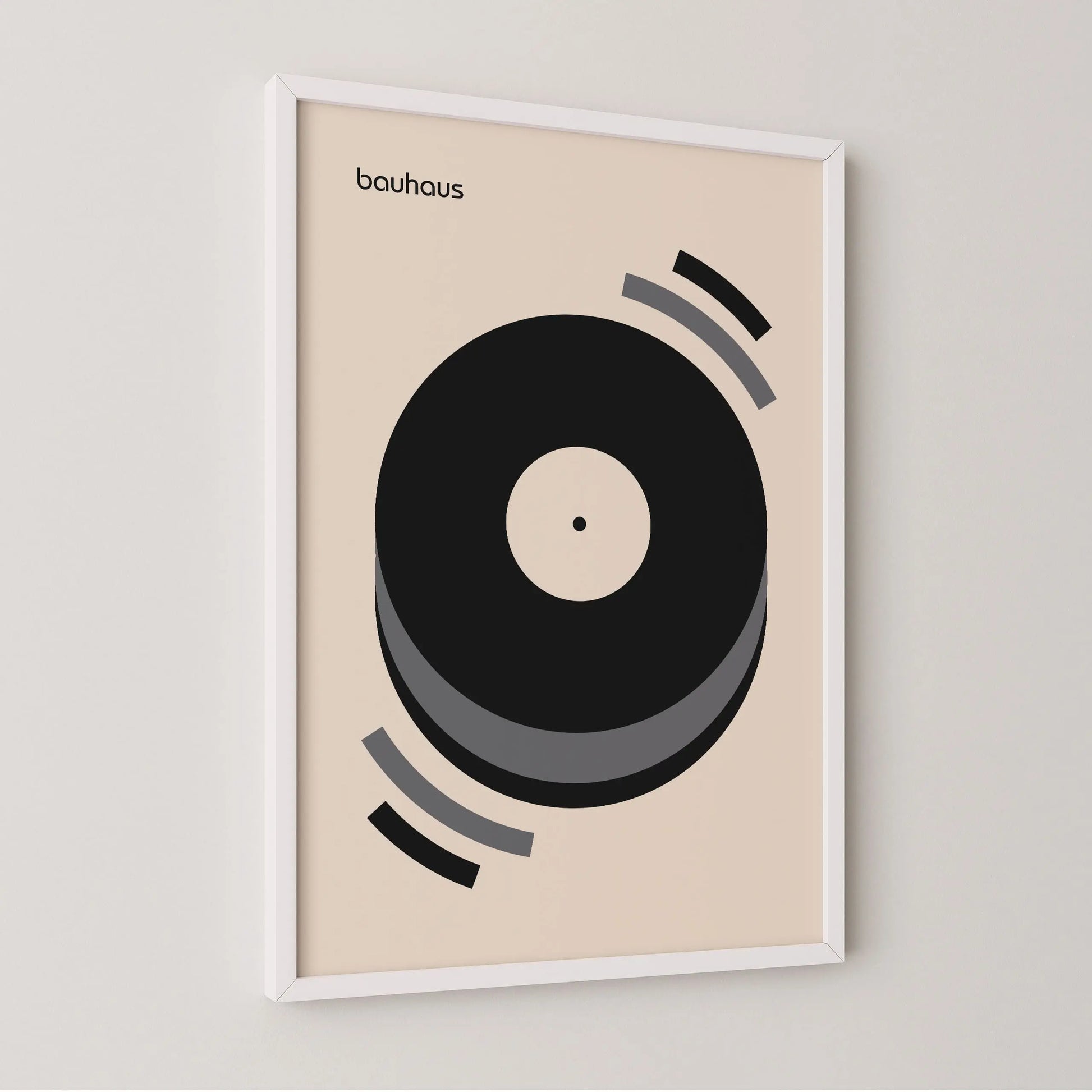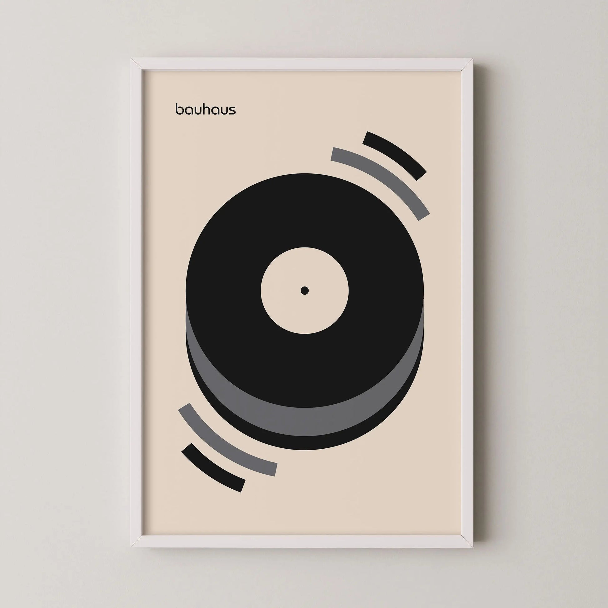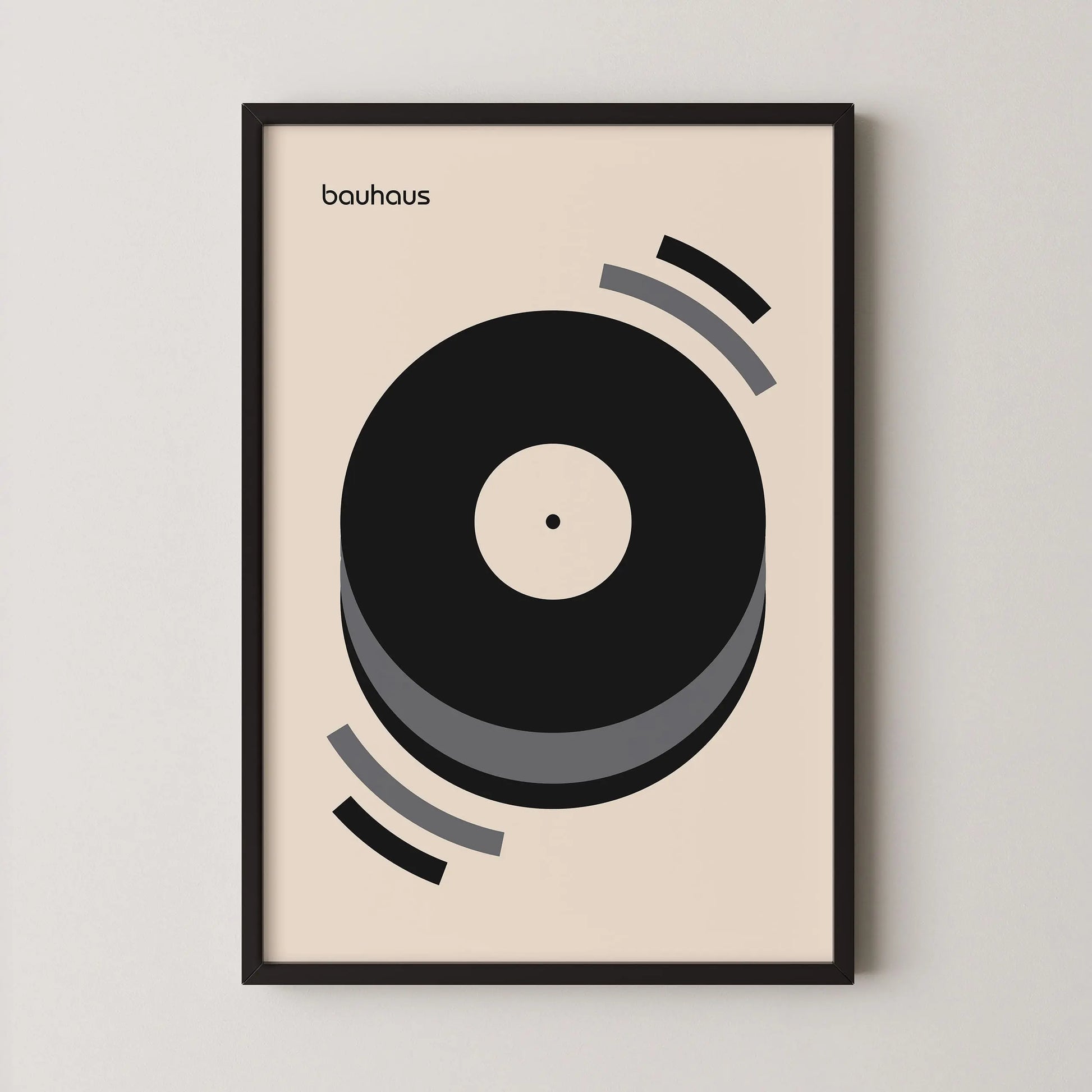 Questo poster grafico vintage Bauhaus di colore grigio raffigura un disco in vinile in riproduzione su uno sfondo beige.