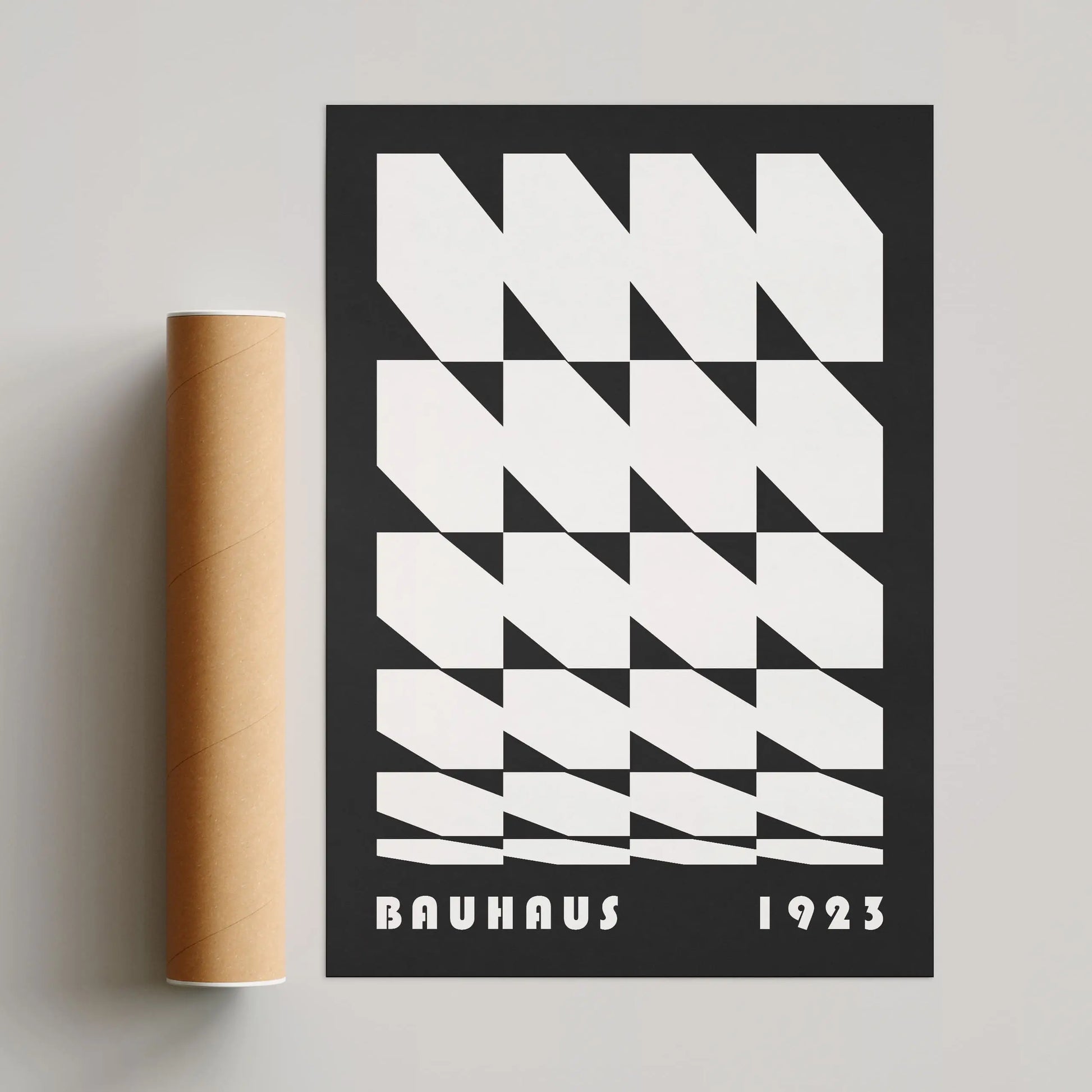 Questo manifesto Bauhaus bianco d'epoca consiste nella ripetizione di motivi esagonali distorti di dimensioni decrescenti su uno sfondo nero.