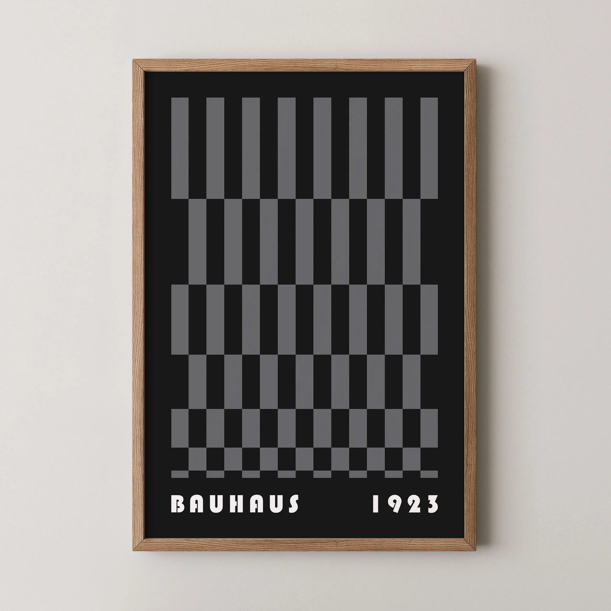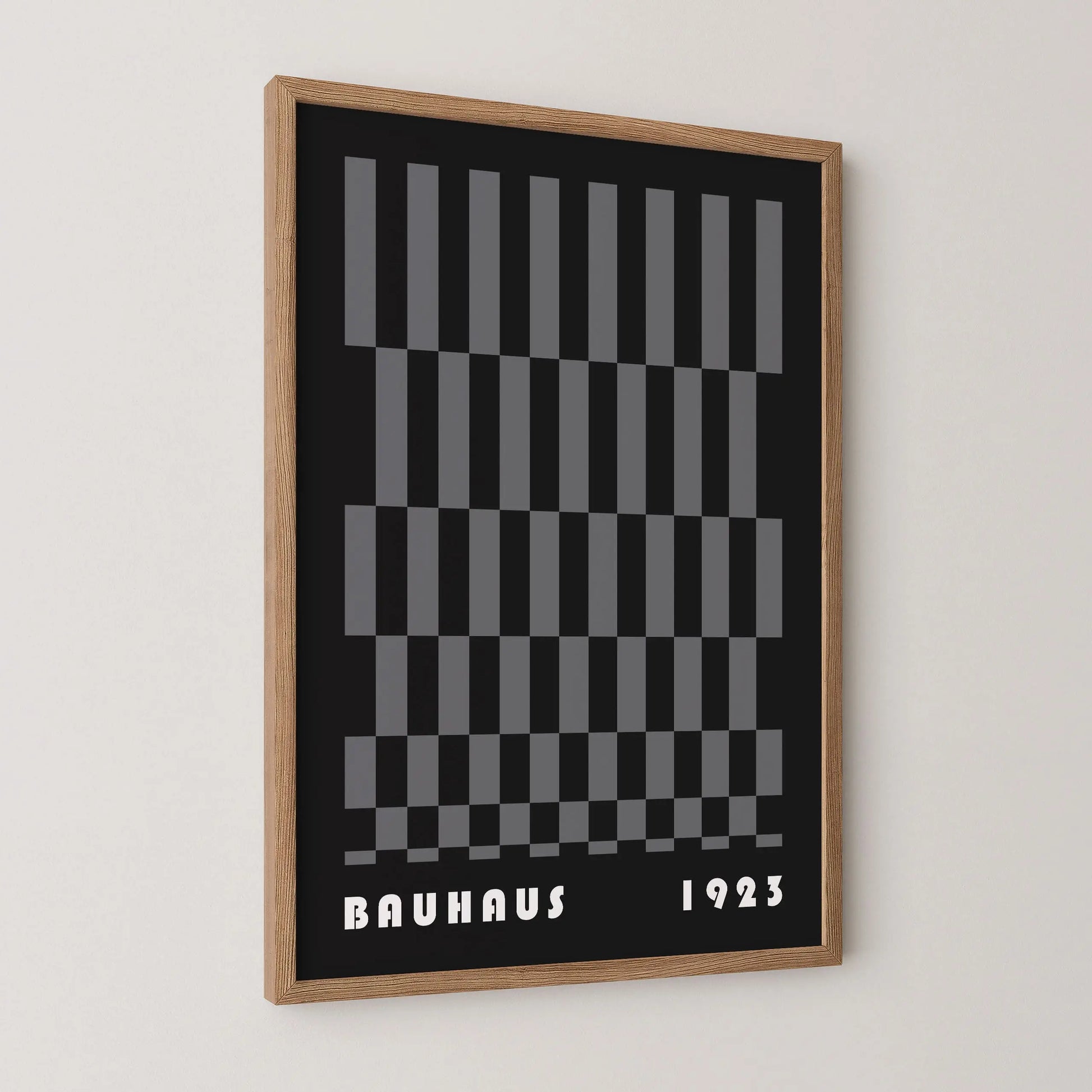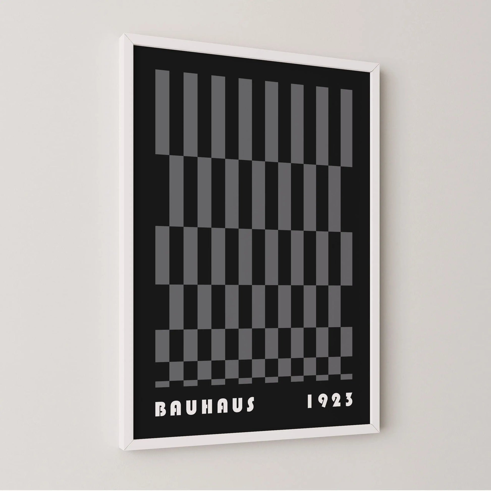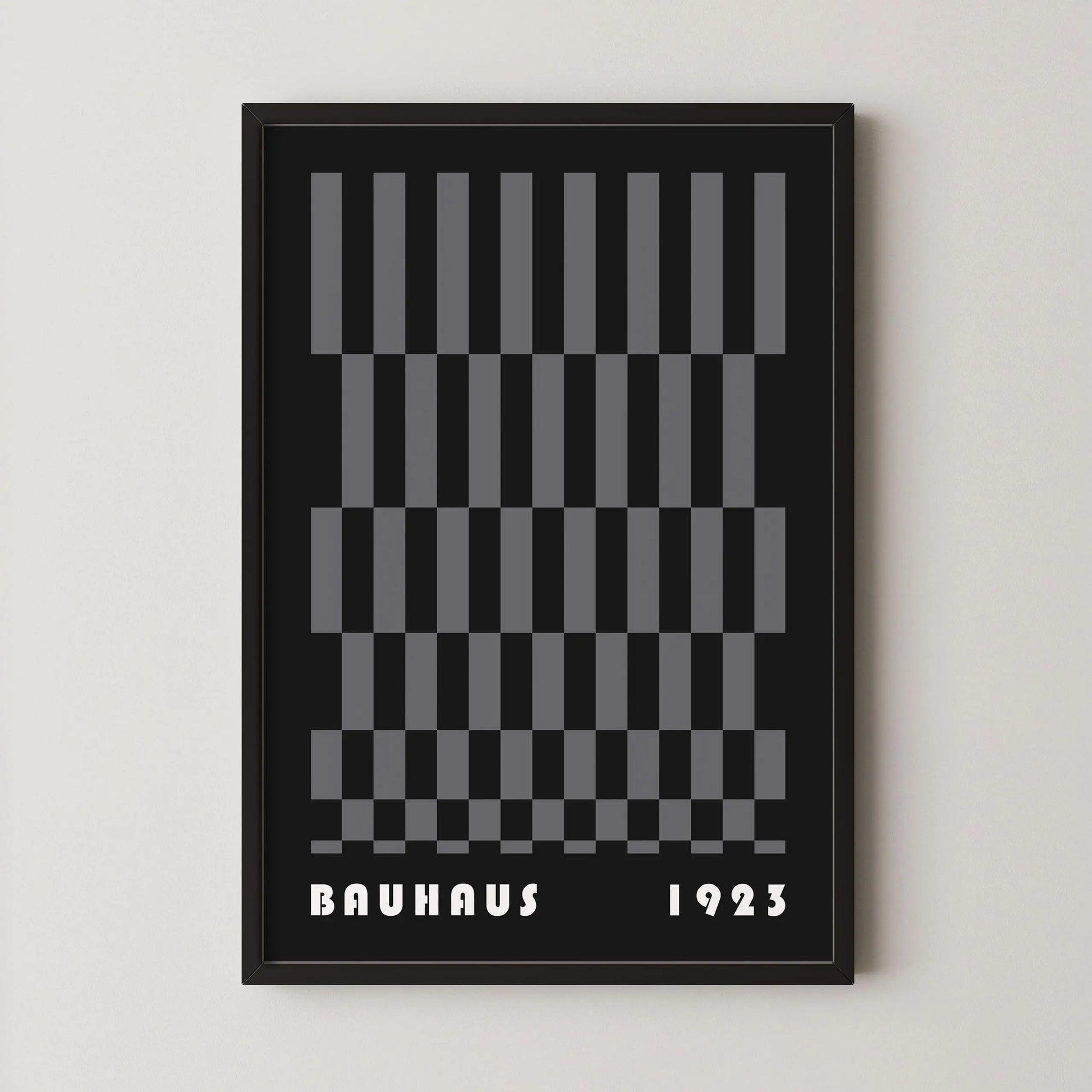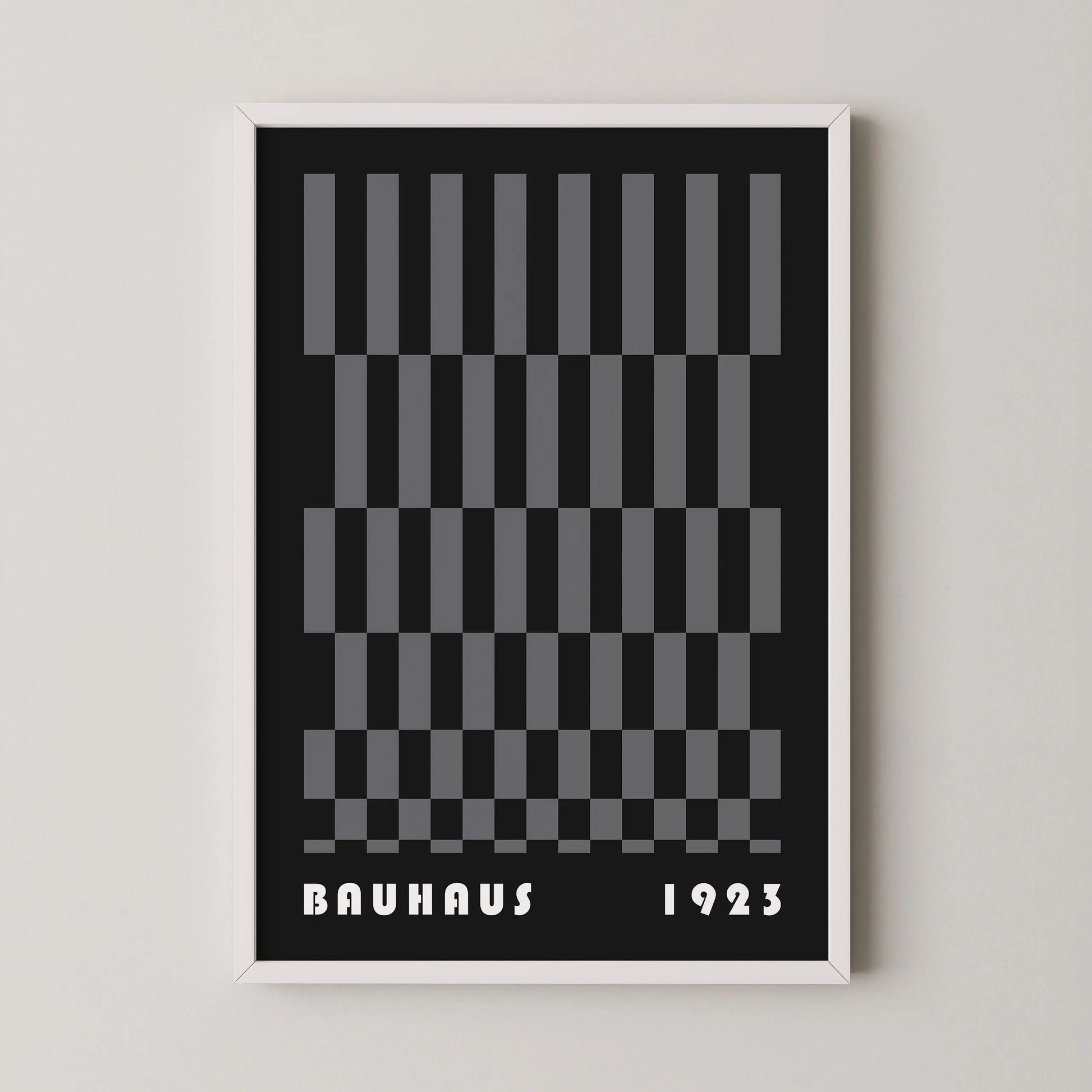 Questo manifesto colore grigio vintage Bauhaus consiste nella ripetizione di motivi rettangolari di dimensioni decrescenti su uno sfondo nero.