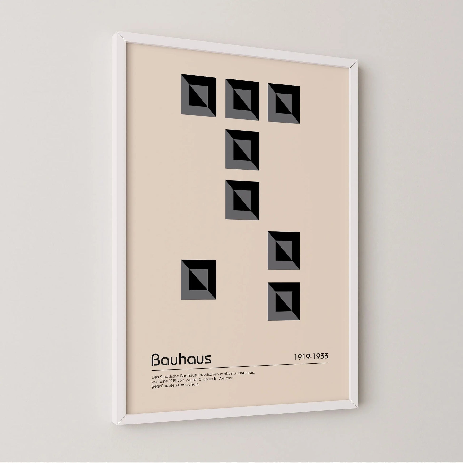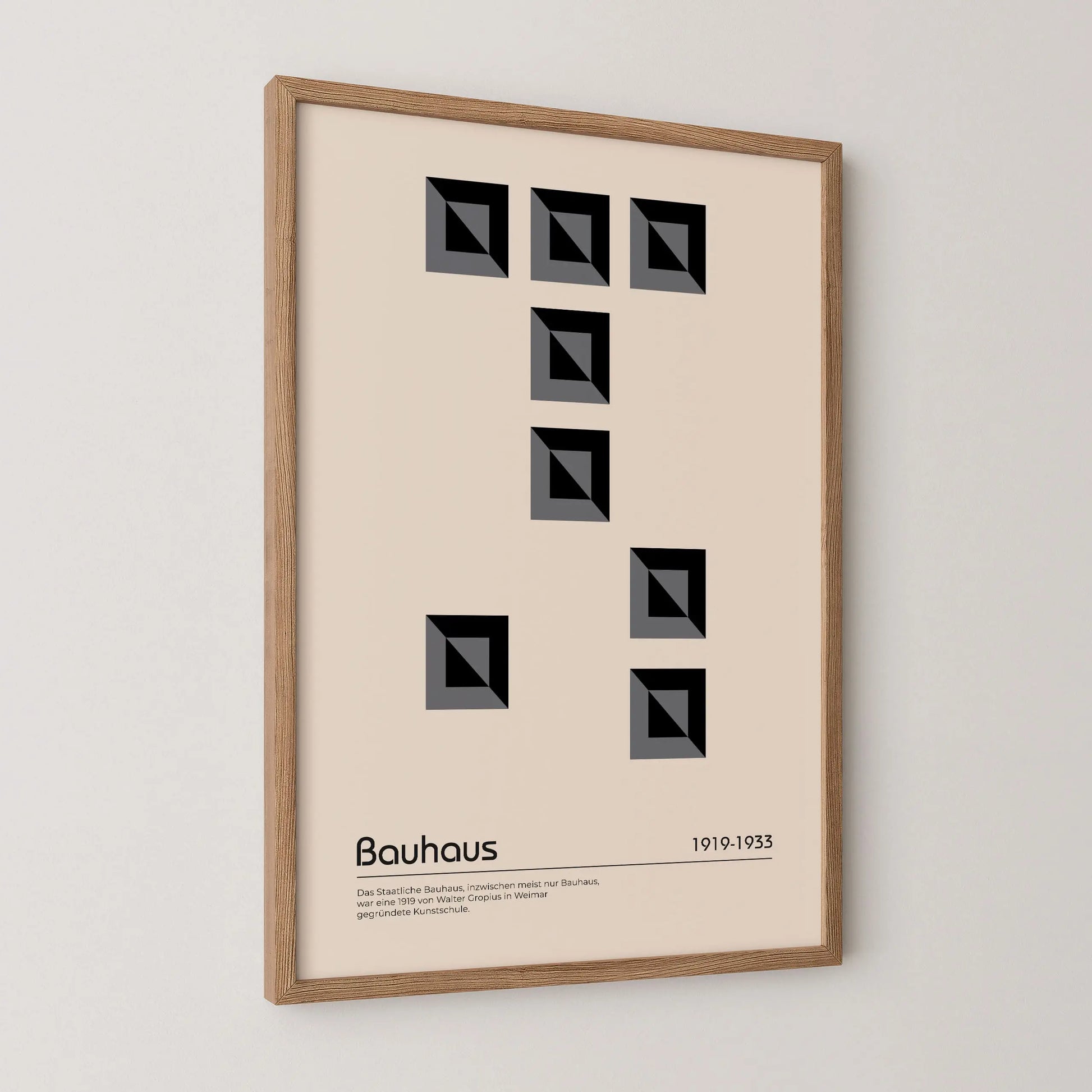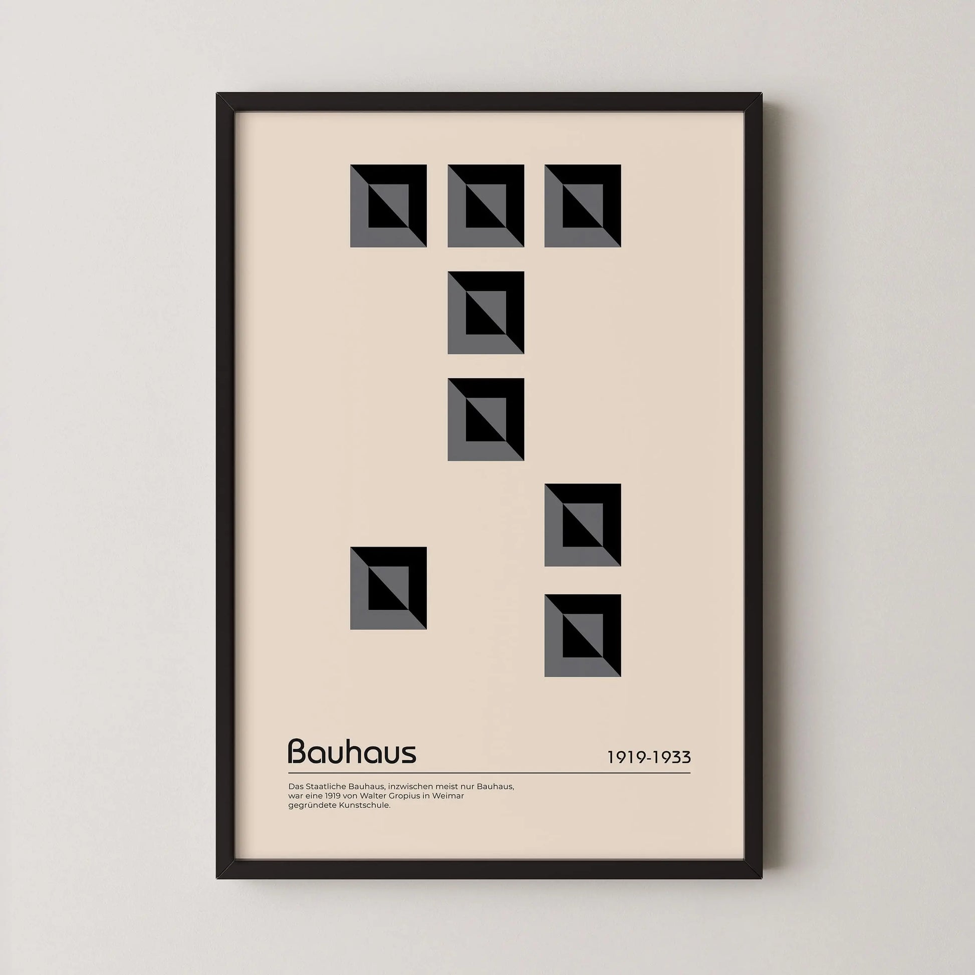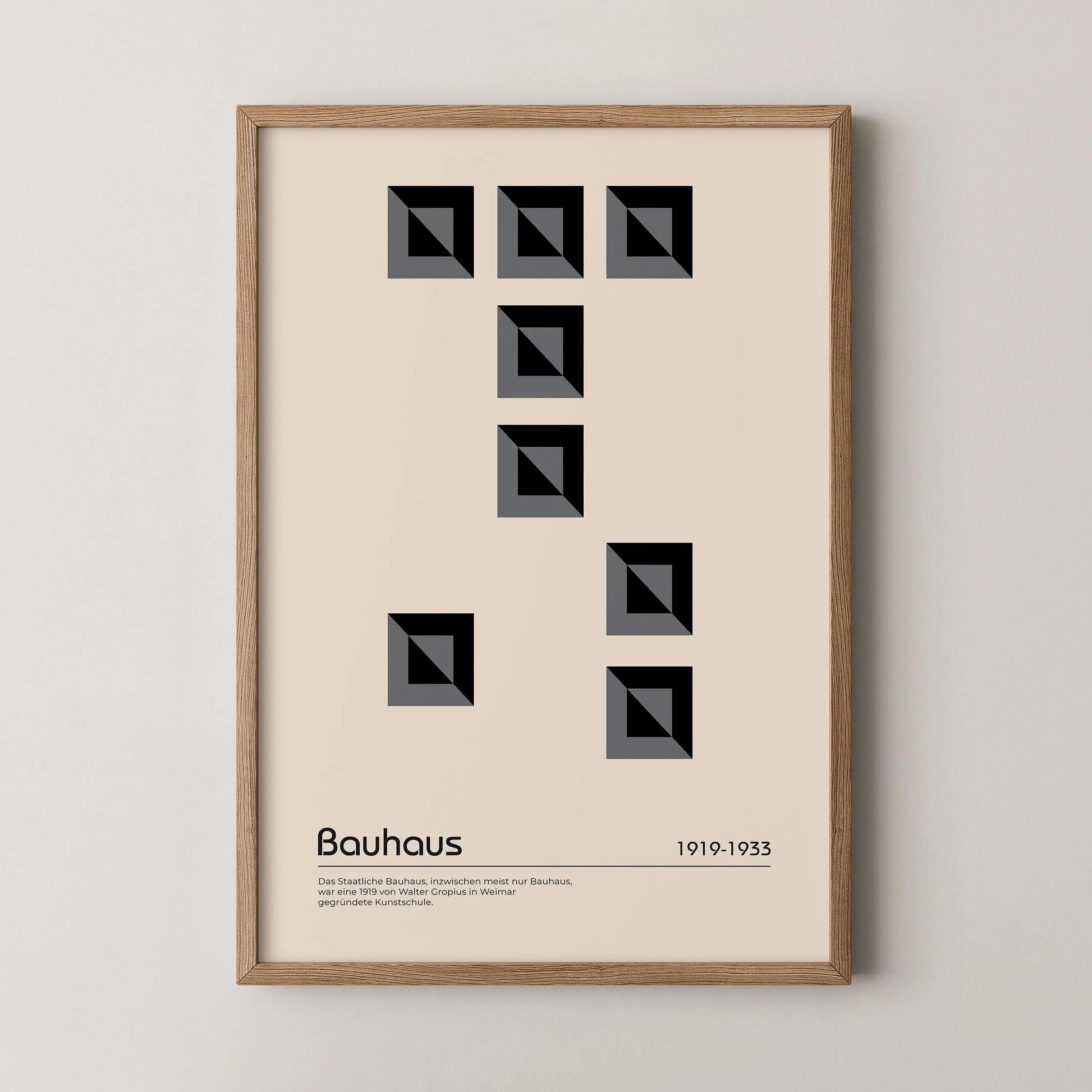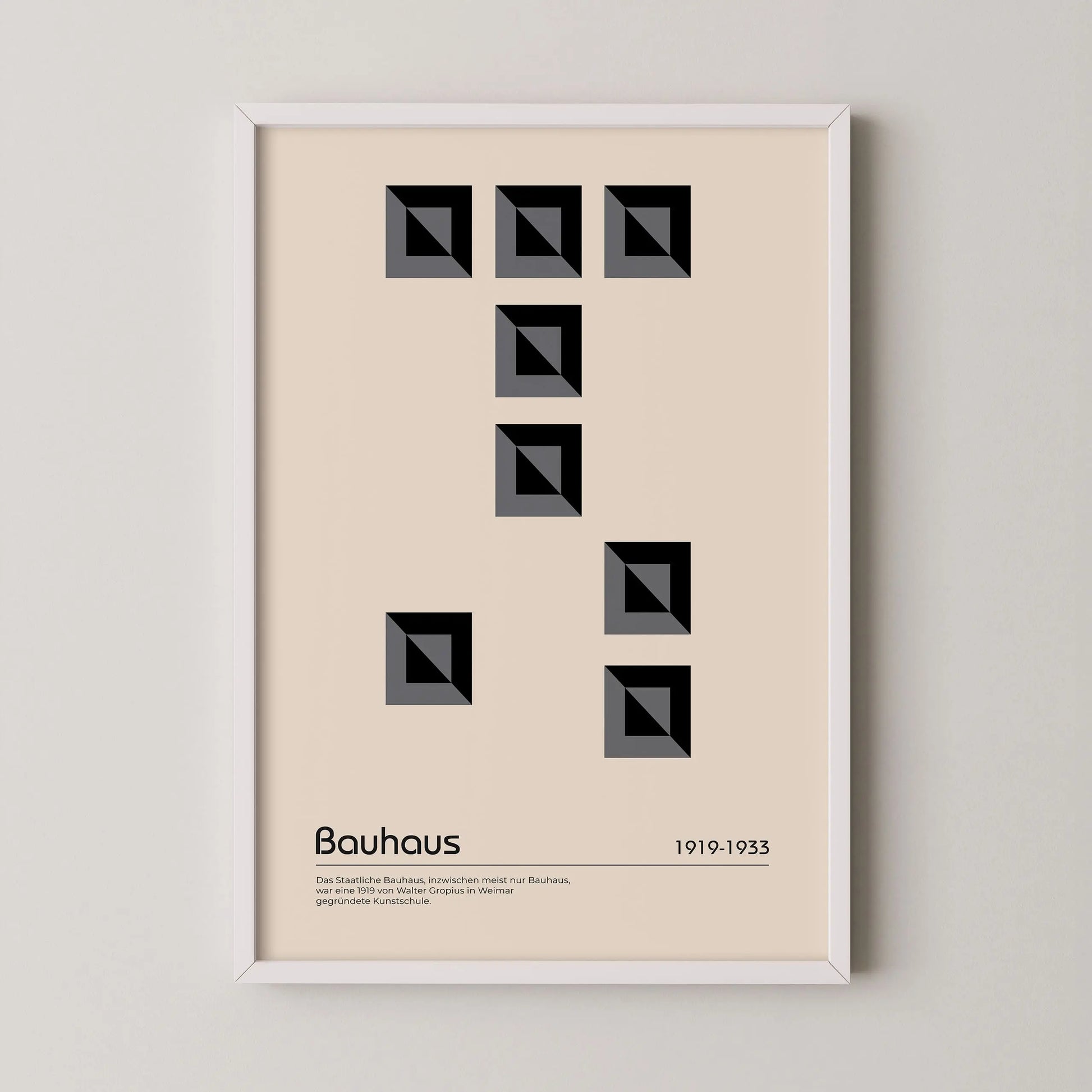 Questo manifesto Bauhaus grigio raffigura dei quadrati evidenziati da un gioco di contrasti e distribuiti in modo casuale su uno sfondo beige.