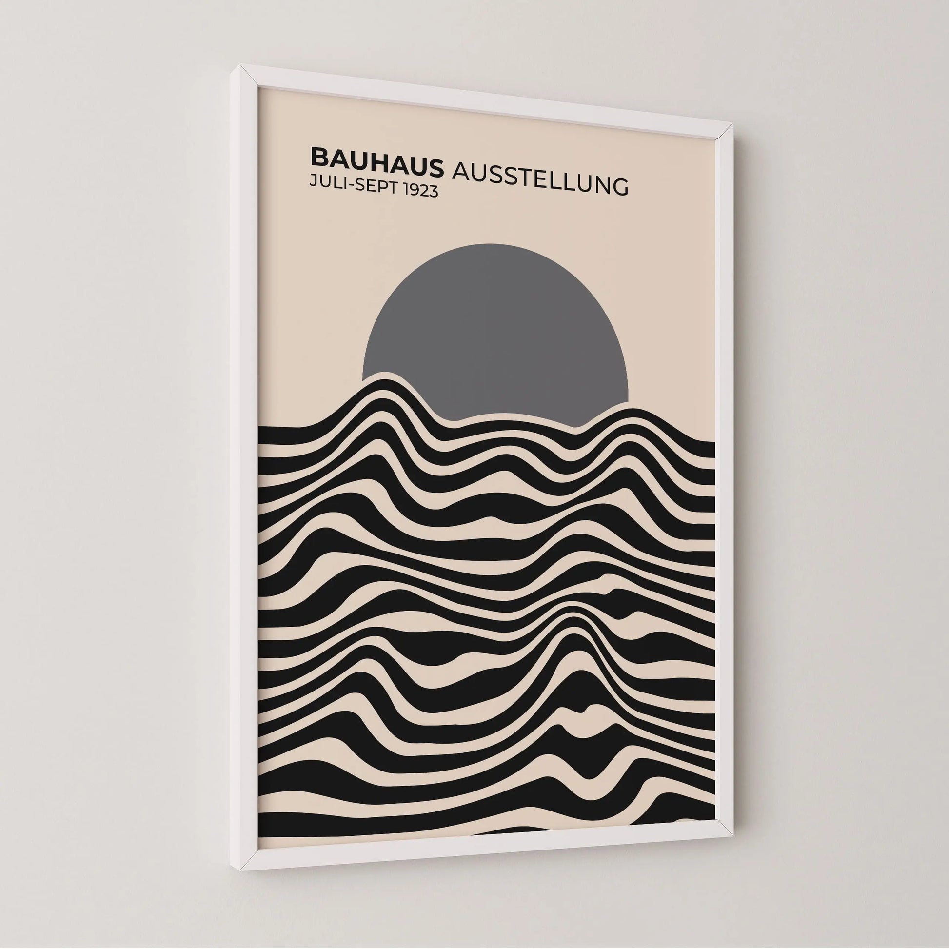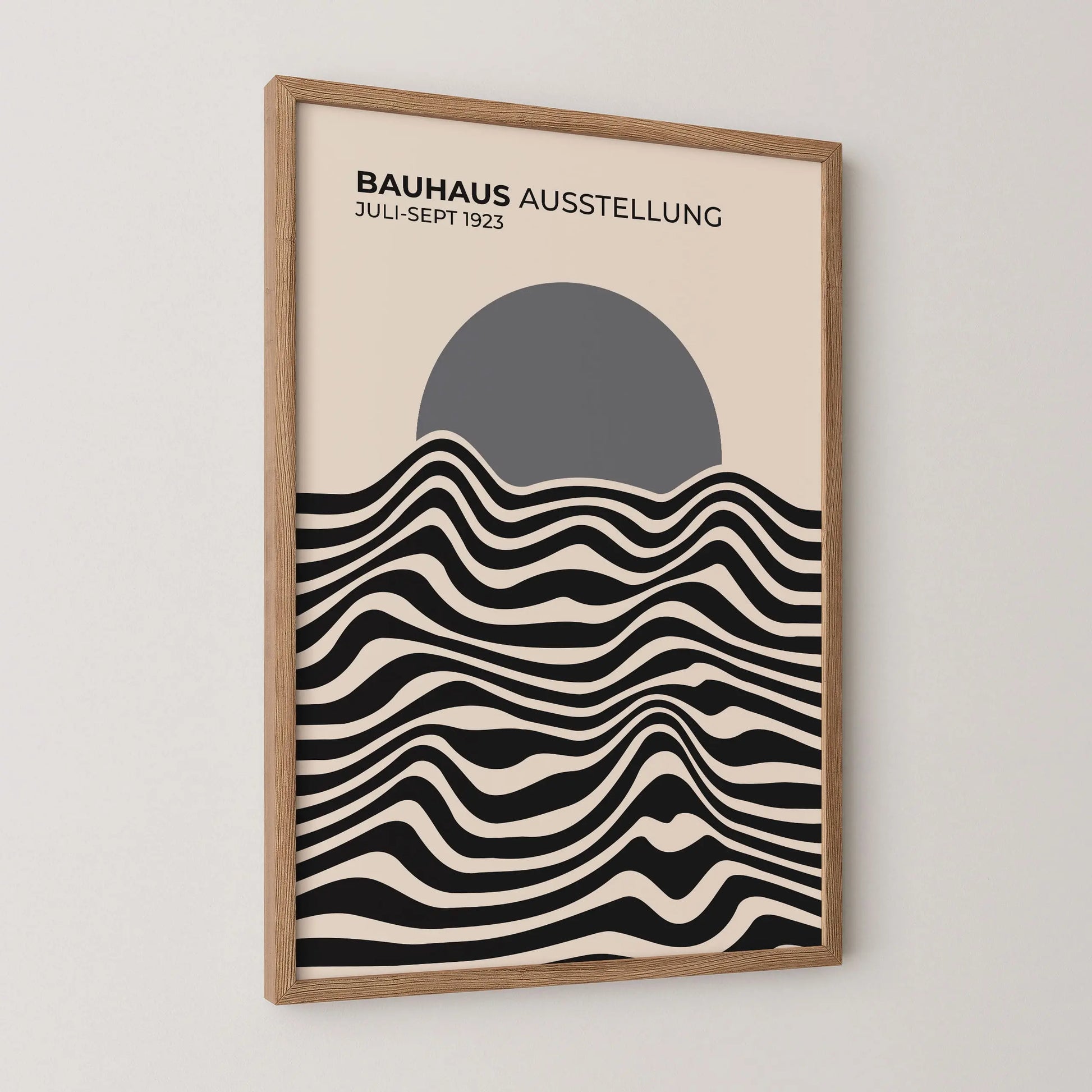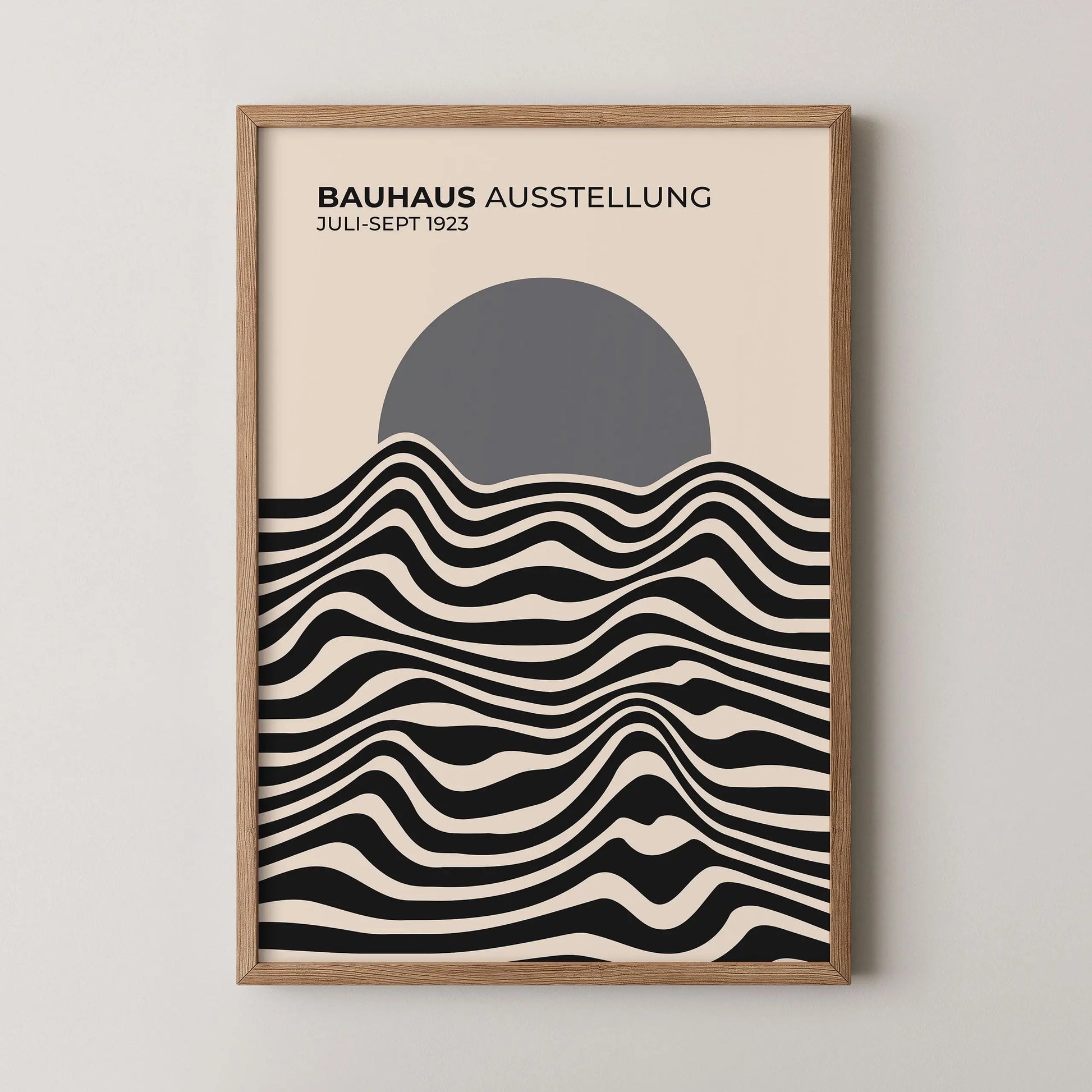 Deze vintage Bauhaus-poster bestaat uit parallelle golvende lijnen, afwisselend in donkere en lichte vlakken, die horizontaal zijn aangebracht in het onderste gedeelte. Deze lijnen vormen vloeiende, doorlopende curves en creëren een regelmatig visueel ritme. Het bovenste gedeelte wordt ingenomen door een volle schijf, die gedeeltelijk over de lijnen heen ligt en een duidelijk contrast vormt tussen organische vormen en eenvoudige geometrie.