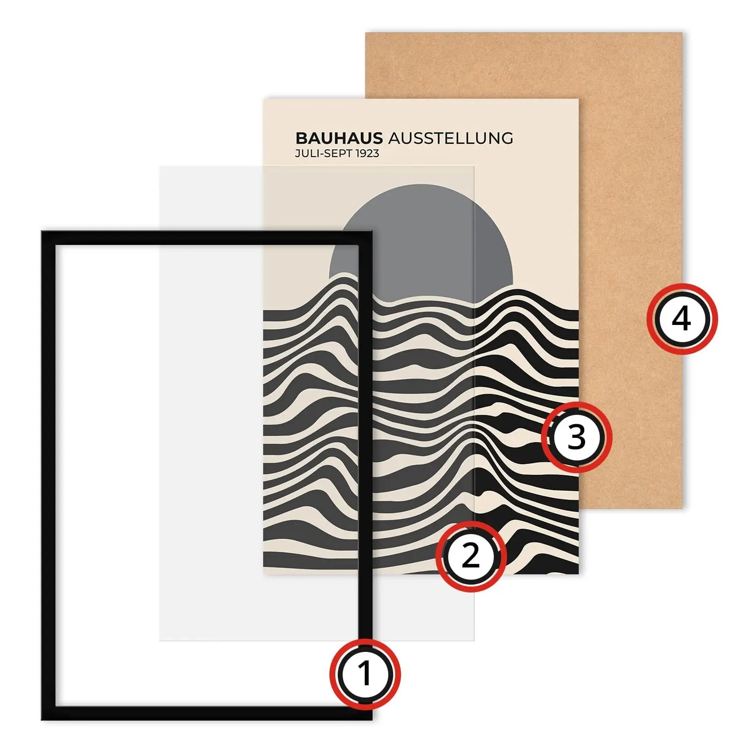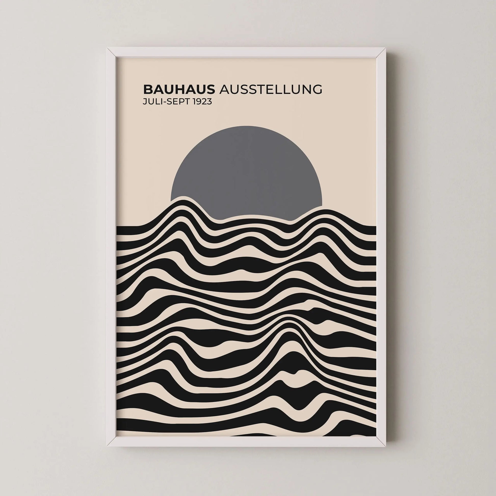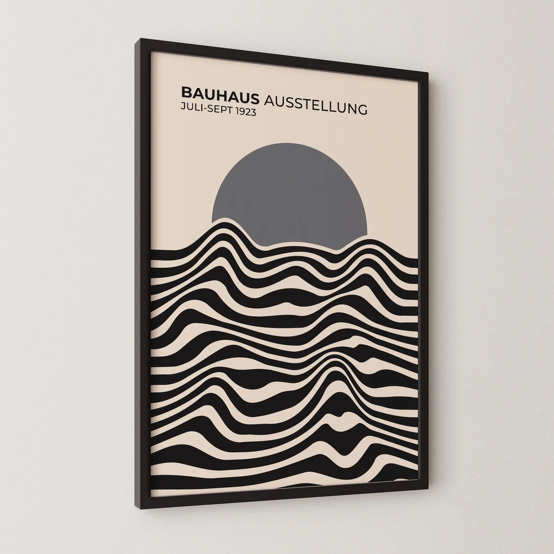 Deze vintage Bauhaus-poster bestaat uit parallelle golvende lijnen, afwisselend in donkere en lichte vlakken, die horizontaal zijn aangebracht in het onderste gedeelte. Deze lijnen vormen vloeiende, doorlopende curves en creëren een regelmatig visueel ritme. Het bovenste gedeelte wordt ingenomen door een volle schijf, die gedeeltelijk over de lijnen heen ligt en een duidelijk contrast vormt tussen organische vormen en eenvoudige geometrie.